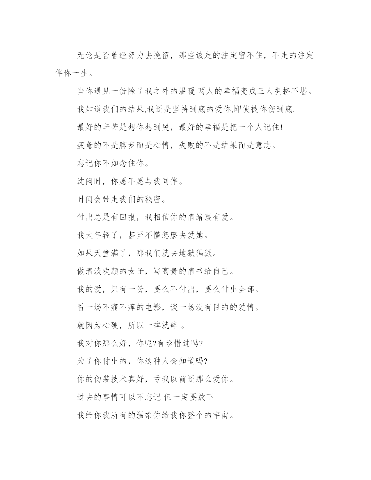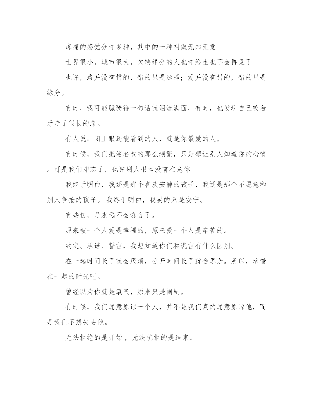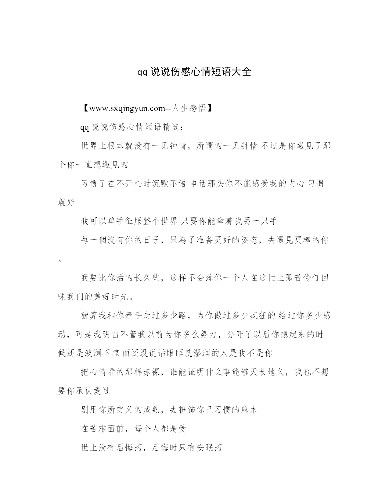 qq说说伤感心情短语大全【www.sxqingyun.com--人生感悟】qq说说伤感心情短语精选:世界上根本就没有一见钟情,所谓的一见钟情不过是你遇见了那个你一直想遇见的习惯了在不开心时沉默不语电话那头你不能感受我的内心习惯就好我可以单手征服整个世界只要你能牵着我另一只手每一個沒有你的日子,只為了准备更好的姿态,去遇見更棒的你。我要比你活的长久些,这样不会落你一个人在这世上孤苦伶仃回味我们的美好时光。就算我和你牵手走过多少路,为你做过多少疯狂的给过你多少感动,可是我明白不管我以前为你多么努力,分开了以后你想起来的时候还是波澜不惊而还没说话眼眶就湿润的人是我不是你把心情看的那样赤裸,谁能证明什么事能够天长地久,我也不想要你承认爱过别用你所定义的成熟,去粉饰你已习惯的麻木在苦难面前,每个人都是受世上没有后悔药,后悔时只有安眠药疼痛的感觉分许多种,其中的一种叫做无知无觉世界很小,城市很大,欠缺缘分的人也许终生也不会再见了也许,路并没有错的,错的只是选择;爱并没有错的,错的只是缘分。有时,我可能脆弱得一句话就泪流满面,有时,也发现自己咬着牙走了很长的路。有人说:闭上眼还能看到的人,就是你最爱的人。有时候,我们把签名改的那么频繁,只是想让别人知道你的心情。可是我们却忘了,也许别人根本没有在意你我终于明白,我还是那个喜欢安静的孩子,我还是那个不愿意和别人争抢的孩子。我终于明白,我要的只是安宁。有些伤,是永远不会愈合了。原来被一个人爱是幸福的,原来爱一个人是辛苦的。约定、承诺、誓言,我想知道你们和谎言有什么区别。在一起时间长了就会厌烦,分开时间长了就会思念。所以,珍惜在一起的时光吧。曾经以为你就是氧气,原来只是闹剧。有时候,我们愿意原谅一个人,并不是我们真的愿意原谅他,而是我们不想失去他。无法拒绝的是开始,无法抗拒的是结束。无论是否曾经努力去挽留,那些该走的注定留不住,不走的注定伴你一生。当你遇见一份除了我之外的温暖两人的幸福变成三人拥挤不堪。我知道我们的结果,我还是坚持到底的爱你,即使被你伤到底.最好的辛苦是想你想到哭,最好的幸福是把一个人记住!疲惫的不是脚步而是心情,失败的不是结果而是意志。忘记你不如念住你。沈闷时,你愿不愿与我同伴。时间会带走我们的秘密。付出总是有回报,我相信你的情绪裏有爱。我太年轻了,甚至不懂怎麽去爱她。如果天堂满了,那我们就去地狱猖獗。做清淡欢颜的女子,写高贵的情书给自己。我的爱,只有一份,要么不付出,要么付出全部。看一场不痛不痒的电影,谈一场没有目的的爱情。就因为心硬,所以一摔就碎。我对你那么好,你呢?有珍惜过吗?为了你付出的,你这种人会知道吗?你的伪装技术真好,亏我以前还那么爱你。过去的事情可以不忘记但一定要放下我给你我所有的温柔你给我你整个的宇宙。找个不爱的人谈恋爱;就算他劈腿乜无动于衷我一直在关注你,一切你知道或不知道的方式。