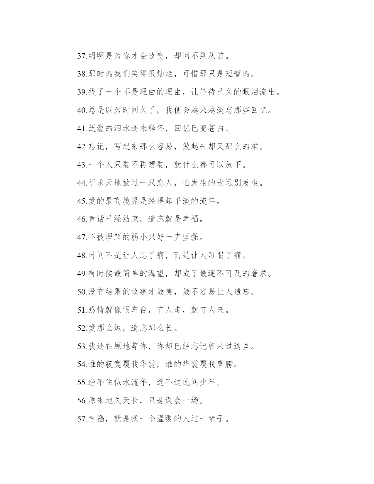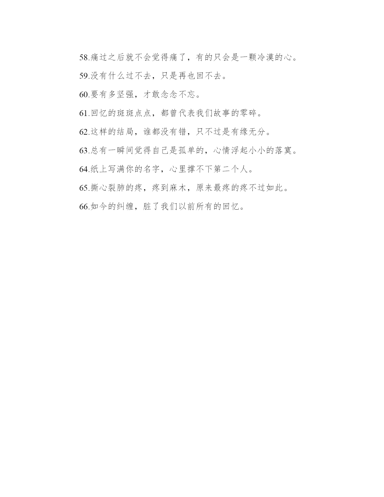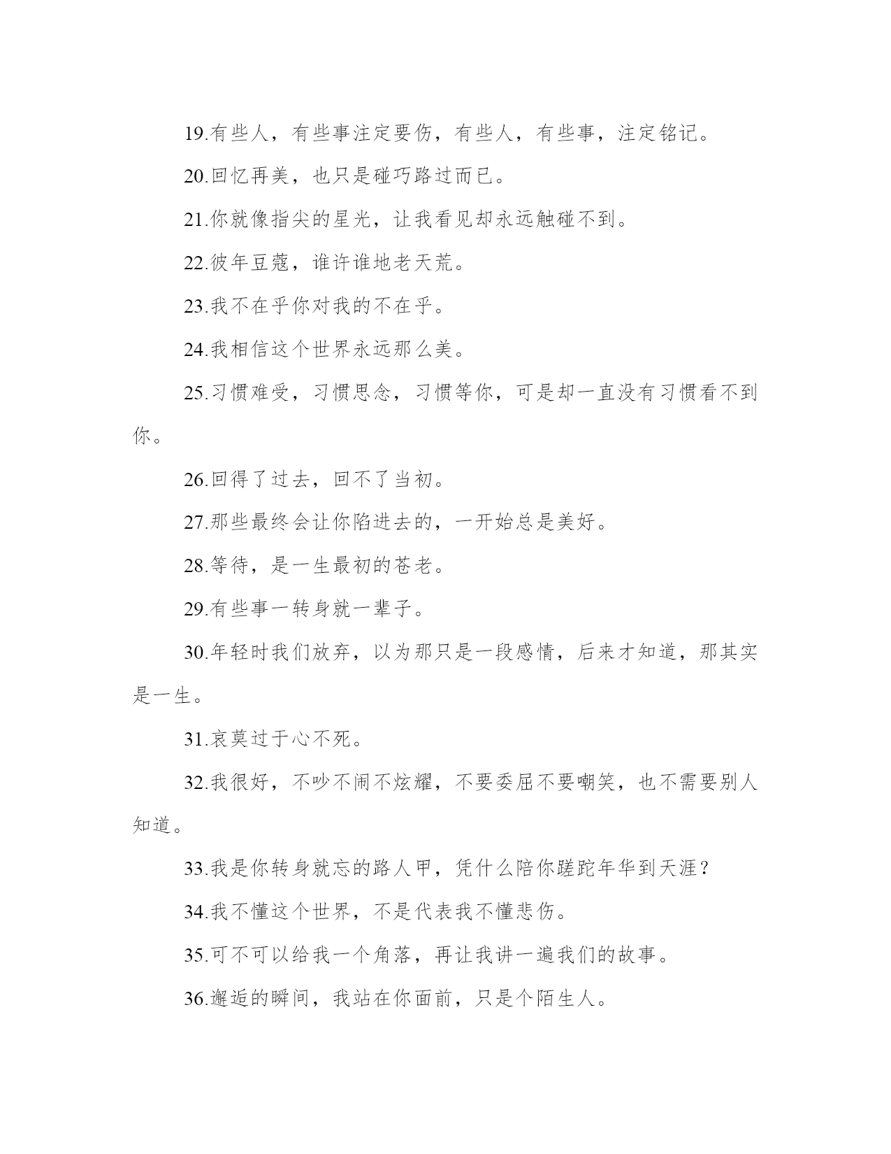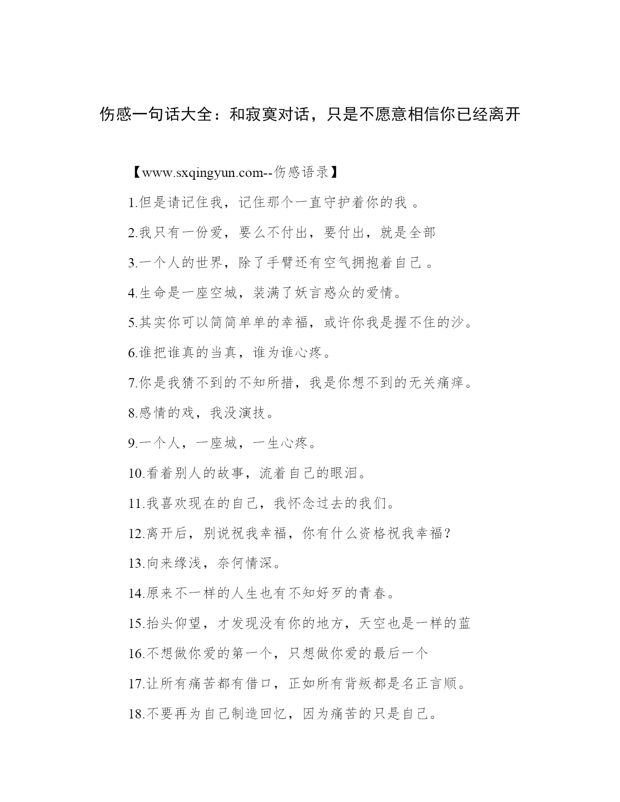 伤感一句话大全:和寂寞对话,只是不愿意相信你已经离开【www.sxqingyun.com--伤感语录】1.但是请记住我,记住那个一直守护着你的我。2.我只有一份爱,要么不付出,要付出,就是全部3.一个人的世界,除了手臂还有空气拥抱着自己。4.生命是一座空城,装满了妖言惑众的爱情。5.其实你可以简简单单的幸福,或许你我是握不住的沙。6.谁把谁真的当真,谁为谁心疼。7.你是我猜不到的不知所措,我是你想不到的无关痛痒。8.感情的戏,我没演技。9.一个人,一座城,一生心疼。10.看着别人的故事,流着自己的眼泪。11.我喜欢现在的自己,我怀念过去的我们。12.离开后,别说祝我幸福,你有什么资格祝我幸福?13.向来缘浅,奈何情深。14.原来不一样的人生也有不知好歹的青春。15.抬头仰望,才发现没有你的地方,天空也是一样的蓝16.不想做你爱的第一个,只想做你爱的最后一个17.让所有痛苦都有借口,正如所有背叛都是名正言顺。18.不要再为自己制造回忆,因为痛苦的只是自己。19.有些人,有些事注定要伤,有些人,有些事,注定铭记。20.回忆再美,也只是碰巧路过而已。21.你就像指尖的星光,让我看见却永远触碰不到。22.彼年豆蔻,谁许谁地老天荒。23.我不在乎你对我的不在乎。24.我相信这个世界永远那么美。25.习惯难受,习惯思念,习惯等你,可是却一直没有习惯看不到你。26.回得了过去,回不了当初。27.那些最终会让你陷进去的,一开始总是美好。28.等待,是一生最初的苍老。29.有些事一转身就一辈子。30.年轻时我们放弃,以为那只是一段感情,后来才知道,那其实是一生。31.哀莫过于心不死。32.我很好,不吵不闹不炫耀,不要委屈不要嘲笑,也不需要别人知道。33.我是你转身就忘的路人甲,凭什么陪你蹉跎年华到天涯?34.我不懂这个世界,不是代表我不懂悲伤。35.可不可以给我一个角落,再让我讲一遍我们的故事。36.邂逅的瞬间,我站在你面前,只是个陌生人。37.明明是为你才会改变,却回不到从前。38.那时的我们笑得很灿烂,可惜那只是短暂的。39.找了一个不是理由的理由,让等待已久的眼泪流出。40.总是以为时间久了,我便会越来越淡忘那些回忆。41.泛滥的泪水还未释怀,回忆已变苍白。42.忘记,写起来那么容易,做起来却又那么的难。43.一个人只要不再想要,就什么都可以放下。44.祈求天地放过一双恋人,怕发生的永远别发生。45.爱的最高境界是经得起平淡的流年。46.童话已经结束,遗忘就是幸福。47.不被理解的弱小只好一直坚强。48.时间不是让人忘了痛,而是让人习惯了痛。49.有时候最简单的渴望,却成了最遥不可及的奢求。50.没有结果的故事才最美,最不容易让人遗忘。51.感情就像候车台,有人走,就有人来。52.爱那么短,遗忘那么长。53.我还在原地等你,你却已经忘记曾来过这里。54.谁的寂寞覆我华裳,谁的华裳覆我肩膀。55.经不住似水流年,逃不过此间少年。56.原来地久天长,只是误会一场。57.幸福,就是找一个温暖的人过一辈子。58.痛过之后就不会觉得痛了,有的只会是一颗冷漠的心。59.没有什么过不去,只是再也回不去。60.要有多坚强,才敢念念不忘。61.回忆的斑斑点点,都曾代表我们故事的零碎。62.这样的结局,谁都没有错,只不过是有缘无分。63.总有一瞬间觉得自己是孤单的,心情浮起小小的落寞。64.纸上写满你的名字,心里撑不下第二个人。65.撕心裂肺的疼,疼到麻木,原来最疼的疼不过如此。66.如今的纠缠,脏了我们以前所有的回忆。