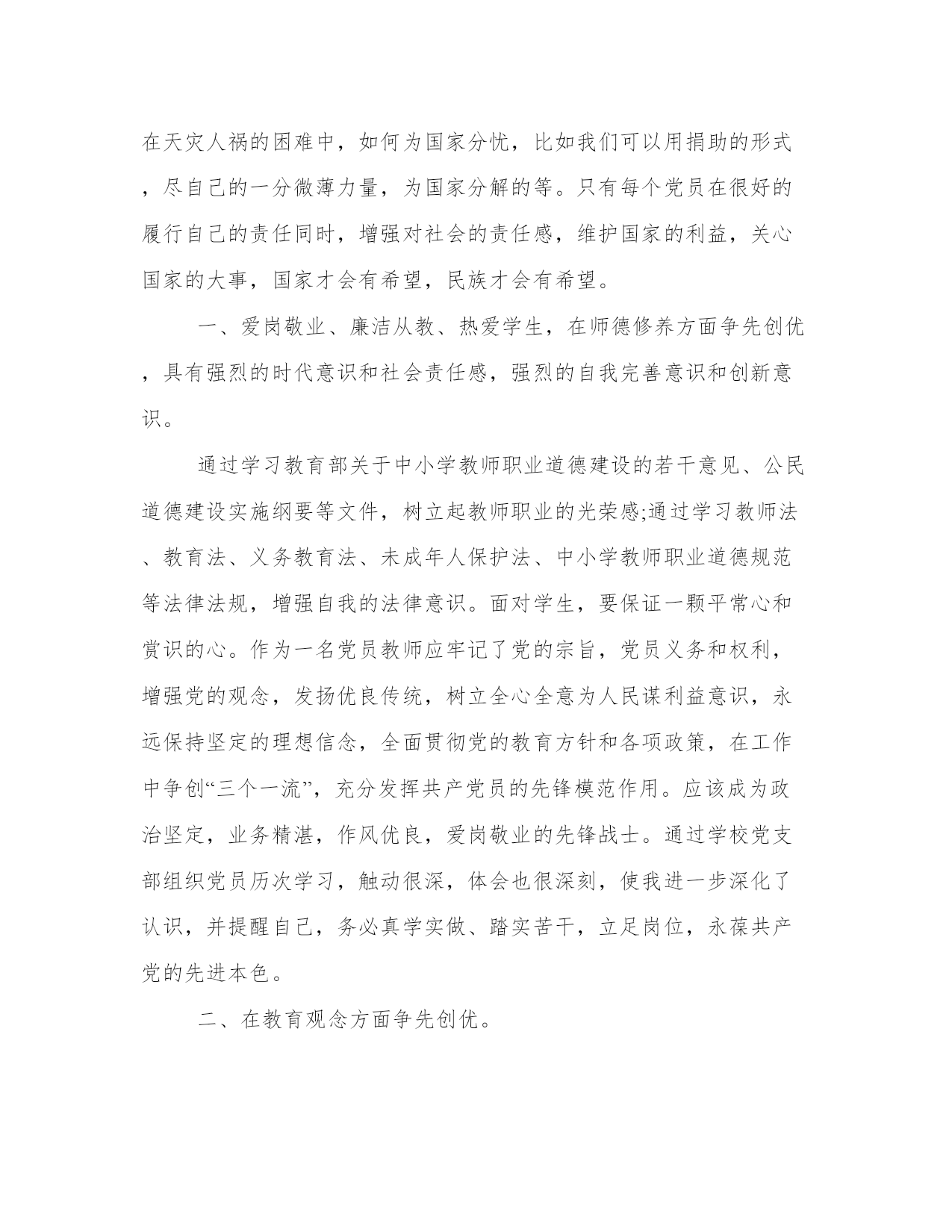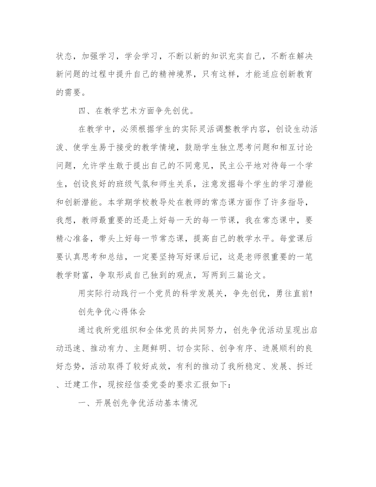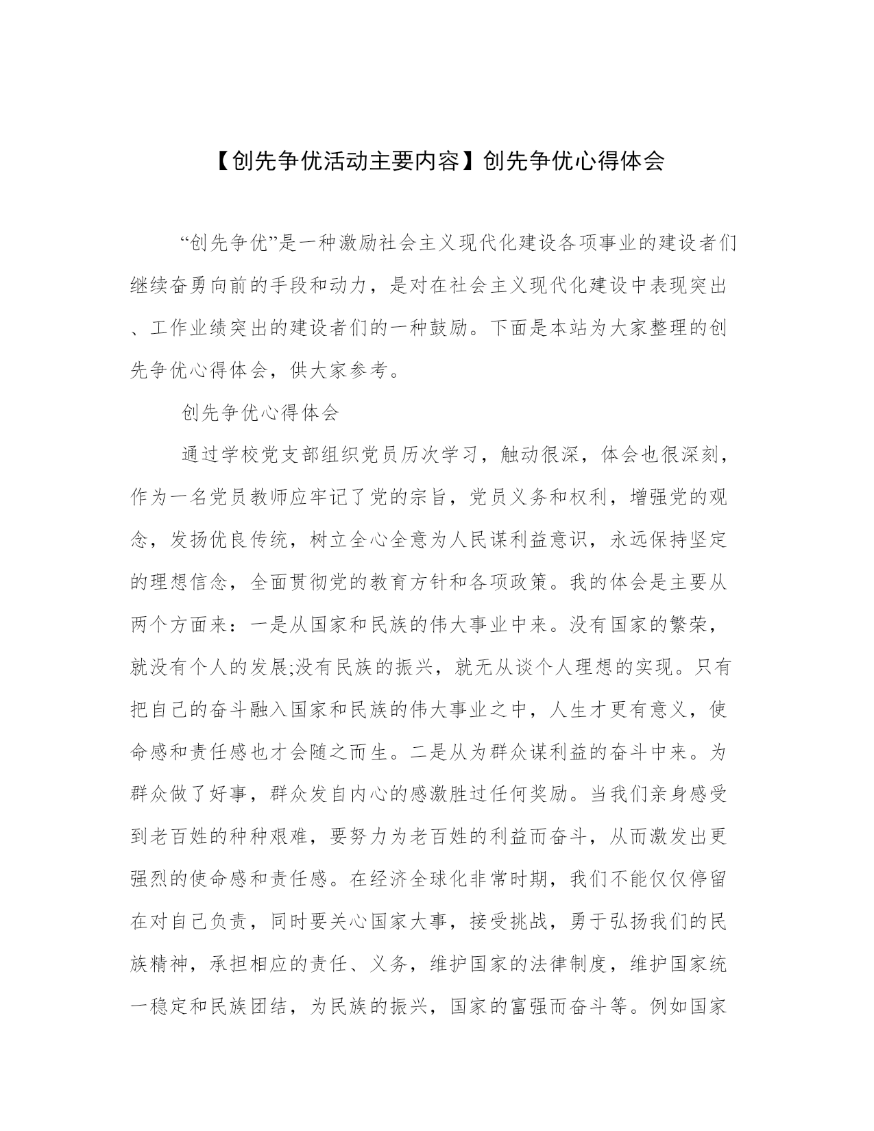 【创先争优活动主要内容】创先争优心得体会“创先争优”是一种激励社会主义现代化建设各项事业的建设者们继续奋勇向前的手段和动力,是对在社会主义现代化建设中表现突出、工作业绩突出的建设者们的一种鼓励。下面是本站为大家整理的创先争优心得体会,供大家参考。创先争优心得体会通过学校党支部组织党员历次学习,触动很深,体会也很深刻,作为一名党员教师应牢记了党的宗旨,党员义务和权利,增强党的观念,发扬优良传统,树立全心全意为人民谋利益意识,永远保持坚定的理想信念,全面贯彻党的教育方针和各项政策。我的体会是主要从两个方面来:一是从国家和民族的伟大事业中来。没有国家的繁荣,就没有个人的发展;没有民族的振兴,就无从谈个人理想的实现。只有把自己的奋斗融入国家和民族的伟大事业之中,人生才更有意义,使命感和责任感也才会随之而生。二是从为群众谋利益的奋斗中来。为群众做了好事,群众发自内心的感激胜过任何奖励。当我们亲身感受到老百姓的种种艰难,要努力为老百姓的利益而奋斗,从而激发出更强烈的使命感和责任感。在经济全球化非常时期,我们不能仅仅停留在对自己负责,同时要关心国家大事,接受挑战,勇于弘扬我们的民族精神,承担相应的责任、义务,维护国家的法律制度,维护国家统一稳定和民族团结,为民族的振兴,国家的富强而奋斗等。例如国家在天灾人祸的困难中,如何为国家分忧,比如我们可以用捐助的形式,尽自己的一分微薄力量,为国家分解的等。只有每个党员在很好的履行自己的责任同时,增强对社会的责任感,维护国家的利益,关心国家的大事,国家才会有希望,民族才会有希望。一、爱岗敬业、廉洁从教、热爱学生,在师德修养方面争先创优,具有强烈的时代意识和社会责任感,强烈的自我完善意识和创新意识。通过学习教育部关于中小学教师职业道德建设的若干意见、公民道德建设实施纲要等文件,树立起教师职业的光荣感;通过学习教师法、教育法、义务教育法、未成年人保护法、中小学教师职业道德规范等法律法规,增强自我的法律意识。面对学生,要保证一颗平常心和赏识的心。作为一名党员教师应牢记了党的宗旨,党员义务和权利,增强党的观念,发扬优良传统,树立全心全意为人民谋利益意识,永远保持坚定的理想信念,全面贯彻党的教育方针和各项政策,在工作中争创“三个一流”,充分发挥共产党员的先锋模范作用。应该成为政治坚定,业务精湛,作风优良,爱岗敬业的先锋战士。通过学校党支部组织党员历次学习,触动很深,体会也很深刻,使我进一步深化了认识,并提醒自己,务必真学实做、踏实苦干,立足岗位,永葆共产党的先进本色。二、在教育观念方面争先创优。教育观念是教师对教育的职能及如何进行教育的认识问题,往往对教师组织教学活动以至整个教育过程的成败起到一种先入的决定作用。树立创新性的教育观念,着眼于培养学生的创新意识、创新能力和发展学生良好的个性品质,树立科学的学生发展观。课堂教学以学生为中心,以发展能力为主要目标,要鼓励创新性学习,发挥学生的主体能动性,激发学生的参与意识,重视在实践活动中培养学生的创新精神和能力,树立符合创新教育要求的教学观。积极参加学校的各级课题实验分析,敢于分析,争取出分析成果,每学期争取上两节教研课。作为一个共产党员必须严守党的纪律,树立良好作风,带头抵制歪风邪气。党员必须严守党的政治纪律,坚决贯彻民主集中制原则,坚决反对本位主义、分散主义,自觉与党中央在思想上、政治上保持高度一致;必须严守党的组织纪律,服从组织决定,坚持党性原则,反对自由主义、宗派主义和小团体主义,维护党的团结和统一;必须严守党的群众纪律,增强相信群众、依靠群众的观念,保持清正廉洁、艰苦奋斗的作风;必须严格遵守国家的各项法律法规,加强思想道德修养,带头发扬社会主义道德风尚,坚决抵制资产阶级和封建主义腐朽思想的侵蚀,坚决同各种不正之风和腐败现象作斗争。同时,要认真分析和处理好个人利益与集体利益、局部利益与整体利益、眼前利益与长远利益、这部分人的利益与那部分人的利益、少数人的利益与多数人的利益的关系,把各种利益统一和结合起来。坚持维护全局和根本利益,同时又照顾和尊重个人和局部利益。我们要把实践科学发展观当作义不容辞的职责,主动自觉地想,认真深入地想,经常不断地想;想想自己为党做了什么,为人民群众作了什么?想想自己在工作中奉献了什么,取得了什么成绩?只有这样经常地反思,才能使自己始终保持一个党员的活力。二是应实事求是。要用辩证的方法:分析评估自己,既不夸大,也不缩小;既纵向比,也横向看。尤其应注意以联系、发展的观点,来审视自己,以宽阔的视野来谋划工作,并付诸于行动。回顾自己几年来所作的工作,有时想自己也努力奉献着,也做出了一些成绩,但与一些优秀教师比,自己的成绩就显得微小,因此我要更加努力去工作,以争取新的突破。三、在知识结构方面争先创优,不再局限于“学科知识+教育学知识”的传统模式