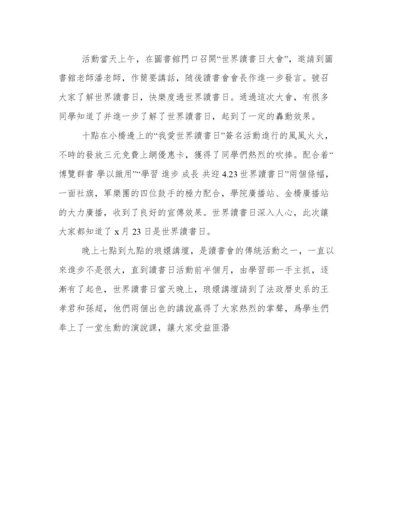 读书日活动总结及小结讀書日活動總結及小結伴着讀書日的腳步,聆聽世界的聲音。邢台學院讀書會積極配合領導的響應,攜手圖書館,開展了豐富多樣,别具一格的大型宣傳世界讀書日活動。此次活動取得了較好的宣傳效果,即宣傳了世界讀書日,順便也将讀書會介紹給了大家,濃厚了學習氛圍,增強了社團社員的凝聚力。特别是琅嬛講壇活動,辦出了特色,辦出了特點,得到了學生們的肯定,堅定了我們的信心。世界讀書日到來之前,外聯部不畏挫折,按既定方案以三人小組爲單位到校外拉去贊助,最終選定英吉特網絡爲合作夥伴。其原因有:一、世界讀書日是讀書的日子,所讀書籍不限紙質還是電子書,選擇英吉特網絡可以讓大家下載電子書,更方便以後讀書。二、英吉特是原先的網吧改進後成立的,而且位置偏僻,需要宣傳,對于拉取贊助比較容易。三、英吉特老板重視這次機會,給予了很大的支持,發放名片,即宣傳了英吉特也宣傳了讀書會,最終的受惠方還有廣大的學生,可謂一舉多得。既得經驗:拉取外聯,要選擇最合适的外聯小組。拉取對象應合乎情理,符合邏輯。考慮的方向應該是多方受益,而不是單方面的受益。在外保持良好形象是必須的,不然以後很難再拉取到贊助。活動當天上午,在圖書館門口召開“世界讀書日大會”,邀請到圖書館老師潘老師,作簡要講話,随後讀書會會長作進一步發言。號召大家了解世界讀書日,快樂度過世界讀書日。通過這次大會,有很多同學知道了并進一步了解了世界讀書日,起到了一定的轟動效果。十點在小橋邊上的“我愛世界讀書日”簽名活動進行的風風火火,不時的發放三元免費上網優惠卡,獲得了同學們熱烈的吹捧。配合着“博覽群書學以緻用”“學習進步成長共迎4.23世界讀書日”兩個條幅,一面社旗,軍樂團的四位鼓手的極力配合,學院廣播站、金橋廣播站的大力廣播,收到了良好的宣傳效果。世界讀書日深入人心,此次讓大家都知道了x月23日是世界讀書日。晚上七點到九點的琅嬛講壇,是讀書會的傳統活動之一,一直以來進步不是很大,直到讀書日活動前半個月,由學習部一手主抓,逐漸有了起色,世界讀書日當天晚上,琅嬛講壇請到了法政曆史系的王孝君和孫超,他們兩個出色的講說赢得了大家熱烈的掌聲,爲學生們奉上了一堂生動的演說課,讓大家受益匪湣