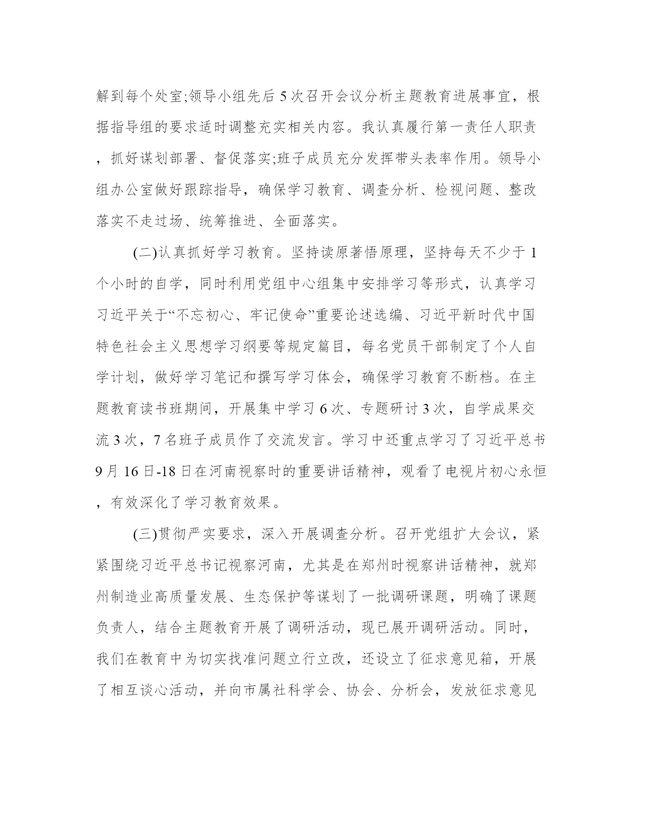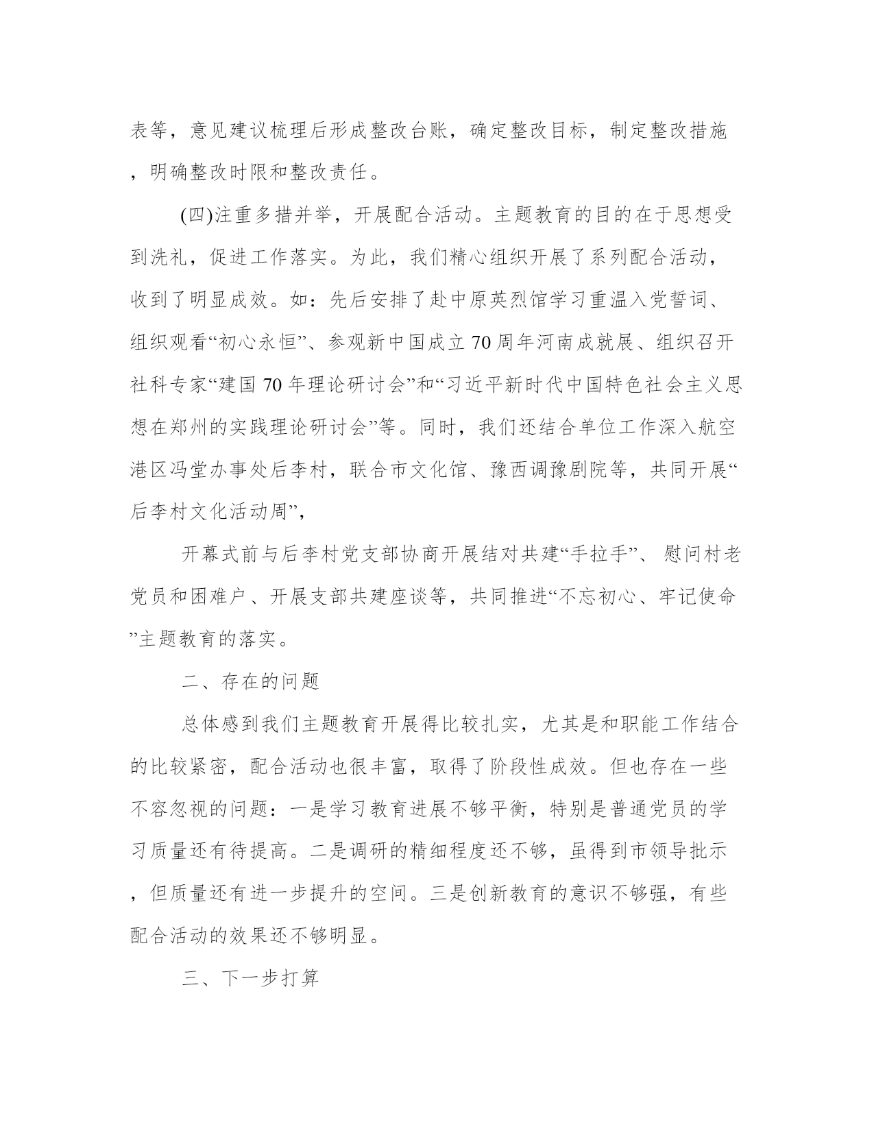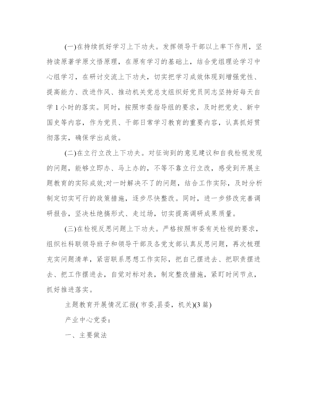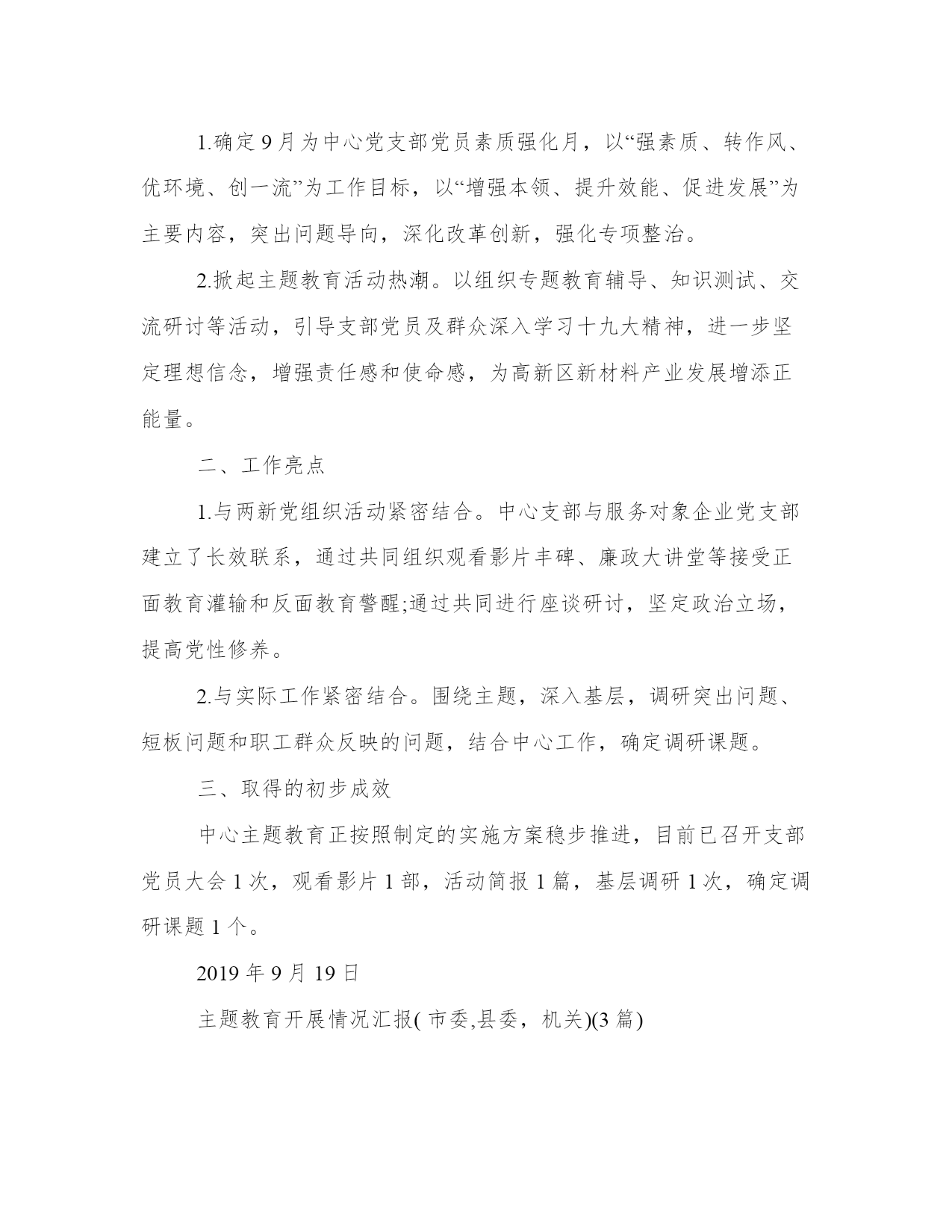 主题教育开展情况汇报(市委,县委,机关)(3篇)“不忘初心,牢记使命”,就是要永远保持建党时中国共产党人的奋斗精神,牢记共产主义远大理想,坚定中国特色社会主义共同理想,一步一个脚印向着美好未来和最高理想前进。本站为大家整理的相关的主题开展情况汇报(市委,县委,机关)(3篇),供大家参考选择。欢迎市委第指导组的各位领导:自“不忘初心、牢记使命”主题教育开展以来,坚决贯彻落实习近平总书记重要讲话精神,在市委第十一指导组的精心指导下,紧紧围绕守初心、担使命,找差距、抓落实的总要求,坚持把学习教育、调查分析、检视问题、整改落实四项重要措施衔接起来,整体推进,贯穿始终,确保主题教育高质量扎实推进。主题教育开展情况汇报如下:一、主要做法及成效(一)强化组织保障,落实工作责任。我们从开展主题教育一开始,就注重强化组织领导,强力推动落实,成立了“不忘初心、牢记使命”主题教育领导小组,分析制定了主题教育“不忘初心、牢记使命”主题教育实施方案。组织召开了主题教育动员部署会,作了动员讲话,对开展好主题教育进行部署;制定下发了‘不忘初心、牢记使命’主题教育9月份集中学习研讨安排,结合工作对重点学习任务和配合活动细化分解到每个处室;领导小组先后5次召开会议分析主题教育进展事宜,根据指导组的要求适时调整充实相关内容。我认真履行第一责任人职责,抓好谋划部署、督促落实;班子成员充分发挥带头表率作用。领导小组办公室做好跟踪指导,确保学习教育、调查分析、检视问题、整改落实不走过场、统筹推进、全面落实。(二)认真抓好学习教育。坚持读原著悟原理,坚持每天不少于1个小时的自学,同时利用党组中心组集中安排学习等形式,认真学习习近平关于“不忘初心、牢记使命”重要论述选编、习近平新时代中国特色社会主义思想学习纲要等规定篇目,每名党员干部制定了个人自学计划,做好学习笔记和撰写学习体会,确保学习教育不断档。在主题教育读书班期间,开展集中学习6次、专题研讨3次,自学成果交流3次,7名班子成员作了交流发言。学习中还重点学习了习近平总书9月16日-18日在河南视察时的重要讲话精神,观看了电视片初心永恒,有效深化了学习教育效果。(三)贯彻严实要求,深入开展调查分析。召开党组扩大会议,紧紧围绕习近平总书记视察河南,尤其是在郑州时视察讲话精神,就郑州制造业高质量发展、生态保护等谋划了一批调研课题,明确了课题负责人,结合主题教育开展了调研活动,现已展开调研活动。同时,我们在教育中为切实找准问题立行立改,还设立了征求意见箱,开展了相互谈心活动,并向市属社科学会、协会、分析会,发放征求意见表等,意见建议梳理后形成整改台账,确定整改目标,制定整改措施,明确整改时限和整改责任。(四)注重多措并举,开展配合活动。主题教育的目的在于思想受到洗礼,促进工作落实。为此,我们精心组织开展了系列配合活动,收到了明显成效。如:先后安排了赴中原英烈馆学习重温入党誓词、组织观看“初心永恒”、参观新中国成立70周年河南成就展、组织召开社科专家“建国70年理论研讨会”和“习近平新时代中国特色社会主义思想在郑州的实践理论研讨会”等。同时,我们还结合单位工作深入航空港区冯堂办事处后李村,联合市文化馆、豫西调豫剧院等,共同开展“后李村文化活动周”,开幕式前与后李村党支部协商开展结对共建“手拉手”、慰问村老党员和困难户、开展支部共建座谈等,共同推进“不忘初心、牢记使命”主题教育的落实。二、存在的问题总体感到我们主题教育开展得比较扎实,尤其是和职能工作结合的比较紧密,配合活动也很丰富,取得了阶段性成效。但也存在一些不容忽视的问题:一是学习教育进展不够平衡,特别是普通党员的学习质量还有待提高。二是调研的精细程度还不够,虽得到市领导批示,但质量还有进一步提升的空间。三是创新教育的意识不够强,有些配合活动的效果还不够明显。三、下一步打算(一)在持续抓好学习上下功夫。发挥领导干部以上率下作用,坚持读原著学原文悟原理,在原有学习的基础上,结合党组理论学习中心组学习,在研讨交流上下功夫,切实把学习成效体现到增强党性、提高能力、改进作风、推动机关党总支组织好党员同志坚持好每天自学1小时的落实。同时,按照市委指导组的要求,及时把党史、新中国史等内容,作为党员、干部日常学习教育的重要内容,认真抓好贯彻落实,确保学出成效。(二)在立行立改上下功夫。对征询到的意见建议和自我检视发现的问题,能够立即办、马上办的,不等不靠立行立改,感受到开展主题教育的实际成效;对一时解决不了的问题,结合工作实际,及时分析制定切实可行的政策措施,逐步尽快整改。同时,进一步修改完善调研报告,坚决杜绝搞形式、走过场,切实提高调研成果质量。(三)在检视反思问题上下功夫。严格按照市委有关检视的要求,组织社科联领导班子和领导干部及各党支部认真反思问题,再次梳理充实问题清单,紧密联系思