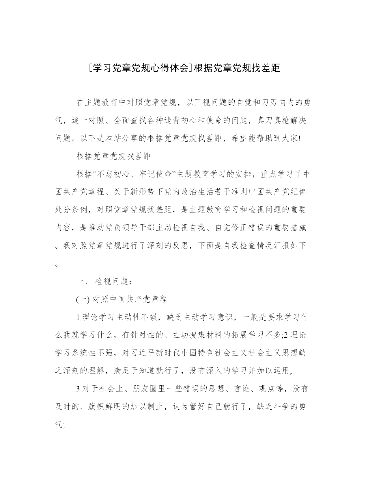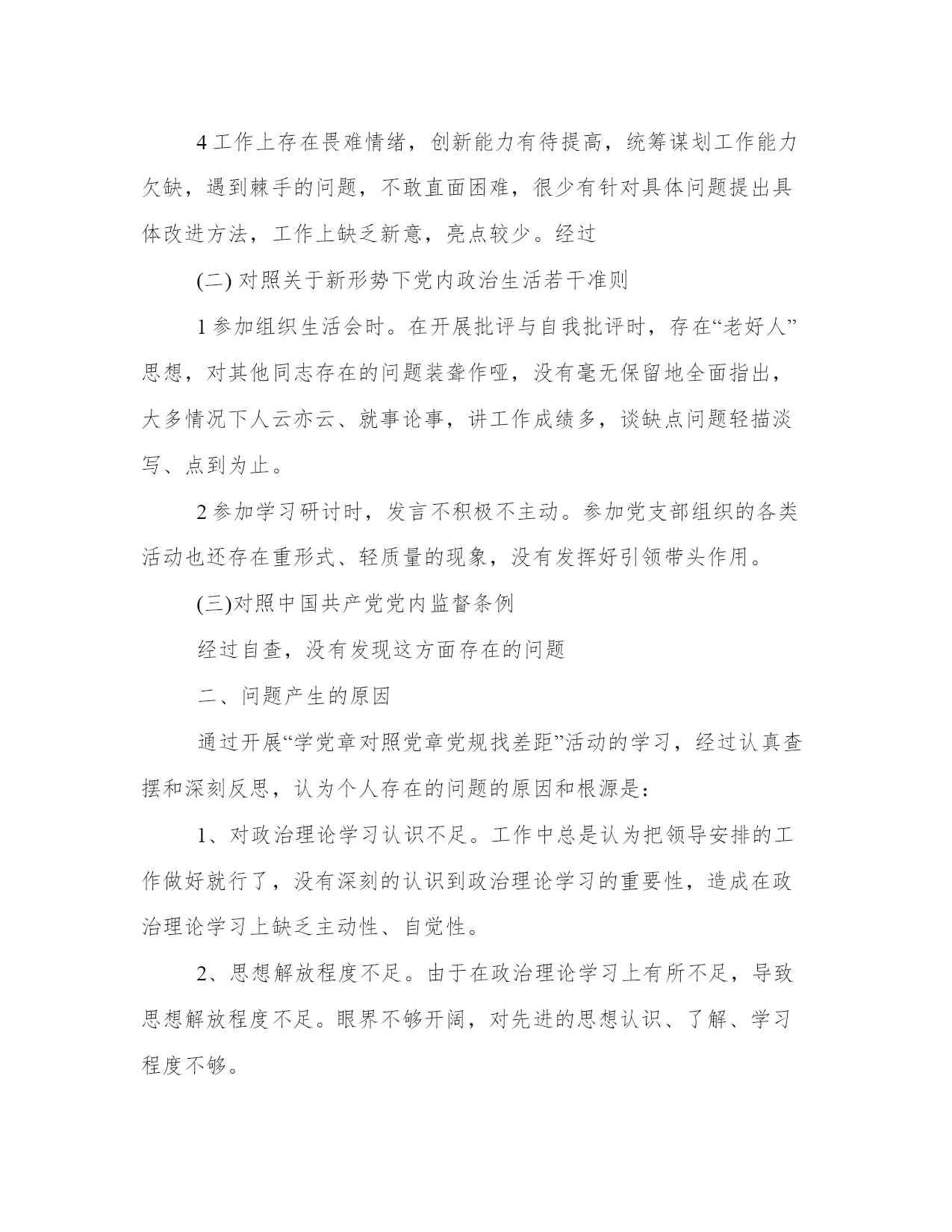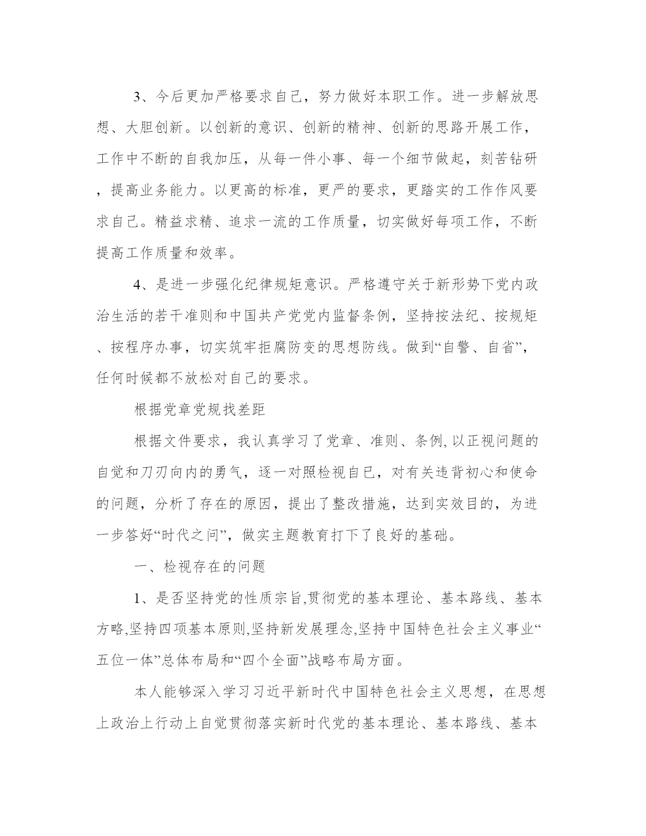 [学习党章党规心得体会]根据党章党规找差距在主题教育中对照党章党规,以正视问题的自觉和刀刃向内的勇气,逐一对照、全面查找各种违背初心和使命的问题,真刀真枪解决问题。以下是本站分享的根据党章党规找差距,希望能帮助到大家!根据党章党规找差距根据“不忘初心、牢记使命”主题教育学习的安排,重点学习了中国共产党章程、关于新形势下党内政治生活若干准则中国共产党纪律处分条例,对照党章党规找差距,是主题教育学习和检视问题的重要内容,是推动党员领导干部主动检视自我、自觉修正错误的重要措施。我对照党章党规进行了深刻的反思,下面是自我检查情况汇报如下。一、检视问题:(一)对照中国共产党章程1理论学习主动性不强,缺乏主动学习意识,一般是要求学习什么我就学习什么,有针对性的、主动搜集材料的拓展学习不多;2理论学习系统性不强,对习近平新时代中国特色社会主义社会主义思想缺乏深刻的理解,满足于知道就行了,没有深入的学习并加以运用;3对于社会上、朋友圈里一些错误的思想、言论、观点等,没有及时的、旗帜鲜明的加以制止,认为管好自己就行了,缺乏斗争的勇气;4工作上存在畏难情绪,创新能力有待提高,统筹谋划工作能力欠缺,遇到棘手的问题,不敢直面困难,很少有针对具体问题提出具体改进方法,工作上缺乏新意,亮点较少。经过(二)对照关于新形势下党内政治生活若干准则1参加组织生活会时。在开展批评与自我批评时,存在“老好人”思想,对其他同志存在的问题装聋作哑,没有毫无保留地全面指出,大多情况下人云亦云、就事论事,讲工作成绩多,谈缺点问题轻描淡写、点到为止。2参加学习研讨时,发言不积极不主动。参加党支部组织的各类活动也还存在重形式、轻质量的现象,没有发挥好引领带头作用。(三)对照中国共产党党内监督条例经过自查,没有发现这方面存在的问题二、问题产生的原因通过开展“学党章对照党章党规找差距”活动的学习,经过认真查摆和深刻反思,认为个人存在的问题的原因和根源是:1、对政治理论学习认识不足。工作中总是认为把领导安排的工作做好就行了,没有深刻的认识到政治理论学习的重要性,造成在政治理论学习上缺乏主动性、自觉性。2、思想解放程度不足。由于在政治理论学习上有所不足,导致思想解放程度不足。眼界不够开阔,对先进的思想认识、了解、学习程度不够。3、坚持学习的恒心和毅力不足。没有静下心来认真学习理论知识及业务知识。尽管自己在工作中一直求新、求变、求活,但总有一种”山穷水尽疑无路”的感觉,认真分析起来,也是由于自己学习抓得不紧、不实、钻研不深的缘故。4、工作不够扎实。、对自己“高标准、严要求”的意识还不强,只求过得去、不求过得硬,导致工作时会在一些细节的问题上出错。平时疏于学习,自身积累还需增强。对于自己从事的后勤服务工作,相关业务能力需要进一步增强。工作作风上不够扎实,只求把活干完,其它问题很少考虑。三、下一步努力方向针对查摆出来的问题,下一步我将从几个方面加以改进。1、作为一名共产党员,进一步树牢宗旨意识。拓宽自己的理论学习通道,主动学、自觉学。结合“不忘初心、牢记使命”主题教育,牢固树立“四个意识”、坚定“四个自信”、做到“两个维护”,在具体工作中,牢固树立为科研、为科研人员服务的意识,使自己的一言一行都要向优秀党员的标准看齐。2、进一步抓好思想武装。坚持把补精神之“钙”、铸思想之“魂”放在首位。突出抓好党章党规和习近平新时代中国特色社会主义思想的学习,学习更加深入,做到进入思想、推动工作;头脑更加清醒,做到立场坚定、旗帜鲜明;贯彻更加坚决,做到信念坚定、对党忠诚。3、今后更加严格要求自己,努力做好本职工作。进一步解放思想、大胆创新。以创新的意识、创新的精神、创新的思路开展工作,工作中不断的自我加压,从每一件小事、每一个细节做起,刻苦钻研,提高业务能力。以更高的标准,更严的要求,更踏实的工作作风要求自己。精益求精、追求一流的工作质量,切实做好每项工作,不断提高工作质量和效率。4、是进一步强化纪律规矩意识。严格遵守关于新形势下党内政治生活的若干准则和中国共产党党内监督条例,坚持按法纪、按规矩、按程序办事,切实筑牢拒腐防变的思想防线。做到“自警、自省”,任何时候都不放松对自己的要求。根据党章党规找差距根据文件要求,我认真学习了党章、准则、条例,以正视问题的自觉和刀刃向内的勇气,逐一对照检视自已,对有关违背初心和使命的问题,分析了存在的原因,提出了整改措施,达到实效目的,为进一步答好“时代之问”,做实主题教育打下了良好的基础。一、检视存在的问题1、是否坚持党的性质宗旨,贯彻党的基本理论、基本路线、基本方略,坚持四项基本原则,坚持新发展理念,坚持中国特色社会主义事业“五位一体”总体布局和“四个全面”战略布局方面。本人能够深入学习习近平新时代中国特色社会主义思想,在思想上政治上行动上自觉贯彻落实新时代党的基本理