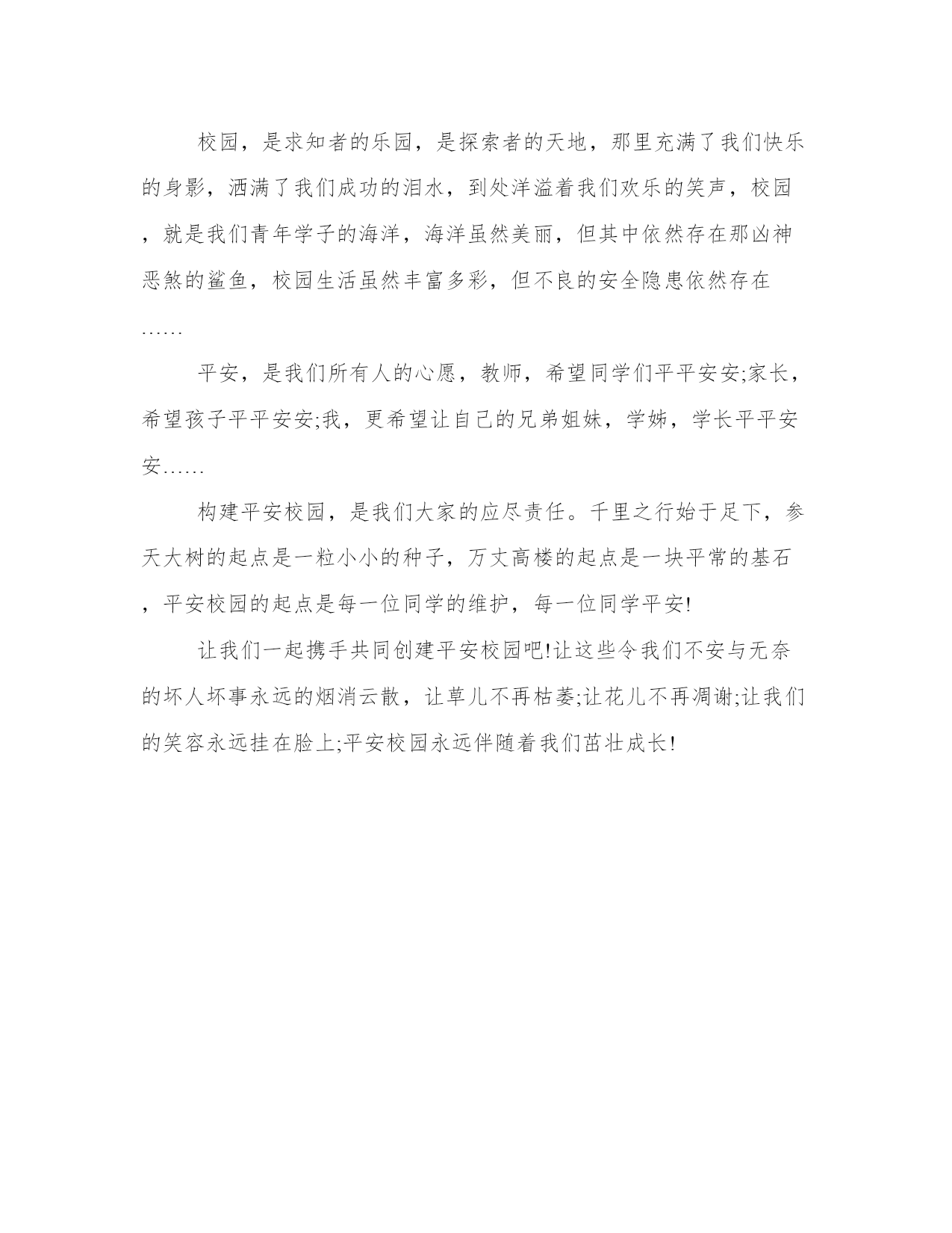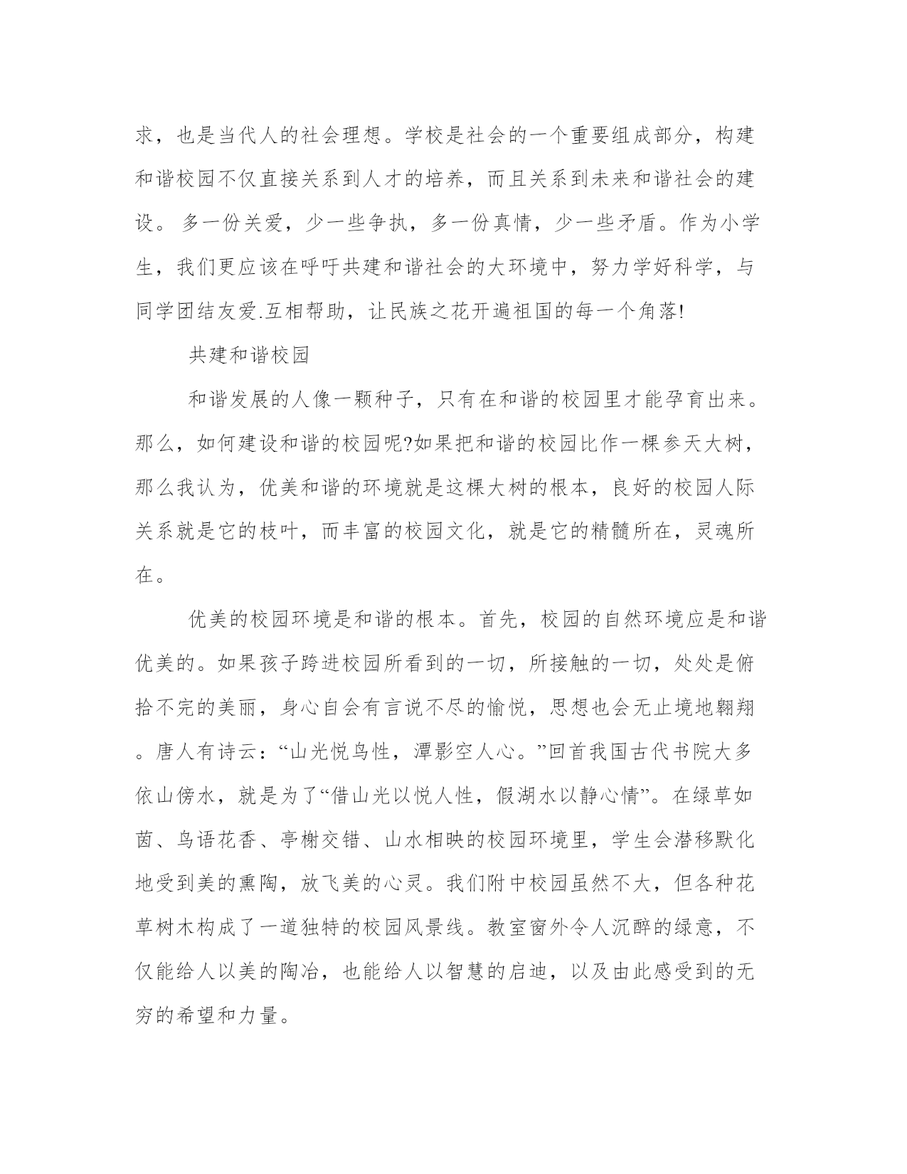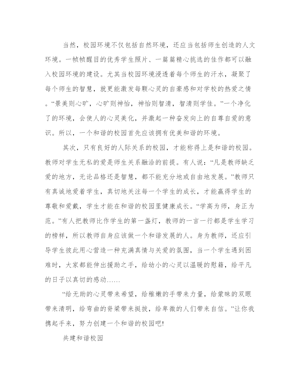 【共建和谐校园主题班会】共建和谐校园如果说,人类社会的主题是发展,承载着这样一个目标,又需要什么样的环境呢?我认为最重要的是和谐。以下是本站分享的共建和谐校园,希望能帮助到大家!共建和谐校园我们从小在校园文化的熏陶下逐渐成长,拥有一个美丽和谐的校园是大家共同的心愿。在校园,就在我们身边团结互助友爱的行为随处可见。在校园春季运动会中,我们举行了一场别开生面的拔河比赛。虽然我们班没有多少“重量级”选手,却奇迹般夺得了好成绩,同学们欢呼啊,跳跃啊!赢了靠的是什么?是我们全班同学一颗颗无比团结友爱的心,想为班上夺得荣誉。所以在非常紧要的关头,大家齐心协力.心往一处想,劲往一处使,动作协调终于在那心惊肉跳的一瞬间,拼尽全力取得了胜利。这就是团结的力量!在“捐助四川”活动主题中。让我们小学生多一份爱心,让那些与我们同龄的朋友一起在校园中学习,让那些失学儿童在鲜花和快乐中读书。同学们踊跃地捐出自己平时积攒的零花钱,1元.5元.10元,甚至一百元。虽然我们捐的钱不多,但滴水成河,也能让许多孩子读上书。一张张灿烂的笑容,一颗颗火热的心,一幕幕和谐的镜头。在校园中随处可见。校园中洋溢着爱的奉献。早在两千多年前,我国的老子.孔子和庄子都曾提出过构建和谐社会的设想。实现社会和谐,构建美好社会,是中华民族几千年的追求,也是当代人的社会理想。学校是社会的一个重要组成部分,构建和谐校园不仅直接关系到人才的培养,而且关系到未来和谐社会的建设。多一份关爱,少一些争执,多一份真情,少一些矛盾。作为小学生,我们更应该在呼吁共建和谐社会的大环境中,努力学好科学,与同学团结友爱.互相帮助,让民族之花开遍祖国的每一个角落!共建和谐校园和谐发展的人像一颗种子,只有在和谐的校园里才能孕育出来。那么,如何建设和谐的校园呢?如果把和谐的校园比作一棵参天大树,那么我认为,优美和谐的环境就是这棵大树的根本,良好的校园人际关系就是它的枝叶,而丰富的校园文化,就是它的精髓所在,灵魂所在。优美的校园环境是和谐的根本。首先,校园的自然环境应是和谐优美的。如果孩子跨进校园所看到的一切,所接触的一切,处处是俯拾不完的美丽,身心自会有言说不尽的愉悦,思想也会无止境地翱翔。唐人有诗云:“山光悦鸟性,潭影空人心。”回首我国古代书院大多依山傍水,就是为了“借山光以悦人性,假湖水以静心情”。在绿草如茵、鸟语花香、亭榭交错、山水相映的校园环境里,学生会潜移默化地受到美的熏陶,放飞美的心灵。我们附中校园虽然不大,但各种花草树木构成了一道独特的校园风景线。教室窗外令人沉醉的绿意,不仅能给人以美的陶冶,也能给人以智慧的启迪,以及由此感受到的无穷的希望和力量。当然,校园环境不仅包括自然环境,还应当包括师生创造的人文环境。一帧帧醒目的优秀学生照片、一篇篇精心挑选的佳作都可以融入校园环境的建设。尤其当校园环境浸透着每个师生的汗水,凝聚了每个师生的智慧,就更能激发每颗心灵的自豪感和对学校的热爱之情。“景美则心旷,心旷则神怡,神怡则智清,智清则学佳。”一个净化了的环境,会使人的心灵美化,并激起一种奋发向上的自尊自爱的意识。所以,一个和谐的校园首先应该拥有优美和谐的环境。其次,只有良好的人际关系的校园,才能称得上是和谐的校园。教师对学生无私的爱是师生关系融洽的前提。有人说:“凡是教师缺乏爱的地方,无论品格还是智慧,都不能充分地或自由地发展。”教师只有真诚地爱着学生,真切地关注每一个学生的成长,才能赢得学生的尊敬和爱戴,学生才能在和谐的校园里健康成长。“学高为师,身正为范。”有人把教师比作学生的第一盏灯,教师的一言一行都是学生学习的榜样,所以教师自身应该做一个和谐发展的人。身为教师,还应引导学生彼此用心营造一种充满真情与关爱的氛围,当一个学生遇到困难时,大家都能伸出援助之手,给幼小的心灵以温暖的慰籍,给平凡的日子以真切的感动……“给无助的心灵带来希望,给稚嫩的手带来力量,给蒙昧的双眼带来清明,给弯曲的脊梁带来挺拔,给卑微的人们带来自信。”让你我携起手来,努力创建一个和谐的校园吧!共建和谐校园校园,是求知者的乐园,是探索者的天地,那里充满了我们快乐的身影,洒满了我们成功的泪水,到处洋溢着我们欢乐的笑声,校园,就是我们青年学子的海洋,海洋虽然美丽,但其中依然存在那凶神恶煞的鲨鱼,校园生活虽然丰富多彩,但不良的安全隐患依然存在……平安,是我们所有人的心愿,教师,希望同学们平平安安;家长,希望孩子平平安安;我,更希望让自己的兄弟姐妹,学姊,学长平平安安……构建平安校园,是我们大家的应尽责任。千里之行始于足下,参天大树的起点是一粒小小的种子,万丈高楼的起点是一块平常的基石,平安校园的起点是每一位同学的维护,每一位同学平安!让我们一起携手共同创建平安校园吧!让这些令我们不安与无奈的坏人坏事永远的烟消云散,让草儿不再枯萎;让花儿不再凋谢;