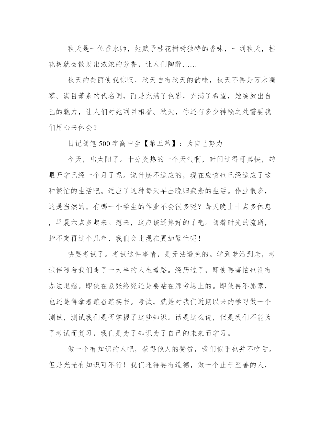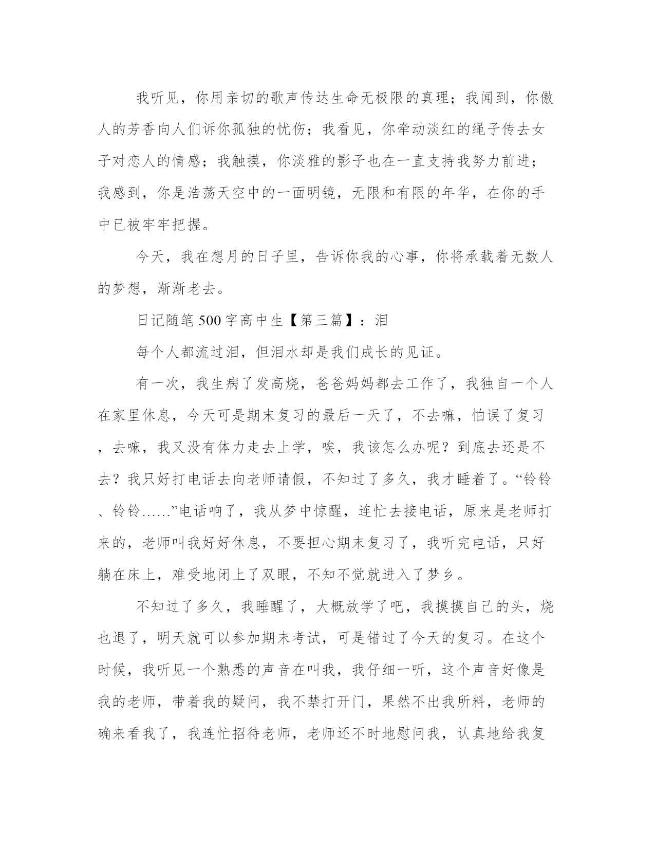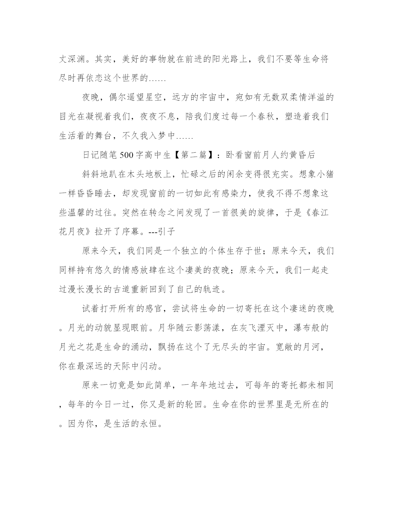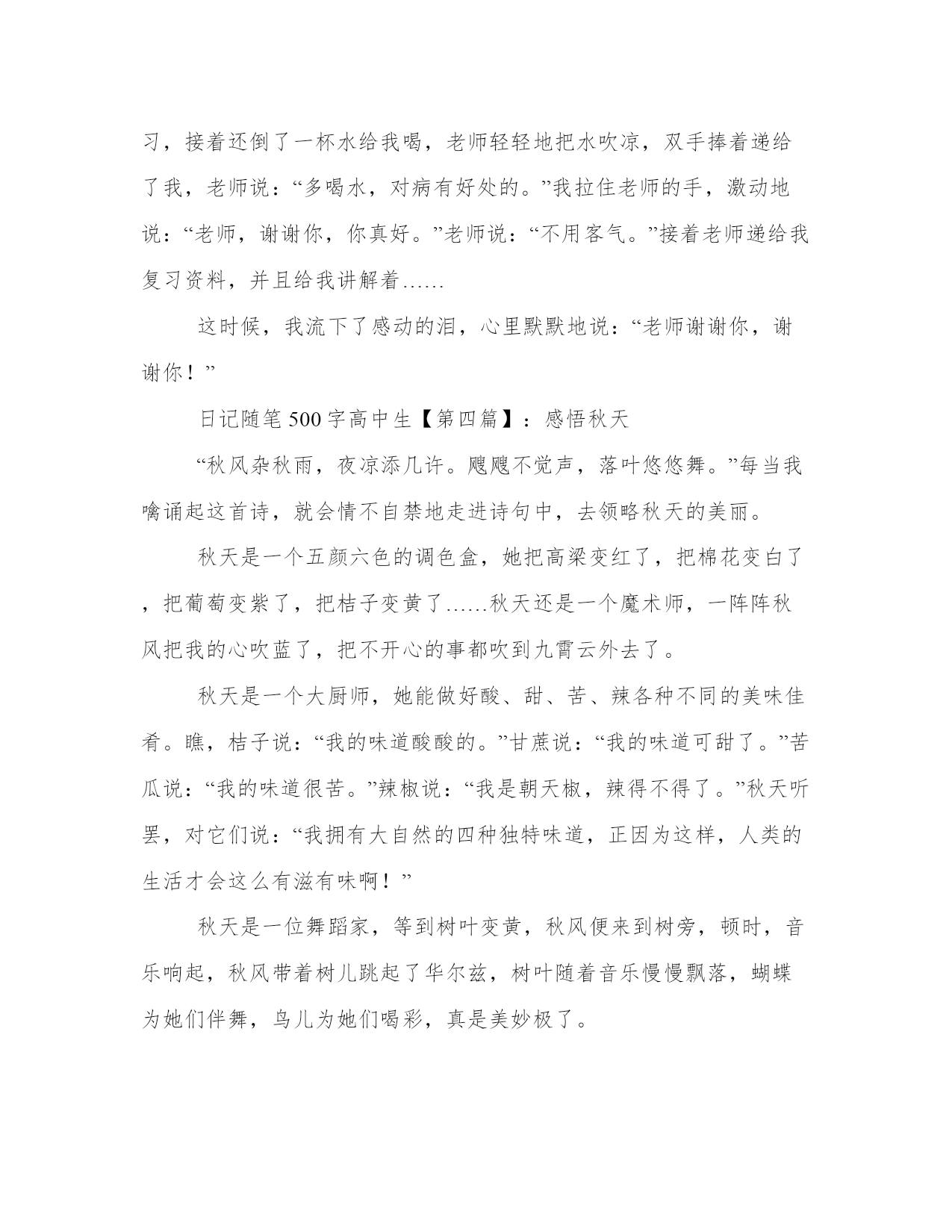 【日记随笔500字初中】日记随笔500字高中生【www.sxqingyun.com--伤感说说】日记日记天天记,那么就和大家一起分享吧!以下就是来自随笔网小编为大家整理的日记随笔500字高中生,欢迎阅读和借鉴。日记随笔500字高中生【第一篇】:寒冷依旧可温暖白天寒气袭遍全身,晚入宿舍寒气逼人。眼下,外面是冰天雪地,外出时走在冰天雪地的环境中,人们总会有些失望与伤感,可是失望惧我,我怕什么?几天后,小草初生,阳光普照大地,夕阳中,残照里,和煦的东风送来又一年的美好景色。春天在冬后接踵而至,虽然,初春如丝的细雨中透着几分寒意,但春风中人们已投入生活的美妙创造之中。现在,田野里、山林边仍没有绿油油、芳草如茵的草甸子,微寒中也略带一些萧瑟,寒气仍堪忧。多烦人生未尝不为悲哀,少思忧愁何尝不是解脱?何不将那一切萧瑟与寂寞抛向九霄,来对酒当歌唱出心中喜悦,轰轰烈烈把握青春年华?我尝试着和蓝天碧海作伴,和太阳的情人月亮共醉晴空,这其间,仿佛天上仙境都坠入人间与民共享。我时常到书中去找寻黄金屋、颜如玉,可终是有心栽花花不开。很多人在寻求生活的解脱,有的在前进的路上,有的一不小心误入万丈深渊。其实,美好的事物就在前进的阳光路上,我们不要等生命将尽时再依恋这个世界的……夜晚,偶尔遥望星空,远方的宇宙中,宛如有无数双柔情洋溢的目光在凝视着我们,夜夜不息,陪我们度过每一个春秋,塑造着我们生活着的舞台,不久我入梦中……日记随笔500字高中生【第二篇】:卧看窗前月人约黄昏后斜斜地趴在木头地板上,忙碌之后的闲余变得很充实。想象小猪一样昏昏睡去,却发现窗前的一切如此有感染力,使我不得不想象这些温馨的过往。突然在转念之间发现了一首很美的旋律,于是《春江花月夜》拉开了序幕。---引子原来今天,我们同是一个独立的个体生存于世;原来今天,我们同样持有悠久的情感放肆在这个凄美的夜晚;原来今天,我们一起走过漫长漫长的古道重新回到了自己的轨迹。试着打开所有的感官,尝试将生命的一切寄托在这个凄迷的夜晚。月光的动貌显现眼前。月华随云影荡漾,在灰飞湮灭中,瀑布般的月光之花是生命的涌动,飘扬在这个了无尽头的宇宙。宽敞的月河,你在最深远的天际中闪动。原来一切竟是如此简单,一年年地过去,可每年的寄托都未相同,每年的今日一过,你又是新的轮回。生命在你的世界里是无所在的。因为你,是生活的永恒。我听见,你用亲切的歌声传达生命无极限的真理;我闻到,你傲人的芳香向人们诉你孤独的忧伤;我看见,你牵动淡红的绳子传去女子对恋人的情感;我触摸,你淡雅的影子也在一直支持我努力前进;我感到,你是浩荡天空中的一面明镜,无限和有限的年华,在你的手中已被牢牢把握。今天,我在想月的日子里,告诉你我的心事,你将承载着无数人的梦想,渐渐老去。日记随笔500字高中生【第三篇】:泪每个人都流过泪,但泪水却是我们成长的见证。有一次,我生病了发高烧,爸爸妈妈都去工作了,我独自一个人在家里休息,今天可是期末复习的最后一天了,不去嘛,怕误了复习,去嘛,我又没有体力走去上学,唉,我该怎么办呢?到底去还是不去?我只好打电话去向老师请假,不知过了多久,我才睡着了。“铃铃、铃铃……”电话响了,我从梦中惊醒,连忙去接电话,原来是老师打来的,老师叫我好好休息,不要担心期末复习了,我听完电话,只好躺在床上,难受地闭上了双眼,不知不觉就进入了梦乡。不知过了多久,我睡醒了,大概放学了吧,我摸摸自己的头,烧也退了,明天就可以参加期末考试,可是错过了今天的复习。在这个时候,我听见一个熟悉的声音在叫我,我仔细一听,这个声音好像是我的老师,带着我的疑问,我不禁打开门,果然不出我所料,老师的确来看我了,我连忙招待老师,老师还不时地慰问我,认真地给我复习,接着还倒了一杯水给我喝,老师轻轻地把水吹凉,双手捧着递给了我,老师说:“多喝水,对病有好处的。”我拉住老师的手,激动地说:“老师,谢谢你,你真好。”老师说:“不用客气。”接着老师递给我复习资料,并且给我讲解着……这时候,我流下了感动的泪,心里默默地说:“老师谢谢你,谢谢你!”日记随笔500字高中生【第四篇】:感悟秋天“秋风杂秋雨,夜凉添几许。飕飕不觉声,落叶悠悠舞。”每当我噙诵起这首诗,就会情不自禁地走进诗句中,去领略秋天的美丽。秋天是一个五颜六色的调色盒,她把高梁变红了,把棉花变白了,把葡萄变紫了,把桔子变黄了……秋天还是一个魔术师,一阵阵秋风把我的心吹蓝了,把不开心的事都吹到九霄云外去了。秋天是一个大厨师,她能做好酸、甜、苦、辣各种不同的美味佳肴。瞧,桔子说:“我的味道酸酸的。”甘蔗说:“我的味道可甜了。”苦瓜说:“我的味道很苦。”辣椒说:“我是朝天椒,辣得不得了。”秋天听罢,对它们说:“我拥有大自然的四种独特味道,正因为这样,人类的生活才会这么有滋有味啊!”秋天是一位舞蹈家,等到树叶变黄,秋风便来到树旁