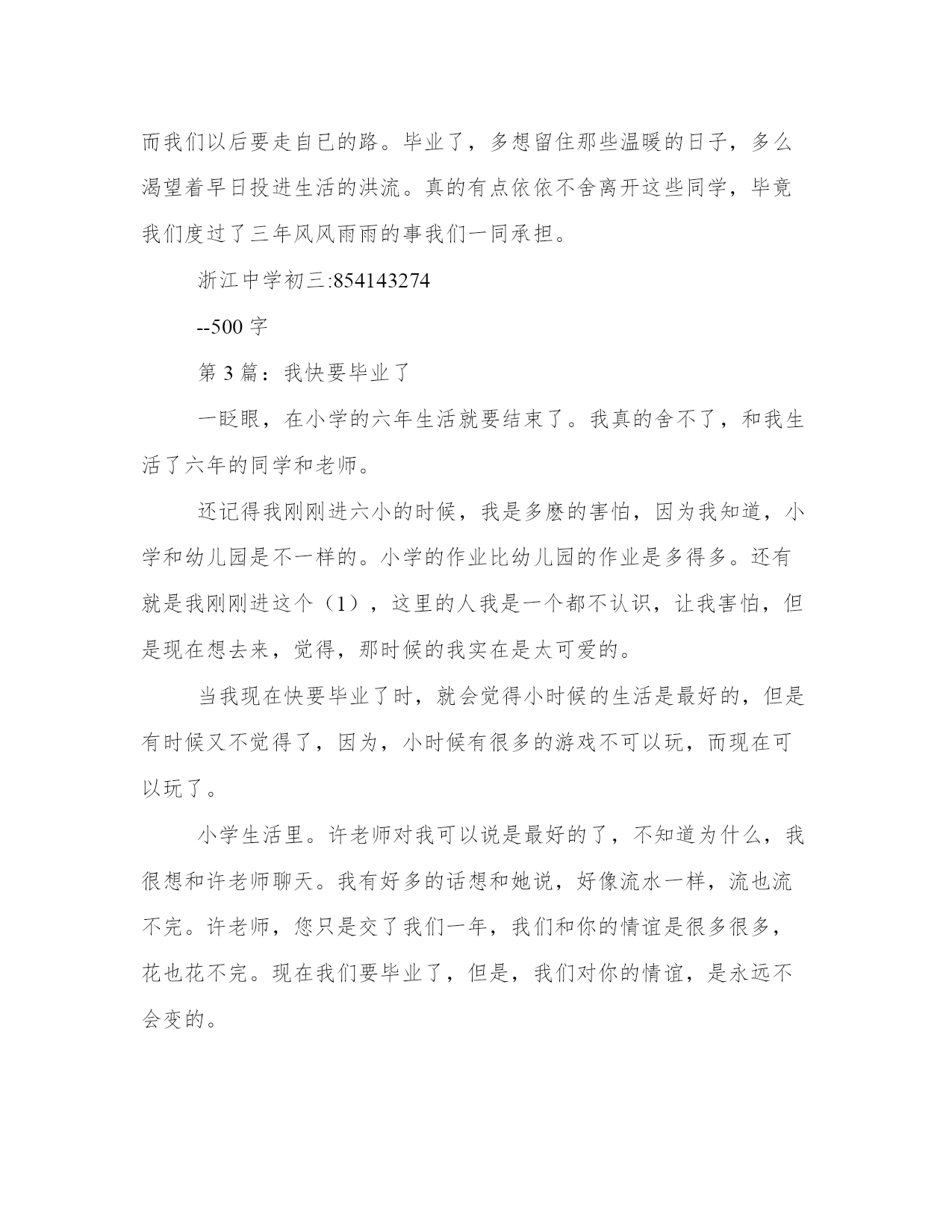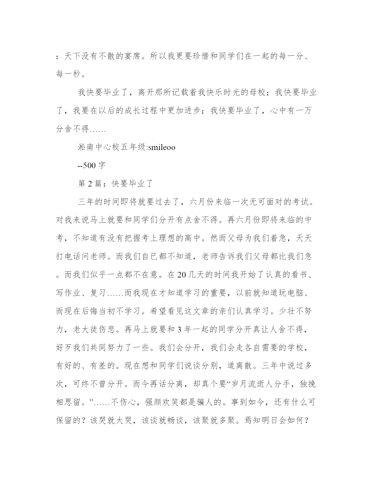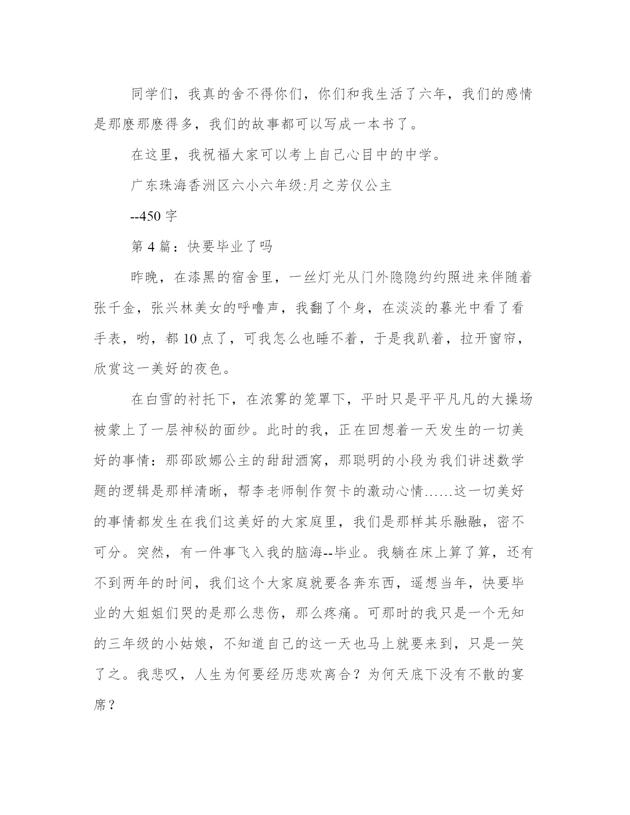 关于小学毕业的作文精选15篇【www.sxqingyun.com--小学作文】第1篇:我快要毕业了一转眼,五年级就过去了。马上就要离开母校了;马上就要和朝夕相处的同学们分别;马上就要和教导我们的老师分别;马上我也要毕业了!五年级了,再也没有像之前那么多的欢声笑语,更多的是大家奋笔疾书的“沙沙”声。我即将毕业了,作业的压力,成绩的压力,父母的期待都压在了我的身上。我知道:只有考到了好的中学,老师才能满意,父母才能欣慰。所以现在的辛苦学习,才能让以后更加好。在这快要毕业的日子里,我要表现得更好,在最后的一年里在学校留下我美丽的身影。昨天,竞选了大队委员,我们五年级的同学都很看重这次机会,努力的把最好的状态呈献给大家。我成功的入选了大队委员。我暗暗对自己说:这是最后一次在母校戴上大队委员的标志,我一定要尽全力做一名称职的大队委员,让我在快要毕业的最后一年里不留下遗憾。每次我看到操场上那一阵阵欢笑,我都很羡慕一二年级的小朋友,我又一想:人总是要长大,总有一天他们也会要离开母校,俗话说:天下没有不散的宴席。所以我更要珍惜和同学们在一起的每一分、每一秒。我快要毕业了,离开那所记载着我快乐时光的母校;我快要毕业了,我要在以后的成长过程中更加进步;我快要毕业了,心中有一万分舍不得……淞南中心校五年级:smileoo--500字第2篇:快要毕业了三年的时间即将就要过去了,六月份来临一次无可面对的考试。对我来说马上就要和同学们分开有点舍不得。再六月份即将来临的中考,不知道有没有把握考上理想的高中。然而父母为我们着急,天天打电话问老师。而我们自已都不知道,老师告诉我们父母都比我们急。而我们似乎一点都不在意。在20几天的时间我开始了认真的看书、写作业、复习……而我现在才知道学习的重要,以前就知道玩电脑、而现在后悔当初不学习。希望看见这文章的亲们认真学习。少壮不努力,老大徒伤悲。再马上就要和3年一起的同学分开真让人舍不得,好歹我们共同努力了一些。我们会分开,我们会走各自需要的学校,有好的、有差的。现在想和同学们说谈分别,道离散。三年中说过多次,可终不曾分开。而今再话分离,却真个要“岁月流逝人分手,独挽相思留。”……不伤心,强颜欢笑都是骗人的。事到如今,还有什么可保留的?该哭就大哭,该谈就畅谈,该聚就多聚。焉知明日会如何?而我们以后要走自已的路。毕业了,多想留住那些温暖的日子,多么渴望着早日投进生活的洪流。真的有点依依不舍离开这些同学,毕竟我们度过了三年风风雨雨的事我们一同承担。浙江中学初三:854143274--500字第3篇:我快要毕业了一眨眼,在小学的六年生活就要结束了。我真的舍不了,和我生活了六年的同学和老师。还记得我刚刚进六小的时候,我是多麽的害怕,因为我知道,小学和幼儿园是不一样的。小学的作业比幼儿园的作业是多得多。还有就是我刚刚进这个(1),这里的人我是一个都不认识,让我害怕,但是现在想去来,觉得,那时候的我实在是太可爱的。当我现在快要毕业了时,就会觉得小时候的生活是最好的,但是有时候又不觉得了,因为,小时候有很多的游戏不可以玩,而现在可以玩了。小学生活里。许老师对我可以说是最好的了,不知道为什么,我很想和许老师聊天。我有好多的话想和她说,好像流水一样,流也流不完。许老师,您只是交了我们一年,我们和你的情谊是很多很多,花也花不完。现在我们要毕业了,但是,我们对你的情谊,是永远不会变的。同学们,我真的舍不得你们,你们和我生活了六年,我们的感情是那麽那麽得多,我们的故事都可以写成一本书了。在这里,我祝福大家可以考上自己心目中的中学。广东珠海香洲区六小六年级:月之芳仪公主--450字第4篇:快要毕业了吗昨晚,在漆黑的宿舍里,一丝灯光从门外隐隐约约照进来伴随着张千金,张兴林美女的呼噜声,我翻了个身,在淡淡的暮光中看了看手表,哟,都10点了,可我怎么也睡不着,于是我趴着,拉开窗帘,欣赏这一美好的夜色。在白雪的衬托下,在浓雾的笼罩下,平时只是平平凡凡的大操场被蒙上了一层神秘的面纱。此时的我,正在回想着一天发生的一切美好的事情:那邵欧娜公主的甜甜酒窝,那聪明的小段为我们讲述数学题的逻辑是那样清晰,帮李老师制作贺卡的激动心情……这一切美好的事情都发生在我们这美好的大家庭里,我们是那样其乐融融,密不可分。突然,有一件事飞入我的脑海--毕业。我躺在床上算了算,还有不到两年的时间,我们这个大家庭就要各奔东西,遥想当年,快要毕业的大姐姐们哭的是那么悲伤,那么疼痛。可那时的我只是一个无知的三年级的小姑娘,不知道自己的这一天也马上就要来到,只是一笑了之。我悲叹,人生为何要经历悲欢离合?为何天底下没有不散的宴席?转眼间,五年半的小学生活即将面临末端,回想起来,那一场场演出,一个个比赛,一次次欢呼,一声声哭泣都充满了我们的感情,喜怒哀乐是那样与我们密不可分,与同学在一起的
