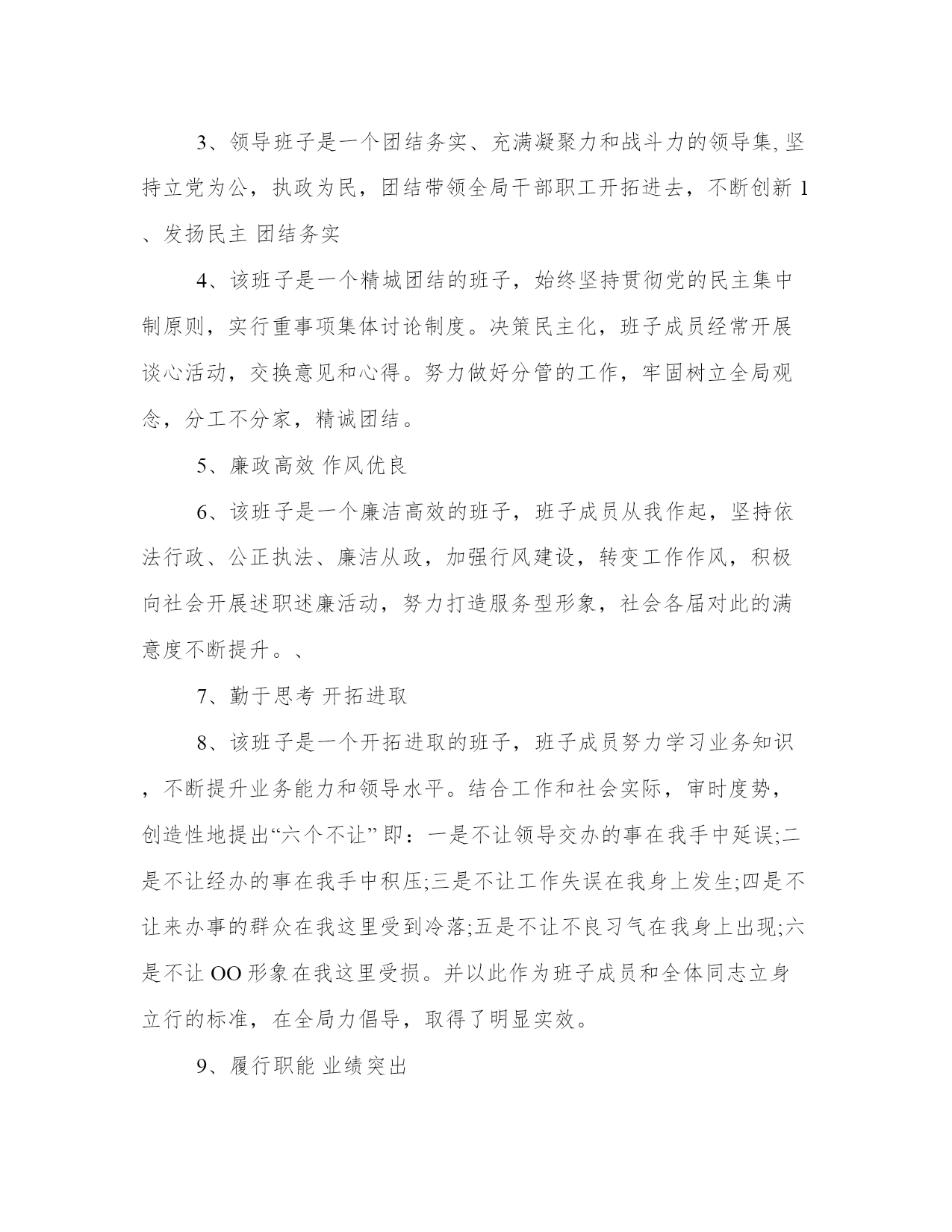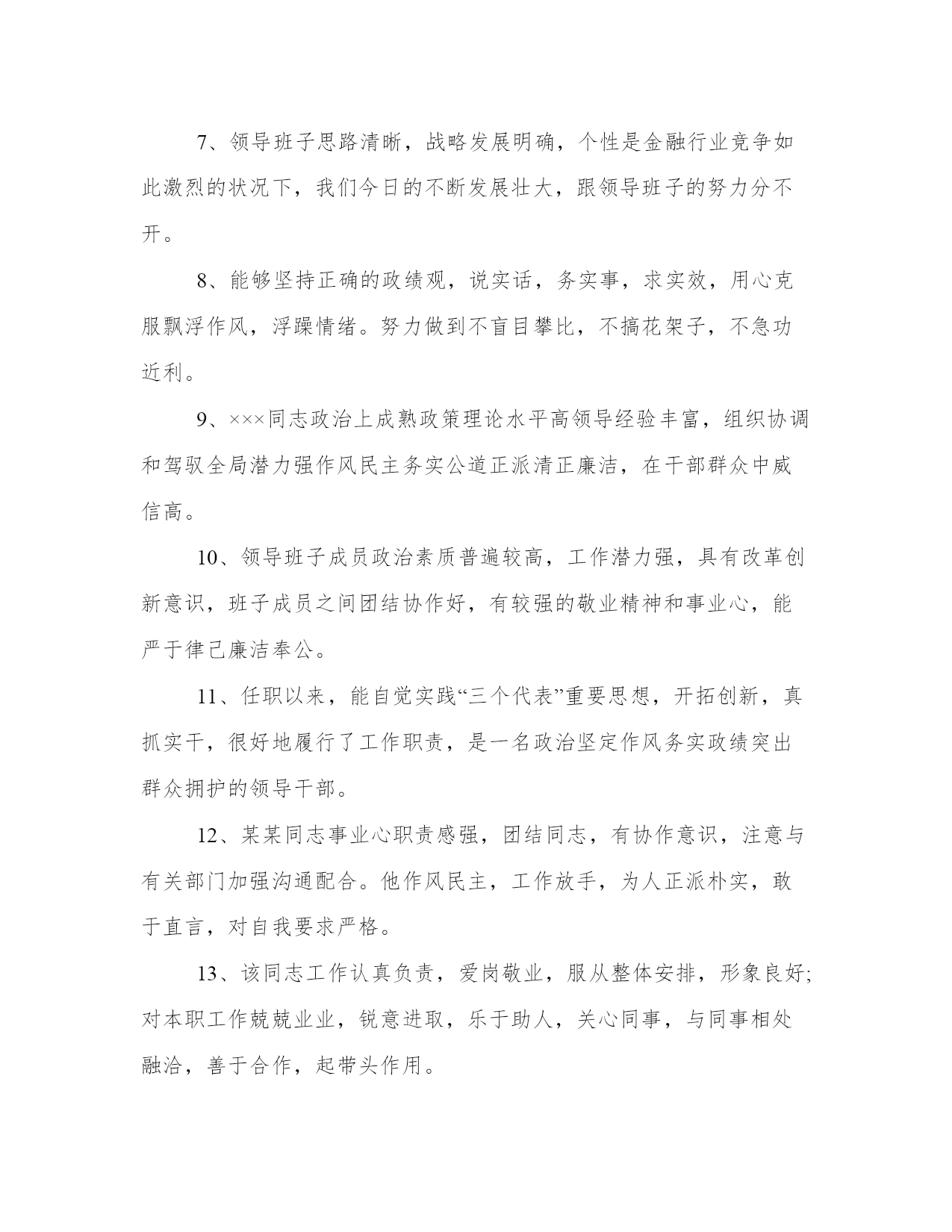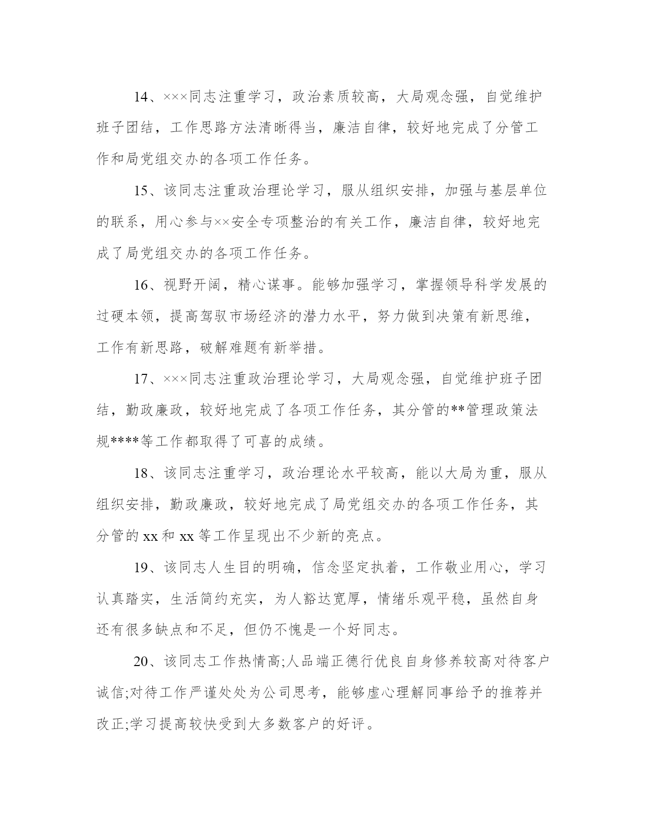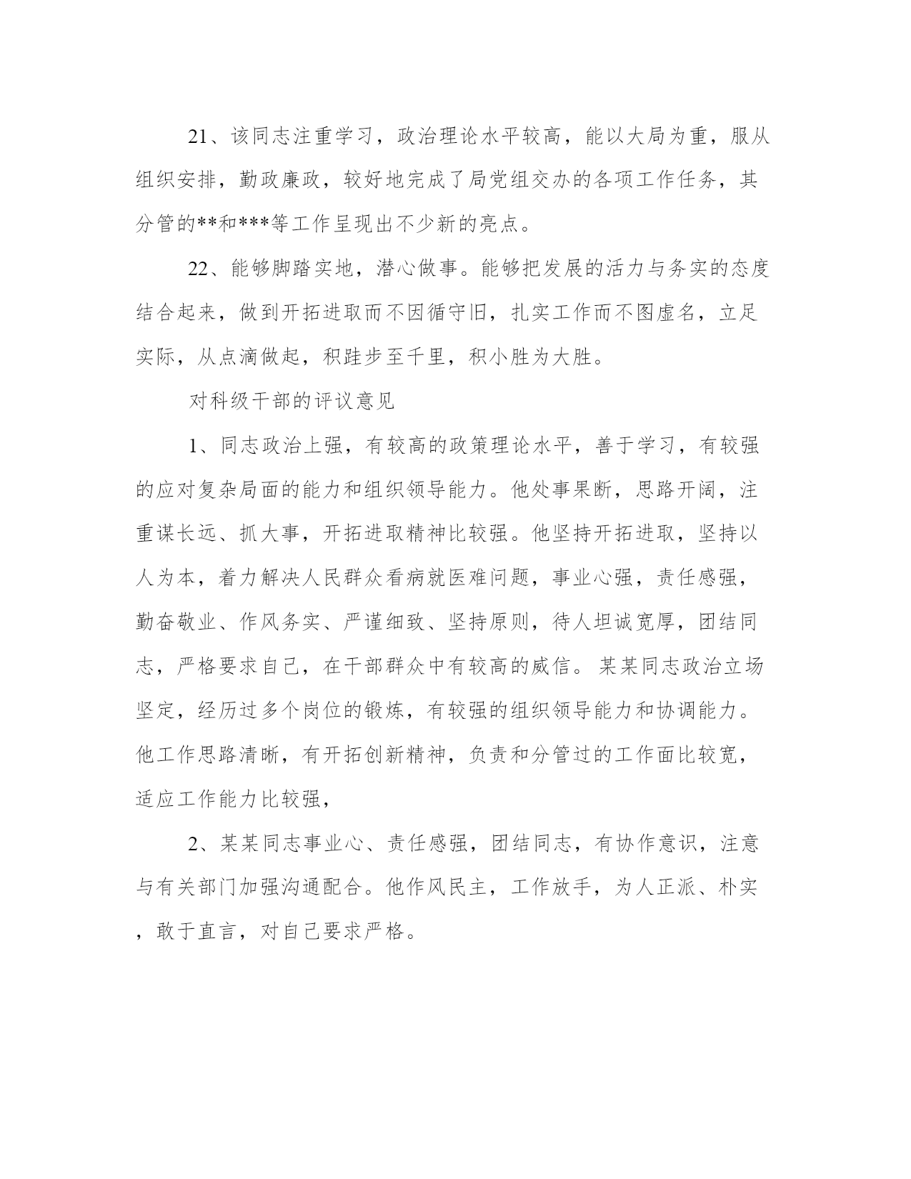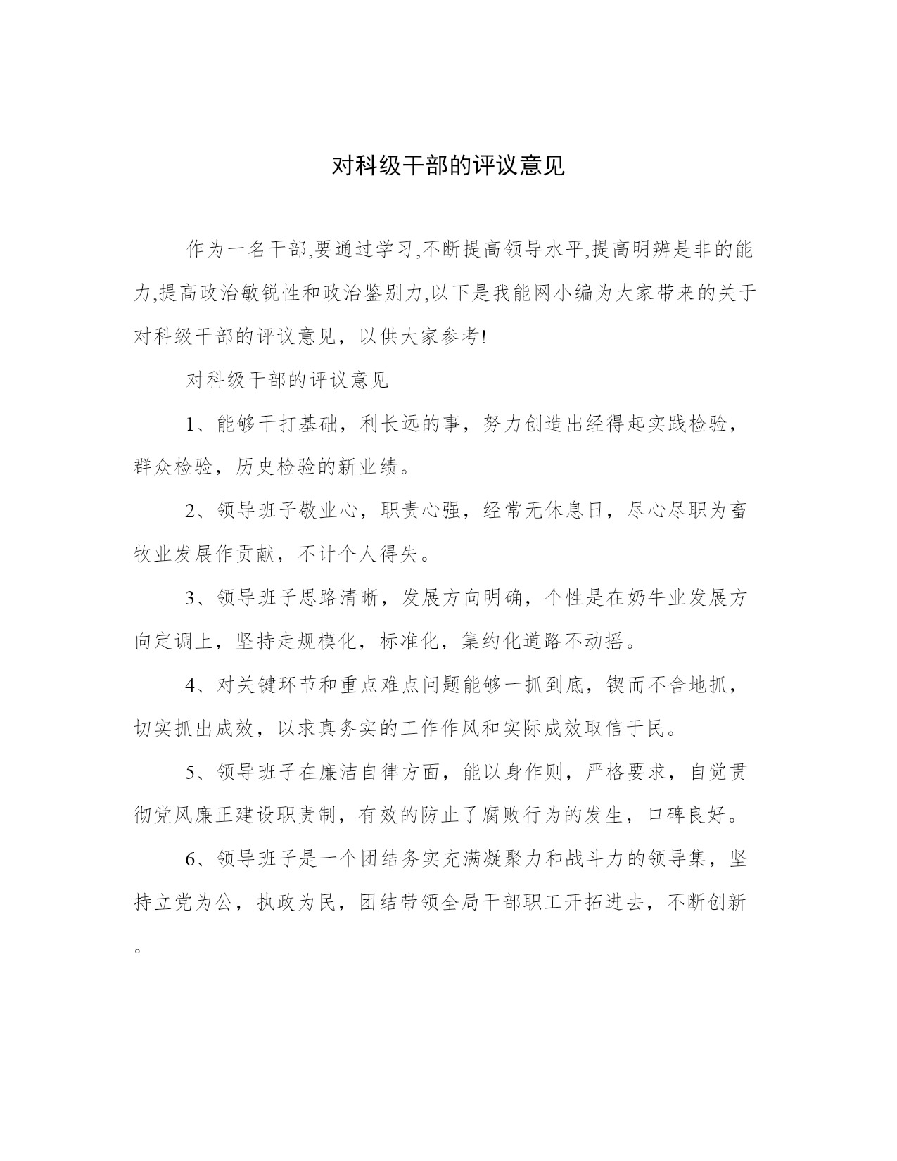 对科级干部的评议意见作为一名干部,要通过学习,不断提高领导水平,提高明辨是非的能力,提高政治敏锐性和政治鉴别力,以下是我能网小编为大家带来的关于对科级干部的评议意见,以供大家参考!对科级干部的评议意见1、能够干打基础,利长远的事,努力创造出经得起实践检验,群众检验,历史检验的新业绩。2、领导班子敬业心,职责心强,经常无休息日,尽心尽职为畜牧业发展作贡献,不计个人得失。3、领导班子思路清晰,发展方向明确,个性是在奶牛业发展方向定调上,坚持走规模化,标准化,集约化道路不动摇。4、对关键环节和重点难点问题能够一抓到底,锲而不舍地抓,切实抓出成效,以求真务实的工作作风和实际成效取信于民。5、领导班子在廉洁自律方面,能以身作则,严格要求,自觉贯彻党风廉正建设职责制,有效的防止了腐败行为的发生,口碑良好。6、领导班子是一个团结务实充满凝聚力和战斗力的领导集,坚持立党为公,执政为民,团结带领全局干部职工开拓进去,不断创新。7、领导班子思路清晰,战略发展明确,个性是金融行业竞争如此激烈的状况下,我们今日的不断发展壮大,跟领导班子的努力分不开。8、能够坚持正确的政绩观,说实话,务实事,求实效,用心克服飘浮作风,浮躁情绪。努力做到不盲目攀比,不搞花架子,不急功近利。9、×××同志政治上成熟政策理论水平高领导经验丰富,组织协调和驾驭全局潜力强作风民主务实公道正派清正廉洁,在干部群众中威信高。10、领导班子成员政治素质普遍较高,工作潜力强,具有改革创新意识,班子成员之间团结协作好,有较强的敬业精神和事业心,能严于律己廉洁奉公。11、任职以来,能自觉实践“三个代表”重要思想,开拓创新,真抓实干,很好地履行了工作职责,是一名政治坚定作风务实政绩突出群众拥护的领导干部。12、某某同志事业心职责感强,团结同志,有协作意识,注意与有关部门加强沟通配合。他作风民主,工作放手,为人正派朴实,敢于直言,对自我要求严格。13、该同志工作认真负责,爱岗敬业,服从整体安排,形象良好;对本职工作兢兢业业,锐意进取,乐于助人,关心同事,与同事相处融洽,善于合作,起带头作用。14、×××同志注重学习,政治素质较高,大局观念强,自觉维护班子团结,工作思路方法清晰得当,廉洁自律,较好地完成了分管工作和局党组交办的各项工作任务。15、该同志注重政治理论学习,服从组织安排,加强与基层单位的联系,用心参与××安全专项整治的有关工作,廉洁自律,较好地完成了局党组交办的各项工作任务。16、视野开阔,精心谋事。能够加强学习,掌握领导科学发展的过硬本领,提高驾驭市场经济的潜力水平,努力做到决策有新思维,工作有新思路,破解难题有新举措。17、×××同志注重政治理论学习,大局观念强,自觉维护班子团结,勤政廉政,较好地完成了各项工作任务,其分管的**管理政策法规****等工作都取得了可喜的成绩。18、该同志注重学习,政治理论水平较高,能以大局为重,服从组织安排,勤政廉政,较好地完成了局党组交办的各项工作任务,其分管的xx和xx等工作呈现出不少新的亮点。19、该同志人生目的明确,信念坚定执着,工作敬业用心,学习认真踏实,生活简约充实,为人豁达宽厚,情绪乐观平稳,虽然自身还有很多缺点和不足,但仍不愧是一个好同志。20、该同志工作热情高;人品端正德行优良自身修养较高对待客户诚信;对待工作严谨处处为公司思考,能够虚心理解同事给予的推荐并改正;学习提高较快受到大多数客户的好评。21、该同志注重学习,政治理论水平较高,能以大局为重,服从组织安排,勤政廉政,较好地完成了局党组交办的各项工作任务,其分管的**和***等工作呈现出不少新的亮点。22、能够脚踏实地,潜心做事。能够把发展的活力与务实的态度结合起来,做到开拓进取而不因循守旧,扎实工作而不图虚名,立足实际,从点滴做起,积跬步至千里,积小胜为大胜。对科级干部的评议意见1、同志政治上强,有较高的政策理论水平,善于学习,有较强的应对复杂局面的能力和组织领导能力。他处事果断,思路开阔,注重谋长远、抓大事,开拓进取精神比较强。他坚持开拓进取,坚持以人为本,着力解决人民群众看病就医难问题,事业心强,责任感强,勤奋敬业、作风务实、严谨细致、坚持原则,待人坦诚宽厚,团结同志,严格要求自己,在干部群众中有较高的威信。某某同志政治立场坚定,经历过多个岗位的锻炼,有较强的组织领导能力和协调能力。他工作思路清晰,有开拓创新精神,负责和分管过的工作面比较宽,适应工作能力比较强,2、某某同志事业心、责任感强,团结同志,有协作意识,注意与有关部门加强沟通配合。他作风民主,工作放手,为人正派、朴实,敢于直言,对自己要求严格。3、领导班子是一个团结务实、充满凝聚力和战斗力的领导集,坚持立党为公,执政为民,团结带领全局干部职工开拓进去,不断创新1、发扬民主团结务实4、该班子是一个精城团结的班子,