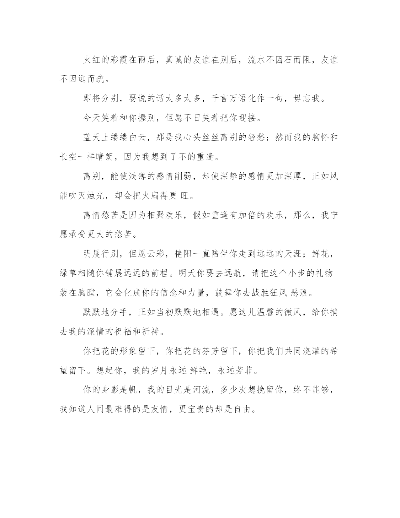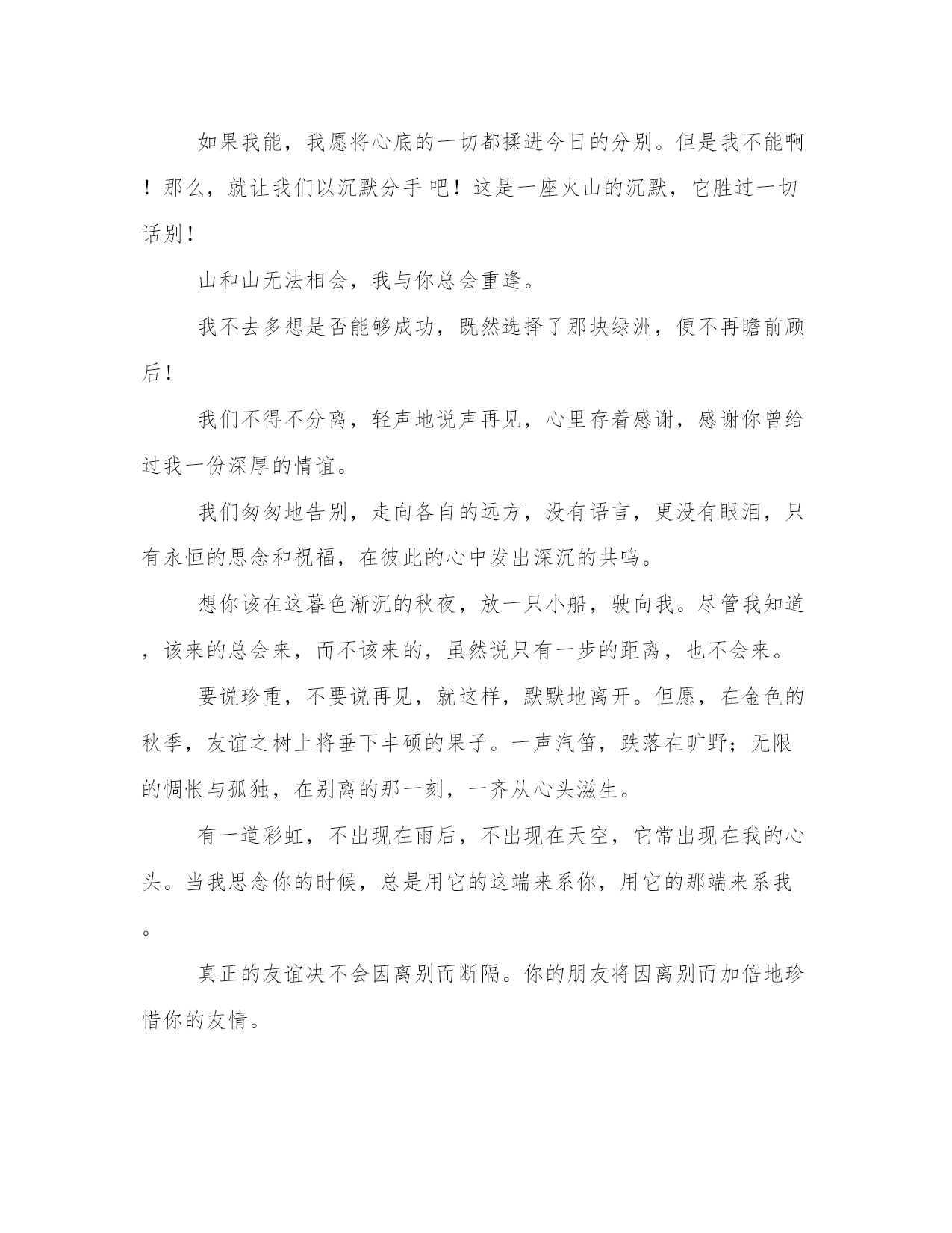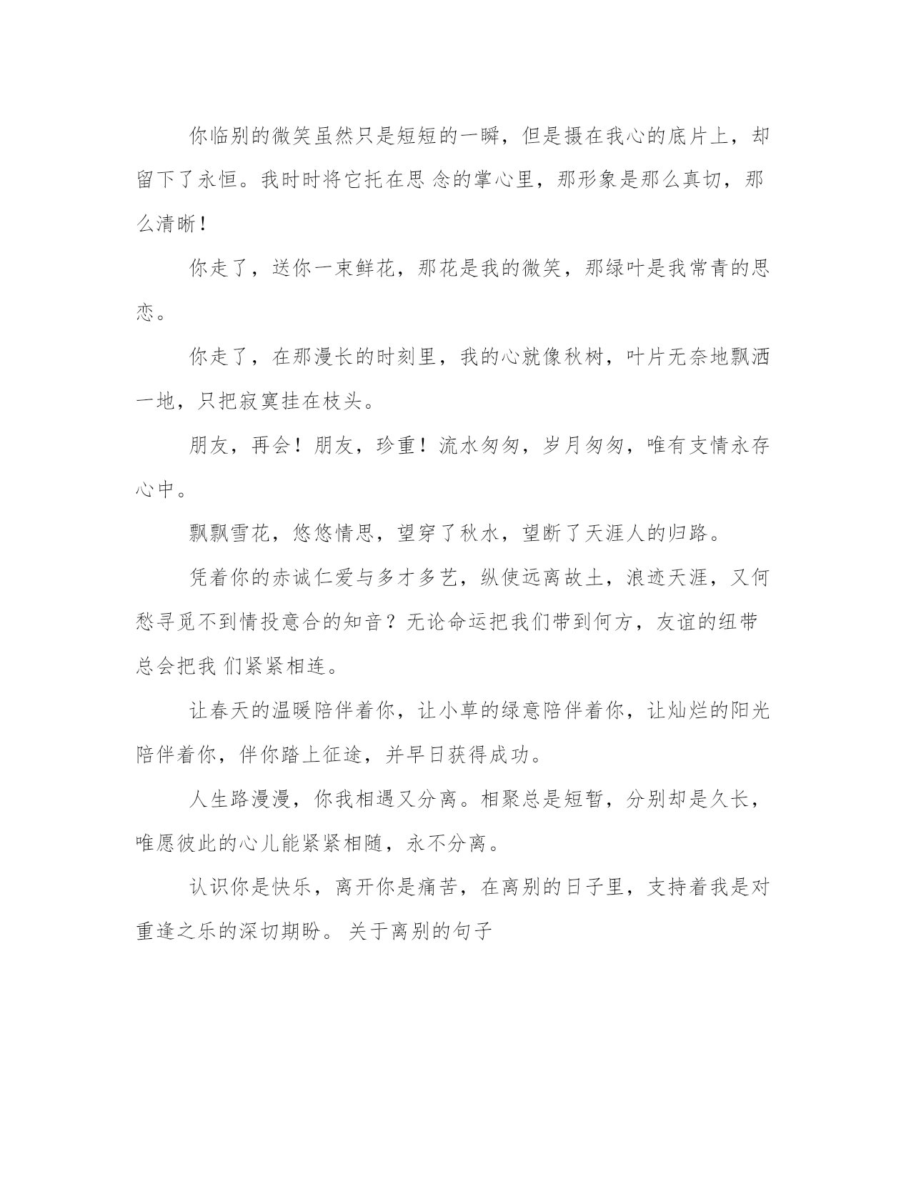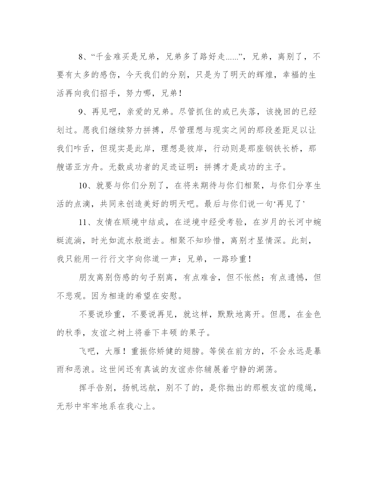 经典离别伤感的句子大全【www.sxqingyun.com--伤感说说】兄弟离别伤感句子:1、离别是为了相聚,相逢的人还会再相逢离时雨水皆化酒,待得重逢两兄弟一世情,两兄弟,不需要太多语言2、第一次庆祝第一次打架第一次在街上闲逛兜里还没钱兄弟谁也忘不了如今兄弟要去外地上学临别为什么什么也说不出来3、那个啥,自己多保重,有事我也就不过来了,我会打电话给你表哥的4、真正的朋友不用多说什么,我们很冲动,也很爱玩,但是早晚你们都会有自己的生活,都为自己以后的生活努力吧,说多了都是故事,再说就没意思,啥也不说了,都在酒里了!!5、特么的吧眼泪擦干净,我能哭你不能哭,好好照顾自己,没事联系,有事就更得联系6、兄弟!混好了别忘了哥们,送君千里终须一别,相见不如思念。等你回来大醉三天。7、朋友是财富,兄弟是手足。有些话不必多说,祝你生活幸福,健康平安,珍重。8、“千金难买是兄弟,兄弟多了路好走......”,兄弟,离别了,不要有太多的感伤,今天我们的分别,只是为了明天的辉煌,幸福的生活再向我们招手,努力哪,兄弟!9、再见吧,亲爱的兄弟。尽管抓住的或已失落,该挽回的已经划过。愿我们继续努力拼搏,尽管理想与现实之间的那段差距足以让我们咋舌,但现实是此岸,理想是彼岸,行动则是那座钢铁长桥,那艘诺亚方舟。无数成功者的足迹证明:拼搏才是成功的主子。10、就要与你们分别了,在将来期待与你们相聚,与你们分享生活的点滴,共同来创造美好的明天吧。最后与你们说一句‘再见了’11、友情在顺境中结成,在逆境中经受考验,在岁月的长河中蜿蜒流淌,时光如流水般逝去。相聚不知珍惜,离别才显情深。此刻,我只能用一行行文字向你道一声:兄弟,一路珍重!朋友离别伤感的句子别离,有点难舍,但不怅然;有点遗憾,但不悲观。因为相逢的希望在安慰。不要说珍重,不要说再见,就这样,默默地离开。但愿,在金色的秋季,友谊之树上将垂下丰硕的果子。飞吧,大雁!重振你矫健的翅膀。等侯在前方的,不会永远是暴雨和恶浪。这世间还有真诚的友谊赤你辅展着宁静的湖荡。挥手告别,扬帆远航,别不了的,是你抛出的那根友谊的缆绳,无形中牢牢地系在我心上。火红的彩霞在雨后,真诚的友谊在别后,流水不因石而阻,友谊不因远而疏。即将分别,要说的话太多太多,千言万语化作一句,毋忘我。今天笑着和你握别,但愿不日笑着把你迎接。蓝天上缕缕白云,那是我心头丝丝离别的轻愁;然而我的胸怀和长空一样晴朗,因为我想到了不的重逢。离别,能使浅薄的感情削弱,却使深挚的感情更加深厚,正如风能吹灭烛光,却会把火扇得更旺。离情愁苦是因为相聚欢乐,假如重逢有加倍的欢乐,那么,我宁愿承受更大的愁苦。明晨行别,但愿云彩,艳阳一直陪伴你走到远远的天涯;鲜花,绿草相随你铺展远远的前程。明天你要去远航,请把这个小步的礼物装在胸膛,它会化成你的信念和力量,鼓舞你去战胜狂风恶浪。默默地分手,正如当初默默地相遇。愿这儿温馨的微风,给你捎去我的深情的祝福和祈祷。你把花的形象留下,你把花的芬芳留下,你把我们共同浇灌的希望留下。想起你,我的岁月永远鲜艳,永远芳菲。你的身影是帆,我的目光是河流,多少次想挽留你,终不能够,我知道人间最难得的是友情,更宝贵的却是自由。你临别的微笑虽然只是短短的一瞬,但是摄在我心的底片上,却留下了永恒。我时时将它托在思念的掌心里,那形象是那么真切,那么清晰!你走了,送你一束鲜花,那花是我的微笑,那绿叶是我常青的思恋。你走了,在那漫长的时刻里,我的心就像秋树,叶片无奈地飘洒一地,只把寂寞挂在枝头。朋友,再会!朋友,珍重!流水匆匆,岁月匆匆,唯有支情永存心中。飘飘雪花,悠悠情思,望穿了秋水,望断了天涯人的归路。凭着你的赤诚仁爱与多才多艺,纵使远离故土,浪迹天涯,又何愁寻觅不到情投意合的知音?无论命运把我们带到何方,友谊的纽带总会把我们紧紧相连。让春天的温暖陪伴着你,让小草的绿意陪伴着你,让灿烂的阳光陪伴着你,伴你踏上征途,并早日获得成功。人生路漫漫,你我相遇又分离。相聚总是短暂,分别却是久长,唯愿彼此的心儿能紧紧相随,永不分离。认识你是快乐,离开你是痛苦,在离别的日子里,支持着我是对重逢之乐的深切期盼。关于离别的句子如果我能,我愿将心底的一切都揉进今日的分别。但是我不能啊!那么,就让我们以沉默分手吧!这是一座火山的沉默,它胜过一切话别!山和山无法相会,我与你总会重逢。我不去多想是否能够成功,既然选择了那块绿洲,便不再瞻前顾后!我们不得不分离,轻声地说声再见,心里存着感谢,感谢你曾给过我一份深厚的情谊。我们匆匆地告别,走向各自的远方,没有语言,更没有眼泪,只有永恒的思念和祝福,在彼此的心中发出深沉的共鸣。想你该在这暮色渐沉的秋夜,放一只小船,驶向我。尽管我知道,该来的总会来,而不该来的,虽然说只有一步的距离,也不会来。要说珍重,不要说再见,就这样,默默地离开。但