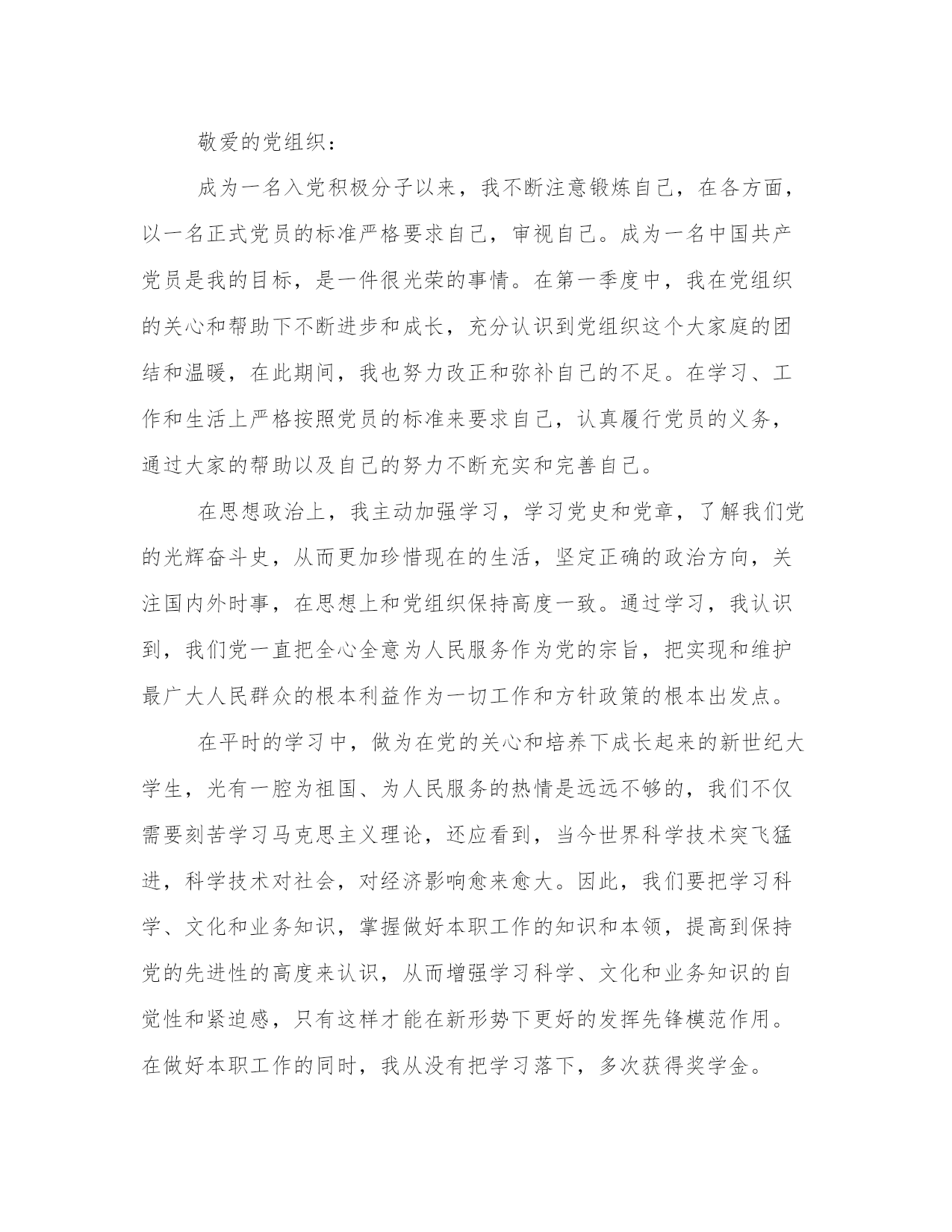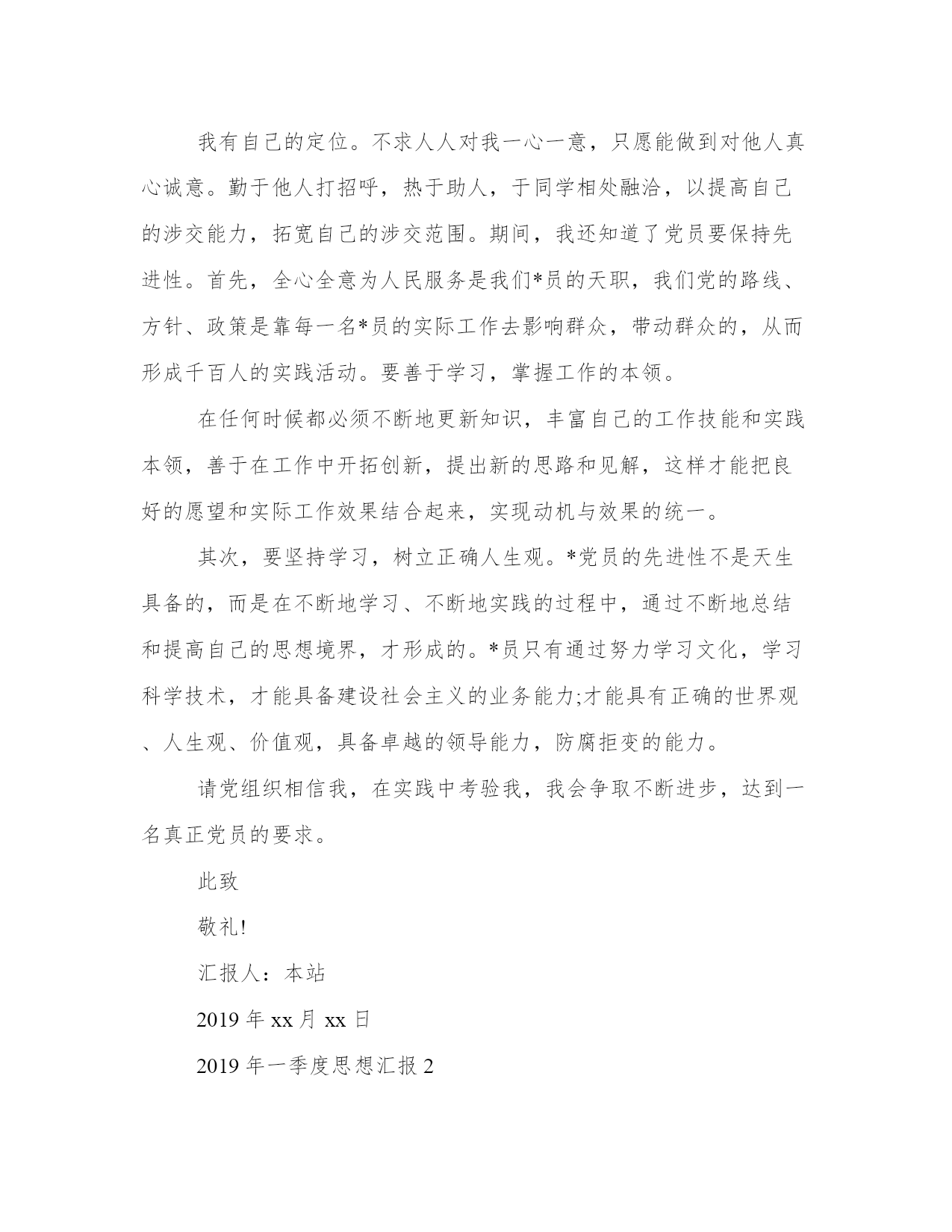 年一季度思想汇报三篇入党积极分子通过学习党的性质、宗旨、指导思想等基本知识,对党的知识有了更深一层的提高,以下是本站小编为大家带来的关于2019年一季度思想汇报,以供大家参考!2019年一季度思想汇报1敬爱的党组织:从20xx年x月x日成为入党积极分子以来,我一直以党员的标准严格的要求自己。经过努力学习,我在思想、学习、生活等方面上有了很大的提升,正式成为入党积极分子已经有一段时间了,为此,感到很荣幸,在初,我在努力学习业务知识的同时,还注重提高政治思想素质。在总结国内外的大事的经验和教训时,我深刻认识到政治思想的指导作用。同时作为一名大学生入党积极分子,我要更加注重政治理论知识的学习和明确当代党员的政治使命和责任,用作为党员的标准来要求自己。至今,我并没有让自己空闲下来,我主动加强政治学习,经常看电视新闻、看报纸、关心时事政治。坚定正确的政治方向,懂得了党员的职责和义务,时刻拿一名党员的标准严格要求自己。我还利用寒假时间锻炼自己,去工厂打工,觉得很荣幸和很有意义,不妄过这个寒假。在各方面有了一定的成长。一、在思想上我进一步明确了入党的基本条件和树立正确的入党动机的重要性。通过步步深入的学习,我对入党要求的认识渐渐从朦胧走向清晰,明白了不仅要在学习中创造入党条件,更要在实践中不断总结,不断进步,理论联系实际,才能成为一名合格的党员发展对象。只有树立了正确的入党动机,才能具有持久不衰的动力,刻苦学习马克思列宁主义、*思想、*理论以及三个代表的重要思想,并将其作为自己的行动指南,更加自觉地贯彻执行党的基本路线,把对共-产主义事业的忠诚同执行党的基本路线统一起来,在改革开放和现代化建设中积极作出贡献;才能够在日常工作、学习和生活的各个方面,更加严格地要求自己,尽力摆正党和人民的利益同个人利益的关系,逐步培养和树立起甘愿吃亏、不怕吃苦、为人民无私奉献的人生价值观;才能够正确对待并解决入党过程中遇到的一些具体问题。同时,也真正认识到只有把全心全意为人民服务,为共产主义事业奋斗终身的崇高理想作为入党的动机,才能在入党的道路上越走越近,越走越快,才能真正领悟和实践组织上入党一生一次,思想上入党一生一世。二、在学习方面我积极主动的完成各项学习任务,广泛涉猎各种知识,形成比较完整的知识结构,努力做一名优秀的学生,及一名优秀的入党积极分子。三、在生活方面我有自己的定位。不求人人对我一心一意,只愿能做到对他人真心诚意。勤于他人打招呼,热于助人,于同学相处融洽,以提高自己的涉交能力,拓宽自己的涉交范围。期间,我还知道了党员要保持先进性。首先,全心全意为人民服务是我们*员的天职,我们党的路线、方针、政策是靠每一名*员的实际工作去影响群众,带动群众的,从而形成千百人的实践活动。要善于学习,掌握工作的本领。在任何时候都必须不断地更新知识,丰富自己的工作技能和实践本领,善于在工作中开拓创新,提出新的思路和见解,这样才能把良好的愿望和实际工作效果结合起来,实现动机与效果的统一。其次,要坚持学习,树立正确人生观。*党员的先进性不是天生具备的,而是在不断地学习、不断地实践的过程中,通过不断地总结和提高自己的思想境界,才形成的。*员只有通过努力学习文化,学习科学技术,才能具备建设社会主义的业务能力;才能具有正确的世界观、人生观、价值观,具备卓越的领导能力,防腐拒变的能力。请党组织相信我,在实践中考验我,我会争取不断进步,达到一名真正党员的要求。此致敬礼!汇报人:本站2019年xx月xx日2019年一季度思想汇报2敬爱的党组织:成为一名入党积极分子以来,我不断注意锻炼自己,在各方面,以一名正式党员的标准严格要求自己,审视自己。成为一名中国共产党员是我的目标,是一件很光荣的事情。在第一季度中,我在党组织的关心和帮助下不断进步和成长,充分认识到党组织这个大家庭的团结和温暖,在此期间,我也努力改正和弥补自己的不足。在学习、工作和生活上严格按照党员的标准来要求自己,认真履行党员的义务,通过大家的帮助以及自己的努力不断充实和完善自己。在思想政治上,我主动加强学习,学习党史和党章,了解我们党的光辉奋斗史,从而更加珍惜现在的生活,坚定正确的政治方向,关注国内外时事,在思想上和党组织保持高度一致。通过学习,我认识到,我们党一直把全心全意为人民服务作为党的宗旨,把实现和维护最广大人民群众的根本利益作为一切工作和方针政策的根本出发点。在平时的学习中,做为在党的关心和培养下成长起来的新世纪大学生,光有一腔为祖国、为人民服务的热情是远远不够的,我们不仅需要刻苦学习马克思主义理论,还应看到,当今世界科学技术突飞猛进,科学技术对社会,对经济影响愈来愈大。因此,我们要把学习科学、文化和业务知识,掌握做好本职工作的知识和本领,提高到保持党的先进性的高度来认识,从而增强学习科学、文化和业务知识的自觉性