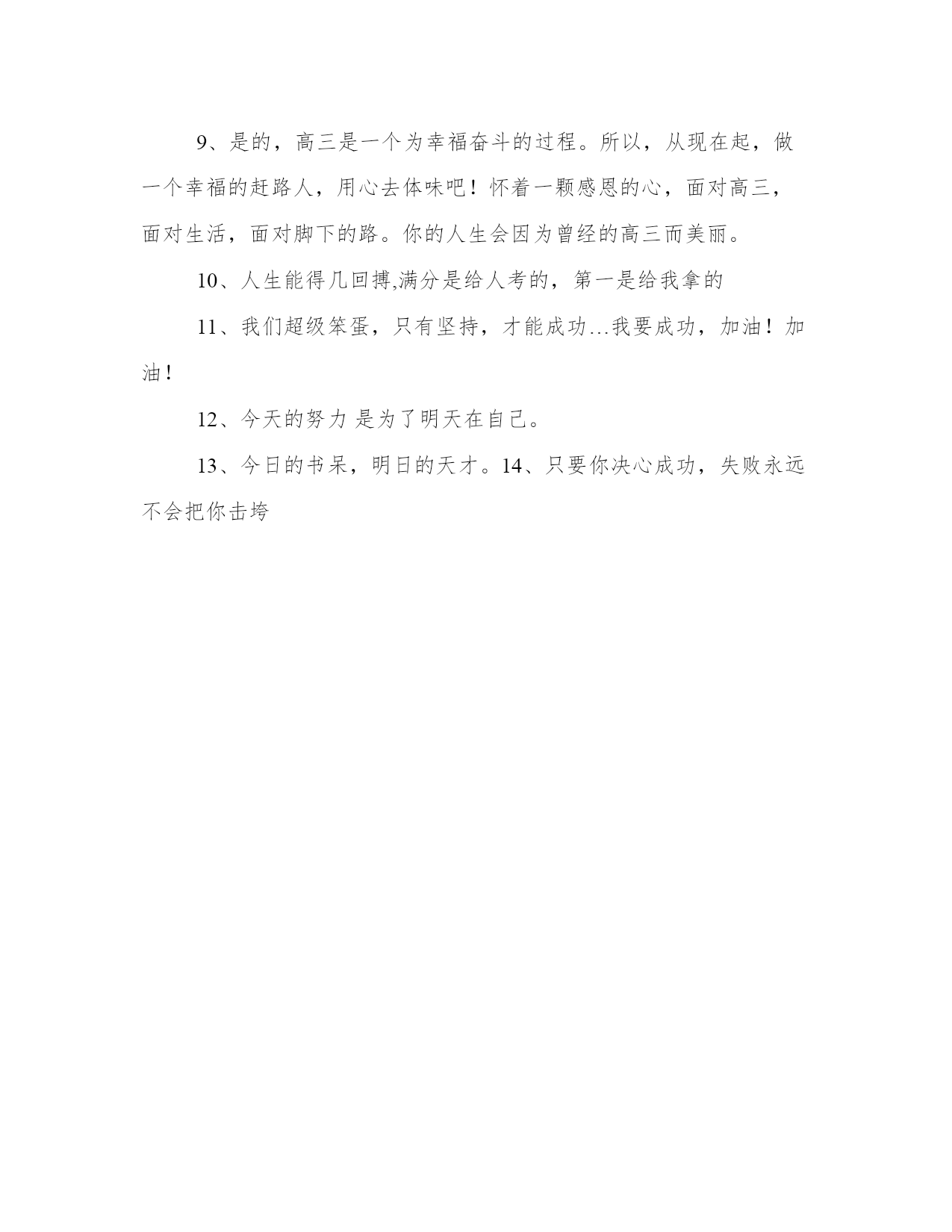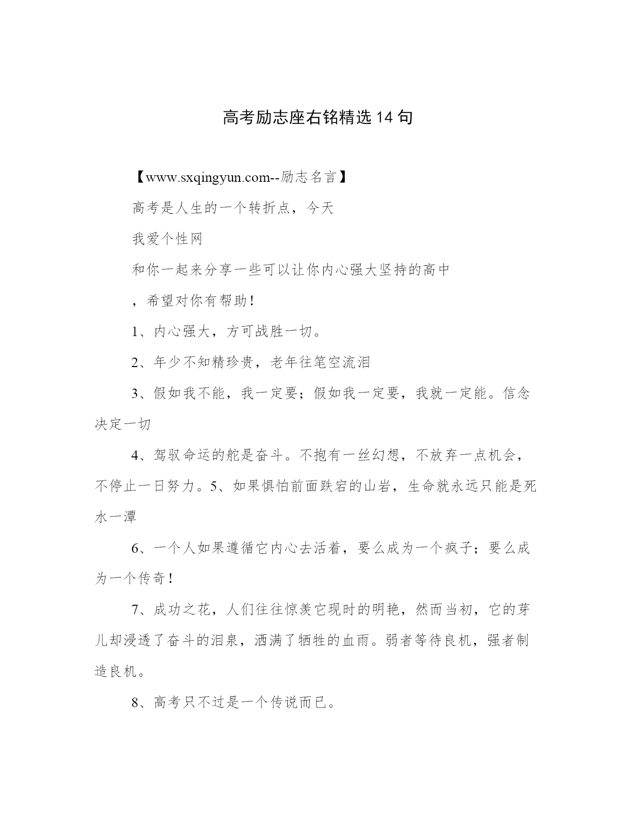 高考励志座右铭精选14句【www.sxqingyun.com--励志名言】高考是人生的一个转折点,今天我爱个性网和你一起来分享一些可以让你内心强大坚持的高中,希望对你有帮助!1、内心强大,方可战胜一切。2、年少不知精珍贵,老年往笔空流泪3、假如我不能,我一定要;假如我一定要,我就一定能。信念决定一切4、驾驭命运的舵是奋斗。不抱有一丝幻想,不放弃一点机会,不停止一日努力。5、如果惧怕前面跌宕的山岩,生命就永远只能是死水一潭6、一个人如果遵循它内心去活着,要么成为一个疯子;要么成为一个传奇!7、成功之花,人们往往惊羡它现时的明艳,然而当初,它的芽儿却浸透了奋斗的泪泉,洒满了牺牲的血雨。弱者等待良机,强者制造良机。8、高考只不过是一个传说而已。9、是的,高三是一个为幸福奋斗的过程。所以,从现在起,做一个幸福的赶路人,用心去体味吧!怀着一颗感恩的心,面对高三,面对生活,面对脚下的路。你的人生会因为曾经的高三而美丽。10、人生能得几回搏,满分是给人考的,第一是给我拿的11、我们超级笨蛋,只有坚持,才能成功…我要成功,加油!加油!12、今天的努力是为了明天在自己。13、今日的书呆,明日的天才。14、只要你决心成功,失败永远不会把你击垮
