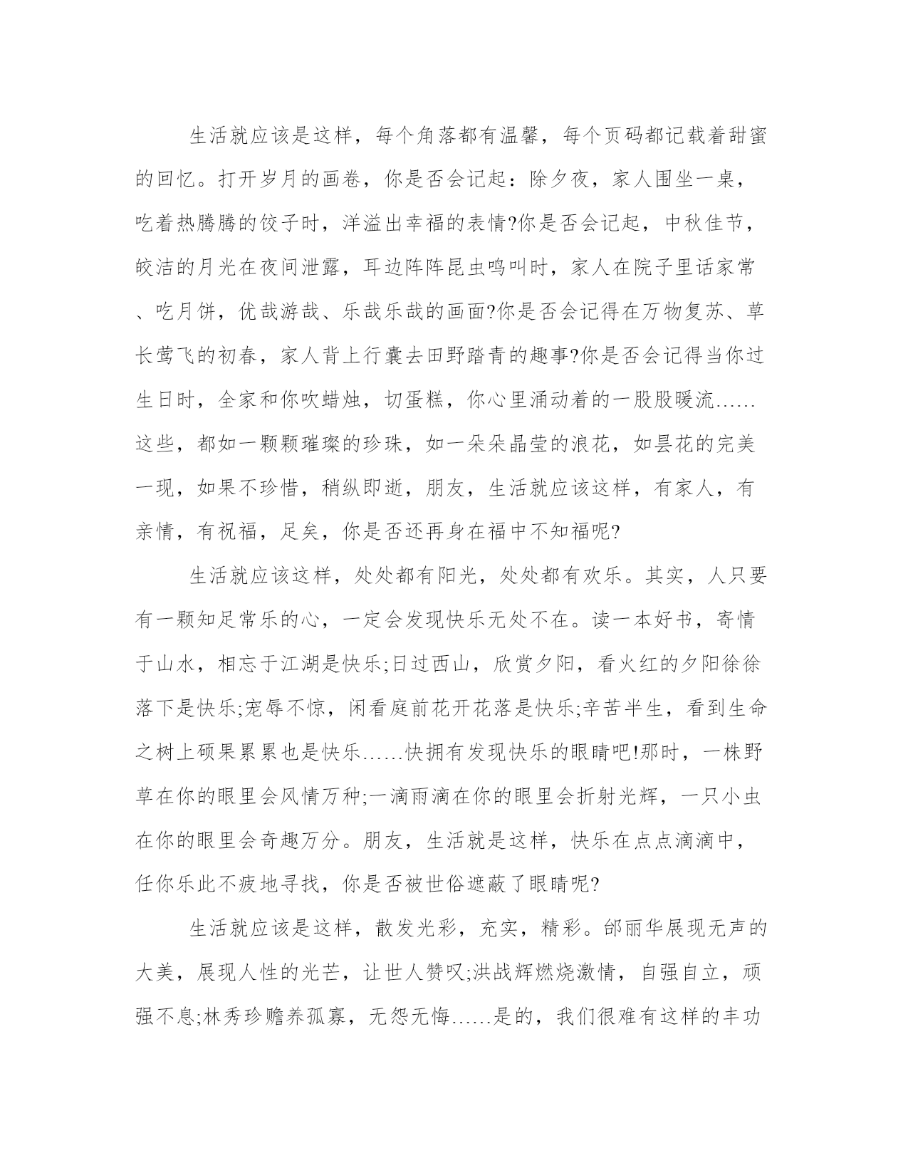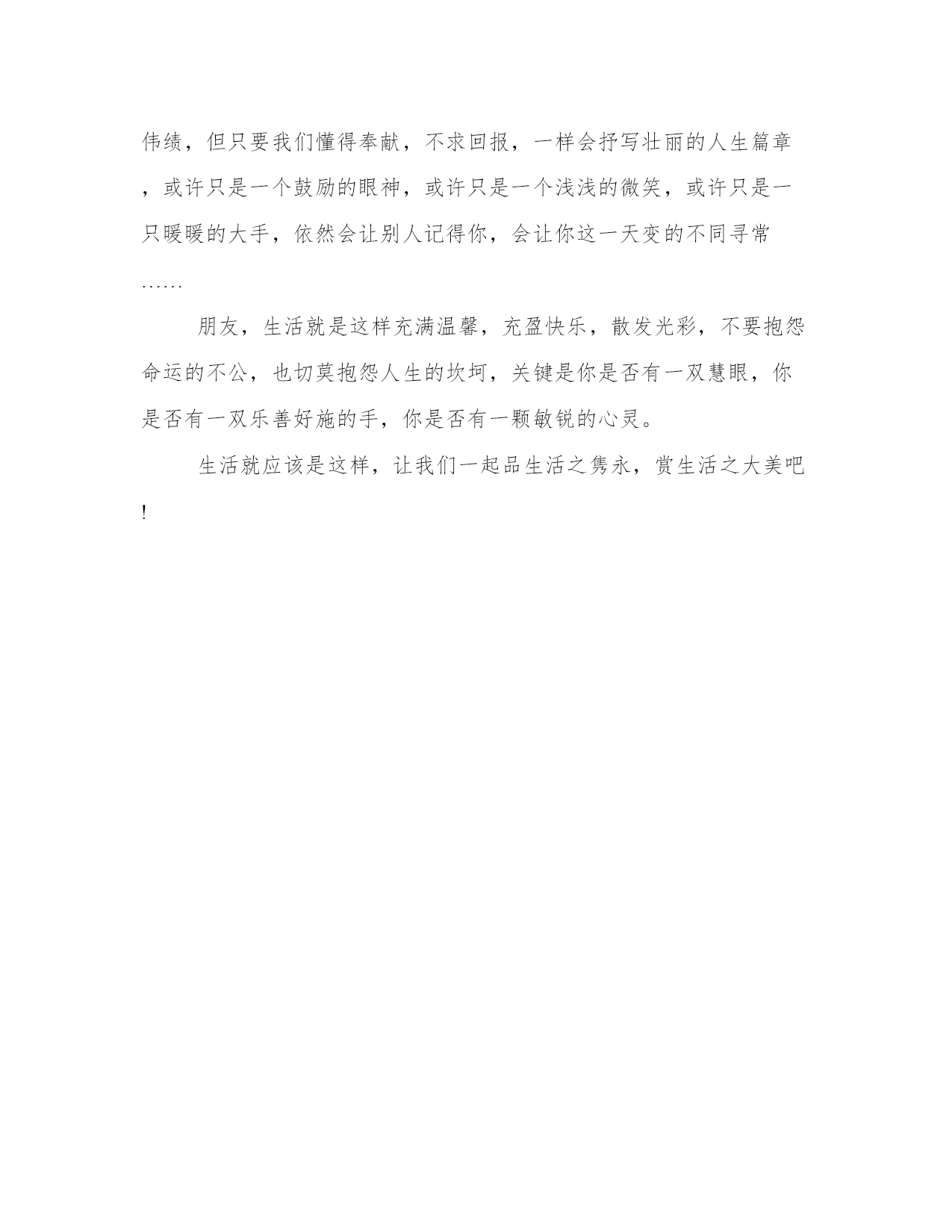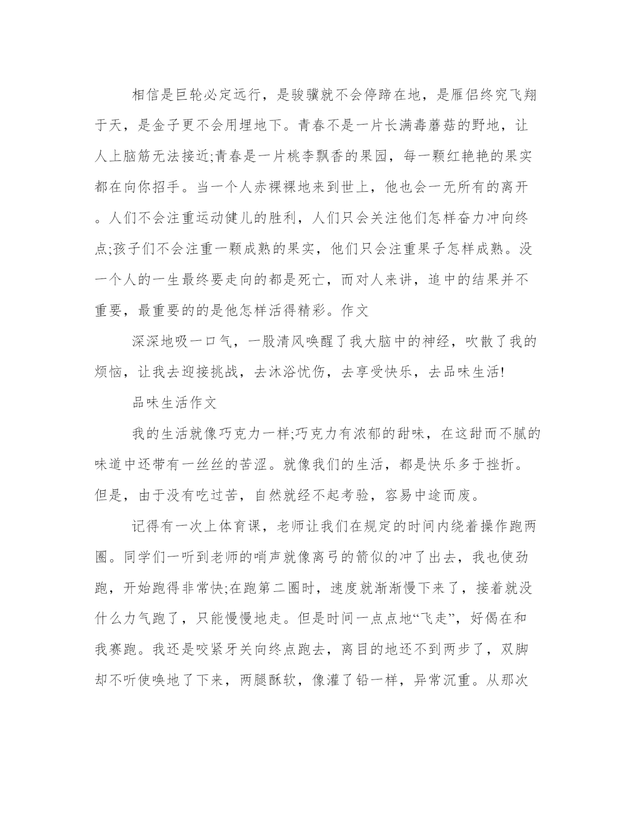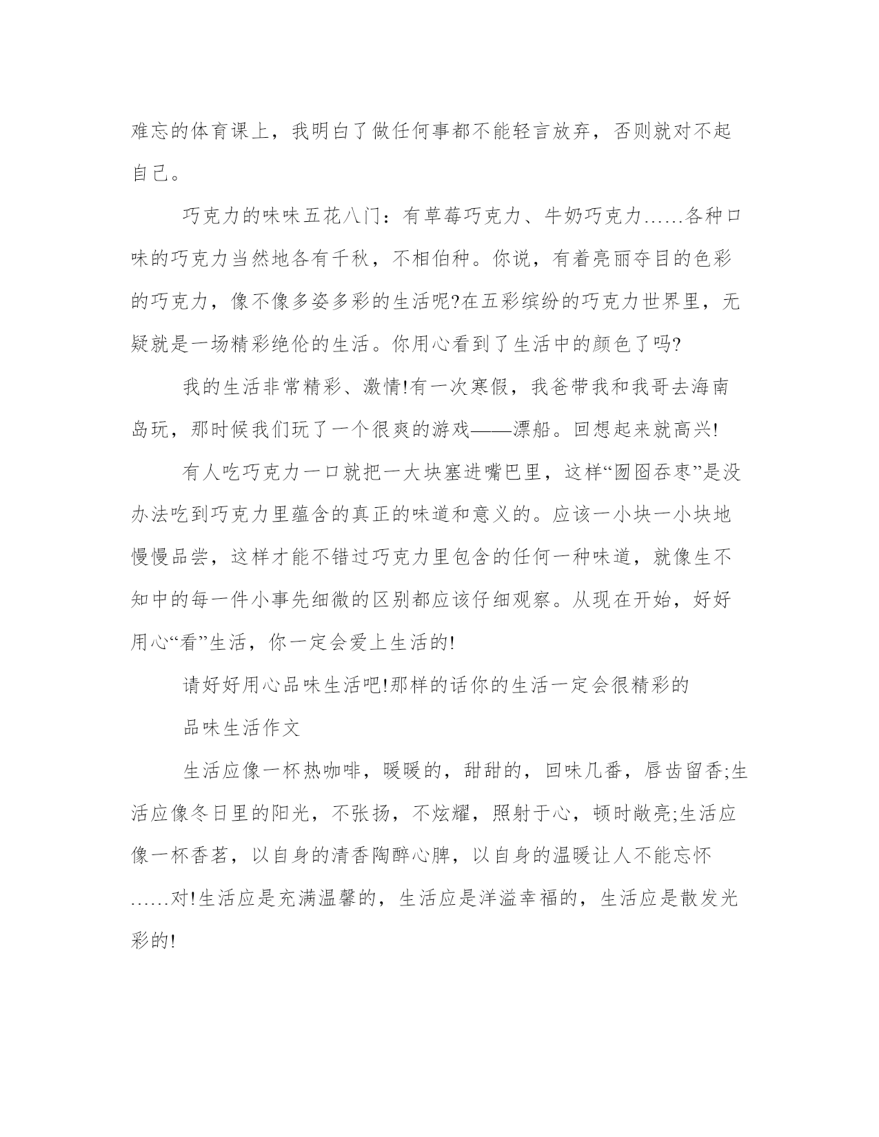 品味生活作文600字_品味生活作文我们的生活五彩缤纷,我们的生活千奇百怪,我们的生活五味俱全,我们的生活多姿多彩,我们的生活中又有着无穷的奥妙和精彩,需要我们去探索,去品味……以下是本站分享的品味生活,希望能帮助到大家!久别家人的我今日终于可以登上回家的汽车了,虽然只有短短的两个星期,但我仿佛觉得是如隔三秋。每每这时,我就觉得有一种说不出的喜悦。从来没有这样的踏实,从来没有这样的轻松,我觉得自己好象是被上帝赐予了魔法的天使。突然见看透了整个世界,感觉世界原来是如此的简单:天空如一汪泛着碧波的池水,大地似嵌着花边的地毯,望着天空中那一片片似棉花般的云,我仿佛已小时在天地间,随着时间光转,随着地球轮回。造物主好象给了我一把叫做信心的钥匙,如果我在长满荆棘的灌木从中,那把钥匙就是我披荆斩棘的利剑;如果我在大海中,那把钥匙就是我乘风破浪载我到彼岸的风帆。青春,我们不必再唱“平平淡淡”才是真;青春,我们走出去就有一片天空;青春,我们要为理想播撒希望的种子;青春,我们要轰轰烈烈!学,就要学出水平。玩,就要玩出乐趣。干,就要踏踏实实。相信是巨轮必定远行,是骏骥就不会停蹄在地,是雁侣终究飞翔于天,是金子更不会用埋地下。青春不是一片长满毒蘑菇的野地,让人上脑筋无法接近;青春是一片桃李飘香的果园,每一颗红艳艳的果实都在向你招手。当一个人赤裸裸地来到世上,他也会一无所有的离开。人们不会注重运动健儿的胜利,人们只会关注他们怎样奋力冲向终点;孩子们不会注重一颗成熟的果实,他们只会注重果子怎样成熟。没一个人的一生最终要走向的都是死亡,而对人来讲,追中的结果并不重要,最重要的的是他怎样活得精彩。作文深深地吸一口气,一股清风唤醒了我大脑中的神经,吹散了我的烦恼,让我去迎接挑战,去沐浴忧伤,去享受快乐,去品味生活!品味生活作文我的生活就像巧克力一样;巧克力有浓郁的甜味,在这甜而不腻的味道中还带有一丝丝的苦涩。就像我们的生活,都是快乐多于挫折。但是,由于没有吃过苦,自然就经不起考验,容易中途而废。记得有一次上体育课,老师让我们在规定的时间内绕着操作跑两圈。同学们一听到老师的哨声就像离弓的箭似的冲了出去,我也使劲跑,开始跑得非常快;在跑第二圈时,速度就渐渐慢下来了,接着就没什么力气跑了,只能慢慢地走。但是时间一点点地“飞走”,好偈在和我赛跑。我还是咬紧牙关向终点跑去,离目的地还不到两步了,双脚却不听使唤地了下来,两腿酥软,像灌了铅一样,异常沉重。从那次难忘的体育课上,我明白了做任何事都不能轻言放弃,否则就对不起自己。巧克力的味味五花八门:有草莓巧克力、牛奶巧克力……各种口味的巧克力当然地各有千秋,不相伯种。你说,有着亮丽夺目的色彩的巧克力,像不像多姿多彩的生活呢?在五彩缤纷的巧克力世界里,无疑就是一场精彩绝伦的生活。你用心看到了生活中的颜色了吗?我的生活非常精彩、激情!有一次寒假,我爸带我和我哥去海南岛玩,那时候我们玩了一个很爽的游戏——漂船。回想起来就高兴!有人吃巧克力一口就把一大块塞进嘴巴里,这样“囫囵吞枣”是没办法吃到巧克力里蕴含的真正的味道和意义的。应该一小块一小块地慢慢品尝,这样才能不错过巧克力里包含的任何一种味道,就像生不知中的每一件小事先细微的区别都应该仔细观察。从现在开始,好好用心“看”生活,你一定会爱上生活的!请好好用心品味生活吧!那样的话你的生活一定会很精彩的品味生活作文生活应像一杯热咖啡,暖暖的,甜甜的,回味几番,唇齿留香;生活应像冬日里的阳光,不张扬,不炫耀,照射于心,顿时敞亮;生活应像一杯香茗,以自身的清香陶醉心脾,以自身的温暖让人不能忘怀……对!生活应是充满温馨的,生活应是洋溢幸福的,生活应是散发光彩的!生活就应该是这样,每个角落都有温馨,每个页码都记载着甜蜜的回忆。打开岁月的画卷,你是否会记起:除夕夜,家人围坐一桌,吃着热腾腾的饺子时,洋溢出幸福的表情?你是否会记起,中秋佳节,皎洁的月光在夜间泄露,耳边阵阵昆虫鸣叫时,家人在院子里话家常、吃月饼,优哉游哉、乐哉乐哉的画面?你是否会记得在万物复苏、草长莺飞的初春,家人背上行囊去田野踏青的趣事?你是否会记得当你过生日时,全家和你吹蜡烛,切蛋糕,你心里涌动着的一股股暖流……这些,都如一颗颗璀璨的珍珠,如一朵朵晶莹的浪花,如昙花的完美一现,如果不珍惜,稍纵即逝,朋友,生活就应该这样,有家人,有亲情,有祝福,足矣,你是否还再身在福中不知福呢?生活就应该这样,处处都有阳光,处处都有欢乐。其实,人只要有一颗知足常乐的心,一定会发现快乐无处不在。读一本好书,寄情于山水,相忘于江湖是快乐;日过西山,欣赏夕阳,看火红的夕阳徐徐落下是快乐;宠辱不惊,闲看庭前花开花落是快乐;辛苦半生,看到生命之树上硕果累累也是快乐……快拥有发现快乐的眼睛吧!那时,一株野草在你的眼里会风情万种;一滴雨滴在你的眼里会折射光辉,一