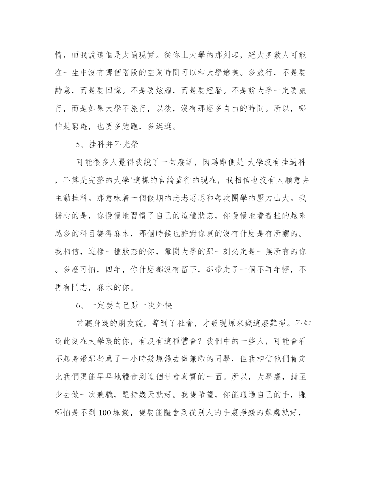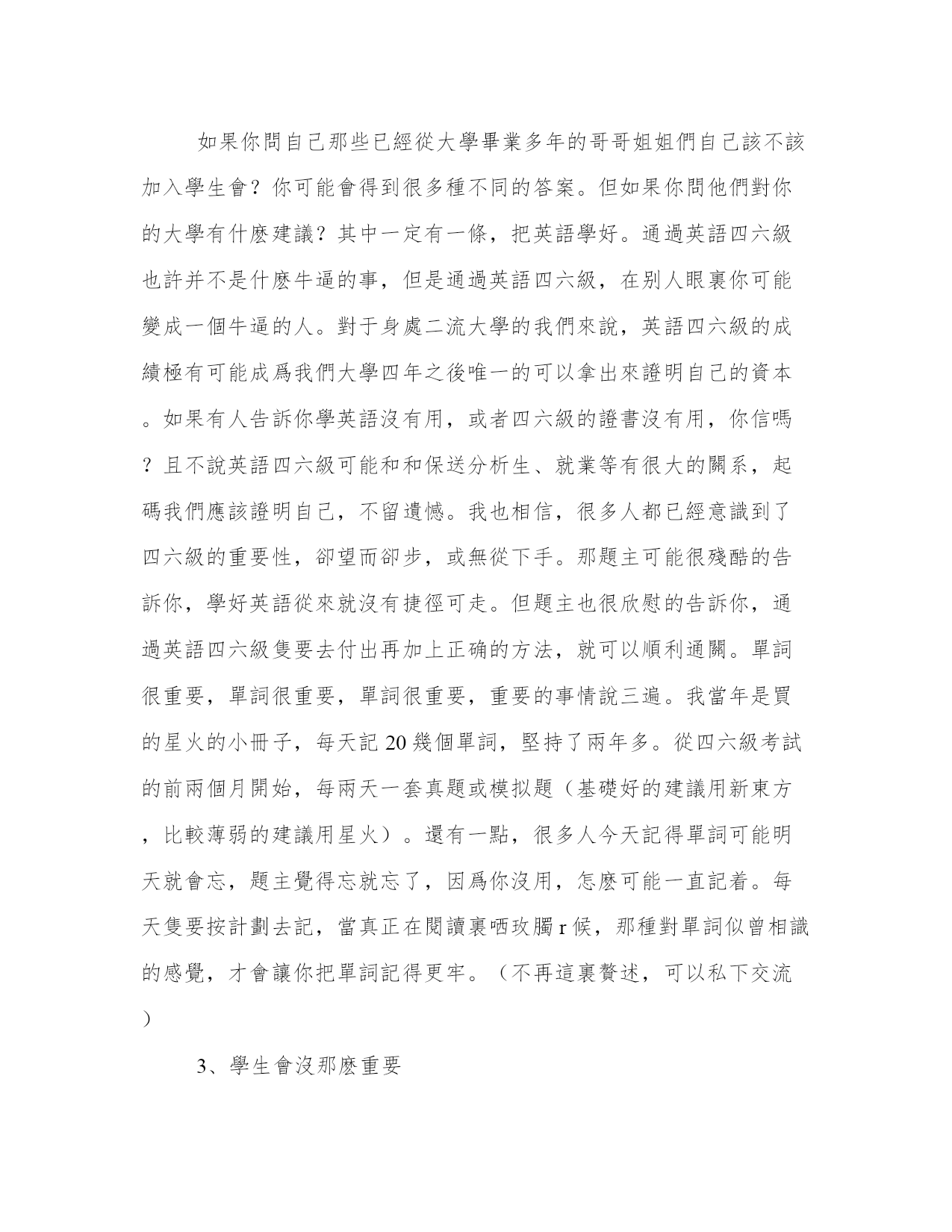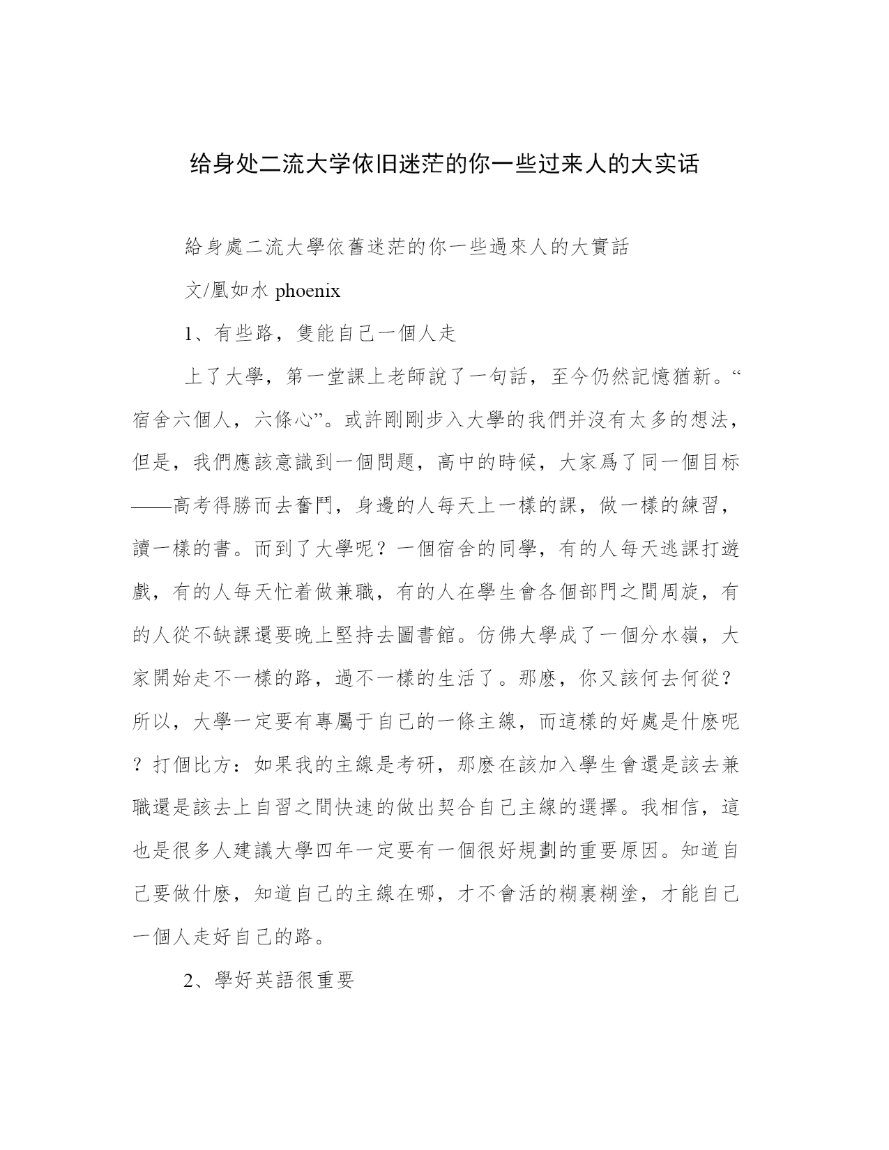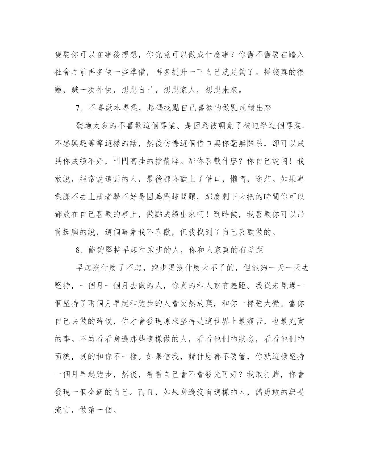 给身处二流大学依旧迷茫的你一些过来人的大实话給身處二流大學依舊迷茫的你一些過來人的大實話文/凰如水phoenix1、有些路,隻能自己一個人走上了大學,第一堂課上老師說了一句話,至今仍然記憶猶新。“宿舍六個人,六條心”。或許剛剛步入大學的我們并沒有太多的想法,但是,我們應該意識到一個問題,高中的時候,大家爲了同一個目标——高考得勝而去奮鬥,身邊的人每天上一樣的課,做一樣的練習,讀一樣的書。而到了大學呢?一個宿舍的同學,有的人每天逃課打遊戲,有的人每天忙着做兼職,有的人在學生會各個部門之間周旋,有的人從不缺課還要晚上堅持去圖書館。仿佛大學成了一個分水嶺,大家開始走不一樣的路,過不一樣的生活了。那麽,你又該何去何從?所以,大學一定要有專屬于自己的一條主線,而這樣的好處是什麽呢?打個比方:如果我的主線是考研,那麽在該加入學生會還是該去兼職還是該去上自習之間快速的做出契合自己主線的選擇。我相信,這也是很多人建議大學四年一定要有一個很好規劃的重要原因。知道自己要做什麽,知道自己的主線在哪,才不會活的糊裏糊塗,才能自己一個人走好自己的路。2、學好英語很重要如果你問自己那些已經從大學畢業多年的哥哥姐姐們自己該不該加入學生會?你可能會得到很多種不同的答案。但如果你問他們對你的大學有什麽建議?其中一定有一條,把英語學好。通過英語四六級也許并不是什麽牛逼的事,但是通過英語四六級,在别人眼裏你可能變成一個牛逼的人。對于身處二流大學的我們來說,英語四六級的成績極有可能成爲我們大學四年之後唯一的可以拿出來證明自己的資本。如果有人告訴你學英語沒有用,或者四六級的證書沒有用,你信嗎?且不說英語四六級可能和和保送分析生、就業等有很大的關系,起碼我們應該證明自己,不留遺憾。我也相信,很多人都已經意識到了四六級的重要性,卻望而卻步,或無從下手。那題主可能很殘酷的告訴你,學好英語從來就沒有捷徑可走。但題主也很欣慰的告訴你,通過英語四六級隻要去付出再加上正确的方法,就可以順利通關。單詞很重要,單詞很重要,單詞很重要,重要的事情說三遍。我當年是買的星火的小冊子,每天記20幾個單詞,堅持了兩年多。從四六級考試的前兩個月開始,每兩天一套真題或模拟題(基礎好的建議用新東方,比較薄弱的建議用星火)。還有一點,很多人今天記得單詞可能明天就會忘,題主覺得忘就忘了,因爲你沒用,怎麽可能一直記着。每天隻要按計劃去記,當真正在閱讀裏哂玫臅r候,那種對單詞似曾相識的感覺,才會讓你把單詞記得更牢。(不再這裏贅述,可以私下交流)3、學生會沒那麽重要可能題主帶了一些偏見,望勿噴。杖唬?趯W生會裏混代表我們有一定的組織能力,有一定的人脈基礎,甚至有相較一般學生的一點點優越感,這貌似已經越來越成爲大家的共識。但我想說的是,學生會沒有那麽重要,更沒有那麽神秘。也許大你幾級的部長、會長,有機會和你在同一個考場裏見面。也許那些在低年級學生面前趾高氣昂的幹部身上并沒有多少閃光點。我不是反對加入學生會,我隻是不同意說學生會是一個多麽多麽鍛煉人的地方,畢竟,我見過太多以學生會爲名義逃課,因爲學生會的瑣事而浪費大把時間的人。我更希望,你加入學生會是因爲這個平台可以教會你做事的方式,而不是每天對老師和上級的讨好,是因爲這個平台有一些閃閃發光的朋友吸引着你,而不是陷入一種高人一等的幻覺之中。如果不是,請别再浪費自己的時間。4、一定要多讀書,多旅行找幾本好書,讓自己變得不一樣,我相信一個在圖書館裏認真看書,認真做着讀書筆記的女生或者男生,絕對比整天逛街或打遊戲的女生男生更有魅力。其實,我們太年輕,很多東西需要有一個媒介去引導和啓發,而讀書毋庸置疑是最好的選擇。更重要的是,如果我們不知道自己喜歡什麽,多讀讀書也許慢慢的就會有一些自己的想法和樂趣。而如果我們模糊的知道自己對什麽貌似有點興趣,多讀點書,我們可能會從中找到把興趣變成專長的方式。多讀書,哪怕隻是爲了讓自己有獨立的想法和思維方式。很多人可能看到多旅行覺得太過矯情,而我說這個是太過現實。從你上大學的那刻起,絕大多數人可能在一生中沒有哪個階段的空閑時間可以和大學媲美。多旅行,不是要詩意,而是要回憶。不是要炫耀,而是要經曆。不是說大學一定要旅行,而是如果大學不旅行,以後,沒有那麽多自由的時間。所以,哪怕是窮遊,也要多跑跑,多逛逛。5、挂科并不光榮可能很多人覺得我說了一句廢話,因爲即便是‘大學沒有挂過科,不算是完整的大學’這樣的言論盛行的現在,我相信也沒有人願意去主動挂科。那意味着一個假期的忐忐忑忑和每次開學的壓力山大。我擔心的是,你慢慢地習慣了自己的這種狀态,你慢慢地看着挂的越來越多的科目變得麻木,那個時候也許對你真的沒有什麽是有所謂的。我相信,這樣一種狀态的你,離開大學的那一刻必定是一無所有的你。多麽可怕,四年,你什麽都沒有留下,卻帶走了一個不再年輕,不再有鬥志,麻木
