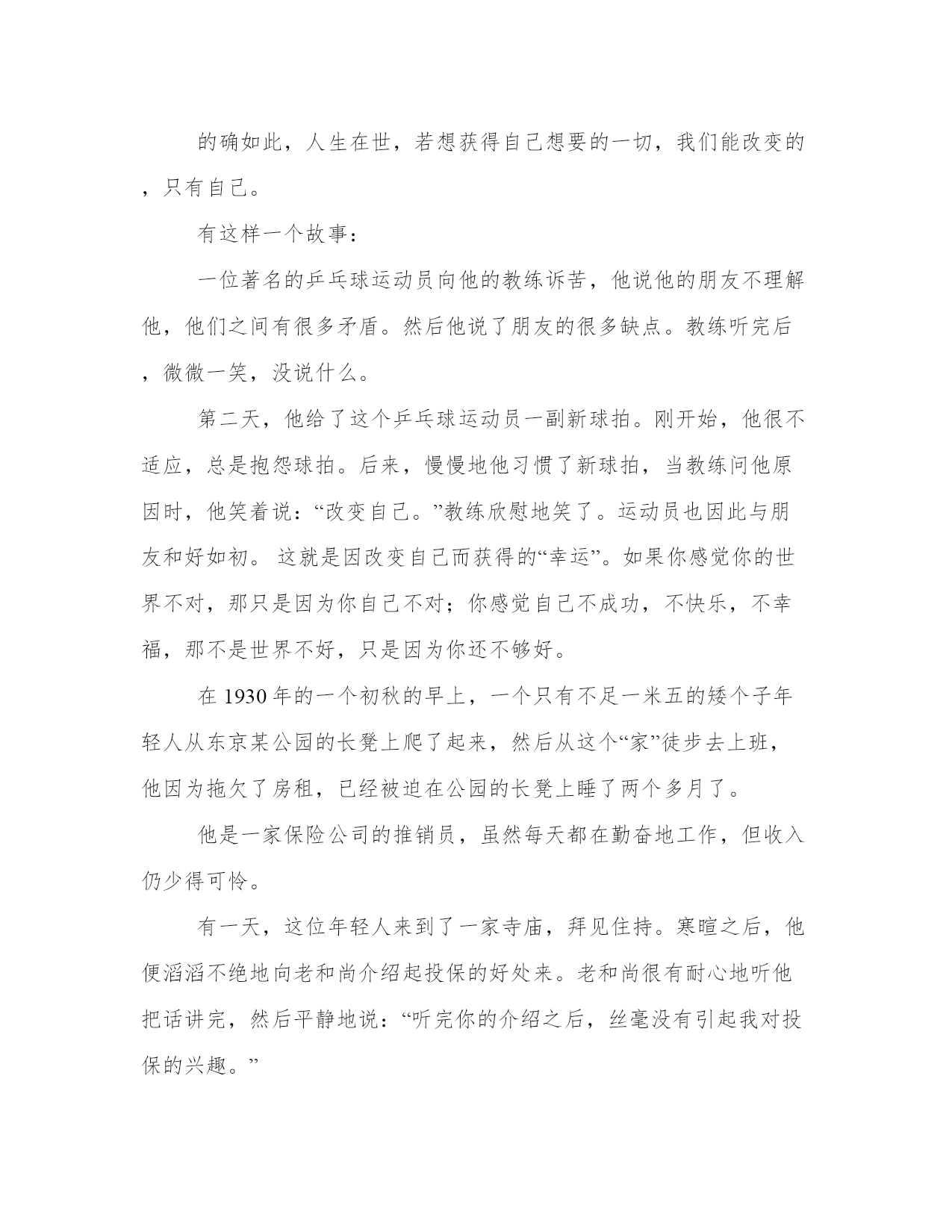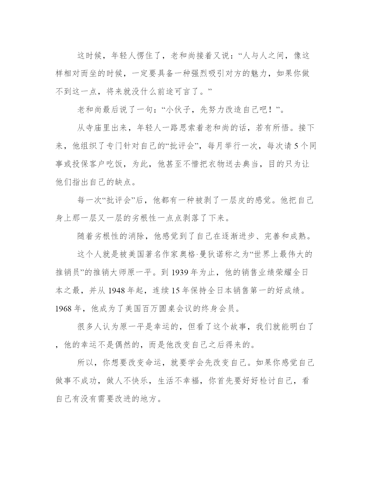 你幸运的前提是:有能力改变自己(深度好文)【www.sxqingyun.com--经典说说】很多时候,我们羡慕那些幸运的人,却看不到他们为此做出的努力和改变。其实,一个人的幸运并不是偶然的,美国成功哲学家金·洛恩说过这么一句话:“成功不是追求得来的,而是被改变后的自己主动吸引来的。”要让事情改变,就得先改变自己;要让事情变得更好,就得先让自己变得更好。一个人如果不先改正自己的缺点和不足之处,让自己变得更趋于完美,幸运就不可能落在他的身上。正如英国一位国教教主所说:“我年少时意气风发,踌躇满志,当时曾梦想要改变世界,但当我年事渐长,阅历增多,我发觉自己无力改变世界,于是我缩小了范围,决定先改变我的国家。但这个目标还是太大,我发觉自己还是没有这个能力。接着我步入了中年,无奈之余,我将试图改变的对象锁定在最亲密的家人身上。但上天还是不从人愿,他们个个还是维持原样。当我垂垂老矣,我终于顿悟了一些事:我应该先改变自己,用以身作则的方式影响家人。若我能先当家人的榜样,也许下一步就能改善我的国家,将来我甚至可以改造整个世界,谁知道呢?”的确如此,人生在世,若想获得自己想要的一切,我们能改变的,只有自己。有这样一个故事:一位著名的乒乓球运动员向他的教练诉苦,他说他的朋友不理解他,他们之间有很多矛盾。然后他说了朋友的很多缺点。教练听完后,微微一笑,没说什么。第二天,他给了这个乒乓球运动员一副新球拍。刚开始,他很不适应,总是抱怨球拍。后来,慢慢地他习惯了新球拍,当教练问他原因时,他笑着说:“改变自己。”教练欣慰地笑了。运动员也因此与朋友和好如初。这就是因改变自己而获得的“幸运”。如果你感觉你的世界不对,那只是因为你自己不对;你感觉自己不成功,不快乐,不幸福,那不是世界不好,只是因为你还不够好。在1930年的一个初秋的早上,一个只有不足一米五的矮个子年轻人从东京某公园的长凳上爬了起来,然后从这个“家”徒步去上班,他因为拖欠了房租,已经被迫在公园的长凳上睡了两个多月了。他是一家保险公司的推销员,虽然每天都在勤奋地工作,但收入仍少得可怜。有一天,这位年轻人来到了一家寺庙,拜见住持。寒暄之后,他便滔滔不绝地向老和尚介绍起投保的好处来。老和尚很有耐心地听他把话讲完,然后平静地说:“听完你的介绍之后,丝毫没有引起我对投保的兴趣。”这时候,年轻人愣住了,老和尚接着又说:“人与人之间,像这样相对而坐的时候,一定要具备一种强烈吸引对方的魅力,如果你做不到这一点,将来就没什么前途可言了。”老和尚最后说了一句:“小伙子,先努力改造自己吧!”。从寺庙里出来,年轻人一路思索着老和尚的话,若有所悟。接下来,他组织了专门针对自己的“批评会”,每月举行一次,每次请5个同事或投保客户吃饭,为此,他甚至不惜把衣物送去典当,目的只为让他们指出自己的缺点。每一次“批评会”后,他都有一种被剥了一层皮的感觉。他把自己身上那一层又一层的劣根性一点点剥落了下来。随着劣根性的消除,他感觉到了自己在逐渐进步、完善和成熟。这个人就是被美国著名作家奥格·曼狄诺称之为“世界上最伟大的推销员”的推销大师原一平。到1939年为止,他的销售业绩荣耀全日本之最,并从1948年起,连续15年保持全日本销售第一的好成绩。1968年,他成为了美国百万圆桌会议的终身会员。很多人认为原一平是幸运的,但看了这个故事,我们就能明白了,他的幸运不是偶然的,而是他改变自己之后得来的。所以,你想要改变命运,就要学会先改变自己。如果你感觉自己做事不成功,做人不快乐,生活不幸福,你首先要好好检讨自己,看自己有没有需要改进的地方。要记住,成功不是追求得来的,而是被改变后的自己主动吸引来的。一个人只有改变自己,才具备了幸运的前提,才会被幸运之神眷顾。