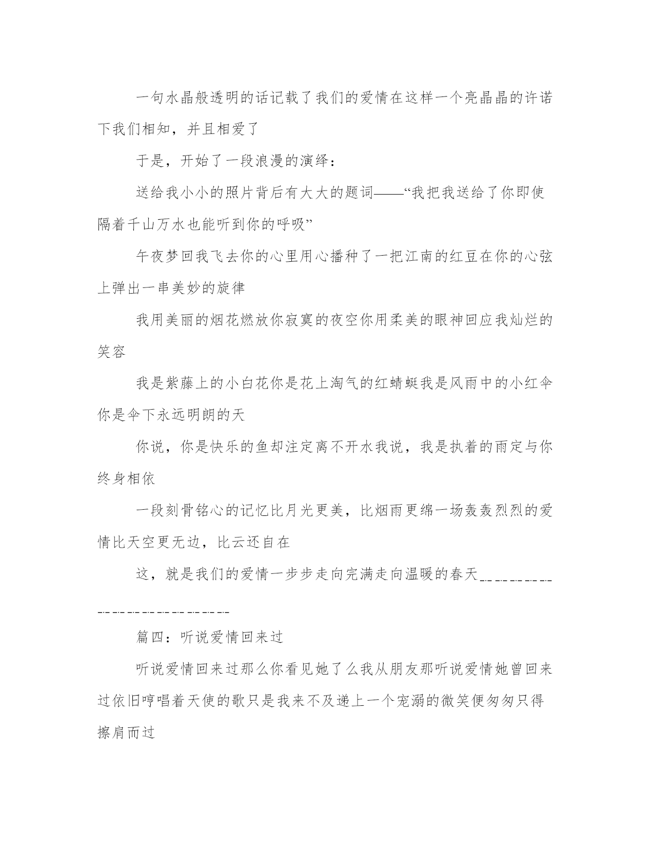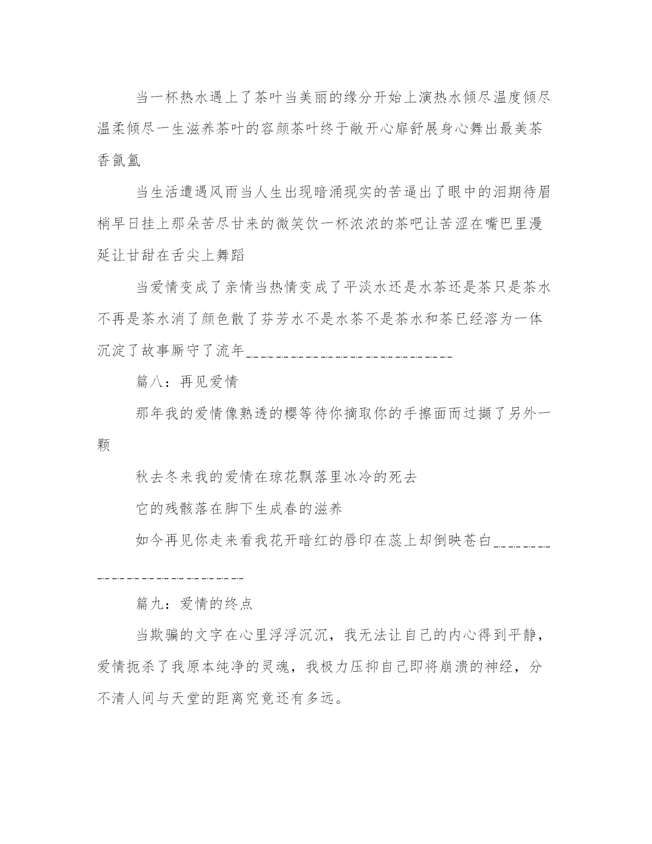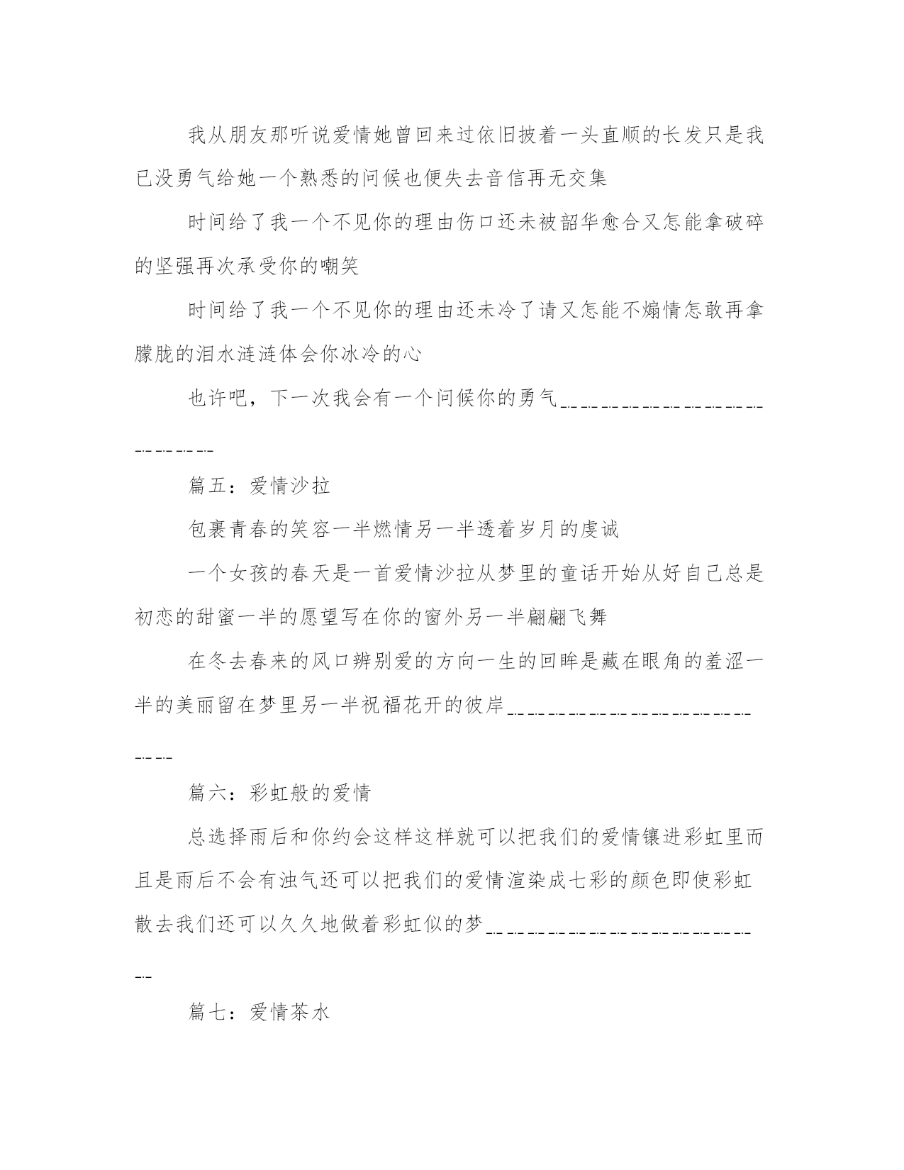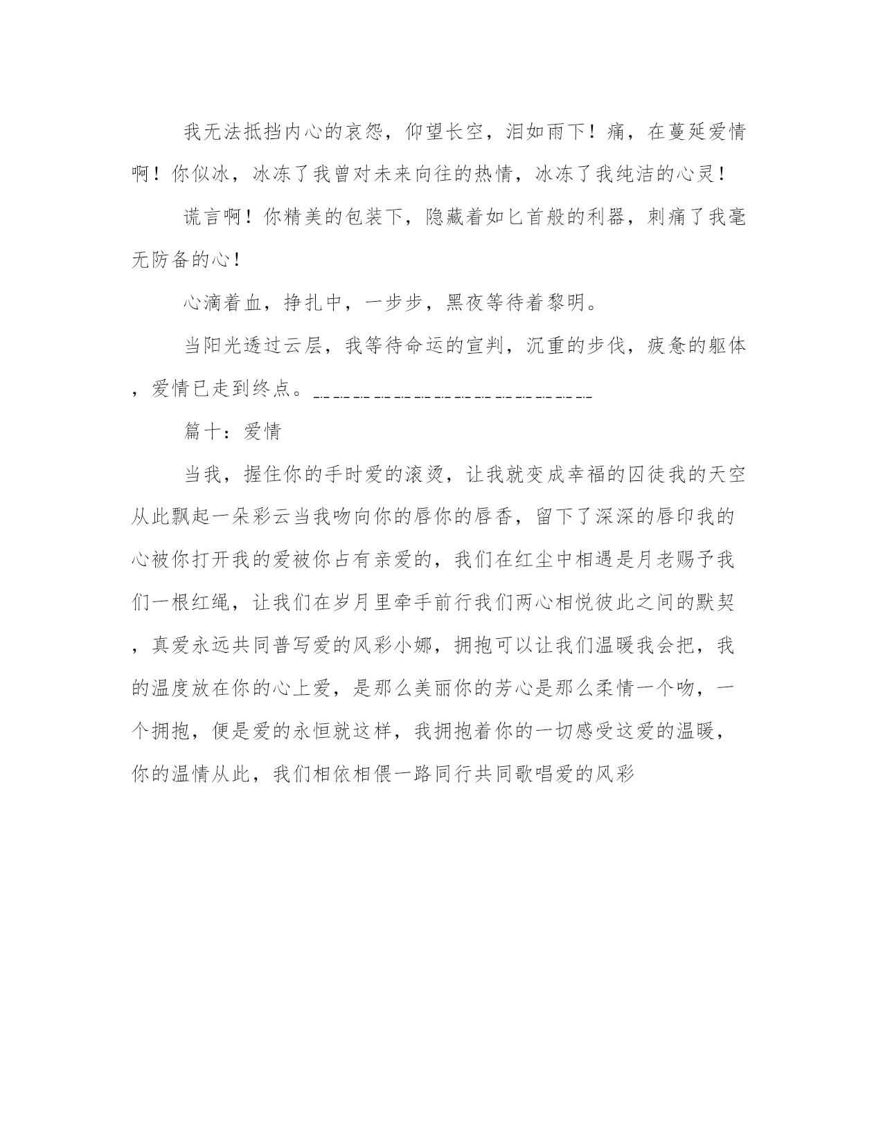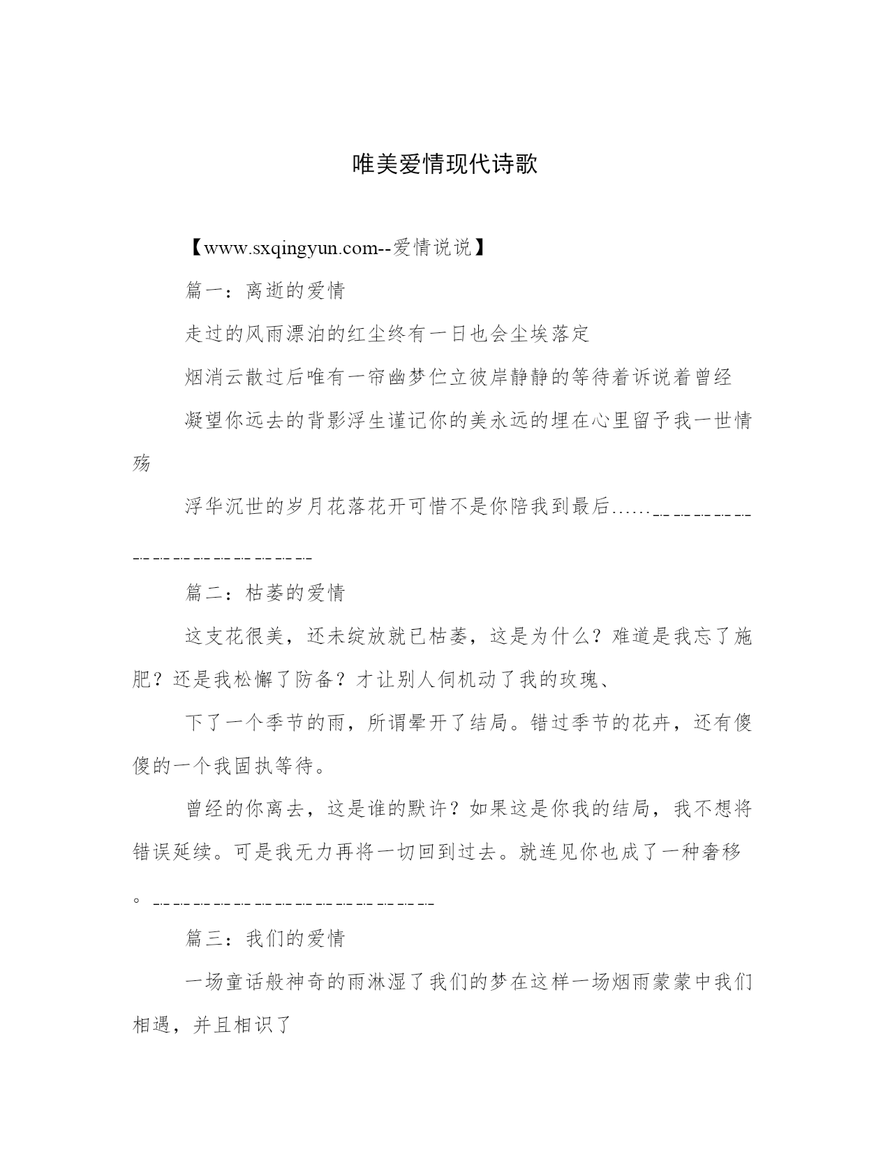 唯美爱情现代诗歌【www.sxqingyun.com--爱情说说】篇一:离逝的爱情走过的风雨漂泊的红尘终有一日也会尘埃落定烟消云散过后唯有一帘幽梦伫立彼岸静静的等待着诉说着曾经凝望你远去的背影浮生谨记你的美永远的埋在心里留予我一世情殇浮华沉世的岁月花落花开可惜不是你陪我到最后……﹎﹎﹎﹎﹎﹎﹎﹎﹎﹎﹎﹎﹎﹎篇二:枯萎的爱情这支花很美,还未绽放就已枯萎,这是为什么?难道是我忘了施肥?还是我松懈了防备?才让别人伺机动了我的玫瑰、下了一个季节的雨,所谓晕开了结局。错过季节的花卉,还有傻傻的一个我固执等待。曾经的你离去,这是谁的默许?如果这是你我的结局,我不想将错误延续。可是我无力再将一切回到过去。就连见你也成了一种奢移。﹎﹎﹎﹎﹎﹎﹎﹎﹎﹎﹎﹎﹎﹎篇三:我们的爱情一场童话般神奇的雨淋湿了我们的梦在这样一场烟雨蒙蒙中我们相遇,并且相识了一句水晶般透明的话记载了我们的爱情在这样一个亮晶晶的许诺下我们相知,并且相爱了于是,开始了一段浪漫的演绎:送给我小小的照片背后有大大的题词——“我把我送给了你即使隔着千山万水也能听到你的呼吸”午夜梦回我飞去你的心里用心播种了一把江南的红豆在你的心弦上弹出一串美妙的旋律我用美丽的烟花燃放你寂寞的夜空你用柔美的眼神回应我灿烂的笑容我是紫藤上的小白花你是花上淘气的红蜻蜓我是风雨中的小红伞你是伞下永远明朗的天你说,你是快乐的鱼却注定离不开水我说,我是执着的雨定与你终身相依一段刻骨铭心的记忆比月光更美,比烟雨更绵一场轰轰烈烈的爱情比天空更无边,比云还自在这,就是我们的爱情一步步走向完满走向温暖的春天﹎﹎﹎﹎﹎﹎﹎﹎﹎﹎﹎﹎﹎﹎篇四:听说爱情回来过听说爱情回来过那么你看见她了么我从朋友那听说爱情她曾回来过依旧哼唱着天使的歌只是我来不及递上一个宠溺的微笑便匆匆只得擦肩而过我从朋友那听说爱情她曾回来过依旧披着一头直顺的长发只是我已没勇气给她一个熟悉的问候也便失去音信再无交集时间给了我一个不见你的理由伤口还未被韶华愈合又怎能拿破碎的坚强再次承受你的嘲笑时间给了我一个不见你的理由还未冷了请又怎能不煽情怎敢再拿朦胧的泪水涟涟体会你冰冷的心也许吧,下一次我会有一个问候你的勇气﹎﹎﹎﹎﹎﹎﹎﹎﹎﹎﹎﹎﹎﹎篇五:爱情沙拉包裹青春的笑容一半燃情另一半透着岁月的虔诚一个女孩的春天是一首爱情沙拉从梦里的童话开始从好自己总是初恋的甜蜜一半的愿望写在你的窗外另一半翩翩飞舞在冬去春来的风口辨别爱的方向一生的回眸是藏在眼角的羞涩一半的美丽留在梦里另一半祝福花开的彼岸﹎﹎﹎﹎﹎﹎﹎﹎﹎﹎﹎﹎﹎﹎篇六:彩虹般的爱情总选择雨后和你约会这样这样就可以把我们的爱情镶进彩虹里而且是雨后不会有浊气还可以把我们的爱情渲染成七彩的颜色即使彩虹散去我们还可以久久地做着彩虹似的梦﹎﹎﹎﹎﹎﹎﹎﹎﹎﹎﹎﹎﹎﹎篇七:爱情茶水当一杯热水遇上了茶叶当美丽的缘分开始上演热水倾尽温度倾尽温柔倾尽一生滋养茶叶的容颜茶叶终于敞开心扉舒展身心舞出最美茶香氤氲当生活遭遇风雨当人生出现暗涌现实的苦逼出了眼中的泪期待眉梢早日挂上那朵苦尽甘来的微笑饮一杯浓浓的茶吧让苦涩在嘴巴里漫延让甘甜在舌尖上舞蹈当爱情变成了亲情当热情变成了平淡水还是水茶还是茶只是茶水不再是茶水消了颜色散了芬芳水不是水茶不是茶水和茶已经溶为一体沉淀了故事厮守了流年﹎﹎﹎﹎﹎﹎﹎﹎﹎﹎﹎﹎﹎﹎篇八:再见爱情那年我的爱情像熟透的樱等待你摘取你的手擦面而过撷了另外一颗秋去冬来我的爱情在琼花飘落里冰冷的死去它的残骸落在脚下生成春的滋养如今再见你走来看我花开暗红的唇印在蕊上却倒映苍白﹎﹎﹎﹎﹎﹎﹎﹎﹎﹎﹎﹎﹎﹎篇九:爱情的终点当欺骗的文字在心里浮浮沉沉,我无法让自己的内心得到平静,爱情扼杀了我原本纯净的灵魂,我极力压抑自己即将崩溃的神经,分不清人间与天堂的距离究竟还有多远。我无法抵挡内心的哀怨,仰望长空,泪如雨下!痛,在蔓延爱情啊!你似冰,冰冻了我曾对未来向往的热情,冰冻了我纯洁的心灵!谎言啊!你精美的包装下,隐藏着如匕首般的利器,刺痛了我毫无防备的心!心滴着血,挣扎中,一步步,黑夜等待着黎明。当阳光透过云层,我等待命运的宣判,沉重的步伐,疲惫的躯体,爱情已走到终点。﹎﹎﹎﹎﹎﹎﹎﹎﹎﹎﹎﹎﹎﹎篇十:爱情当我,握住你的手时爱的滚烫,让我就变成幸福的囚徒我的天空从此飘起一朵彩云当我吻向你的唇你的唇香,留下了深深的唇印我的心被你打开我的爱被你占有亲爱的,我们在红尘中相遇是月老赐予我们一根红绳,让我们在岁月里牵手前行我们两心相悦彼此之间的默契,真爱永远共同普写爱的风彩小娜,拥抱可以让我们温暖我会把,我的温度放在你的心上爱,是那么美丽你的芳心是那么柔情一个吻,一个拥抱,便是爱的永恒就这样,我拥抱着你的一切感受这爱的温暖,你的温情从此,我们相依相偎一路同行共同歌唱爱的风彩