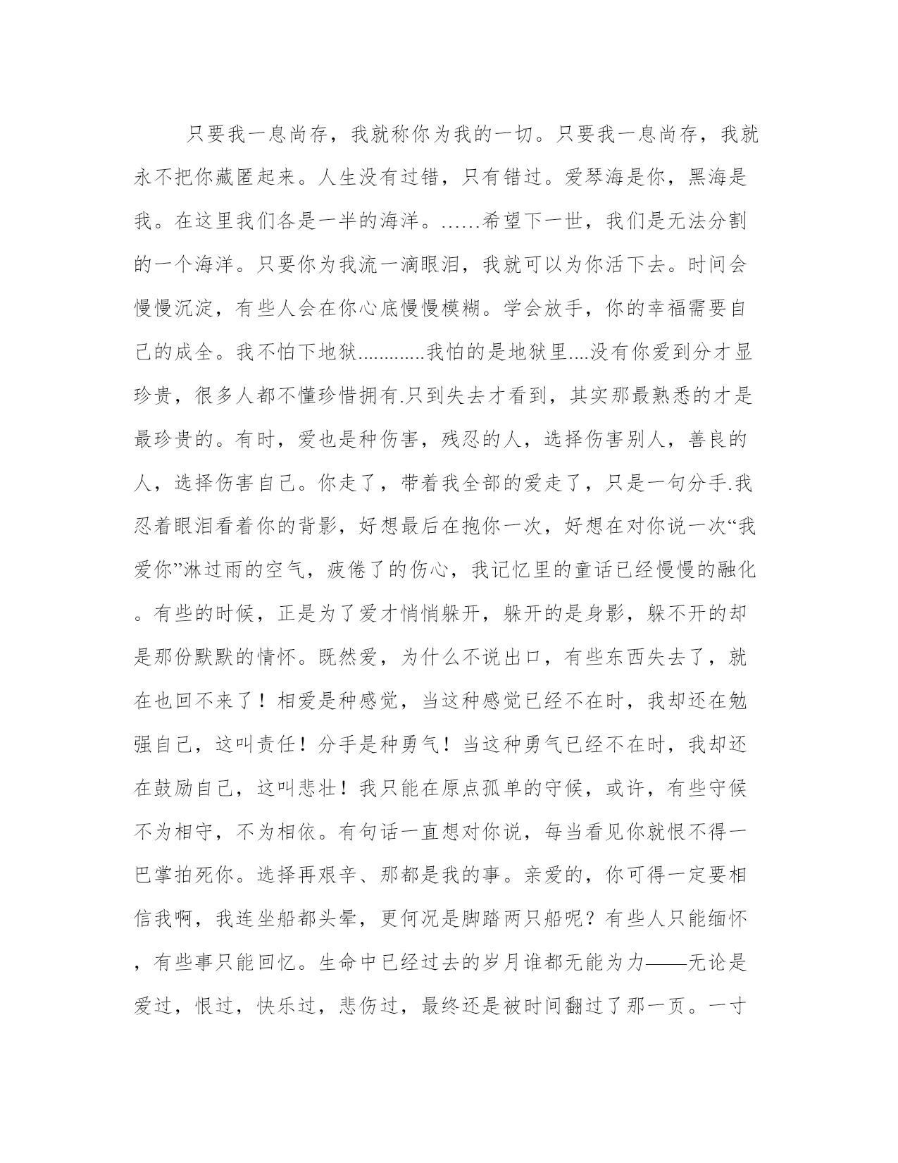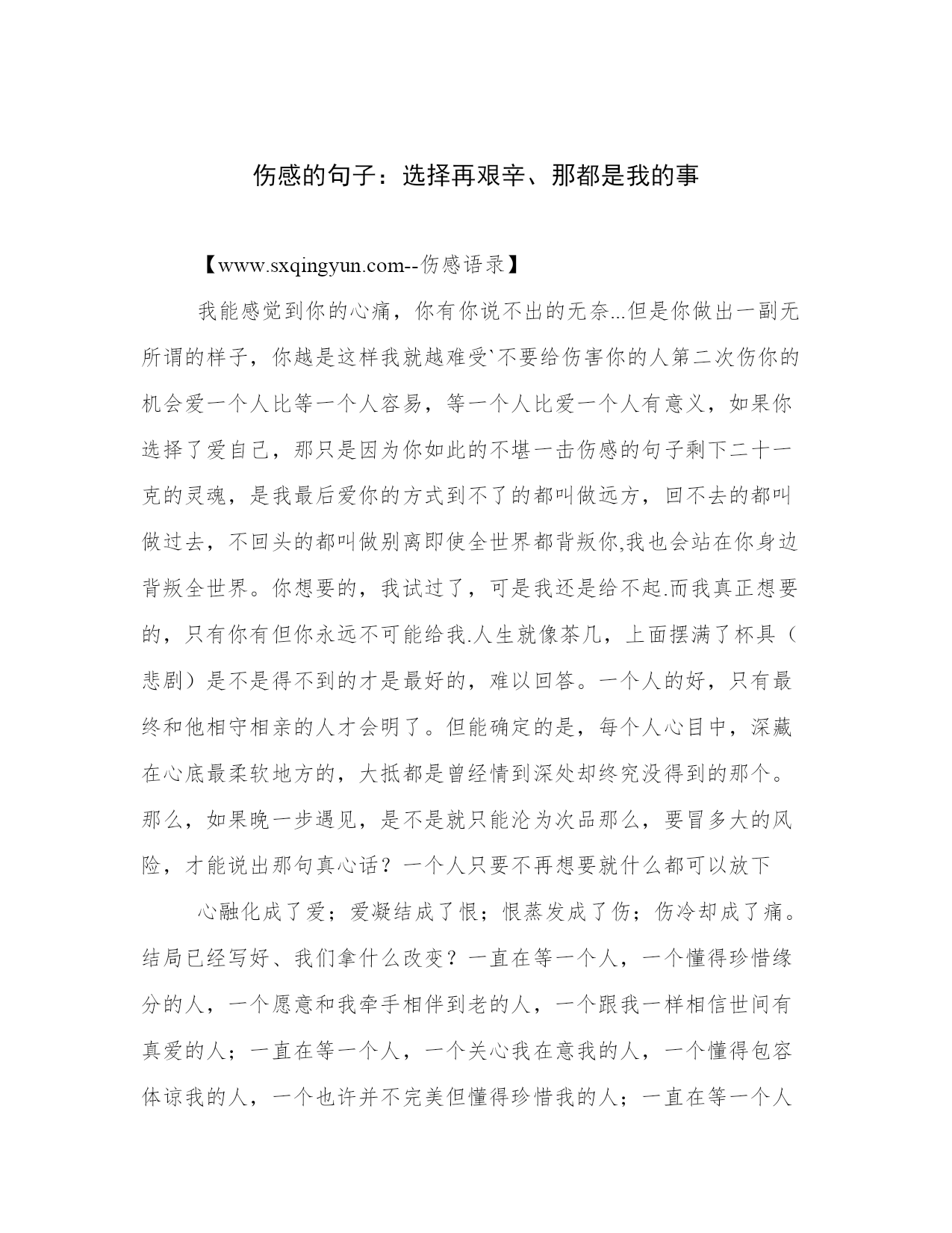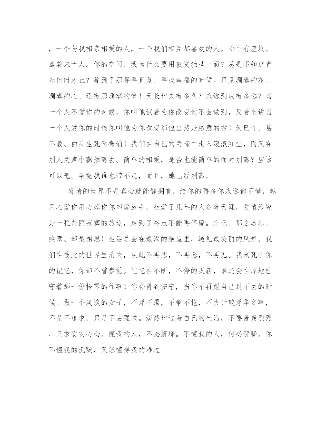 伤感的句子:选择再艰辛、那都是我的事【www.sxqingyun.com--伤感语录】我能感觉到你的心痛,你有你说不出的无奈...但是你做出一副无所谓的样子,你越是这样我就越难受`不要给伤害你的人第二次伤你的机会爱一个人比等一个人容易,等一个人比爱一个人有意义,如果你选择了爱自己,那只是因为你如此的不堪一击伤感的句子剩下二十一克的灵魂,是我最后爱你的方式到不了的都叫做远方,回不去的都叫做过去,不回头的都叫做别离即使全世界都背叛你,我也会站在你身边背叛全世界。你想要的,我试过了,可是我还是给不起.而我真正想要的,只有你有但你永远不可能给我.人生就像茶几,上面摆满了杯具(悲剧)是不是得不到的才是最好的,难以回答。一个人的好,只有最终和他相守相亲的人才会明了。但能确定的是,每个人心目中,深藏在心底最柔软地方的,大抵都是曾经情到深处却终究没得到的那个。那么,如果晚一步遇见,是不是就只能沦为次品那么,要冒多大的风险,才能说出那句真心话?一个人只要不再想要就什么都可以放下心融化成了爱;爱凝结成了恨;恨蒸发成了伤;伤冷却成了痛。结局已经写好、我们拿什么改变?一直在等一个人,一个懂得珍惜缘分的人,一个愿意和我牵手相伴到老的人,一个跟我一样相信世间有真爱的人;一直在等一个人,一个关心我在意我的人,一个懂得包容体谅我的人,一个也许并不完美但懂得珍惜我的人;一直在等一个人,一个与我相亲相爱的人,一个我们相互都喜欢的人。心中有座坟、藏着未亡人。你的空间、我为什么要用寂寞独挡一面?总是不知这青春何时才止?等到了那寻寻觅觅、寻找幸福的时候。只见凋零的花、凋零的心、还有那凋零的情!天长地久有多久?永远到底有多远?当一个人不爱你的时候,你叫他试着为你改变他不会做到,反着来讲当一个人爱你的时候你叫他为你改变那他当然是愿意的啦!天已许、甚不教、白头生死鸳鸯浦!我们在自己的哭啼中走入滚滚红尘,而又在别人哭声中飘然离去。简单的相爱,是否也能简单的面对别离?应该可以吧。毕竟我谁也带不走,而且,她已经别离。感情的世界不是真心就能够拥有,给你的再多你永远都不懂,越用心爱你用心疼你你却偏放手,相爱了几年的人各奔天涯,爱情终究是一程美丽寂寞的旅途,走到了终点不能再停留。忘记、那么冰凉、绝意、却最相思!生活总会在最深的绝望里,遇见最美丽的风景。我们在彼此的世界里消失,从此不再想,不再念,不再见。我老死于你的记忆,你却不曾察觉。记忆在不断,不停的更新,谁还会在原地驻守着那一份拾零的往事?你会得到安宁,当你不再跟自己过不去的时候。做一个淡淡的女子,不浮不躁,不争不抢,不去计较浮华之事,不是不追求,只是不去强求。淡然地过着自己的生活,不要轰轰烈烈,只求安安心心。懂我的人,不必解释。不懂我的人,何必解释。你不懂我的沉默,又怎懂得我的难过只要我一息尚存,我就称你为我的一切。只要我一息尚存,我就永不把你藏匿起来。人生没有过错,只有错过。爱琴海是你,黑海是我。在这里我们各是一半的海洋。……希望下一世,我们是无法分割的一个海洋。只要你为我流一滴眼泪,我就可以为你活下去。时间会慢慢沉淀,有些人会在你心底慢慢模糊。学会放手,你的幸福需要自己的成全。我不怕下地狱.............我怕的是地狱里....没有你爱到分才显珍贵,很多人都不懂珍惜拥有.只到失去才看到,其实那最熟悉的才是最珍贵的。有时,爱也是种伤害,残忍的人,选择伤害别人,善良的人,选择伤害自己。你走了,带着我全部的爱走了,只是一句分手.我忍着眼泪看着你的背影,好想最后在抱你一次,好想在对你说一次“我爱你”淋过雨的空气,疲倦了的伤心,我记忆里的童话已经慢慢的融化。有些的时候,正是为了爱才悄悄躲开,躲开的是身影,躲不开的却是那份默默的情怀。既然爱,为什么不说出口,有些东西失去了,就在也回不来了!相爱是种感觉,当这种感觉已经不在时,我却还在勉强自己,这叫责任!分手是种勇气!当这种勇气已经不在时,我却还在鼓励自己,这叫悲壮!我只能在原点孤单的守候,或许,有些守候不为相守,不为相依。有句话一直想对你说,每当看见你就恨不得一巴掌拍死你。选择再艰辛、那都是我的事。亲爱的,你可得一定要相信我啊,我连坐船都头晕,更何况是脚踏两只船呢?有些人只能缅怀,有些事只能回忆。生命中已经过去的岁月谁都无能为力——无论是爱过,恨过,快乐过,悲伤过,最终还是被时间翻过了那一页。一寸相思一寸灰,半寸留给昨天,半寸守住今天。你说的开始,是我们结束的倒计时.天空下雨了,可以打伞;心下雨了,该怎么办呢孤独使人发胖那是寂寞在膨胀。曾经以为念念不忘的事情,就在我们念念不忘的过程,被我们遗忘了