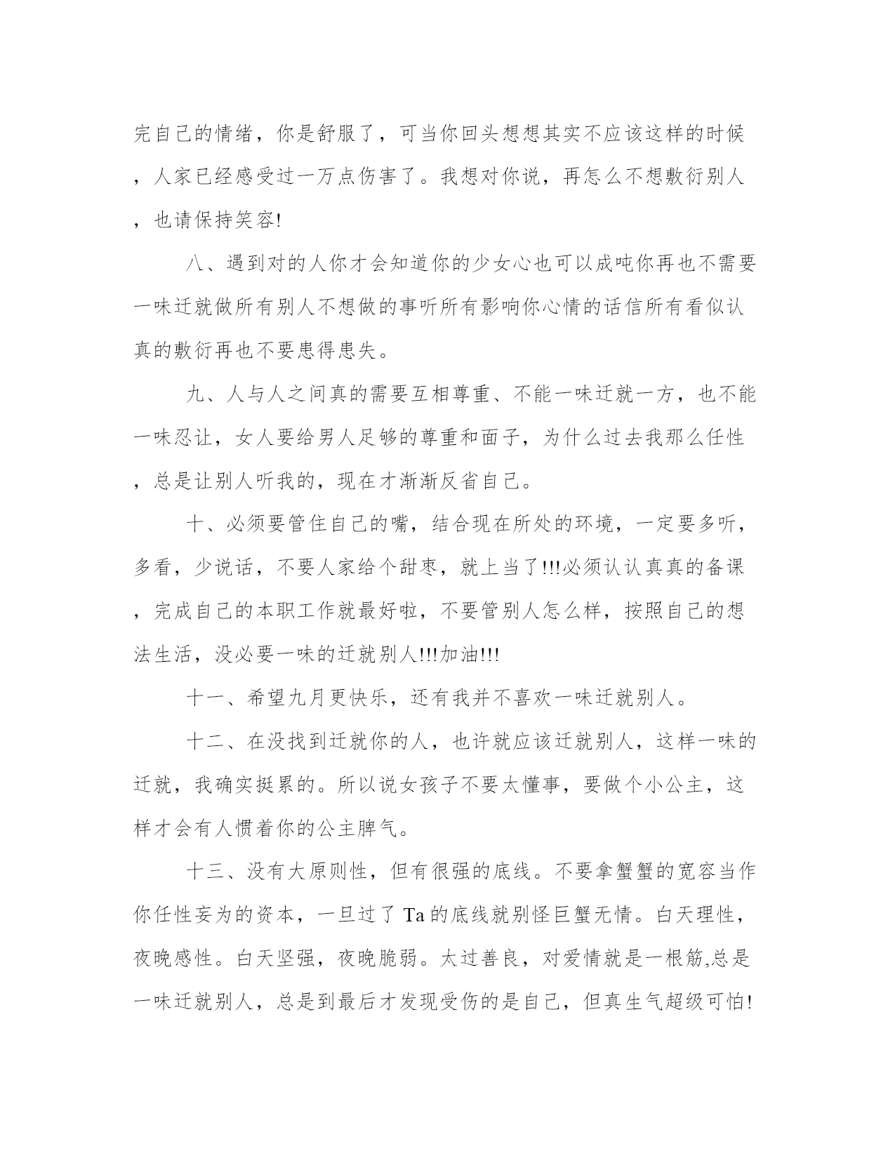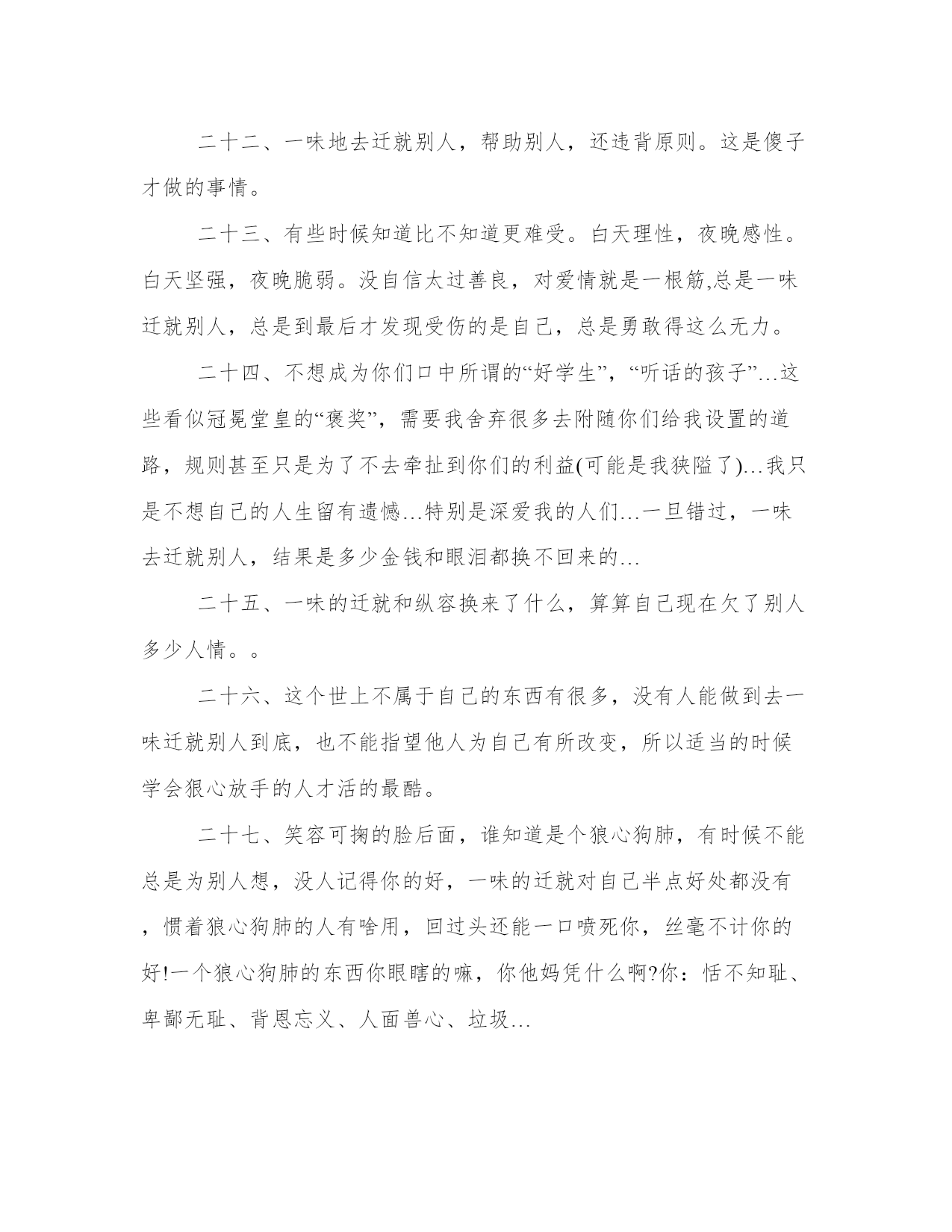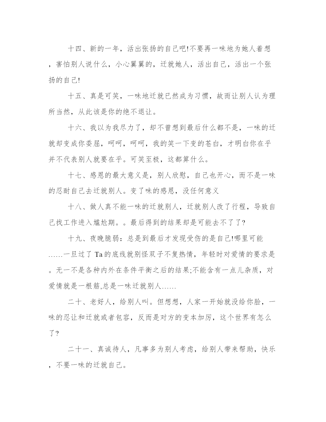 一味付出失望的句子未来还长。不会在一味的去迁就别人。遵从本心。对得起自己对得起他人。友情也好。爱情也罢。希望余生的每一天都认真对待。本站为大家整理的相关的一味付出失望的句子,供大家参考选择。一味付出失望的句子一、不要因为别人的质疑而轻易地看低自己,也不要总是傻傻地付出和一味地迁就。只有能包容你的缺点的人,才有资格享受你的好,也只有舍得为你付出的人,才值得你为他掏心掏肺。而那些,总是一面享受着你的好,一面又对你百般挑剔的人,还是早点离开吧。二、一代人的芳华,一群人的丑陋,所以我从芳华这里学到,人不可以一味地迁就和善良,不是每个人都可以感受到你的善良,所以当别人无所谓你的付出的时候何必还要当救世主,当别人口中的圣母玛利亚,还不如当好自己的管理者,好好的管理人生,这么短暂的人生怎么能让垃圾填满!此致敬礼!三、忽然有种被欺骗的感觉!瞬间没有了睡意!我总是一味的去迁就别人将就别人!自己呢……说是自己最喜欢的人,可是在看到信息第一时间明明拿着手机却也不回复!这就是真相,也是差别!再也没有谁会第一时间把你放在心里的感觉!!!再好的感情,也不过如此!心凉!!!四、生活从来都不容易,只是坚强的人把他过成了自己想要的那种,而软弱的人把他过成了他自己最讨厌的那种!感觉自己的生活一团糟,一味的迁就别人,就会委屈了自己。到现在才发现,自私的人是幸福的,而所谓的无私的才是最可怜的人!生活就像气球,越是充气越多,越容易飘走,甚至是爆炸!太多的虚情假意,太多的人走茶凉,还有太多的居心叵测!五、家长一味迁就、谦让,会使孩子一切以自我为中心,只许自己赢,不许别人赢。这种过度保护,削弱了孩子的上进心和竞争力,当他遇到激烈竞争时,极易产生受挫心理,甚至逃避现实。家长要引导孩子以积极的心态对待输赢,重在分享过程中的快乐,而不是最终的结果。六、我总是在迁就别人迁就别人,总在一味的放低姿态,甚至放弃尊严。而她呢?她在干什么?我能感受到的只是她在肆意的践踏我那点已经少的可怜的尊严,我掏心掏肺的待她却得不到她的信任,甚至我感觉我真的在她那是可有可无的存在,我好委屈,我真的好受伤啊。真是应了八哥所说的,我太善良了。是啊,我太善良了,善良到对自己太残忍了,可是我觉得这应该是我们的天性啊。好吧,如果能让她高兴点,我会继续放低自己的姿态;如果能让她高兴,我会继续放弃自己的尊严;如果能让她高兴,我会继续保持自己的天性;如果能让她高兴,我能为她做的还有很多,很多…七、我今天也特别想说,亲人朋友之间本就应该互相迁就,做人总不能太自我,多少考虑一下别人的感受。一味的迁就别人自然是不舒心的,但一味的让别人迁就你,别人同样是不舒心啊!自顾自的宣泄完自己的情绪,你是舒服了,可当你回头想想其实不应该这样的时候,人家已经感受过一万点伤害了。我想对你说,再怎么不想敷衍别人,也请保持笑容!八、遇到对的人你才会知道你的少女心也可以成吨你再也不需要一味迁就做所有别人不想做的事听所有影响你心情的话信所有看似认真的敷衍再也不要患得患失。九、人与人之间真的需要互相尊重、不能一味迁就一方,也不能一味忍让,女人要给男人足够的尊重和面子,为什么过去我那么任性,总是让别人听我的,现在才渐渐反省自己。十、必须要管住自己的嘴,结合现在所处的环境,一定要多听,多看,少说话,不要人家给个甜枣,就上当了!!!必须认认真真的备课,完成自己的本职工作就最好啦,不要管别人怎么样,按照自己的想法生活,没必要一味的迁就别人!!!加油!!!十一、希望九月更快乐,还有我并不喜欢一味迁就别人。十二、在没找到迁就你的人,也许就应该迁就别人,这样一味的迁就,我确实挺累的。所以说女孩子不要太懂事,要做个小公主,这样才会有人惯着你的公主脾气。十三、没有大原则性,但有很强的底线。不要拿蟹蟹的宽容当作你任性妄为的资本,一旦过了Ta的底线就别怪巨蟹无情。白天理性,夜晚感性。白天坚强,夜晚脆弱。太过善良,对爱情就是一根筋,总是一味迁就别人,总是到最后才发现受伤的是自己,但真生气超级可怕!十四、新的一年,活出张扬的自己吧!不要再一味地为她人着想,害怕别人说什么,小心翼翼的,迁就她人,活出自己,活出一个张扬的自己!十五、真是可笑,一味地迁就已然成为习惯,故而让别人认为理所当然,从此该是你的绝不退让。十六、我以为我尽力了,却不曾想到最后什么都不是,一味的迁就却变成你委屈,呵呵,呵呵,我的笑一下变的苍白,才明白你在乎并不代表别人就要在乎。可笑至极,这都算什么。十七、感恩的最大意义是,别人欣慰,自己也开心,而不是一味的忍耐自己去迁就别人。变了味的感恩,没任何意义十八、做人真不能一味的迁就别人,迁就别人改了行程,导致自己找工作进入尴尬期。。最后得到的结果却是可能去不了了?十九、夜晚脆弱:总是到最后才发现受伤的是自己!哪里可能……一旦过了Ta的底线就别怪双子不复热情,年轻时对爱