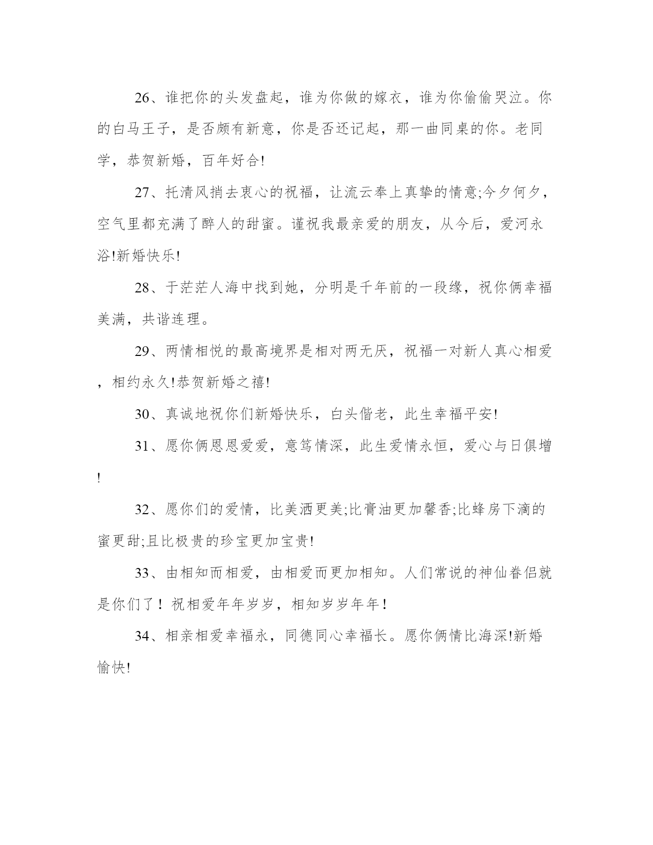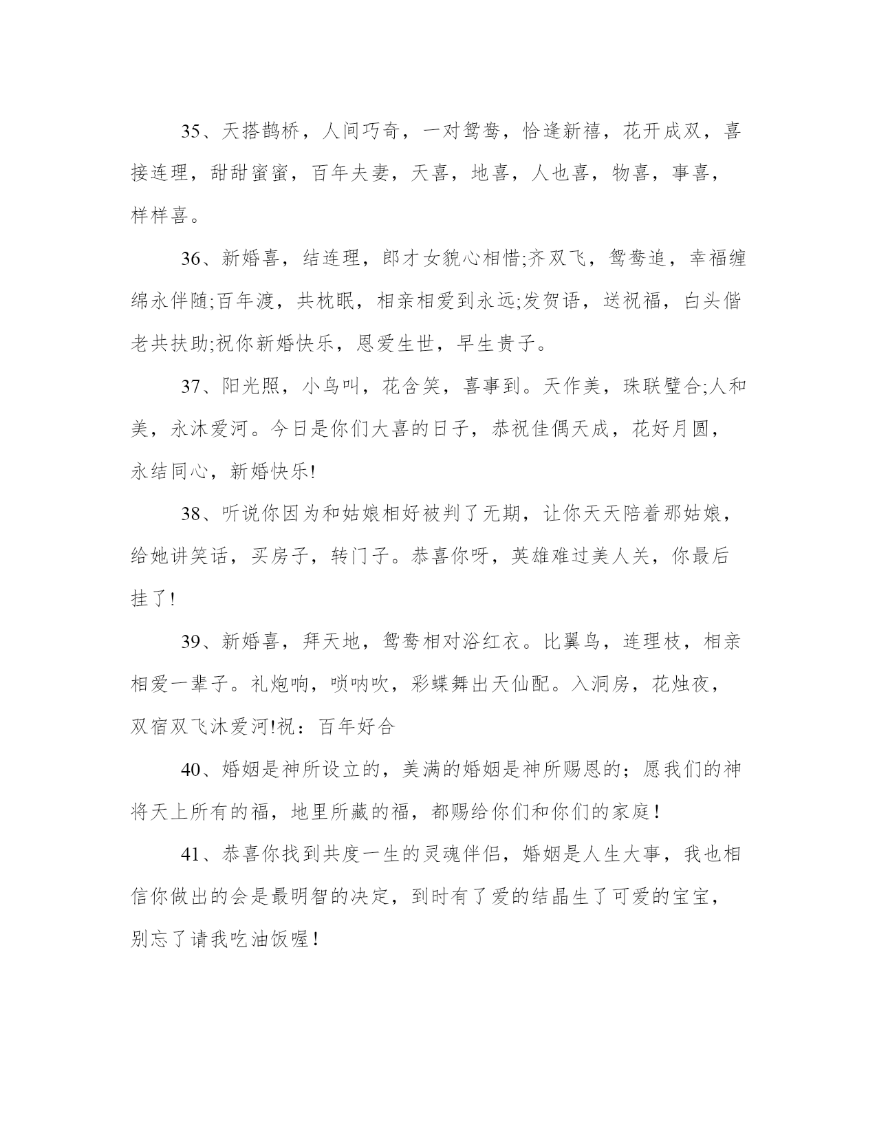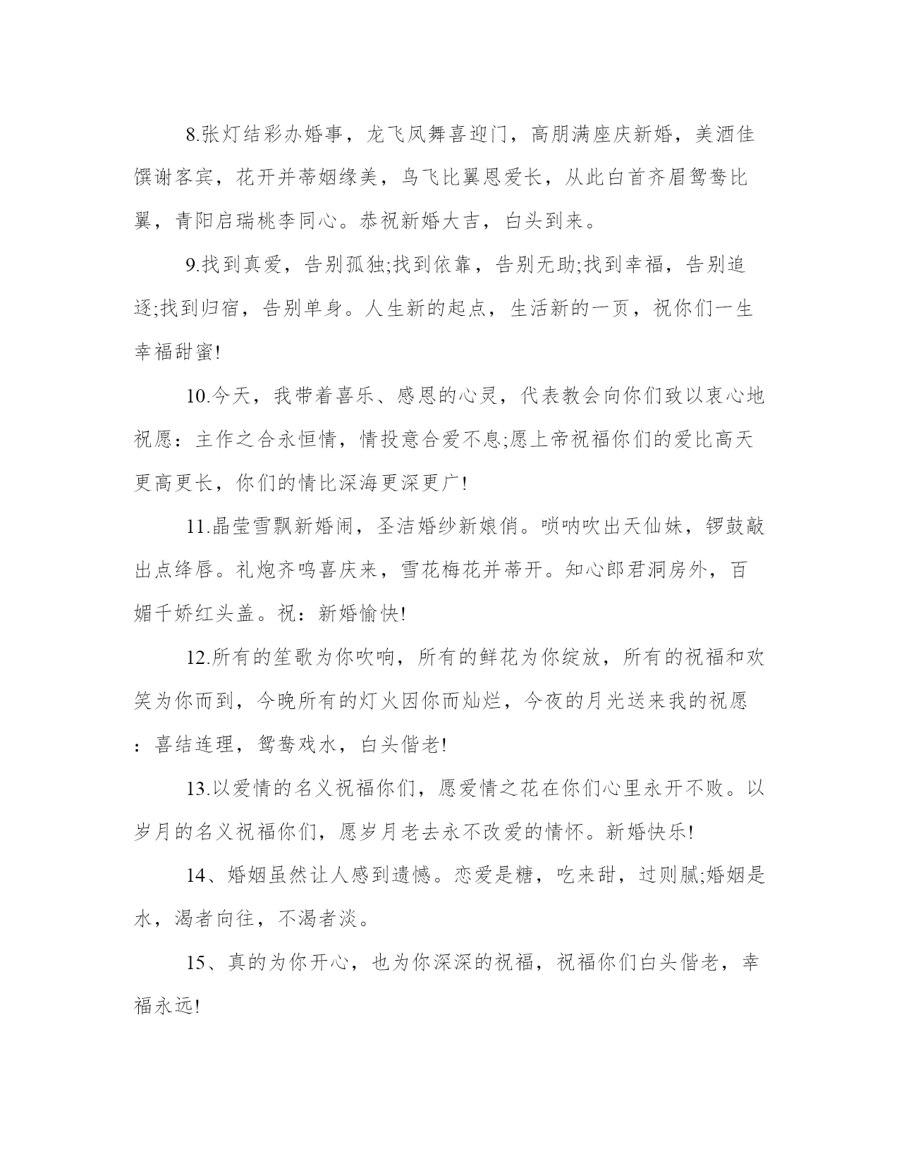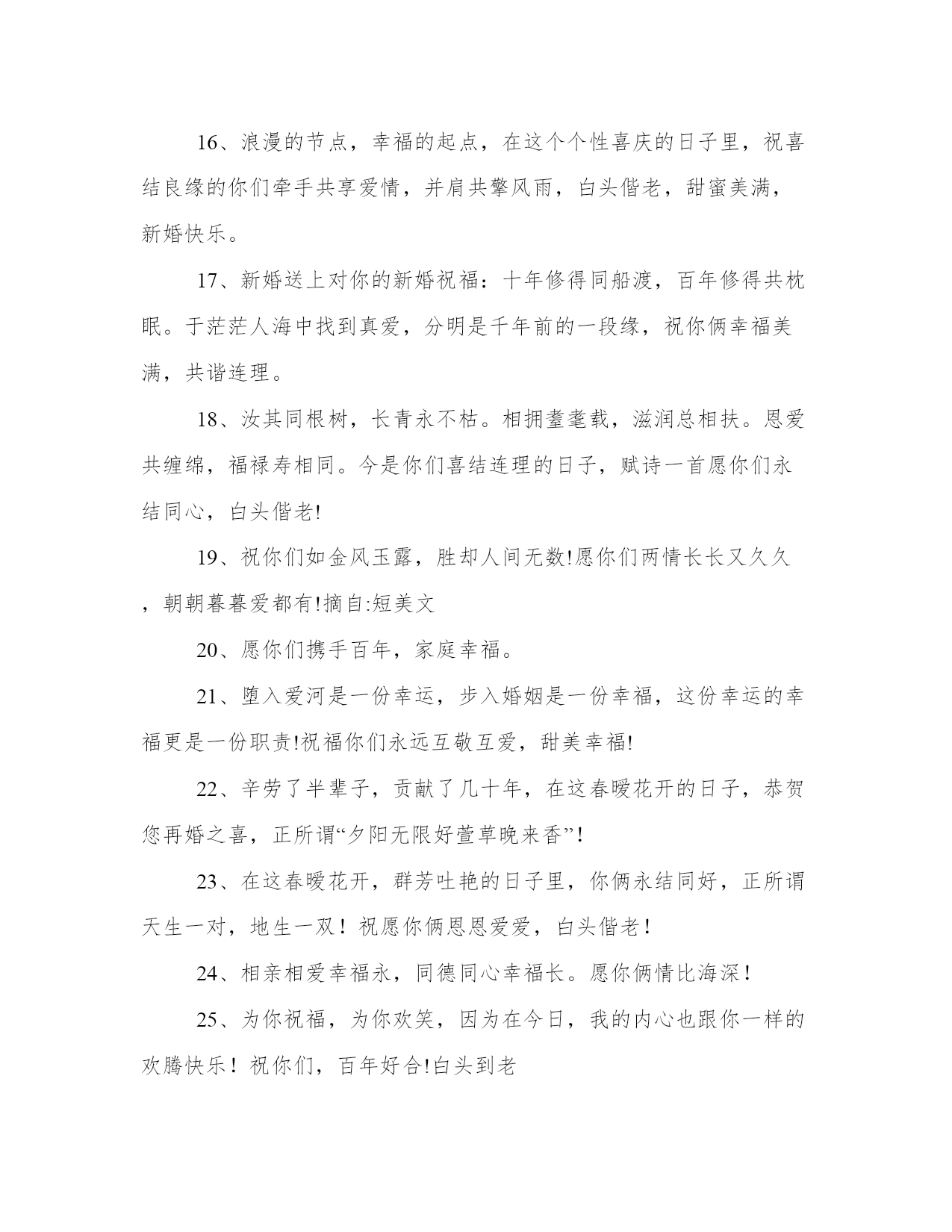 精选一句简短的结婚祝福语41句汇总1.由相知而相爱,由相爱而更加相知。人们常说的神仙眷侣就是你们了!祝相爱年年岁岁,相知岁岁年年!2.相亲相爱好伴侣,同德同心美姻缘。花烛笑迎比翼鸟,洞房喜开并头梅。3.这美好的日子里,仿佛空气里都充满了醉人的甜蜜。谨祝我最亲爱的朋友,从今后,爱河永浴!4.从此月夜共幽梦,从此双飞效彩蝶,千古知音此心同,一切尽在不言中,红烛高照盈笑意,真心祝愿你俩百年琴瑟,百年偕老。5.传说前世500次回眸才换回今日的擦肩而过,而今日修得渡同船那是有怎样的羁绊与的牵挂,今日终成眷属姻缘天成举案齐眉,祝你们永远幸福!6.分明是千年前的一段缘;无数个偶然堆积而成的必然,怎能不是三生石上精心镌刻的结果呢?用真心呵护这份缘吧,祝福你们,永结同心,真爱永远。7.牛郎织女鹊桥会,董永七仙成双对,红莲花开并蒂穗,桑榆枝结连理缀,今日良辰今宵醉,来年今日添子贵,相敬如宾案齐眉,夫妻恩爱永相随。新婚快乐!8.张灯结彩办婚事,龙飞凤舞喜迎门,高朋满座庆新婚,美酒佳馔谢客宾,花开并蒂姻缘美,鸟飞比翼恩爱长,从此白首齐眉鸳鸯比翼,青阳启瑞桃李同心。恭祝新婚大吉,白头到来。9.找到真爱,告别孤独;找到依靠,告别无助;找到幸福,告别追逐;找到归宿,告别单身。人生新的起点,生活新的一页,祝你们一生幸福甜蜜!10.今天,我带着喜乐、感恩的心灵,代表教会向你们致以衷心地祝愿:主作之合永恒情,情投意合爱不息;愿上帝祝福你们的爱比高天更高更长,你们的情比深海更深更广!11.晶莹雪飘新婚闹,圣洁婚纱新娘俏。唢呐吹出天仙妹,锣鼓敲出点绛唇。礼炮齐鸣喜庆来,雪花梅花并蒂开。知心郎君洞房外,百媚千娇红头盖。祝:新婚愉快!12.所有的笙歌为你吹响,所有的鲜花为你绽放,所有的祝福和欢笑为你而到,今晚所有的灯火因你而灿烂,今夜的月光送来我的祝愿:喜结连理,鸳鸯戏水,白头偕老!13.以爱情的名义祝福你们,愿爱情之花在你们心里永开不败。以岁月的名义祝福你们,愿岁月老去永不改爱的情怀。新婚快乐!14、婚姻虽然让人感到遗憾。恋爱是糖,吃来甜,过则腻;婚姻是水,渴者向往,不渴者淡。15、真的为你开心,也为你深深的祝福,祝福你们白头偕老,幸福永远!16、浪漫的节点,幸福的起点,在这个个性喜庆的日子里,祝喜结良缘的你们牵手共享爱情,并肩共擎风雨,白头偕老,甜蜜美满,新婚快乐。17、新婚送上对你的新婚祝福:十年修得同船渡,百年修得共枕眠。于茫茫人海中找到真爱,分明是千年前的一段缘,祝你俩幸福美满,共谐连理。18、汝其同根树,长青永不枯。相拥耋耄载,滋润总相扶。恩爱共缠绵,福禄寿相同。今是你们喜结连理的日子,赋诗一首愿你们永结同心,白头偕老!19、祝你们如金风玉露,胜却人间无数!愿你们两情长长又久久,朝朝暮暮爱都有!摘自:短美文20、愿你们携手百年,家庭幸福。21、堕入爱河是一份幸运,步入婚姻是一份幸福,这份幸运的幸福更是一份职责!祝福你们永远互敬互爱,甜美幸福!22、辛劳了半辈子,贡献了几十年,在这春暧花开的日子,恭贺您再婚之喜,正所谓“夕阳无限好萱草晚来香”!23、在这春暧花开,群芳吐艳的日子里,你俩永结同好,正所谓天生一对,地生一双!祝愿你俩恩恩爱爱,白头偕老!24、相亲相爱幸福永,同德同心幸福长。愿你俩情比海深!25、为你祝福,为你欢笑,因为在今日,我的内心也跟你一样的欢腾快乐!祝你们,百年好合!白头到老26、谁把你的头发盘起,谁为你做的嫁衣,谁为你偷偷哭泣。你的白马王子,是否颇有新意,你是否还记起,那一曲同桌的你。老同学,恭贺新婚,百年好合!27、托清风捎去衷心的祝福,让流云奉上真挚的情意;今夕何夕,空气里都充满了醉人的甜蜜。谨祝我最亲爱的朋友,从今后,爱河永浴!新婚快乐!28、于茫茫人海中找到她,分明是千年前的一段缘,祝你俩幸福美满,共谐连理。29、两情相悦的最高境界是相对两无厌,祝福一对新人真心相爱,相约永久!恭贺新婚之禧!30、真诚地祝你们新婚快乐,白头偕老,此生幸福平安!31、愿你俩恩恩爱爱,意笃情深,此生爱情永恒,爱心与日俱增!32、愿你们的爱情,比美洒更美;比膏油更加馨香;比蜂房下滴的蜜更甜;且比极贵的珍宝更加宝贵!33、由相知而相爱,由相爱而更加相知。人们常说的神仙眷侣就是你们了!祝相爱年年岁岁,相知岁岁年年!34、相亲相爱幸福永,同德同心幸福长。愿你俩情比海深!新婚愉快!35、天搭鹊桥,人间巧奇,一对鸳鸯,恰逢新禧,花开成双,喜接连理,甜甜蜜蜜,百年夫妻,天喜,地喜,人也喜,物喜,事喜,样样喜。36、新婚喜,结连理,郎才女貌心相惜;齐双飞,鸳鸯追,幸福缠绵永伴随;百年渡,共枕眠,相亲相爱到永远;发贺语,送祝福,白头偕老共扶助;祝你新婚快乐,恩爱生世,早生贵子。37、阳光照,小鸟叫,花含笑,喜事到。天作美,珠联璧合;人和美,永沐爱河。今日是你们大喜的日子,