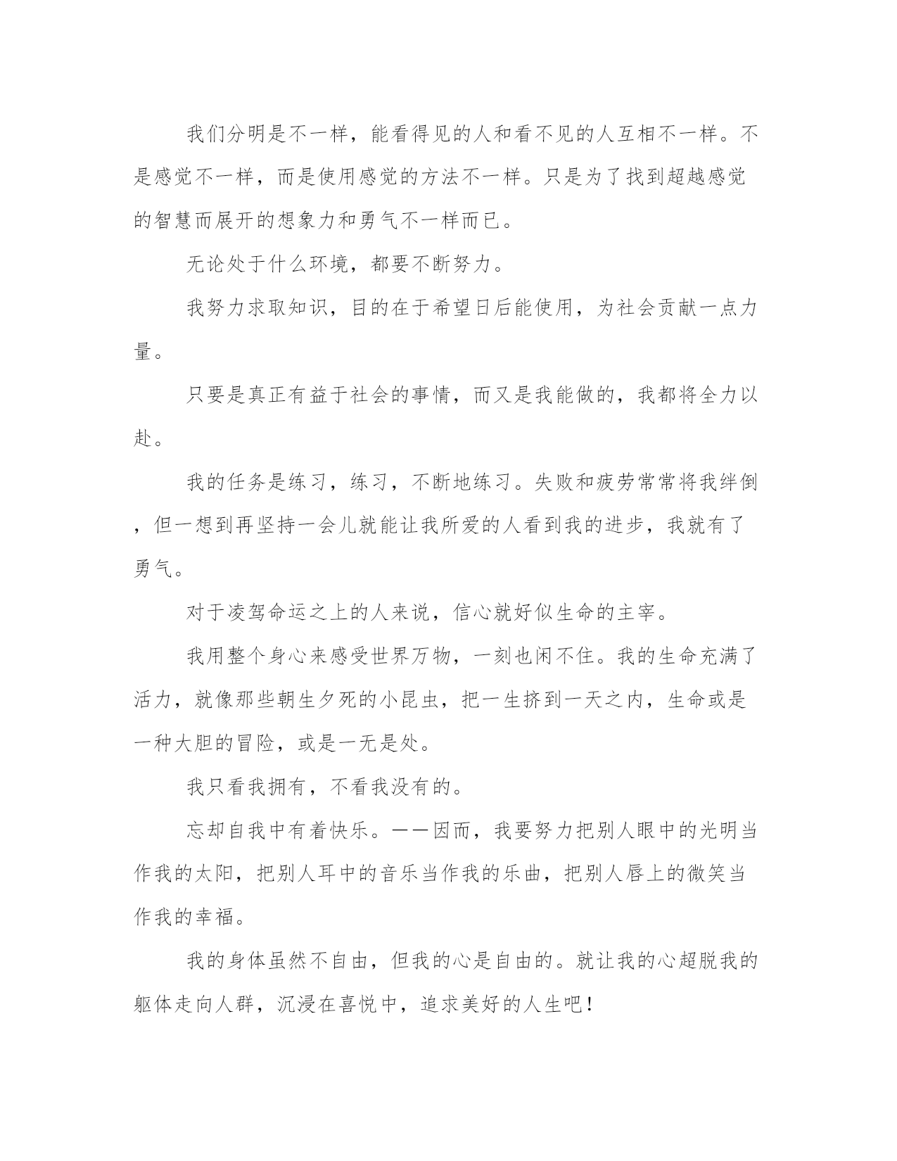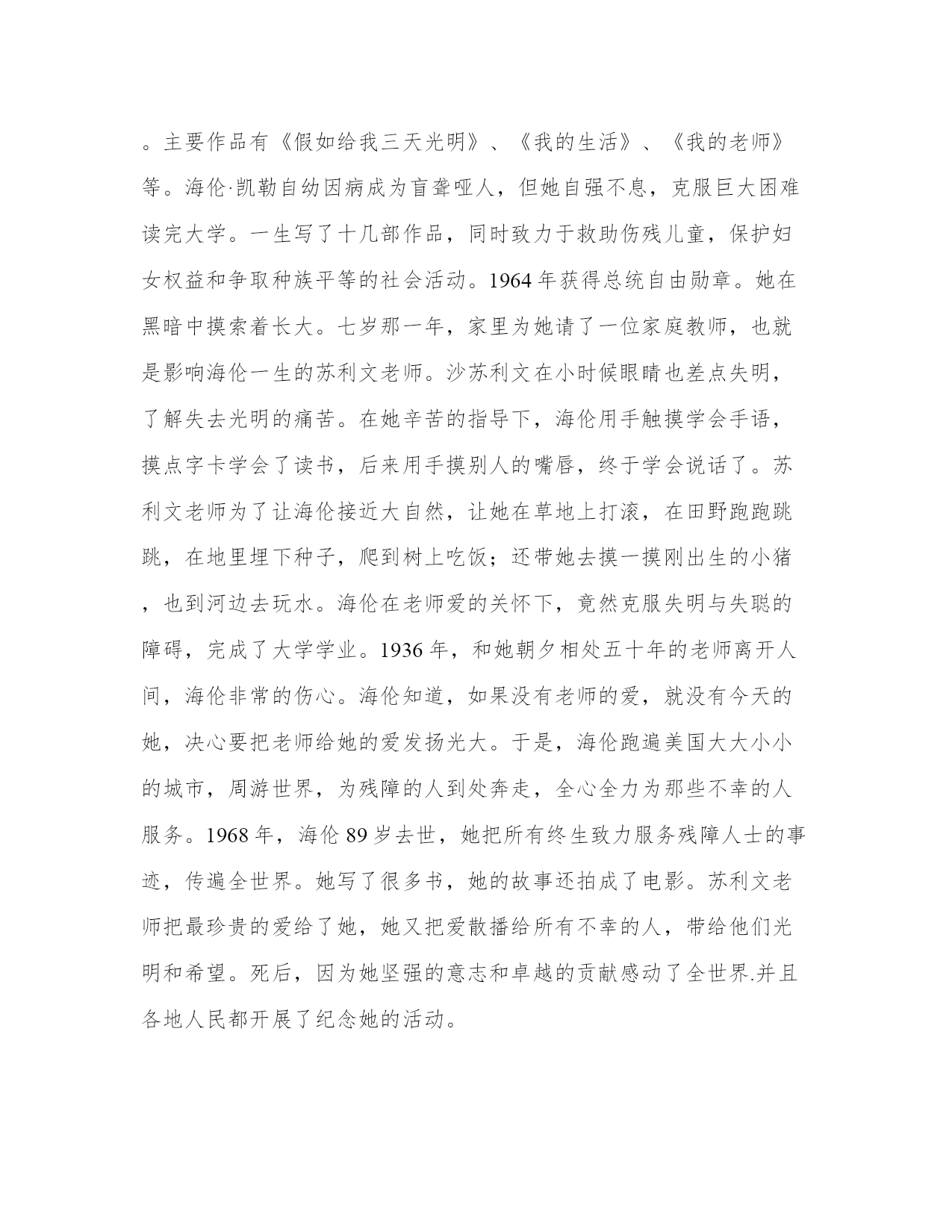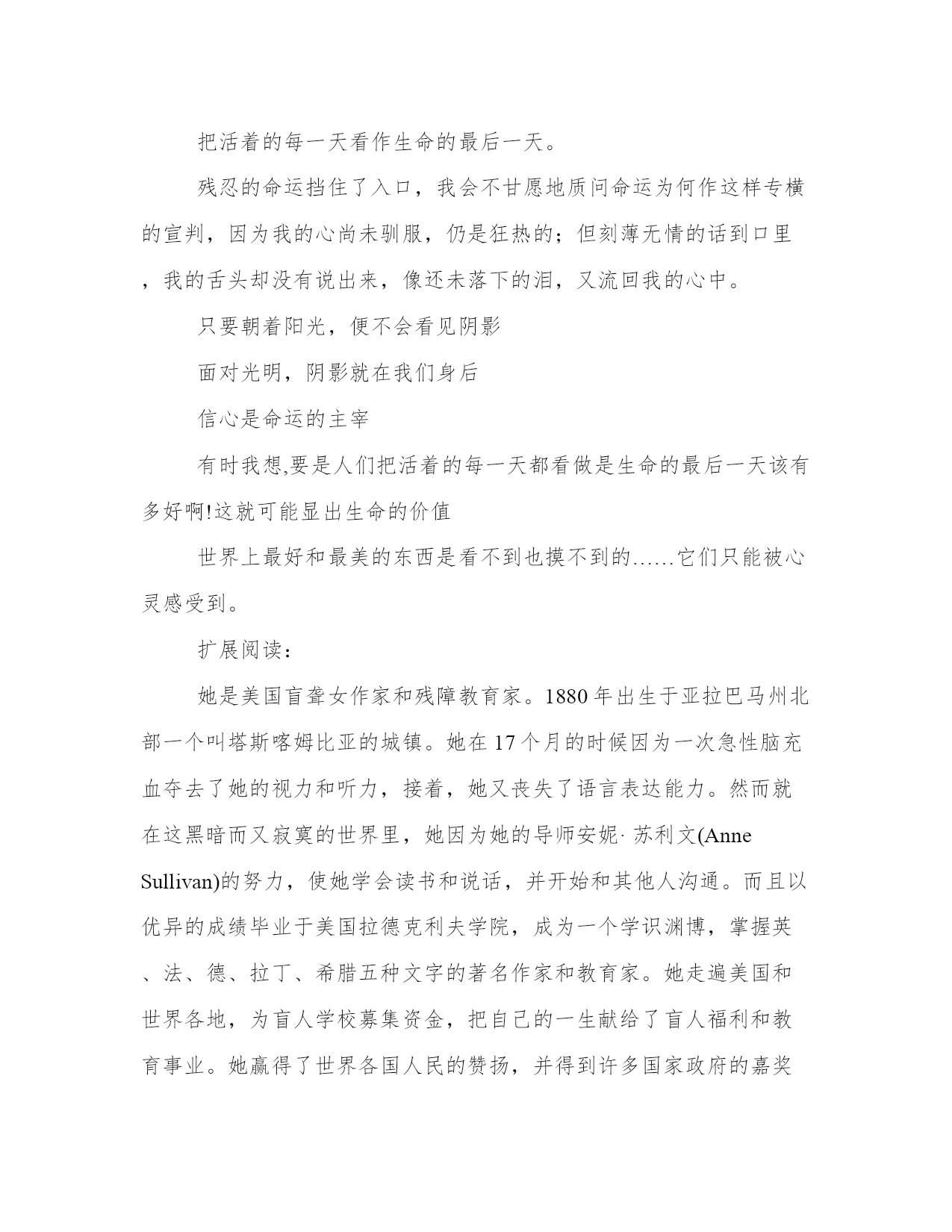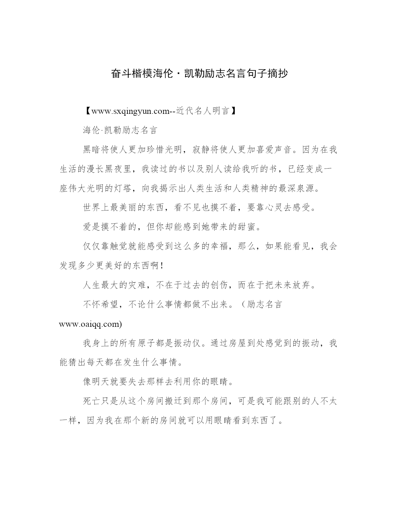 奋斗楷模海伦·凯勒励志名言句子摘抄【www.sxqingyun.com--近代名人明言】海伦·凯勒励志名言黑暗将使人更加珍惜光明,寂静将使人更加喜爱声音。因为在我生活的漫长黑夜里,我读过的书以及别人读给我听的书,已经变成一座伟大光明的灯塔,向我揭示出人类生活和人类精神的最深泉源。世界上最美丽的东西,看不见也摸不着,要靠心灵去感受。爱是摸不着的,但你却能感到她带来的甜蜜。仅仅靠触觉就能感受到这么多的幸福,那么,如果能看见,我会发现多少更美好的东西啊!人生最大的灾难,不在于过去的创伤,而在于把未来放弃。不怀希望,不论什么事情都做不出来。(励志名言www.oaiqq.com)我身上的所有原子都是振动仪。通过房屋到处感觉到的振动,我能猜出每天都在发生什么事情。像明天就要失去那样去利用你的眼睛。死亡只是从这个房间搬迁到那个房间,可是我可能跟别的人不太一样,因为我在那个新的房间就可以用眼睛看到东西了。我们分明是不一样,能看得见的人和看不见的人互相不一样。不是感觉不一样,而是使用感觉的方法不一样。只是为了找到超越感觉的智慧而展开的想象力和勇气不一样而已。无论处于什么环境,都要不断努力。我努力求取知识,目的在于希望日后能使用,为社会贡献一点力量。只要是真正有益于社会的事情,而又是我能做的,我都将全力以赴。我的任务是练习,练习,不断地练习。失败和疲劳常常将我绊倒,但一想到再坚持一会儿就能让我所爱的人看到我的进步,我就有了勇气。对于凌驾命运之上的人来说,信心就好似生命的主宰。我用整个身心来感受世界万物,一刻也闲不住。我的生命充满了活力,就像那些朝生夕死的小昆虫,把一生挤到一天之内,生命或是一种大胆的冒险,或是一无是处。我只看我拥有,不看我没有的。忘却自我中有着快乐。--因而,我要努力把别人眼中的光明当作我的太阳,把别人耳中的音乐当作我的乐曲,把别人唇上的微笑当作我的幸福。我的身体虽然不自由,但我的心是自由的。就让我的心超脱我的躯体走向人群,沉浸在喜悦中,追求美好的人生吧!把活着的每一天看作生命的最后一天。残忍的命运挡住了入口,我会不甘愿地质问命运为何作这样专横的宣判,因为我的心尚未驯服,仍是狂热的;但刻薄无情的话到口里,我的舌头却没有说出来,像还未落下的泪,又流回我的心中。只要朝着阳光,便不会看见阴影面对光明,阴影就在我们身后信心是命运的主宰有时我想,要是人们把活着的每一天都看做是生命的最后一天该有多好啊!这就可能显出生命的价值世界上最好和最美的东西是看不到也摸不到的……它们只能被心灵感受到。扩展阅读:她是美国盲聋女作家和残障教育家。1880年出生于亚拉巴马州北部一个叫塔斯喀姆比亚的城镇。她在17个月的时候因为一次急性脑充血夺去了她的视力和听力,接着,她又丧失了语言表达能力。然而就在这黑暗而又寂寞的世界里,她因为她的导师安妮·苏利文(AnneSullivan)的努力,使她学会读书和说话,并开始和其他人沟通。而且以优异的成绩毕业于美国拉德克利夫学院,成为一个学识渊博,掌握英、法、德、拉丁、希腊五种文字的著名作家和教育家。她走遍美国和世界各地,为盲人学校募集资金,把自己的一生献给了盲人福利和教育事业。她赢得了世界各国人民的赞扬,并得到许多国家政府的嘉奖。主要作品有《假如给我三天光明》、《我的生活》、《我的老师》等。海伦·凯勒自幼因病成为盲聋哑人,但她自强不息,克服巨大困难读完大学。一生写了十几部作品,同时致力于救助伤残儿童,保护妇女权益和争取种族平等的社会活动。1964年获得总统自由勋章。她在黑暗中摸索着长大。七岁那一年,家里为她请了一位家庭教师,也就是影响海伦一生的苏利文老师。沙苏利文在小时候眼睛也差点失明,了解失去光明的痛苦。在她辛苦的指导下,海伦用手触摸学会手语,摸点字卡学会了读书,后来用手摸别人的嘴唇,终于学会说话了。苏利文老师为了让海伦接近大自然,让她在草地上打滚,在田野跑跑跳跳,在地里埋下种子,爬到树上吃饭;还带她去摸一摸刚出生的小猪,也到河边去玩水。海伦在老师爱的关怀下,竟然克服失明与失聪的障碍,完成了大学学业。1936年,和她朝夕相处五十年的老师离开人间,海伦非常的伤心。海伦知道,如果没有老师的爱,就没有今天的她,决心要把老师给她的爱发扬光大。于是,海伦跑遍美国大大小小的城市,周游世界,为残障的人到处奔走,全心全力为那些不幸的人服务。1968年,海伦89岁去世,她把所有终生致力服务残障人士的事迹,传遍全世界。她写了很多书,她的故事还拍成了电影。苏利文老师把最珍贵的爱给了她,她又把爱散播给所有不幸的人,带给他们光明和希望。死后,因为她坚强的意志和卓越的贡献感动了全世界.并且各地人民都开展了纪念她的活动。