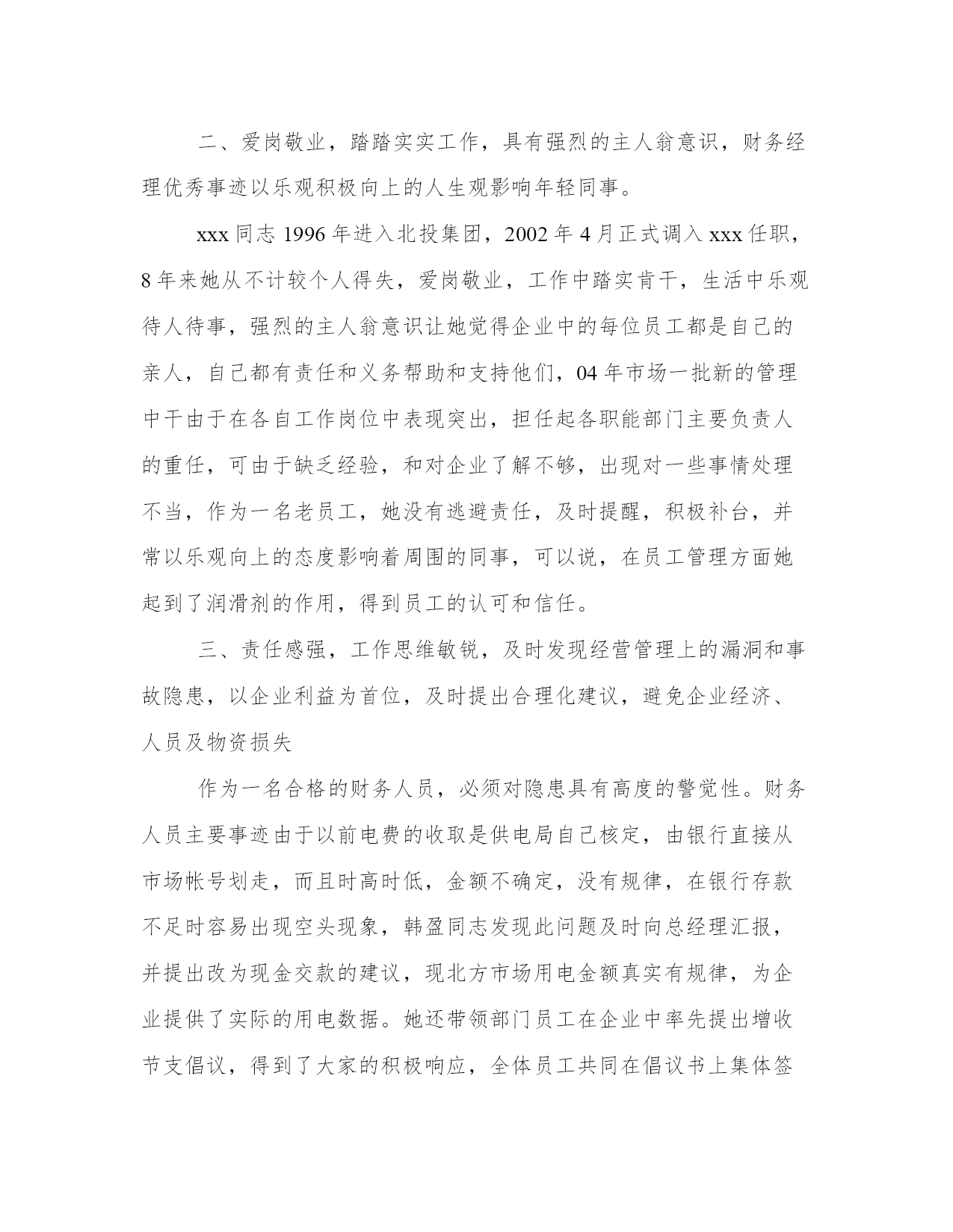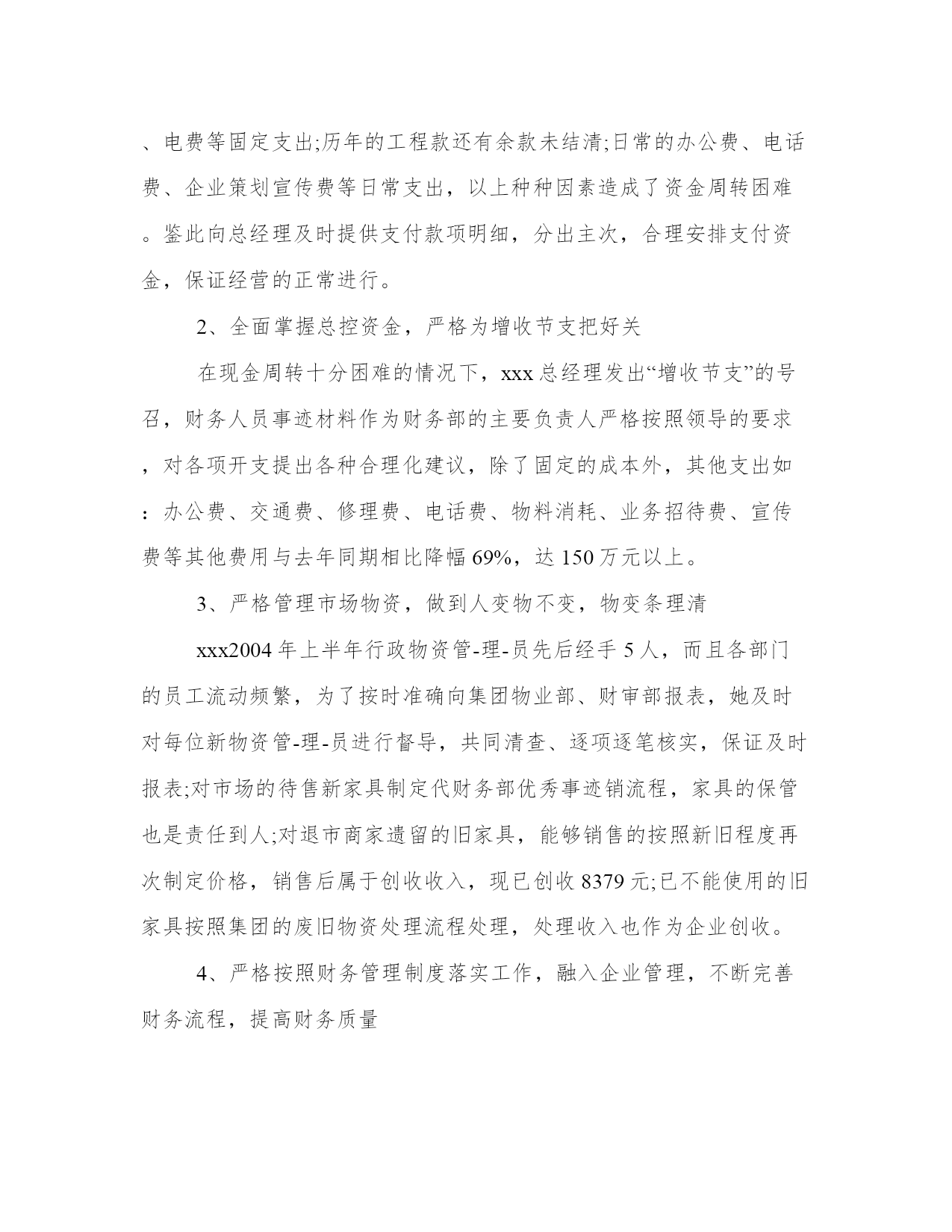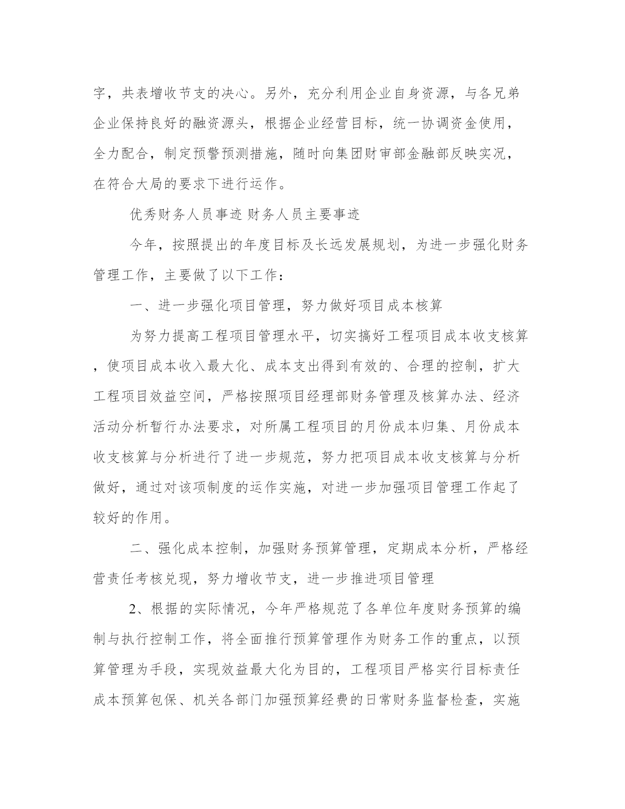 优秀财务人员事迹财务人员主要事迹身为一名优秀的财务人员,要加强理论学习,进一步提高自身素质,增强分析问题、解决问题的能力。下面是本站为大家带来的优秀财务人员事迹财务人员主要事迹,希望能帮助到大家!优秀财务人员事迹财务人员主要事迹xxx同志现任xxx,主管xxx财务工作。财务人员优秀事迹如下:一、全身心投入,配合总经办做好企业各项财务管理工作今年国家加大宏观调控力度,全国的汽车销售市场一直疲软,xxx也不例外,2004年严重影响了市场的经济效益,xxx面临着成立以来最严峻的考验,在这严峻的形势下,作为xxx财务部副经理,xxx同志尽职尽责,全力配合总经理做好自己的每一项工作。对总经理和总经理办公会的每一项重大决策后的财务预算,她总是一一落实到位,按要求及时完成,从无疏漏,做到了既能及时传达总经理办公会的各项决定又能协调和监督下属员工完成自己的工作,财务科先进事迹在把“提高经济效益增收节支”放在第一位的前提下突出了财务部的职能作用。1、合理提供资金支付计划,保证企业经营正常运行xxx现金周转困难,主要原因:商户退商,收入下降,缴费较困难;xxx的场地租金是一大笔固定支出,还有每月的员工工资、保安费、电费等固定支出;历年的工程款还有余款未结清;日常的办公费、电话费、企业策划宣传费等日常支出,以上种种因素造成了资金周转困难。鉴此向总经理及时提供支付款项明细,分出主次,合理安排支付资金,保证经营的正常进行。2、全面掌握总控资金,严格为增收节支把好关在现金周转十分困难的情况下,xxx总经理发出“增收节支”的号召,财务人员事迹材料作为财务部的主要负责人严格按照领导的要求,对各项开支提出各种合理化建议,除了固定的成本外,其他支出如:办公费、交通费、修理费、电话费、物料消耗、业务招待费、宣传费等其他费用与去年同期相比降幅69%,达150万元以上。3、严格管理市场物资,做到人变物不变,物变条理清xxx2004年上半年行政物资管-理-员先后经手5人,而且各部门的员工流动频繁,为了按时准确向集团物业部、财审部报表,她及时对每位新物资管-理-员进行督导,共同清查、逐项逐笔核实,保证及时报表;对市场的待售新家具制定代财务部优秀事迹销流程,家具的保管也是责任到人;对退市商家遗留的旧家具,能够销售的按照新旧程度再次制定价格,销售后属于创收收入,现已创收8379元;已不能使用的旧家具按照集团的废旧物资处理流程处理,处理收入也作为企业创收。4、严格按照财务管理制度落实工作,融入企业管理,不断完善财务流程,提高财务质量二、爱岗敬业,踏踏实实工作,具有强烈的主人翁意识,财务经理优秀事迹以乐观积极向上的人生观影响年轻同事。xxx同志1996年进入北投集团,2002年4月正式调入xxx任职,8年来她从不计较个人得失,爱岗敬业,工作中踏实肯干,生活中乐观待人待事,强烈的主人翁意识让她觉得企业中的每位员工都是自己的亲人,自己都有责任和义务帮助和支持他们,04年市场一批新的管理中干由于在各自工作岗位中表现突出,担任起各职能部门主要负责人的重任,可由于缺乏经验,和对企业了解不够,出现对一些事情处理不当,作为一名老员工,她没有逃避责任,及时提醒,积极补台,并常以乐观向上的态度影响着周围的同事,可以说,在员工管理方面她起到了润滑剂的作用,得到员工的认可和信任。三、责任感强,工作思维敏锐,及时发现经营管理上的漏洞和事故隐患,以企业利益为首位,及时提出合理化建议,避免企业经济、人员及物资损失作为一名合格的财务人员,必须对隐患具有高度的警觉性。财务人员主要事迹由于以前电费的收取是供电局自己核定,由银行直接从市场帐号划走,而且时高时低,金额不确定,没有规律,在银行存款不足时容易出现空头现象,韩盈同志发现此问题及时向总经理汇报,并提出改为现金交款的建议,现北方市场用电金额真实有规律,为企业提供了实际的用电数据。她还带领部门员工在企业中率先提出增收节支倡议,得到了大家的积极响应,全体员工共同在倡议书上集体签字,共表增收节支的决心。另外,充分利用企业自身资源,与各兄弟企业保持良好的融资源头,根据企业经营目标,统一协调资金使用,全力配合,制定预警预测措施,随时向集团财审部金融部反映实况,在符合大局的要求下进行运作。优秀财务人员事迹财务人员主要事迹今年,按照提出的年度目标及长远发展规划,为进一步强化财务管理工作,主要做了以下工作:一、进一步强化项目管理,努力做好项目成本核算为努力提高工程项目管理水平,切实搞好工程项目成本收支核算,使项目成本收入最大化、成本支出得到有效的、合理的控制,扩大工程项目效益空间,严格按照项目经理部财务管理及核算办法、经济活动分析暂行办法要求,对所属工程项目的月份成本归集、月份成本收支核算与分析进行了进一步规范,努力把项目成本收支核算与分析做好,通过对该项制度的运作实施,对进