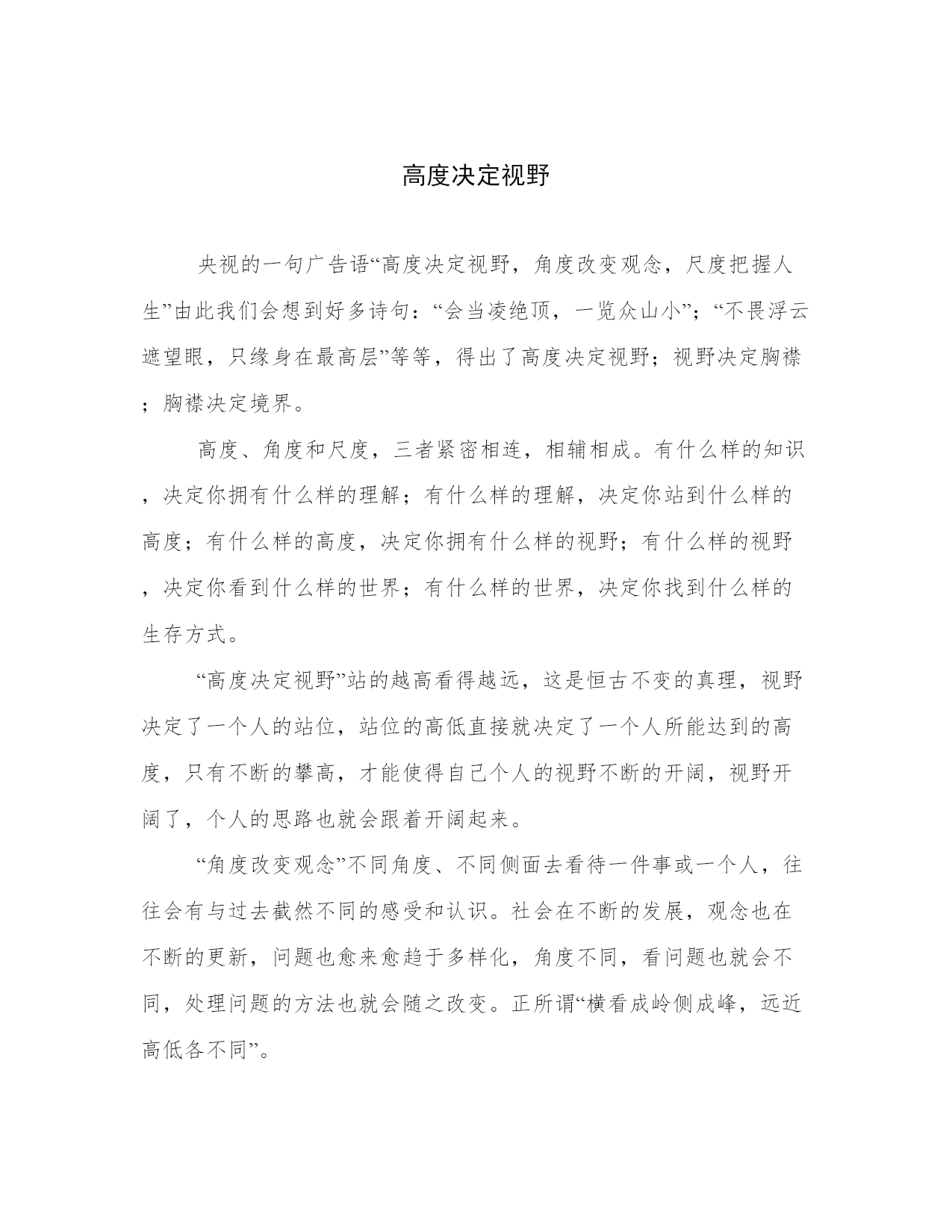 高度决定视野央视的一句广告语“高度决定视野,角度改变观念,尺度把握人生”由此我们会想到好多诗句:“会当凌绝顶,一览众山小”;“不畏浮云遮望眼,只缘身在最高层”等等,得出了高度决定视野;视野决定胸襟;胸襟决定境界。高度、角度和尺度,三者紧密相连,相辅相成。有什么样的知识,决定你拥有什么样的理解;有什么样的理解,决定你站到什么样的高度;有什么样的高度,决定你拥有什么样的视野;有什么样的视野,决定你看到什么样的世界;有什么样的世界,决定你找到什么样的生存方式。“高度决定视野”站的越高看得越远,这是恒古不变的真理,视野决定了一个人的站位,站位的高低直接就决定了一个人所能达到的高度,只有不断的攀高,才能使得自己个人的视野不断的开阔,视野开阔了,个人的思路也就会跟着开阔起来。“角度改变观念”不同角度、不同侧面去看待一件事或一个人,往往会有与过去截然不同的感受和认识。社会在不断的发展,观念也在不断的更新,问题也愈来愈趋于多样化,角度不同,看问题也就会不同,处理问题的方法也就会随之改变。正所谓“横看成岭侧成峰,远近高低各不同”。