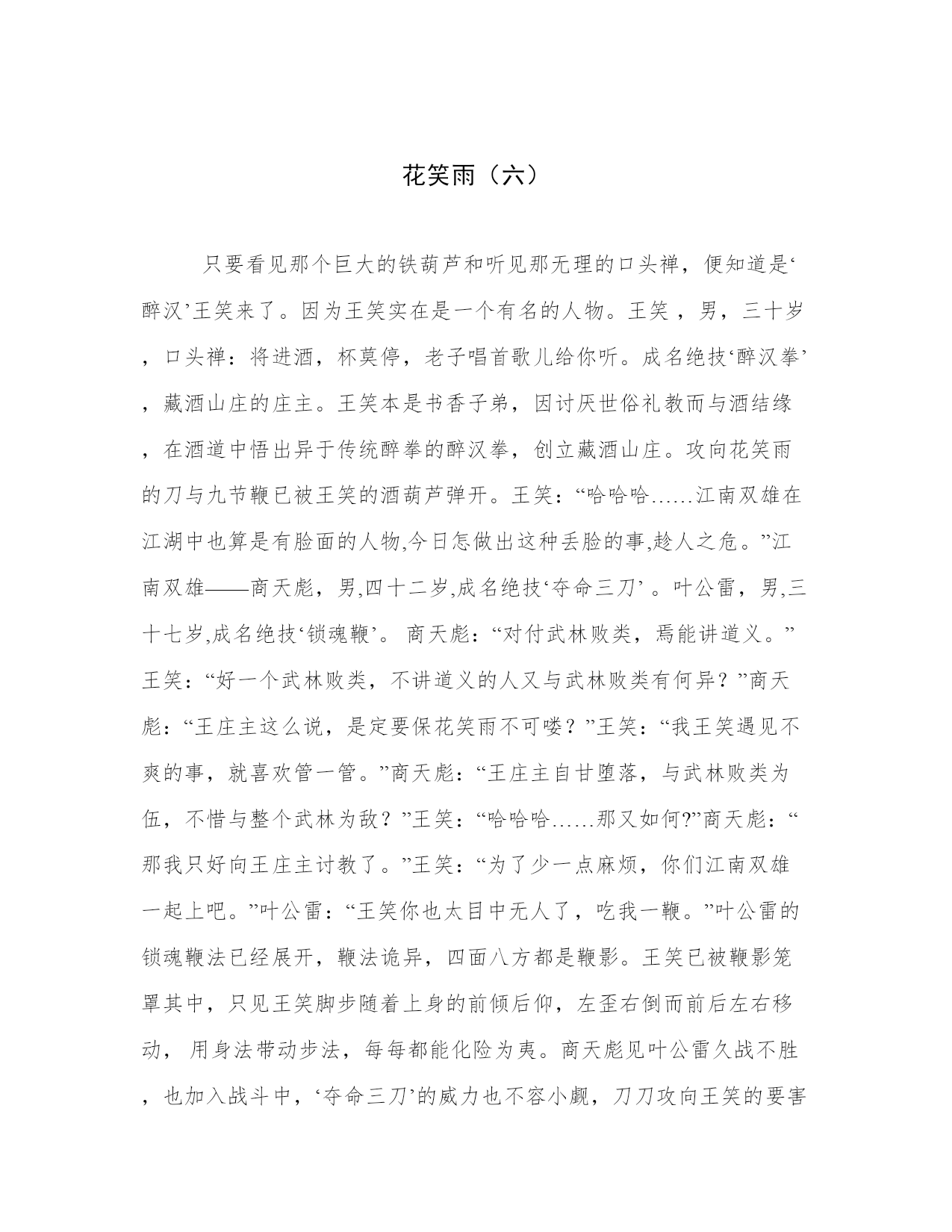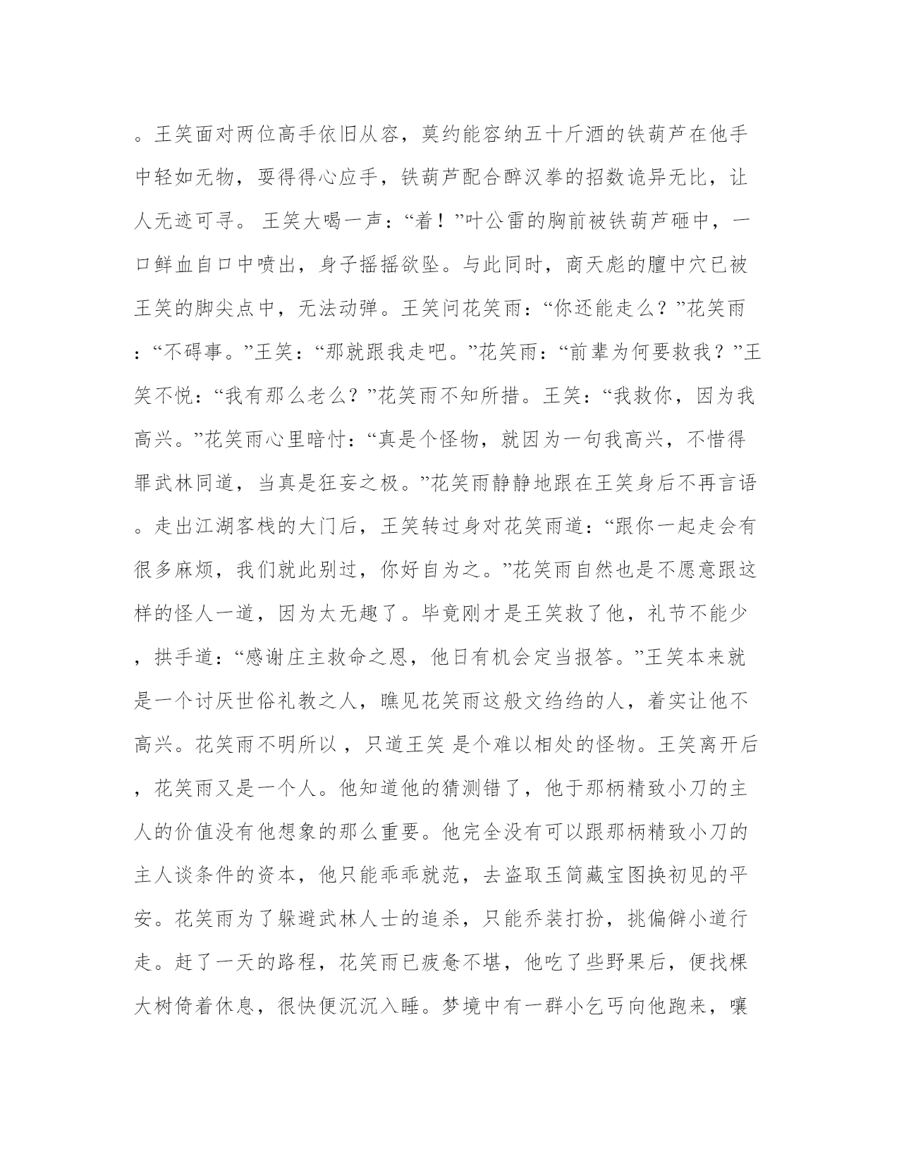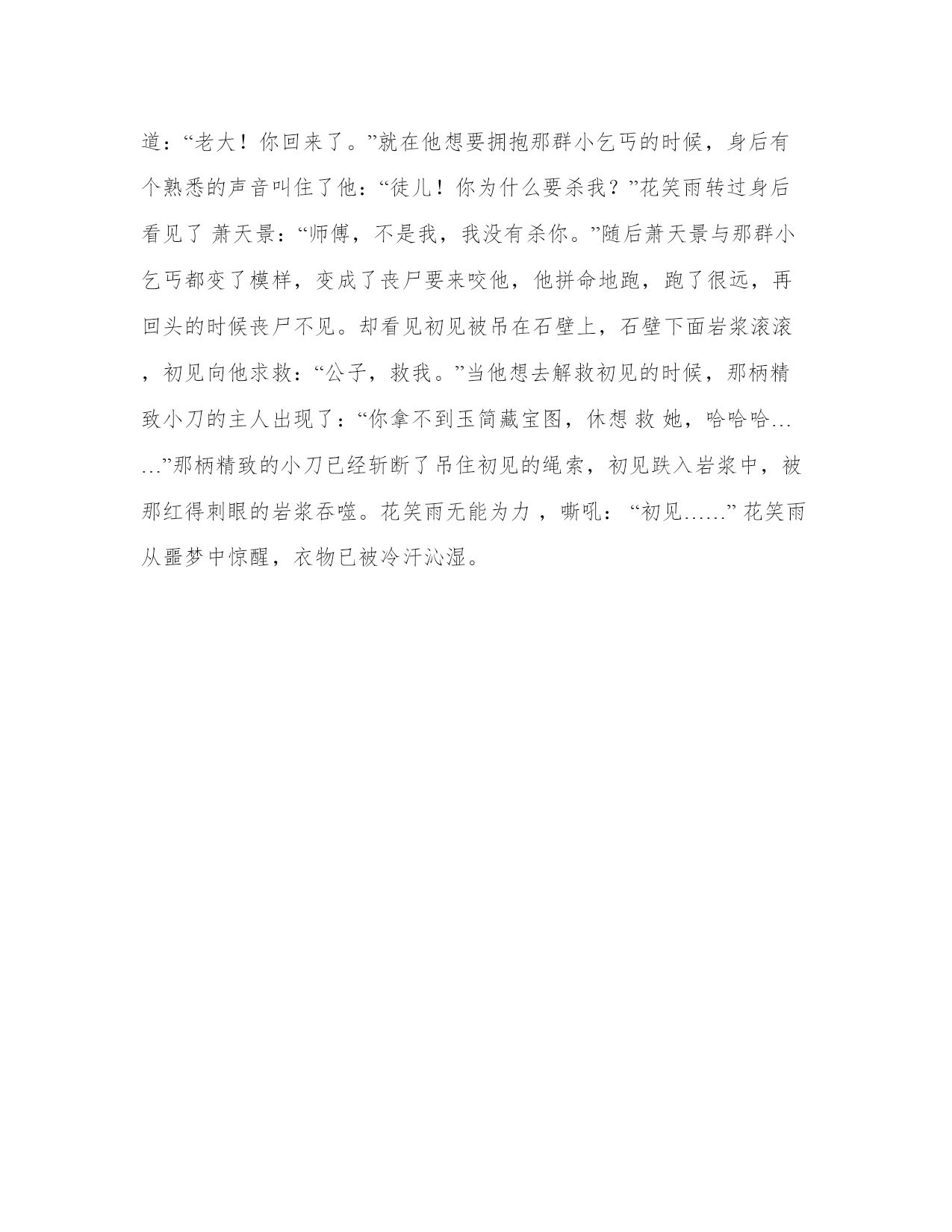 花笑雨(六)只要看见那个巨大的铁葫芦和听见那无理的口头禅,便知道是‘醉汉’王笑来了。因为王笑实在是一个有名的人物。王笑,男,三十岁,口头禅:将进酒,杯莫停,老子唱首歌儿给你听。成名绝技‘醉汉拳’,藏酒山庄的庄主。王笑本是书香子弟,因讨厌世俗礼教而与酒结缘,在酒道中悟出异于传统醉拳的醉汉拳,创立藏酒山庄。攻向花笑雨的刀与九节鞭已被王笑的酒葫芦弹开。王笑:“哈哈哈……江南双雄在江湖中也算是有脸面的人物,今日怎做出这种丢脸的事,趁人之危。”江南双雄——商天彪,男,四十二岁,成名绝技‘夺命三刀’。叶公雷,男,三十七岁,成名绝技‘锁魂鞭’。商天彪:“对付武林败类,焉能讲道义。”王笑:“好一个武林败类,不讲道义的人又与武林败类有何异?”商天彪:“王庄主这么说,是定要保花笑雨不可喽?”王笑:“我王笑遇见不爽的事,就喜欢管一管。”商天彪:“王庄主自甘堕落,与武林败类为伍,不惜与整个武林为敌?”王笑:“哈哈哈……那又如何?”商天彪:“那我只好向王庄主讨教了。”王笑:“为了少一点麻烦,你们江南双雄一起上吧。”叶公雷:“王笑你也太目中无人了,吃我一鞭。”叶公雷的锁魂鞭法已经展开,鞭法诡异,四面八方都是鞭影。王笑已被鞭影笼罩其中,只见王笑脚步随着上身的前倾后仰,左歪右倒而前后左右移动,用身法带动步法,每每都能化险为夷。商天彪见叶公雷久战不胜,也加入战斗中,‘夺命三刀’的威力也不容小觑,刀刀攻向王笑的要害。王笑面对两位高手依旧从容,莫约能容纳五十斤酒的铁葫芦在他手中轻如无物,耍得得心应手,铁葫芦配合醉汉拳的招数诡异无比,让人无迹可寻。王笑大喝一声:“着!”叶公雷的胸前被铁葫芦砸中,一口鲜血自口中喷出,身子摇摇欲坠。与此同时,商天彪的膻中穴已被王笑的脚尖点中,无法动弹。王笑问花笑雨:“你还能走么?”花笑雨:“不碍事。”王笑:“那就跟我走吧。”花笑雨:“前辈为何要救我?”王笑不悦:“我有那么老么?”花笑雨不知所措。王笑:“我救你,因为我高兴。”花笑雨心里暗忖:“真是个怪物,就因为一句我高兴,不惜得罪武林同道,当真是狂妄之极。”花笑雨静静地跟在王笑身后不再言语。走出江湖客栈的大门后,王笑转过身对花笑雨道:“跟你一起走会有很多麻烦,我们就此别过,你好自为之。”花笑雨自然也是不愿意跟这样的怪人一道,因为太无趣了。毕竟刚才是王笑救了他,礼节不能少,拱手道:“感谢庄主救命之恩,他日有机会定当报答。”王笑本来就是一个讨厌世俗礼教之人,瞧见花笑雨这般文绉绉的人,着实让他不高兴。花笑雨不明所以,只道王笑是个难以相处的怪物。王笑离开后,花笑雨又是一个人。他知道他的猜测错了,他于那柄精致小刀的主人的价值没有他想象的那么重要。他完全没有可以跟那柄精致小刀的主人谈条件的资本,他只能乖乖就范,去盗取玉简藏宝图换初见的平安。花笑雨为了躲避武林人士的追杀,只能乔装打扮,挑偏僻小道行走。赶了一天的路程,花笑雨已疲惫不堪,他吃了些野果后,便找棵大树倚着休息,很快便沉沉入睡。梦境中有一群小乞丐向他跑来,嚷道:“老大!你回来了。”就在他想要拥抱那群小乞丐的时候,身后有个熟悉的声音叫住了他:“徒儿!你为什么要杀我?”花笑雨转过身后看见了萧天景:“师傅,不是我,我没有杀你。”随后萧天景与那群小乞丐都变了模样,变成了丧尸要来咬他,他拼命地跑,跑了很远,再回头的时候丧尸不见。却看见初见被吊在石壁上,石壁下面岩浆滚滚,初见向他求救:“公子,救我。”当他想去解救初见的时候,那柄精致小刀的主人出现了:“你拿不到玉简藏宝图,休想救她,哈哈哈……”那柄精致的小刀已经斩断了吊住初见的绳索,初见跌入岩浆中,被那红得刺眼的岩浆吞噬。花笑雨无能为力,嘶吼:“初见……”花笑雨从噩梦中惊醒,衣物已被冷汗沁湿。