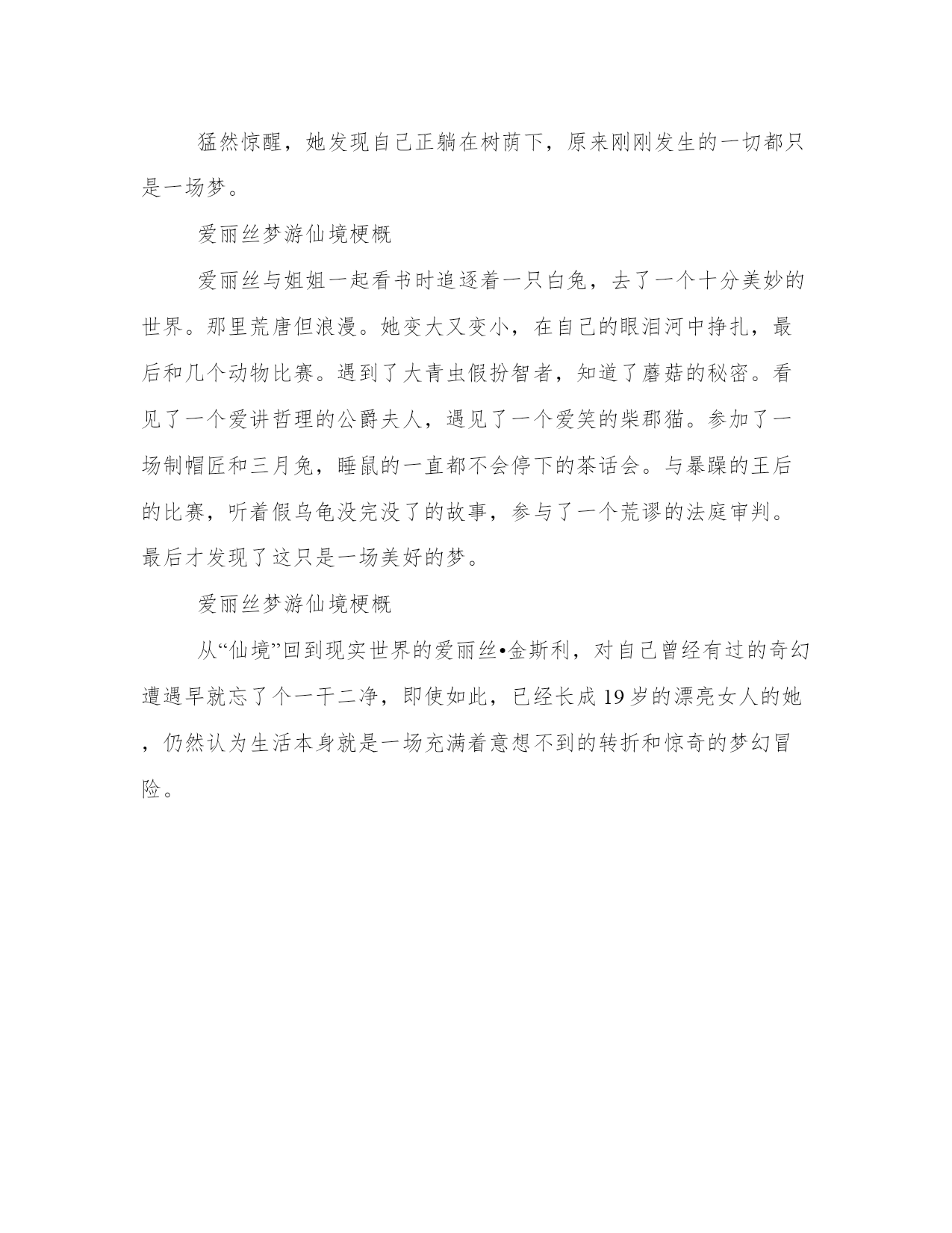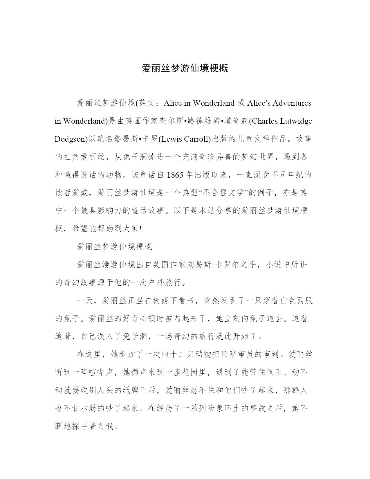 爱丽丝梦游仙境梗概爱丽丝梦游仙境(英文:AliceinWonderland或Alice'sAdventuresinWonderland)是由英国作家查尔斯•路德维希•道奇森(CharlesLutwidgeDodgson)以笔名路易斯•卡罗(LewisCarroll)出版的儿童文学作品。故事的主角爱丽丝,从兔子洞掉进一个充满奇珍异兽的梦幻世界,遇到各种懂得说话的动物。该童话自1865年出版以来,一直深受不同年纪的读者爱戴,爱丽丝梦游仙境是一个典型“不合理文学”的例子,亦是其中一个最具影响力的童话故事。以下是本站分享的爱丽丝梦游仙境梗概,希望能帮助到大家!爱丽丝梦游仙境梗概爱丽丝漫游仙境出自英国作家刘易斯·卡罗尔之手,小说中所讲的奇幻故事源于他的一次户外旅行。一天,爱丽丝正坐在树荫下看书,突然发现了一只穿着白色西服的兔子。爱丽丝的好奇心顿时被勾起来了,她立刻向兔子追去。追着追着,自己误入了兔子洞,一场奇幻的旅行就此开始了。在这里,她参加了一次由十二只动物担任陪审员的审判。爱丽丝听到一阵喧哗声,她循声来到一座花园里,遇到了能管住国王、动不动就要砍别人头的纸牌王后,爱丽丝忍不住和他们吵了起来,那群人也不甘示弱的吵了起来。在经历了一系列险象环生的事故之后,她不断地探寻着自我。猛然惊醒,她发现自己正躺在树荫下,原来刚刚发生的一切都只是一场梦。爱丽丝梦游仙境梗概爱丽丝与姐姐一起看书时追逐着一只白兔,去了一个十分美妙的世界。那里荒唐但浪漫。她变大又变小,在自己的眼泪河中挣扎,最后和几个动物比赛。遇到了大青虫假扮智者,知道了蘑菇的秘密。看见了一个爱讲哲理的公爵夫人,遇见了一个爱笑的柴郡猫。参加了一场制帽匠和三月兔,睡鼠的一直都不会停下的茶话会。与暴躁的王后的比赛,听着假乌龟没完没了的故事,参与了一个荒谬的法庭审判。最后才发现了这只是一场美好的梦。爱丽丝梦游仙境梗概从“仙境”回到现实世界的爱丽丝•金斯利,对自己曾经有过的奇幻遭遇早就忘了个一干二净,即使如此,已经长成19岁的漂亮女人的她,仍然认为生活本身就是一场充满着意想不到的转折和惊奇的梦幻冒险。