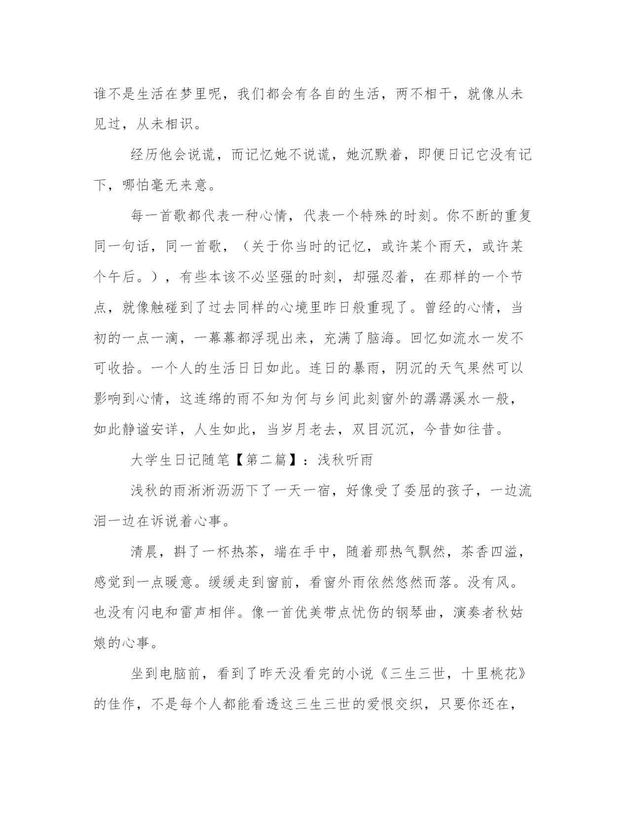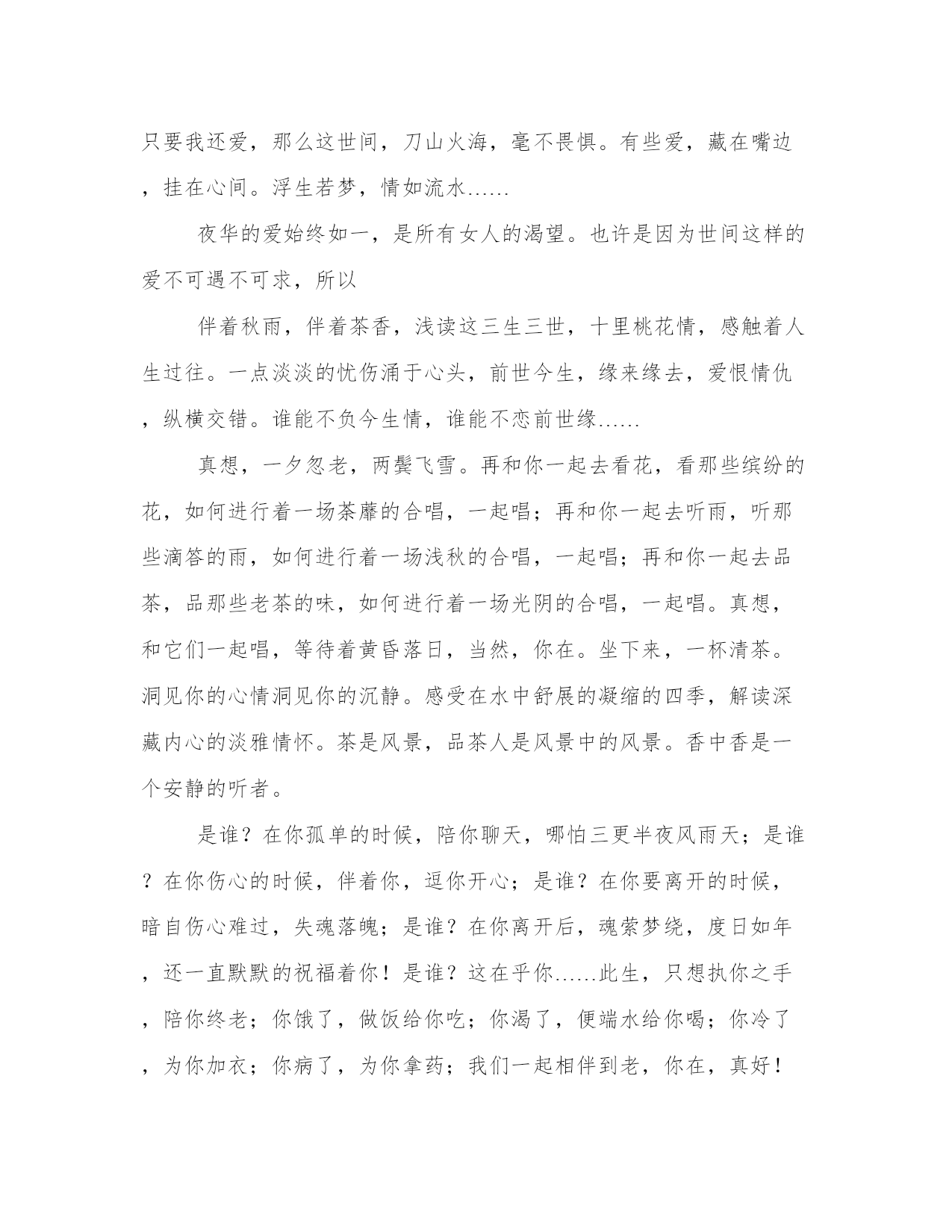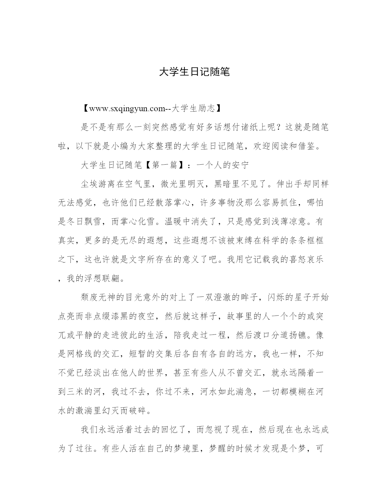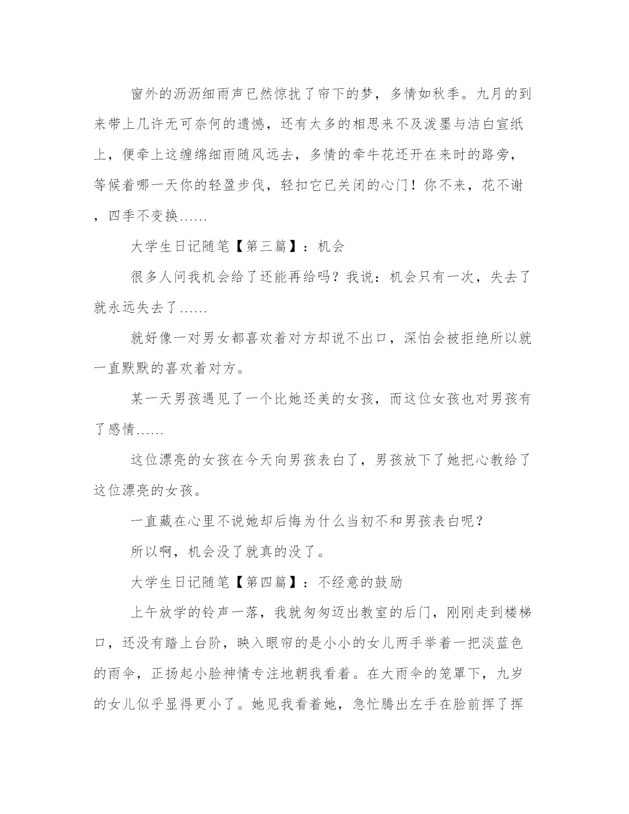 大学生日记随笔【www.sxqingyun.com--大学生励志】是不是有那么一刻突然感觉有好多话想付诸纸上呢?这就是随笔啦,以下就是小编为大家整理的大学生日记随笔,欢迎阅读和借鉴。大学生日记随笔【第一篇】:一个人的安宁尘埃游离在空气里,微光里明灭,黑暗里不见了。伸出手却同样无法感觉,也许他们已经散落掌心,许多事物没那么容易抓住,哪怕是冬日飘雪,而掌心化雪。温暖中消失了,只是感觉到浅薄凉意。有真实,更多的是无尽的遐想,这些遐想不该被束缚在科学的条条框框之下,这也许就是文字所存在的意义了吧。我用它记载我的喜怒哀乐,我的浮想联翩。颓废无神的目光意外的对上了一双澄澈的眸子,闪烁的星子开始点亮而非点缀漆黑的夜空,然后就这样子,故事里的人一个个的或突兀或平静的走进彼此的生活,陪我走过一程,然后渡口分道扬镳。像是网格线的交汇,短暂的交集后各自有各自的远方,我也一样,不知不觉已经淡出在他人的世界,甚至有些人从不曾交汇,就永远隔着一到三米的河,我过不去,你过不来,河水如此湍急,一切都模糊在河水的激湍里幻灭而破碎。我们永远活着过去的回忆了,而忽视了现在,然后现在也永远成为了过往。有些人活在自己的梦境里,梦醒的时候才发现是个梦,可谁不是生活在梦里呢,我们都会有各自的生活,两不相干,就像从未见过,从未相识。经历他会说谎,而记忆她不说谎,她沉默着,即便日记它没有记下,哪怕毫无来意。每一首歌都代表一种心情,代表一个特殊的时刻。你不断的重复同一句话,同一首歌,(关于你当时的记忆,或许某个雨天,或许某个午后。),有些本该不必坚强的时刻,却强忍着,在那样的一个节点,就像触碰到了过去同样的心境里昨日般重现了。曾经的心情,当初的一点一滴,一幕幕都浮现出来,充满了脑海。回忆如流水一发不可收拾。一个人的生活日日如此。连日的暴雨,阴沉的天气果然可以影响到心情,这连绵的雨不知为何与乡间此刻窗外的潺潺溪水一般,如此静谧安详,人生如此,当岁月老去,双目沉沉,今昔如往昔。大学生日记随笔【第二篇】:浅秋听雨浅秋的雨淅淅沥沥下了一天一宿,好像受了委屈的孩子,一边流泪一边在诉说着心事。清晨,斟了一杯热茶,端在手中,随着那热气飘然,茶香四溢,感觉到一点暖意。缓缓走到窗前,看窗外雨依然悠然而落。没有风。也没有闪电和雷声相伴。像一首优美带点忧伤的钢琴曲,演奏者秋姑娘的心事。坐到电脑前,看到了昨天没看完的小说《三生三世,十里桃花》的佳作,不是每个人都能看透这三生三世的爱恨交织,只要你还在,只要我还爱,那么这世间,刀山火海,毫不畏惧。有些爱,藏在嘴边,挂在心间。浮生若梦,情如流水……夜华的爱始终如一,是所有女人的渴望。也许是因为世间这样的爱不可遇不可求,所以伴着秋雨,伴着茶香,浅读这三生三世,十里桃花情,感触着人生过往。一点淡淡的忧伤涌于心头,前世今生,缘来缘去,爱恨情仇,纵横交错。谁能不负今生情,谁能不恋前世缘……真想,一夕忽老,两鬓飞雪。再和你一起去看花,看那些缤纷的花,如何进行着一场荼蘼的合唱,一起唱;再和你一起去听雨,听那些滴答的雨,如何进行着一场浅秋的合唱,一起唱;再和你一起去品茶,品那些老茶的味,如何进行着一场光阴的合唱,一起唱。真想,和它们一起唱,等待着黄昏落日,当然,你在。坐下来,一杯清茶。洞见你的心情洞见你的沉静。感受在水中舒展的凝缩的四季,解读深藏内心的淡雅情怀。茶是风景,品茶人是风景中的风景。香中香是一个安静的听者。是谁?在你孤单的时候,陪你聊天,哪怕三更半夜风雨天;是谁?在你伤心的时候,伴着你,逗你开心;是谁?在你要离开的时候,暗自伤心难过,失魂落魄;是谁?在你离开后,魂萦梦绕,度日如年,还一直默默的祝福着你!是谁?这在乎你……此生,只想执你之手,陪你终老;你饿了,做饭给你吃;你渴了,便端水给你喝;你冷了,为你加衣;你病了,为你拿药;我们一起相伴到老,你在,真好!窗外的沥沥细雨声已然惊扰了帘下的梦,多情如秋季。九月的到来带上几许无可奈何的遗憾,还有太多的相思来不及泼墨与洁白宣纸上,便牵上这缠绵细雨随风远去,多情的牵牛花还开在来时的路旁,等候着哪一天你的轻盈步伐,轻扣它已关闭的心门!你不来,花不谢,四季不变换……大学生日记随笔【第三篇】:机会很多人问我机会给了还能再给吗?我说:机会只有一次,失去了就永远失去了……就好像一对男女都喜欢着对方却说不出口,深怕会被拒绝所以就一直默默的喜欢着对方。某一天男孩遇见了一个比她还美的女孩,而这位女孩也对男孩有了感情……这位漂亮的女孩在今天向男孩表白了,男孩放下了她把心教给了这位漂亮的女孩。一直藏在心里不说她却后悔为什么当初不和男孩表白呢?所以啊,机会没了就真的没了。大学生日记随笔【第四篇】:不经意的鼓励上午放学的铃声一落,我就匆匆迈出教室的后门,刚刚走到楼梯口,还没有踏上台阶,映入眼帘的是小小的女儿两手举着一把淡蓝色的雨伞,正扬起小脸