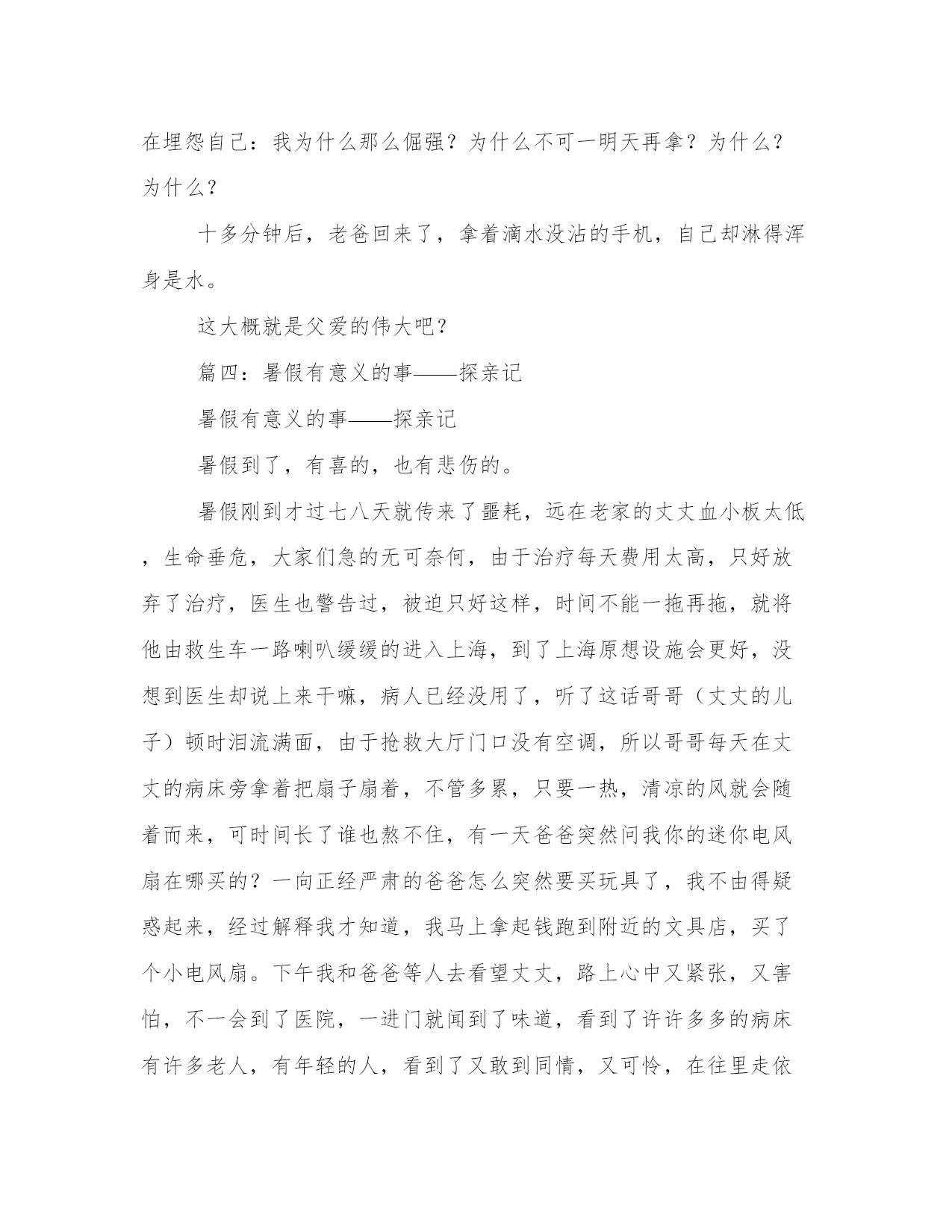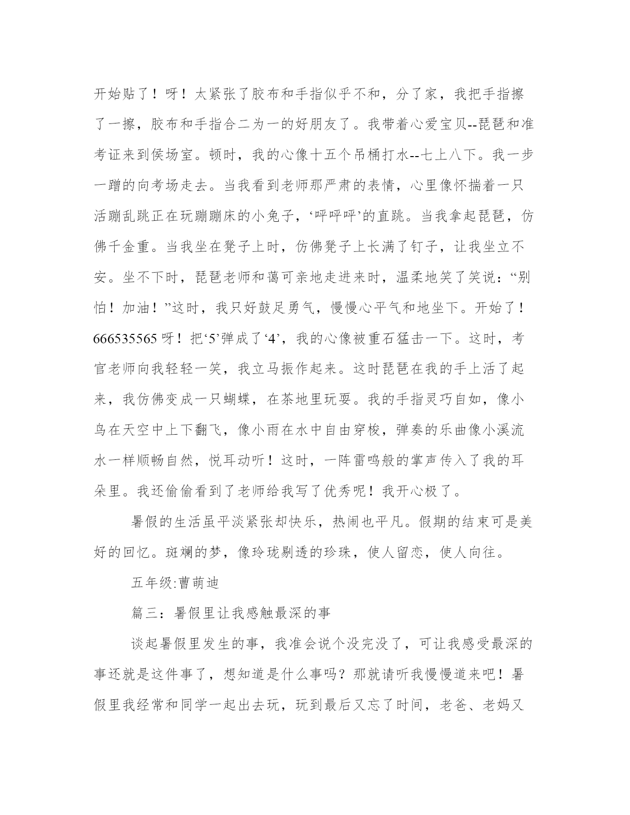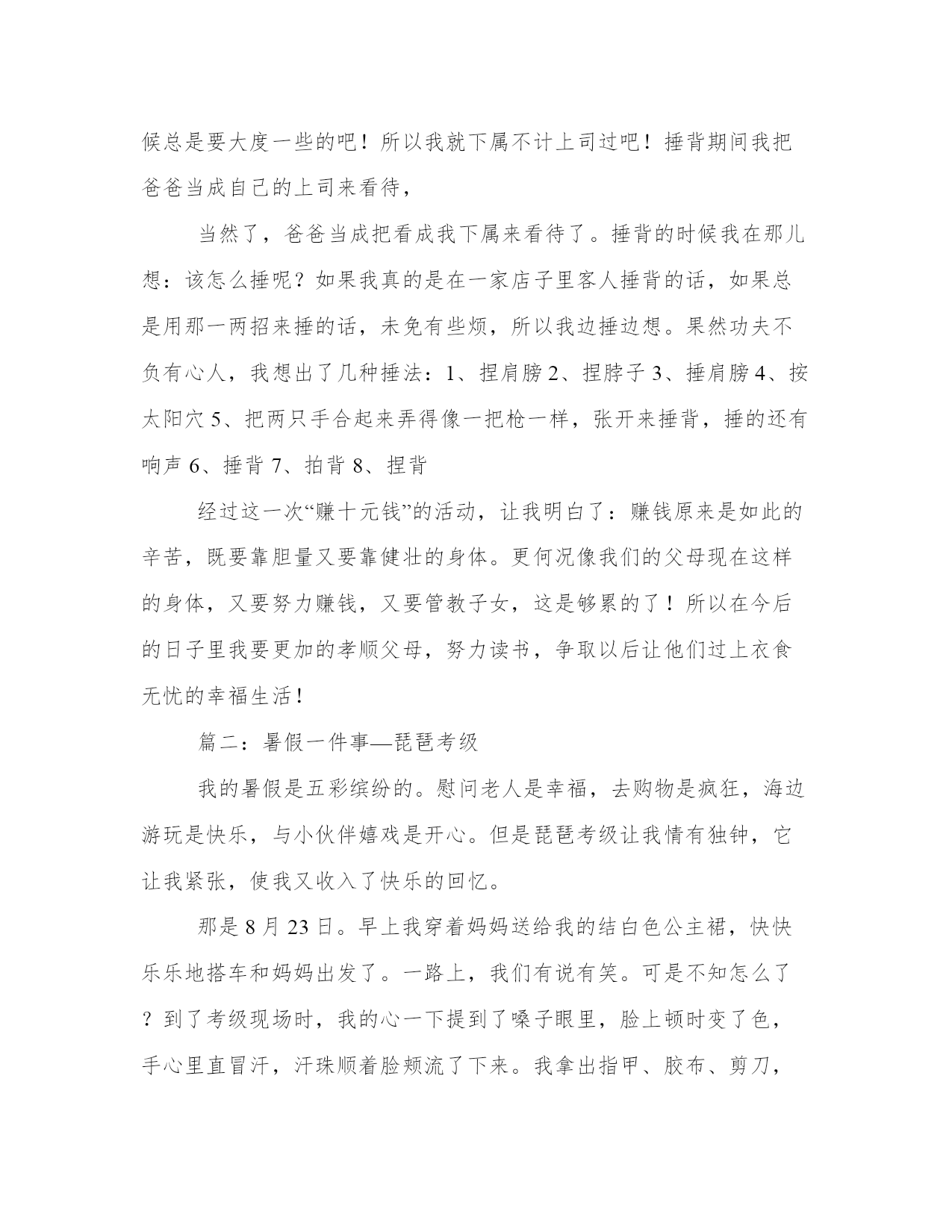 【关于暑假随笔600字大全】关于暑假随笔600字【www.sxqingyun.com--读后感大全】导读:随笔简介,虽然我现在正在读书,但是长大后还是要努力赚钱来赡养父母的。我们每一天的零花钱都是父母给的,现在我们的...如果觉得写得不错,记得转发分享哦!欢迎大家阅读《关于暑假随笔600字》,此文由随笔网小编推荐,大家多多指教!篇一:暑假赚钱有感600字虽然我现在正在读书,但是长大后还是要努力赚钱来赡养父母的。我们每一天的零花钱都是父母给的,现在我们的经济是要依靠父母的,但是到我们长大后就反过来了,因为那时父母已经老了,我们还强劲有力。通过了“赚十元钱”的这一次活动,让我懂得了许许多多的道理,也让我在这一次活动中长大了许多。我是给爸爸捶背赚到的十元钱,虽然这是在自家做的事,但是收获还是不少的。我十元钱,虽然捶的没有那些专业人士捶的好,但是我还是尽了自己最大的努力去做了。刚开始捶的时候以为半个小时很快就过去了,可是我万万没有想到时间竟然过的那么的慢。实话告诉你们吧!其实我还多捶了五分钟呢!刚开始的时候有些不乐意,但是我又想了想:人刚开始做事的时候总是要大度一些的吧!所以我就下属不计上司过吧!捶背期间我把爸爸当成自己的上司来看待,当然了,爸爸当成把看成我下属来看待了。捶背的时候我在那儿想:该怎么捶呢?如果我真的是在一家店子里客人捶背的话,如果总是用那一两招来捶的话,未免有些烦,所以我边捶边想。果然功夫不负有心人,我想出了几种捶法:1、捏肩膀2、捏脖子3、捶肩膀4、按太阳穴5、把两只手合起来弄得像一把枪一样,张开来捶背,捶的还有响声6、捶背7、拍背8、捏背经过这一次“赚十元钱”的活动,让我明白了:赚钱原来是如此的辛苦,既要靠胆量又要靠健壮的身体。更何况像我们的父母现在这样的身体,又要努力赚钱,又要管教子女,这是够累的了!所以在今后的日子里我要更加的孝顺父母,努力读书,争取以后让他们过上衣食无忧的幸福生活!篇二:暑假一件事—琵琶考级我的暑假是五彩缤纷的。慰问老人是幸福,去购物是疯狂,海边游玩是快乐,与小伙伴嬉戏是开心。但是琵琶考级让我情有独钟,它让我紧张,使我又收入了快乐的回忆。那是8月23日。早上我穿着妈妈送给我的结白色公主裙,快快乐乐地搭车和妈妈出发了。一路上,我们有说有笑。可是不知怎么了?到了考级现场时,我的心一下提到了嗓子眼里,脸上顿时变了色,手心里直冒汗,汗珠顺着脸颊流了下来。我拿出指甲、胶布、剪刀,开始贴了!呀!太紧张了胶布和手指似乎不和,分了家,我把手指擦了一擦,胶布和手指合二为一的好朋友了。我带着心爱宝贝--琵琶和准考证来到侯场室。顿时,我的心像十五个吊桶打水--七上八下。我一步一蹭的向考场走去。当我看到老师那严肃的表情,心里像怀揣着一只活蹦乱跳正在玩蹦蹦床的小兔子,‘呯呯呯’的直跳。当我拿起琵琶,仿佛千金重。当我坐在凳子上时,仿佛凳子上长满了钉子,让我坐立不安。坐不下时,琵琶老师和蔼可亲地走进来时,温柔地笑了笑说:“别怕!加油!”这时,我只好鼓足勇气,慢慢心平气和地坐下。开始了!666535565呀!把‘5’弹成了‘4’,我的心像被重石猛击一下。这时,考官老师向我轻轻一笑,我立马振作起来。这时琵琶在我的手上活了起来,我仿佛变成一只蝴蝶,在茶地里玩耍。我的手指灵巧自如,像小鸟在天空中上下翻飞,像小雨在水中自由穿梭,弹奏的乐曲像小溪流水一样顺畅自然,悦耳动听!这时,一阵雷鸣般的掌声传入了我的耳朵里。我还偷偷看到了老师给我写了优秀呢!我开心极了。暑假的生活虽平淡紧张却快乐,热闹也平凡。假期的结束可是美好的回忆。斑斓的梦,像玲珑剔透的珍珠,使人留恋,使人向往。五年级:曹萌迪篇三:暑假里让我感触最深的事谈起暑假里发生的事,我准会说个没完没了,可让我感受最深的事还就是这件事了,想知道是什么事吗?那就请听我慢慢道来吧!暑假里我经常和同学一起出去玩,玩到最后又忘了时间,老爸、老妈又联系不上我,所以每次我回家之前都把他们急得要死,于是,老妈决定给我配一部手机。得知这一消息后,我十分兴奋,老妈正好有个朋友开了一家手机店。老妈带我去逛了逛,我看中了一款,正好也不贵,于是老妈就先带我回去和老爸商量。回到家,我把这件事告诉了老爸,老爸二话没说就答应,真不愧是我老爸,做事就是爽快!第二天,老妈打了个电话过去,谁知那款已经卖完了,他们得去进,两天后才那得到。老妈叫我换一款,可是我特别地倔强,就是要那一款。谁叫我那么倔强呢?那只好耐着性子等喽!时间这时怎么变得那么慢了?真是的!我真实体会到什么叫“度日如年”了!我盼呀盼呀,终于盼到那一天了!老妈说晚上去拿,谁知晚上下起了鱼,而且越下越大,毛毛细雨渐渐地变成了倾盆大雨!怎么办?难道又得等了?他们大人说话应该是驷马难追的,因为这是他们教育我的呀!难道自己、也做不到吗?我虽然知道一定是拿不成了,可是我还是