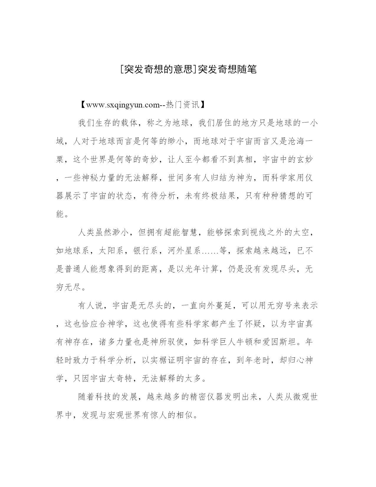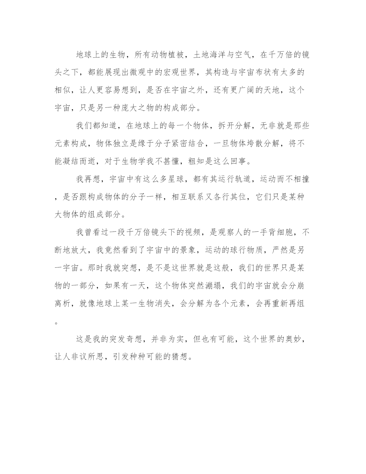 [突发奇想的意思]突发奇想随笔【www.sxqingyun.com--热门资讯】我们生存的载体,称之为地球,我们居住的地方只是地球的一小域,人对于地球而言是何等的缈小,而地球对于宇宙而言又是沧海一粟,这个世界是何等的奇妙,让人至今都看不到真相,宇宙中的玄妙,一些神秘力量的无法解释,世间多有人归结为神为,而科学家用仪器展示了宇宙的状态,有待分析,未有终极结果,只有种种猜想的可能。人类虽然渺小,但拥有超能智慧,能够探索到视线之外的太空,如地球系,太阳系,银行系,河外星系……等,探索越来越远,已不是普通人能想象得到的距离,是以光年计算,仍是没有发现尽头,无穷无尽。有人说,宇宙是无尽头的,一直向外蔓延,可以用无穷号来表示,这也恰应合神学,这也使得有些科学家都产生了怀疑,以为宇宙真有神存在,诸多力量也是神所驭使,如科学巨人牛顿和爱因斯坦。年轻时致力于科学分析,以实椐证明宇宙的存在,到年老时,却归心神学,只因宇宙太奇特,无法解释的太多。随着科技的发展,越来越多的精密仪器发明出来,人类从微观世界中,发现与宏观世界有惊人的相似。地球上的生物,所有动物植被,土地海洋与空气,在千万倍的镜头之下,都能展现出微观中的宏观世界,其构造与宇宙布状有太多的相似,让人更容易想到,是否在宇宙之外,还有更广阔的天地,这个宇宙,只是另一种庞大之物的构成部分。我们都知道,在地球上的每一个物体,拆开分解,无非就是那些元素构成,物体独立是缘于分子紧密结合,一旦物体垮散分解,将不能凝结而逝,对于生物学我不甚懂,粗知是这么回事。我再想,宇宙中有这么多星球,都有其运行轨道,运动而不相撞,是否跟构成物体的分子一样,相互联系又各行其位,它们只是某种大物体的组成部分。我曾看过一段千万倍镜头下的视频,是观察人的一手背细胞,不断地放大,我竟然看到了宇宙中的景象,运动的球行物质,严然是另一宇宙。那时我就突想,是不是这世界就是这般,我们的世界只是某物的一部分,如果有一天,这个物体突然漰塌,我们的宇宙就会分崩离析,就像地球上某一生物消失,会分解为各个元素,会再重新再组。这是我的突发奇想,并非为实,但也有可能,这个世界的奥妙,让人非议所思,引发种种可能的猜想。