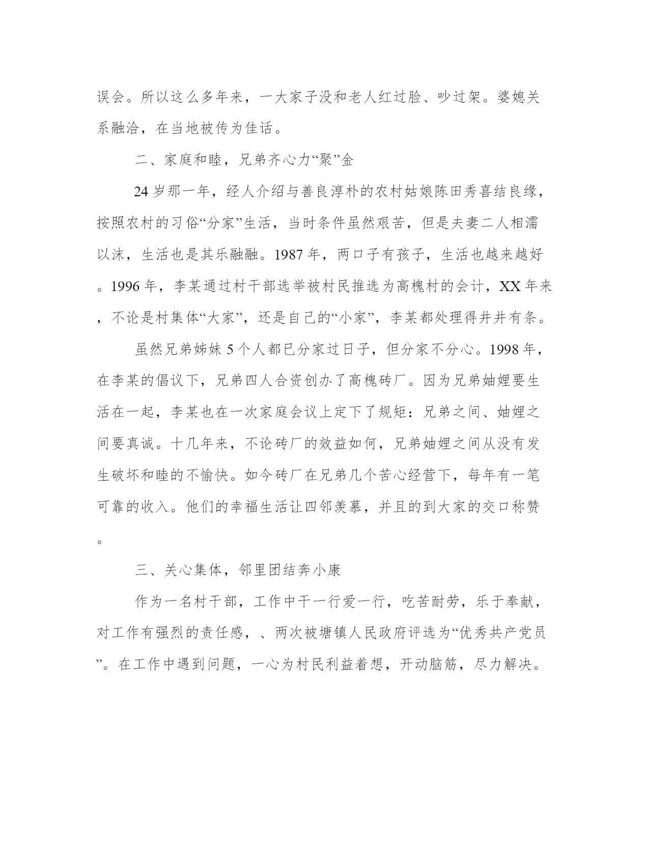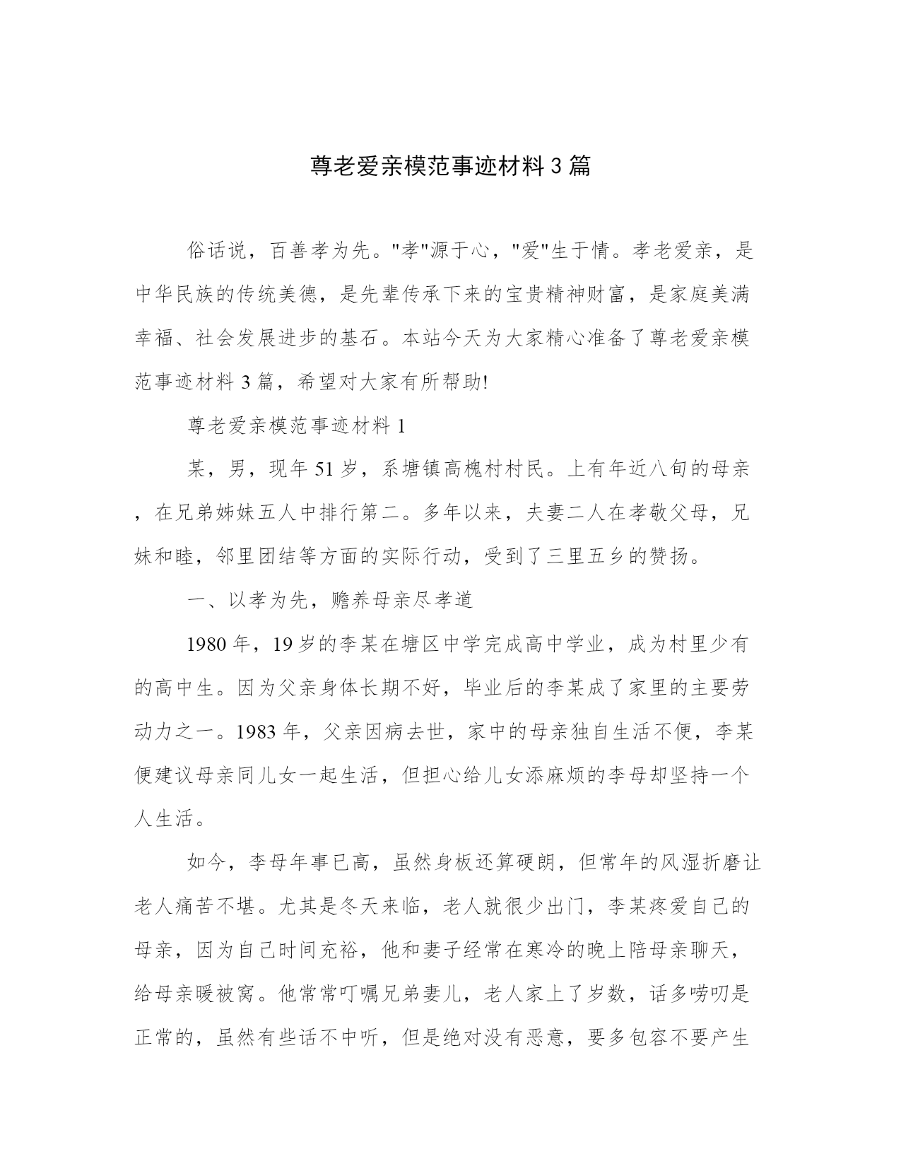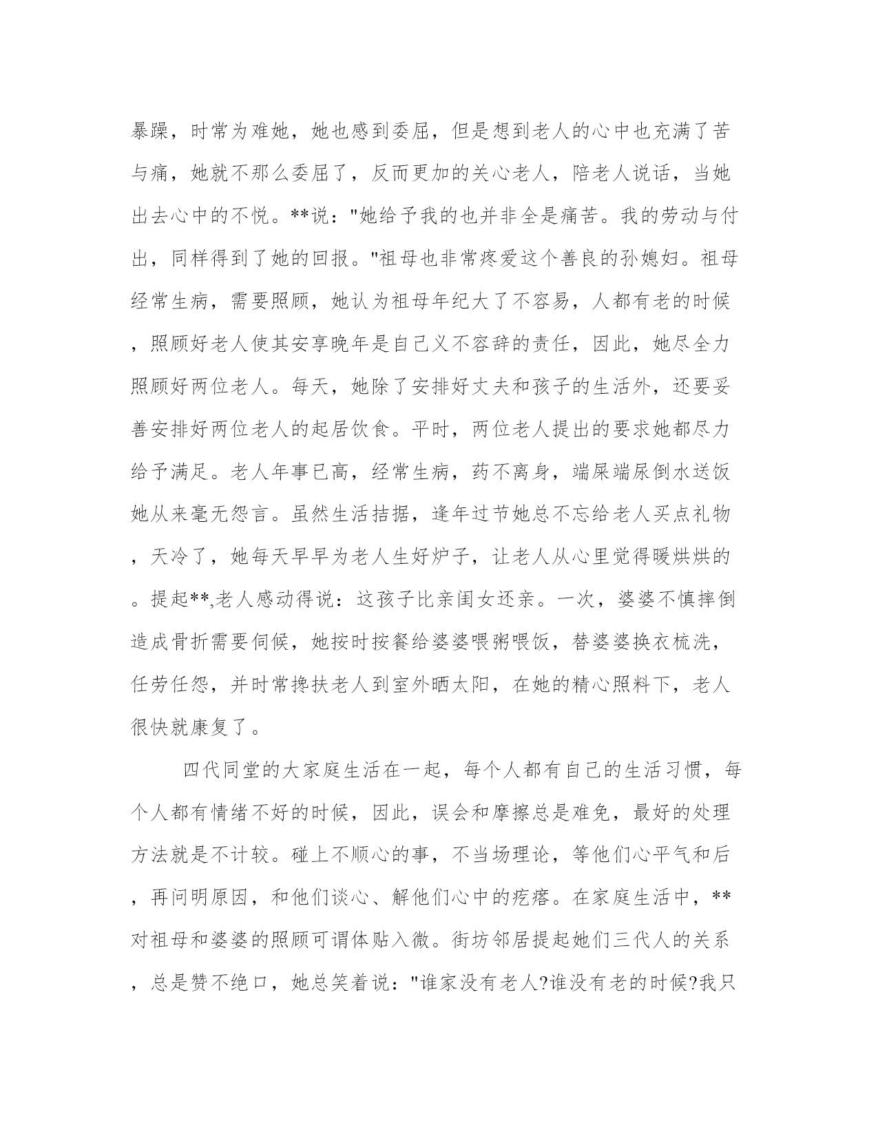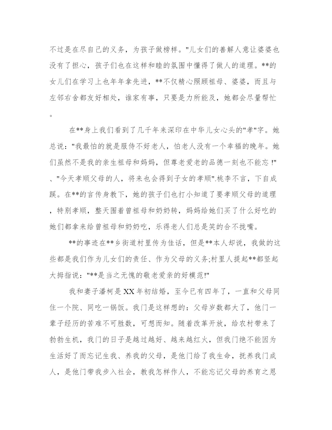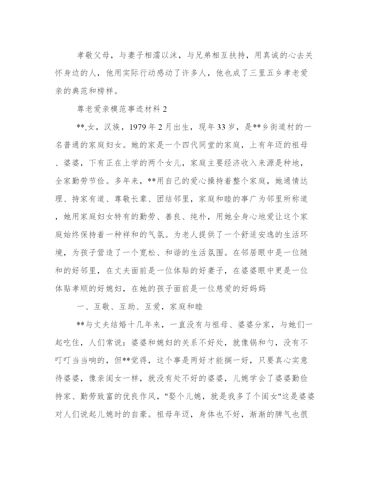 尊老爱亲模范事迹材料3篇俗话说,百善孝为先。"孝"源于心,"爱"生于情。孝老爱亲,是中华民族的传统美德,是先辈传承下来的宝贵精神财富,是家庭美满幸福、社会发展进步的基石。本站今天为大家精心准备了尊老爱亲模范事迹材料3篇,希望对大家有所帮助!尊老爱亲模范事迹材料1某,男,现年51岁,系塘镇高槐村村民。上有年近八旬的母亲,在兄弟姊妹五人中排行第二。多年以来,夫妻二人在孝敬父母,兄妹和睦,邻里团结等方面的实际行动,受到了三里五乡的赞扬。一、以孝为先,赡养母亲尽孝道1980年,19岁的李某在塘区中学完成高中学业,成为村里少有的高中生。因为父亲身体长期不好,毕业后的李某成了家里的主要劳动力之一。1983年,父亲因病去世,家中的母亲独自生活不便,李某便建议母亲同儿女一起生活,但担心给儿女添麻烦的李母却坚持一个人生活。如今,李母年事已高,虽然身板还算硬朗,但常年的风湿折磨让老人痛苦不堪。尤其是冬天来临,老人就很少出门,李某疼爱自己的母亲,因为自己时间充裕,他和妻子经常在寒冷的晚上陪母亲聊天,给母亲暖被窝。他常常叮嘱兄弟妻儿,老人家上了岁数,话多唠叨是正常的,虽然有些话不中听,但是绝对没有恶意,要多包容不要产生误会。所以这么多年来,一大家子没和老人红过脸、吵过架。婆媳关系融洽,在当地被传为佳话。二、家庭和睦,兄弟齐心力“聚”金24岁那一年,经人介绍与善良淳朴的农村姑娘陈田秀喜结良缘,按照农村的习俗“分家”生活,当时条件虽然艰苦,但是夫妻二人相濡以沫,生活也是其乐融融。1987年,两口子有孩子,生活也越来越好。1996年,李某通过村干部选举被村民推选为高槐村的会计,XX年来,不论是村集体“大家”,还是自己的“小家”,李某都处理得井井有条。虽然兄弟姊妹5个人都已分家过日子,但分家不分心。1998年,在李某的倡议下,兄弟四人合资创办了高槐砖厂。因为兄弟妯娌要生活在一起,李某也在一次家庭会议上定下了规矩:兄弟之间、妯娌之间要真诚。十几年来,不论砖厂的效益如何,兄弟妯娌之间从没有发生破坏和睦的不愉快。如今砖厂在兄弟几个苦心经营下,每年有一笔可靠的收入。他们的幸福生活让四邻羡慕,并且的到大家的交口称赞。三、关心集体,邻里团结奔小康作为一名村干部,工作中干一行爱一行,吃苦耐劳,乐于奉献,对工作有强烈的责任感,、两次被塘镇人民政府评选为“优秀共产党员”。在工作中遇到问题,一心为村民利益着想,开动脑筋,尽力解决。孝敬父母,与妻子相濡以沫,与兄弟相互扶持,用真诚的心去关怀身边的人,他用实际行动感动了许多人,他也成了三里五乡孝老爱亲的典范和榜样。尊老爱亲模范事迹材料2**,女,汉族,1979年2月出生,现年33岁,是**乡街道村的一名普通的家庭妇女。她的家是一个四代同堂的家庭,上有年迈的祖母、婆婆,下有正在上学的两个女儿,家庭主要经济收入来源是种地,全家勤劳节俭。多年来,**用自己的爱心操持着整个家庭,她通情达理、持家有道、尊敬长辈、团结邻里,家庭和睦的事广为邻里所称道,她用家庭妇女特有的勤劳、善良、纯朴,用她全身心地爱让这个家庭始终保持着一种祥和的气氛。为老人提供了一个舒适安逸的生活环境,为孩子营造了一个宽松、和谐的生活氛围。在邻居眼中是一位随和的好邻里,在丈夫面前是一位体贴的好妻子,在婆婆眼中更是一位体贴孝顺的好媳妇,在她的孩子面前是一位慈爱的好妈妈一、互敬、互助、互爱,家庭和睦**与丈夫结婚十几年来,一直没有与祖母、婆婆分家,与她们一起吃住,人们常说:婆婆和媳妇的关系不好处,就像锅和勺,没有不叮叮当当响的,但**觉得,这个事是两好才能搁一好,只要真心实意待婆婆,像亲闺女一样,就没有处不好的婆婆,儿媳学会了婆婆勤俭持家、勤劳致富的优良作风,"娶个儿媳,就是我多了个闺女"这是婆婆对人们说起儿媳时的自豪。祖母年迈,身体也不好,渐渐的脾气也很暴躁,时常为难她,她也感到委屈,但是想到老人的心中也充满了苦与痛,她就不那么委屈了,反而更加的关心老人,陪老人说话,当她出去心中的不悦。**说:"她给予我的也并非全是痛苦。我的劳动与付出,同样得到了她的回报。"祖母也非常疼爱这个善良的孙媳妇。祖母经常生病,需要照顾,她认为祖母年纪大了不容易,人都有老的时候,照顾好老人使其安享晚年是自己义不容辞的责任,因此,她尽全力照顾好两位老人。每天,她除了安排好丈夫和孩子的生活外,还要妥善安排好两位老人的起居饮食。平时,两位老人提出的要求她都尽力给予满足。老人年事已高,经常生病,药不离身,端屎端尿倒水送饭她从来毫无怨言。虽然生活拮据,逢年过节她总不忘给老人买点礼物,天冷了,她每天早早为老人生好炉子,让老人从心里觉得暖烘烘的。提起**,老人感动得说:这孩子比亲闺女还亲。一次,婆婆不慎摔倒造成骨折需要伺候,她按时按餐给婆婆喂粥喂饭,替婆婆换衣梳洗,任劳任怨,并时常搀扶老人到室外晒太阳,在她的精心照