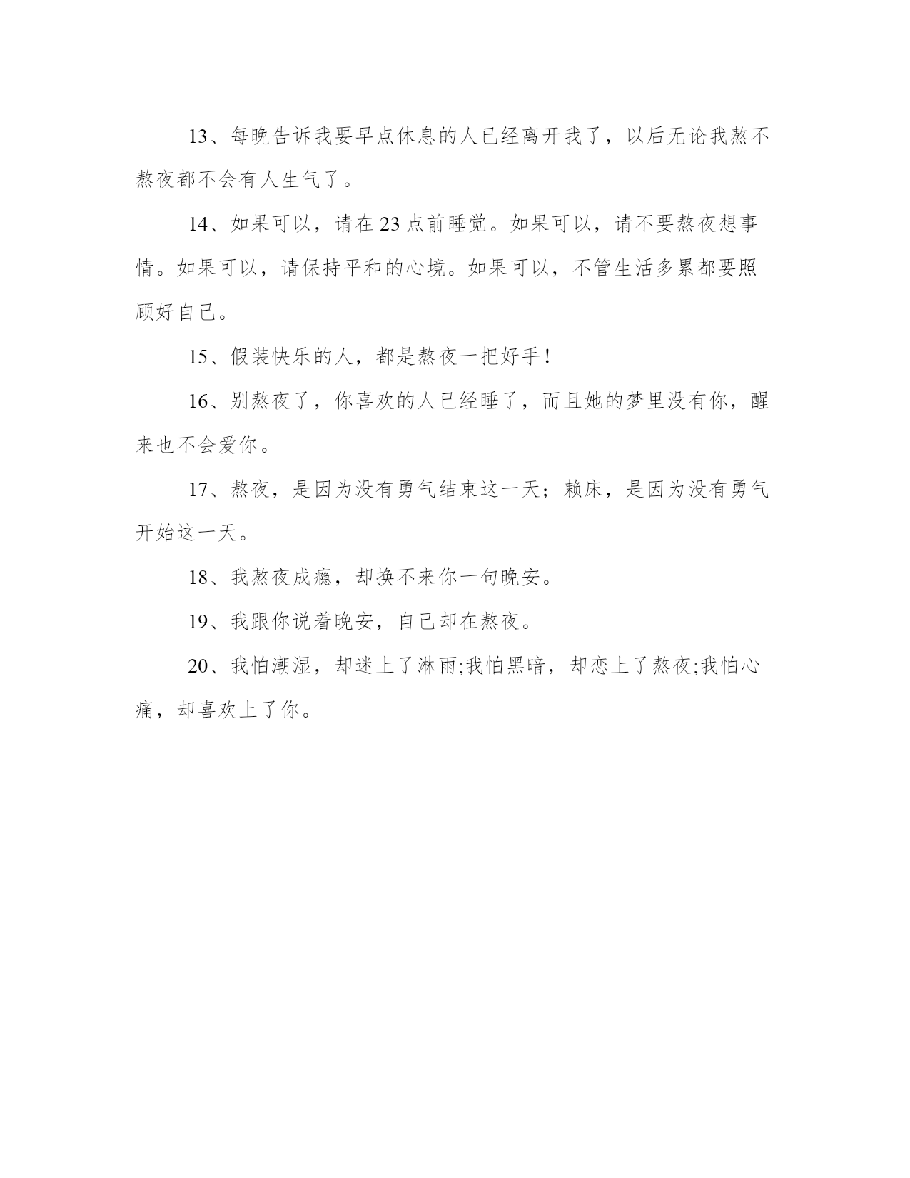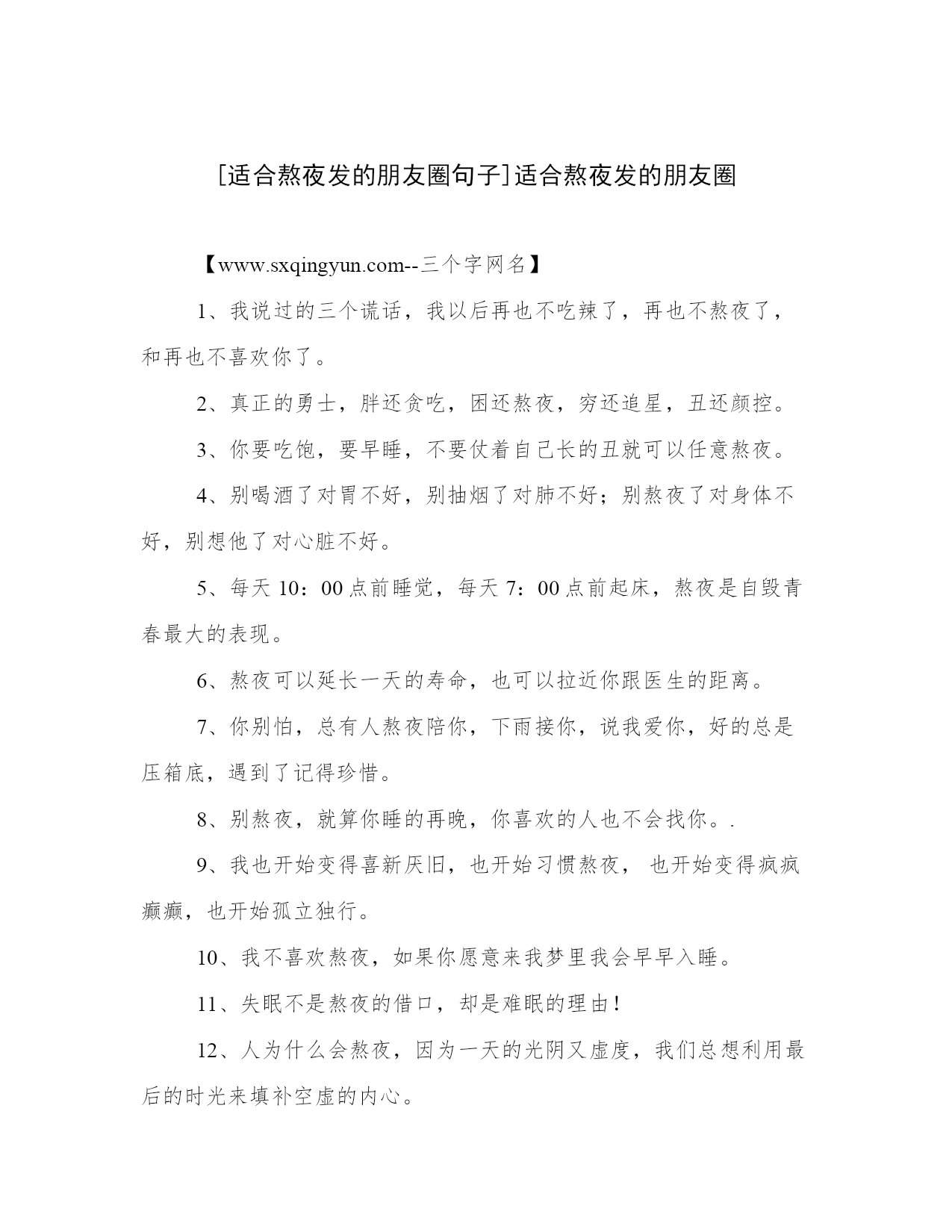 [适合熬夜发的朋友圈句子]适合熬夜发的朋友圈【www.sxqingyun.com--三个字网名】1、我说过的三个谎话,我以后再也不吃辣了,再也不熬夜了,和再也不喜欢你了。2、真正的勇士,胖还贪吃,困还熬夜,穷还追星,丑还颜控。3、你要吃饱,要早睡,不要仗着自己长的丑就可以任意熬夜。4、别喝酒了对胃不好,别抽烟了对肺不好;别熬夜了对身体不好,别想他了对心脏不好。5、每天10:00点前睡觉,每天7:00点前起床,熬夜是自毁青春最大的表现。6、熬夜可以延长一天的寿命,也可以拉近你跟医生的距离。7、你别怕,总有人熬夜陪你,下雨接你,说我爱你,好的总是压箱底,遇到了记得珍惜。8、别熬夜,就算你睡的再晚,你喜欢的人也不会找你。.9、我也开始变得喜新厌旧,也开始习惯熬夜,也开始变得疯疯癫癫,也开始孤立独行。10、我不喜欢熬夜,如果你愿意来我梦里我会早早入睡。11、失眠不是熬夜的借口,却是难眠的理由!12、人为什么会熬夜,因为一天的光阴又虚度,我们总想利用最后的时光来填补空虚的内心。13、每晚告诉我要早点休息的人已经离开我了,以后无论我熬不熬夜都不会有人生气了。14、如果可以,请在23点前睡觉。如果可以,请不要熬夜想事情。如果可以,请保持平和的心境。如果可以,不管生活多累都要照顾好自己。15、假装快乐的人,都是熬夜一把好手!16、别熬夜了,你喜欢的人已经睡了,而且她的梦里没有你,醒来也不会爱你。17、熬夜,是因为没有勇气结束这一天;赖床,是因为没有勇气开始这一天。18、我熬夜成瘾,却换不来你一句晚安。19、我跟你说着晚安,自己却在熬夜。20、我怕潮湿,却迷上了淋雨;我怕黑暗,却恋上了熬夜;我怕心痛,却喜欢上了你。