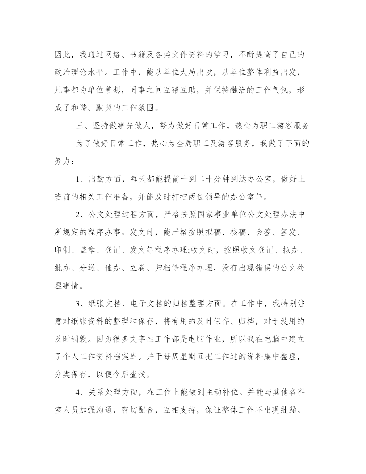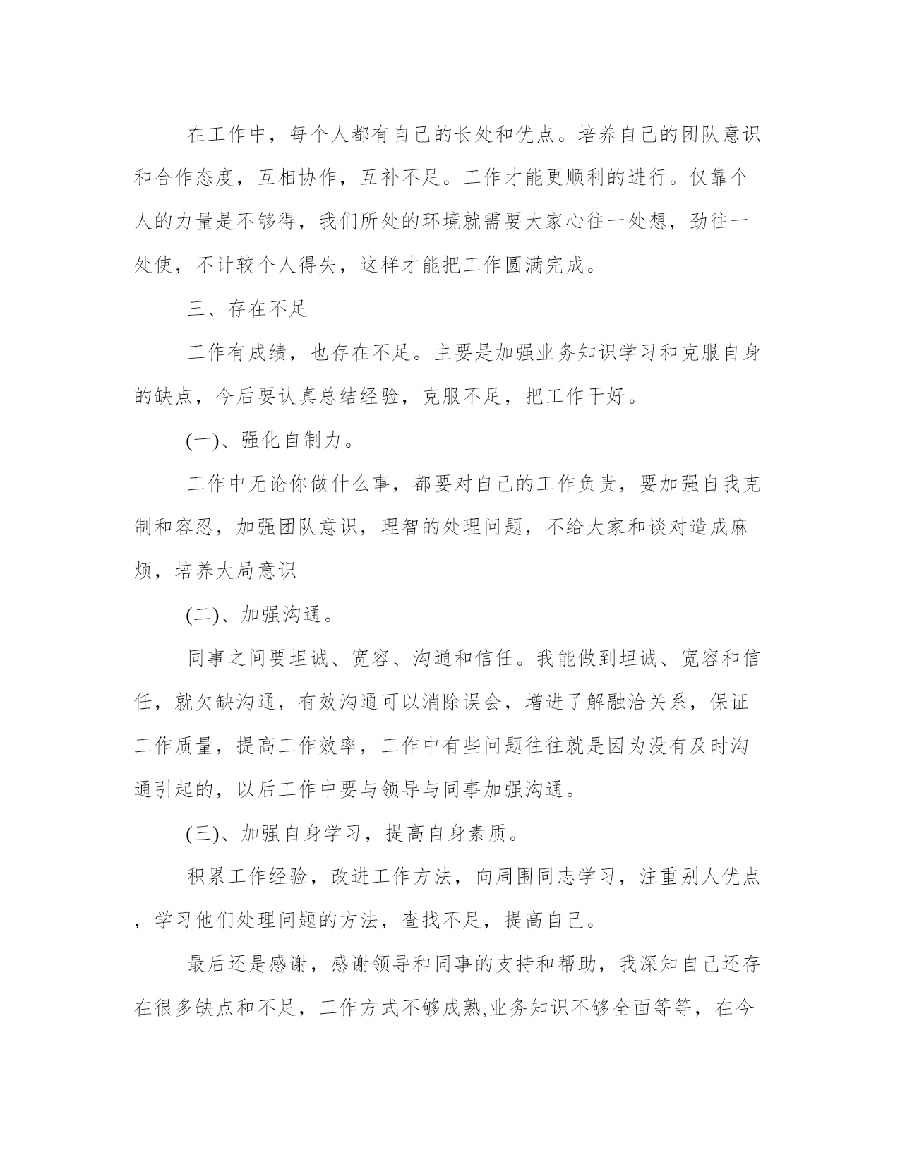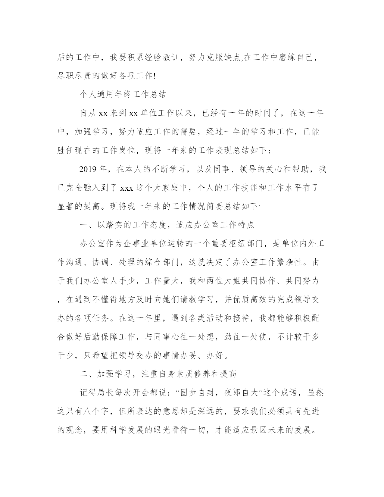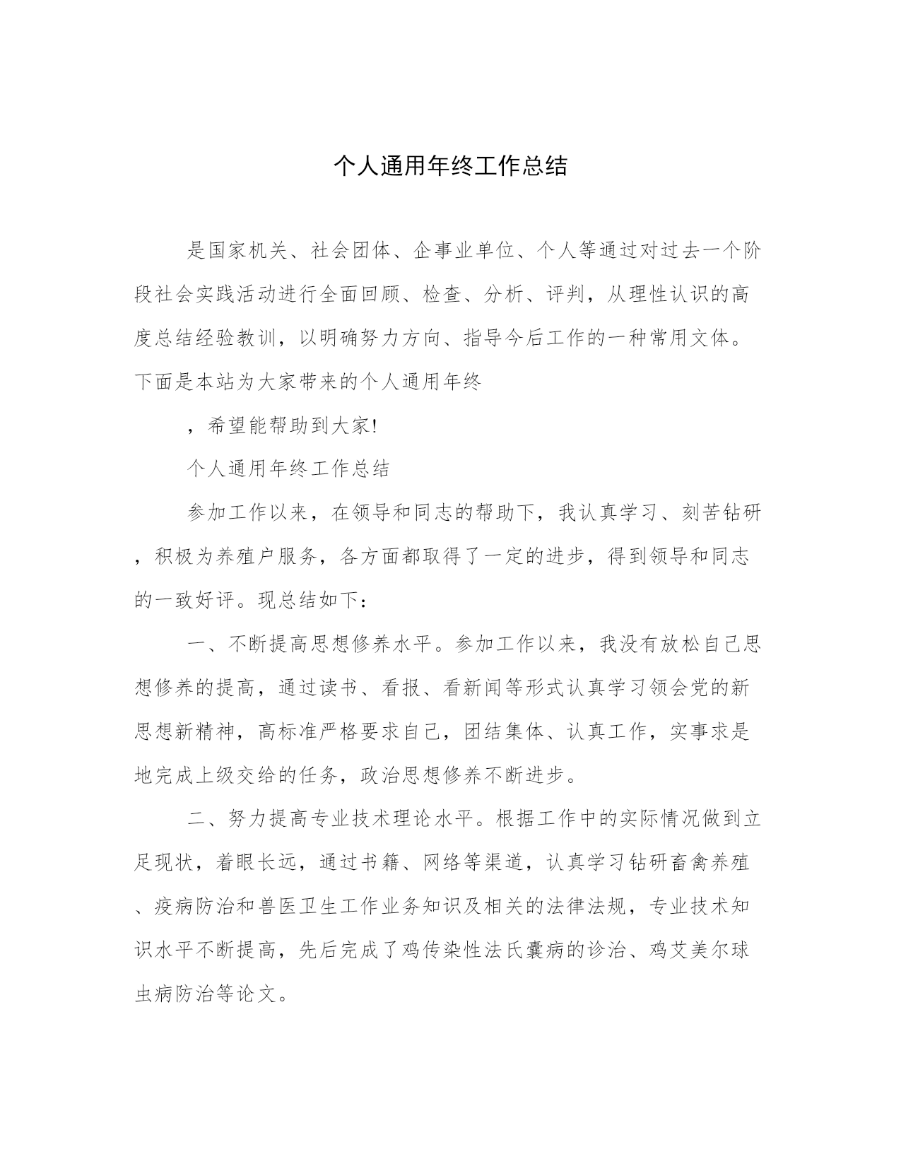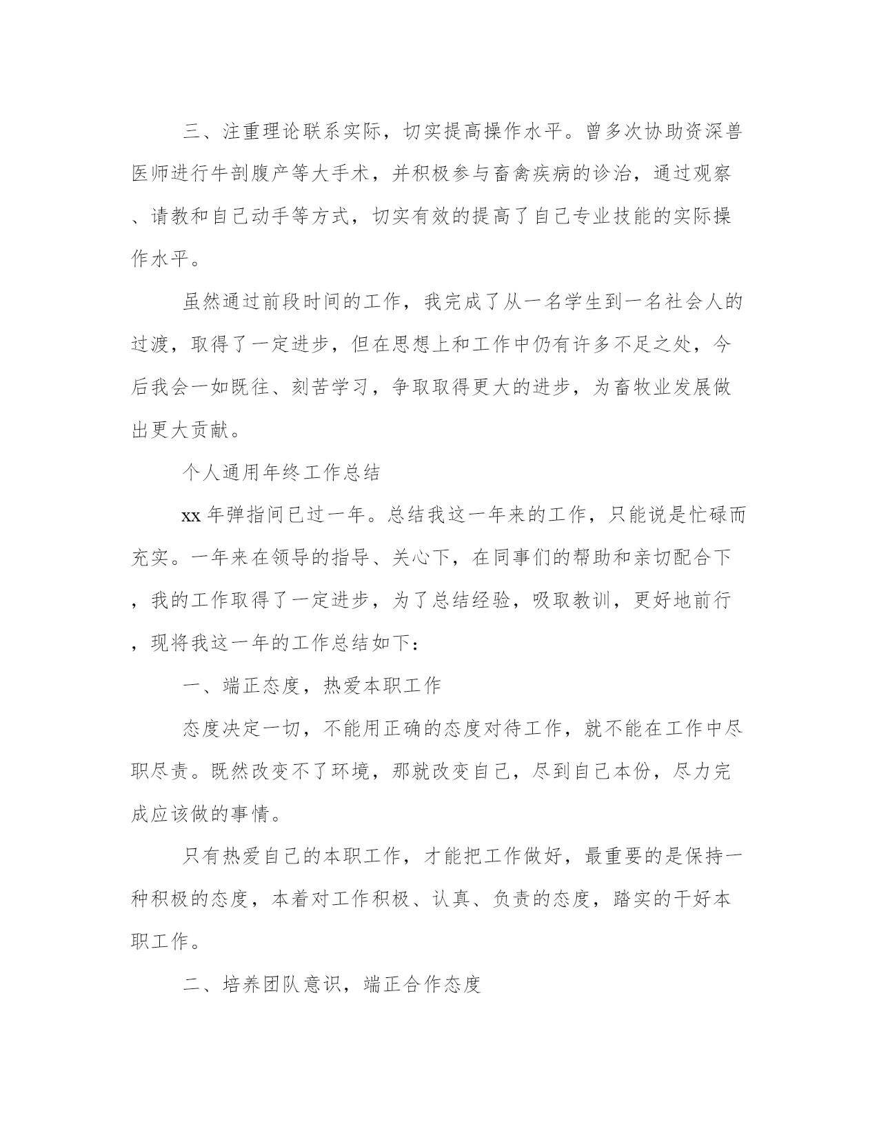个人通用年终工作总结是国家机关、社会团体、企事业单位、个人等通过对过去一个阶段社会实践活动进行全面回顾、检查、分析、评判,从理性认识的高度总结经验教训,以明确努力方向、指导今后工作的一种常用文体。下面是本站为大家带来的个人通用年终,希望能帮助到大家!个人通用年终工作总结参加工作以来,在领导和同志的帮助下,我认真学习、刻苦钻研,积极为养殖户服务,各方面都取得了一定的进步,得到领导和同志的一致好评。现总结如下:一、不断提高思想修养水平。参加工作以来,我没有放松自己思想修养的提高,通过读书、看报、看新闻等形式认真学习领会党的新思想新精神,高标准严格要求自己,团结集体、认真工作,实事求是地完成上级交给的任务,政治思想修养不断进步。二、努力提高专业技术理论水平。根据工作中的实际情况做到立足现状,着眼长远,通过书籍、网络等渠道,认真学习钻研畜禽养殖、疫病防治和兽医卫生工作业务知识及相关的法律法规,专业技术知识水平不断提高,先后完成了鸡传染性法氏囊病的诊治、鸡艾美尔球虫病防治等论文。三、注重理论联系实际,切实提高操作水平。曾多次协助资深兽医师进行牛剖腹产等大手术,并积极参与畜禽疾病的诊治,通过观察、请教和自己动手等方式,切实有效的提高了自己专业技能的实际操作水平。虽然通过前段时间的工作,我完成了从一名学生到一名社会人的过渡,取得了一定进步,但在思想上和工作中仍有许多不足之处,今后我会一如既往、刻苦学习,争取取得更大的进步,为畜牧业发展做出更大贡献。个人通用年终工作总结xx年弹指间已过一年。总结我这一年来的工作,只能说是忙碌而充实。一年来在领导的指导、关心下,在同事们的帮助和亲切配合下,我的工作取得了一定进步,为了总结经验,吸取教训,更好地前行,现将我这一年的工作总结如下:一、端正态度,热爱本职工作态度决定一切,不能用正确的态度对待工作,就不能在工作中尽职尽责。既然改变不了环境,那就改变自己,尽到自己本份,尽力完成应该做的事情。只有热爱自己的本职工作,才能把工作做好,最重要的是保持一种积极的态度,本着对工作积极、认真、负责的态度,踏实的干好本职工作。二、培养团队意识,端正合作态度在工作中,每个人都有自己的长处和优点。培养自己的团队意识和合作态度,互相协作,互补不足。工作才能更顺利的进行。仅靠个人的力量是不够得,我们所处的环境就需要大家心往一处想,劲往一处使,不计较个人得失,这样才能把工作圆满完成。三、存在不足工作有成绩,也存在不足。主要是加强业务知识学习和克服自身的缺点,今后要认真总结经验,克服不足,把工作干好。(一)、强化自制力。工作中无论你做什么事,都要对自己的工作负责,要加强自我克制和容忍,加强团队意识,理智的处理问题,不给大家和谈对造成麻烦,培养大局意识(二)、加强沟通。同事之间要坦诚、宽容、沟通和信任。我能做到坦诚、宽容和信任,就欠缺沟通,有效沟通可以消除误会,增进了解融洽关系,保证工作质量,提高工作效率,工作中有些问题往往就是因为没有及时沟通引起的,以后工作中要与领导与同事加强沟通。(三)、加强自身学习,提高自身素质。积累工作经验,改进工作方法,向周围同志学习,注重别人优点,学习他们处理问题的方法,查找不足,提高自己。最后还是感谢,感谢领导和同事的支持和帮助,我深知自己还存在很多缺点和不足,工作方式不够成熟,业务知识不够全面等等,在今后的工作中,我要积累经验教训,努力克服缺点,在工作中磨练自己,尽职尽责的做好各项工作!个人通用年终工作总结自从xx来到xx单位工作以来,已经有一年的时间了,在这一年中,加强学习,努力适应工作的需要,经过一年的学习和工作,已能胜任现在的工作岗位,现将一年来的工作表现总结如下:2019年,在本人的不断学习,以及同事、领导的关心和帮助,我已完全融入到了xxx这个大家庭中,个人的工作技能和工作水平有了显著的提高。现将我一年来的工作情况简要总结如下:一、以踏实的工作态度,适应办公室工作特点办公室作为企事业单位运转的一个重要枢纽部门,是单位内外工作沟通、协调、处理的综合部门,这就决定了办公室工作繁杂性。由于我们办公室人手少,工作量大,我和两位大姐共同协作、共同努力,在遇到不懂得地方及时向她们请教学习,并优质高效的完成领导交办的各项任务。在这一年里,遇到各类活动和接待,我都能够积极配合做好后勤保障工作,与同事心往一处想,劲往一处使,不计较干多干少,只希望把领导交办的事情办妥、办好。二、加强学习,注重自身素质修养和提高记得局长每次开会都说:“固步自封,夜郎自大”这个成语,虽然这只有八个字,但所表达的意思却是深远的,要求我们必须具有先进的观念,要用科学发展的眼光看待一切,才能适应景区未来的发展。因此,我通过网络、书籍及各类文件资料的学习,不断提高了自己的政治理论水平。工作中,能从单位大局出发,从单位整体利益出发,凡事都