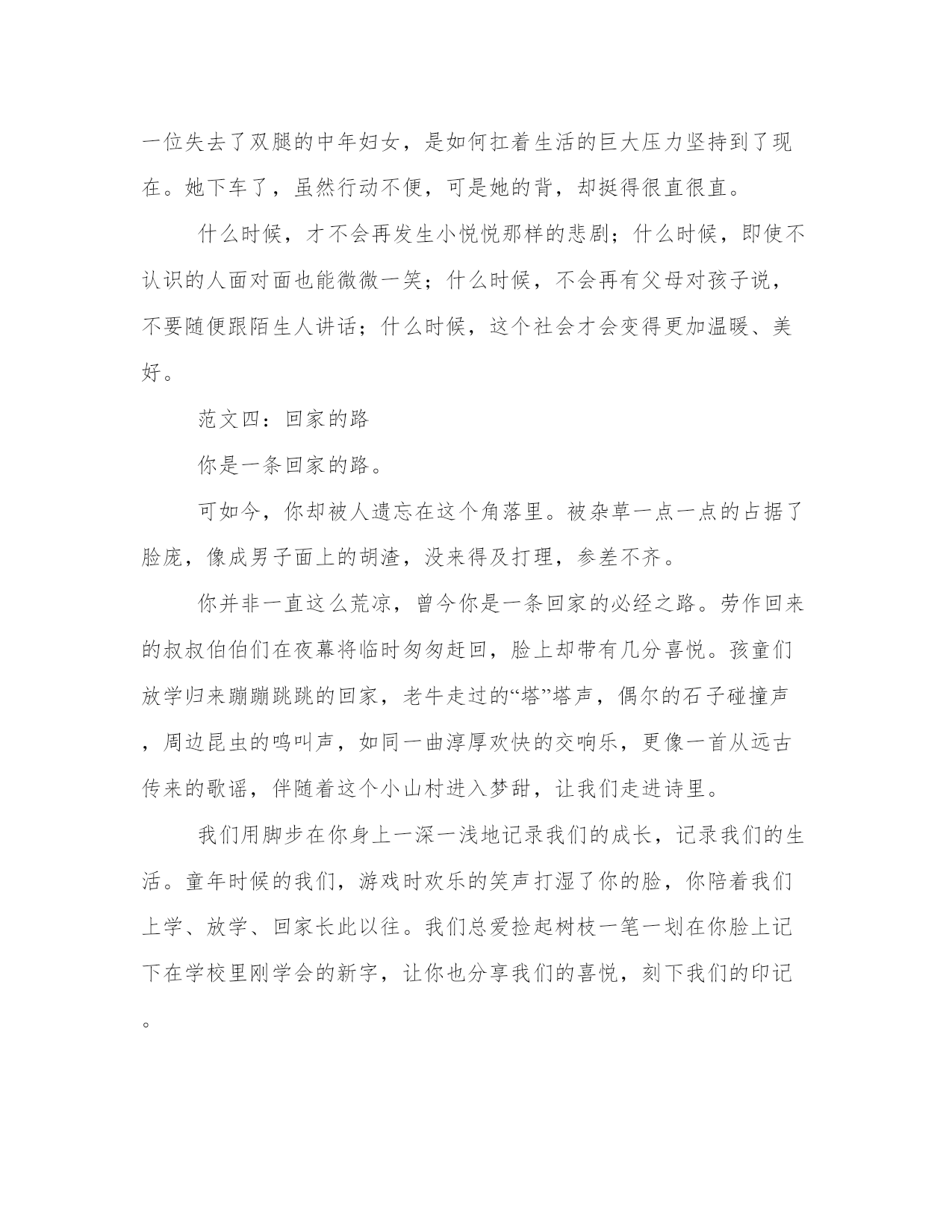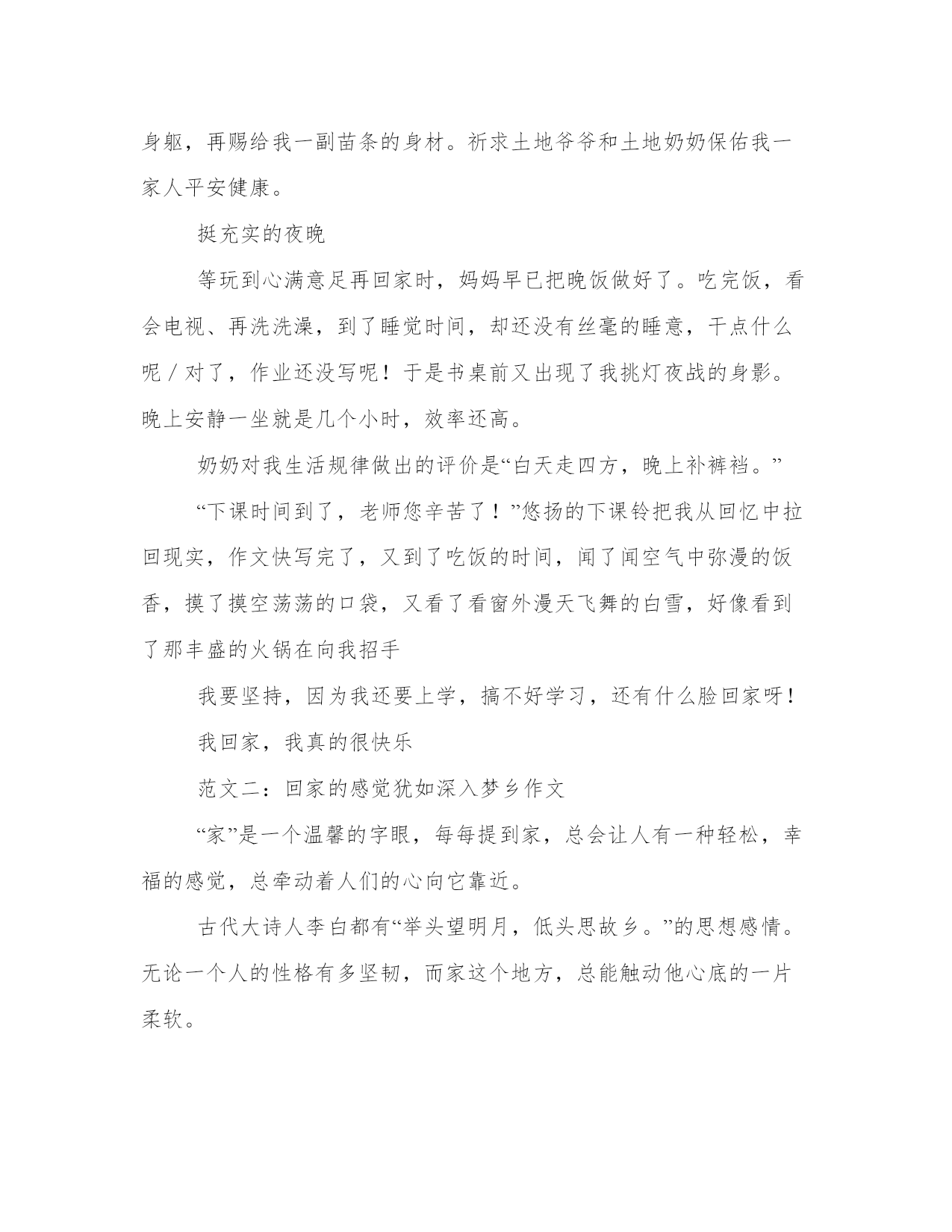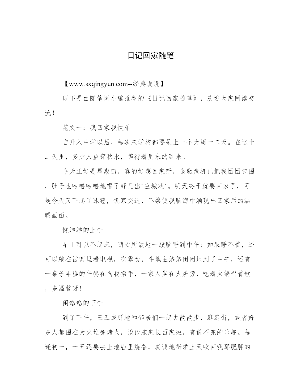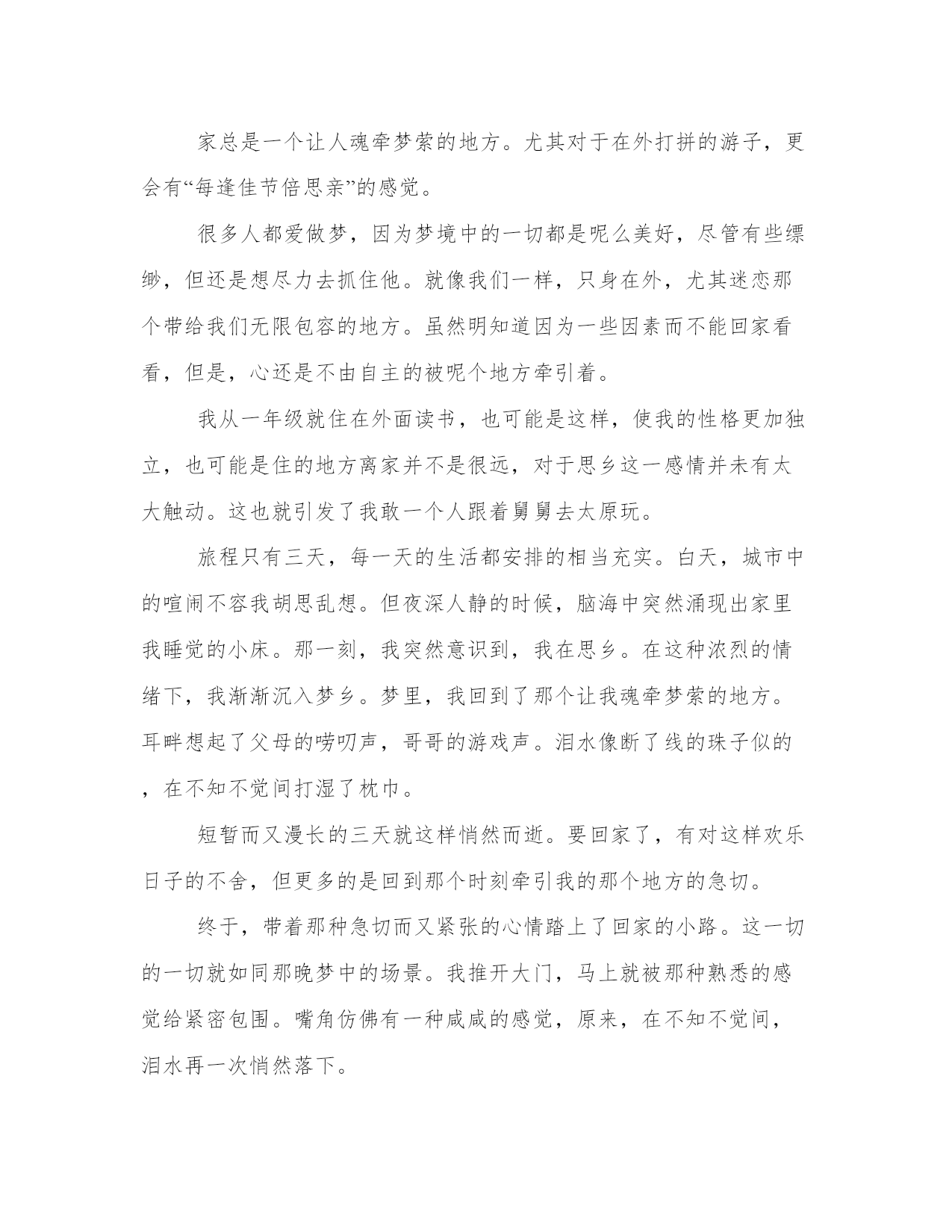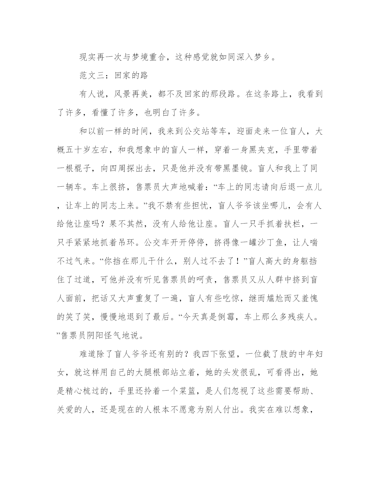 日记回家随笔【www.sxqingyun.com--经典说说】以下是由随笔网小编推荐的《日记回家随笔》,欢迎大家阅读交流!范文一:我回家我快乐自升入中学以后,每次来学校都要呆上一个大周十二天。在这十二天里,多少人望穿秋水,等待着周末的到来。今天正好是星期四,真的好想回家呀,金融危机已把我团团包围,肚子也咕噜咕噜地唱了好几出“空城戏”。明天终于就要回家了,可是今天又下起了冰雹,饥寒交迫,不禁使我脑海中涌现出回家后的温暖画面。懒洋洋的上午早上可以不起床,随心所欲地一股脑睡到中午;如果睡不着,还可以躺在被窝里看电视,吃零食,斗地主悠悠闲闲地到了中午,还有一桌子丰盛的午餐在向我招手,一家人坐在火炉旁,吃着火锅唱着歌,多温馨呀!闲悠悠的下午到了下午,三五成群地和邻居们一起去散散步,逛逛街,或者好多人都围在大火堆旁烤火,谈谈东家长西家短,有说不完的乐趣。每逢初一,十五还要去土地庙里烧香,真诚地祈求上天收回我那肥胖的身躯,再赐给我一副苗条的身材。祈求土地爷爷和土地奶奶保佑我一家人平安健康。挺充实的夜晚等玩到心满意足再回家时,妈妈早已把晚饭做好了。吃完饭,看会电视、再洗洗澡,到了睡觉时间,却还没有丝毫的睡意,干点什么呢/对了,作业还没写呢!于是书桌前又出现了我挑灯夜战的身影。晚上安静一坐就是几个小时,效率还高。奶奶对我生活规律做出的评价是“白天走四方,晚上补裤裆。”“下课时间到了,老师您辛苦了!”悠扬的下课铃把我从回忆中拉回现实,作文快写完了,又到了吃饭的时间,闻了闻空气中弥漫的饭香,摸了摸空荡荡的口袋,又看了看窗外漫天飞舞的白雪,好像看到了那丰盛的火锅在向我招手我要坚持,因为我还要上学,搞不好学习,还有什么脸回家呀!我回家,我真的很快乐范文二:回家的感觉犹如深入梦乡作文“家”是一个温馨的字眼,每每提到家,总会让人有一种轻松,幸福的感觉,总牵动着人们的心向它靠近。古代大诗人李白都有“举头望明月,低头思故乡。”的思想感情。无论一个人的性格有多坚韧,而家这个地方,总能触动他心底的一片柔软。家总是一个让人魂牵梦萦的地方。尤其对于在外打拼的游子,更会有“每逢佳节倍思亲”的感觉。很多人都爱做梦,因为梦境中的一切都是呢么美好,尽管有些缥缈,但还是想尽力去抓住他。就像我们一样,只身在外,尤其迷恋那个带给我们无限包容的地方。虽然明知道因为一些因素而不能回家看看,但是,心还是不由自主的被呢个地方牵引着。我从一年级就住在外面读书,也可能是这样,使我的性格更加独立,也可能是住的地方离家并不是很远,对于思乡这一感情并未有太大触动。这也就引发了我敢一个人跟着舅舅去太原玩。旅程只有三天,每一天的生活都安排的相当充实。白天,城市中的喧闹不容我胡思乱想。但夜深人静的时候,脑海中突然涌现出家里我睡觉的小床。那一刻,我突然意识到,我在思乡。在这种浓烈的情绪下,我渐渐沉入梦乡。梦里,我回到了那个让我魂牵梦萦的地方。耳畔想起了父母的唠叨声,哥哥的游戏声。泪水像断了线的珠子似的,在不知不觉间打湿了枕巾。短暂而又漫长的三天就这样悄然而逝。要回家了,有对这样欢乐日子的不舍,但更多的是回到那个时刻牵引我的那个地方的急切。终于,带着那种急切而又紧张的心情踏上了回家的小路。这一切的一切就如同那晚梦中的场景。我推开大门,马上就被那种熟悉的感觉给紧密包围。嘴角仿佛有一种咸咸的感觉,原来,在不知不觉间,泪水再一次悄然落下。现实再一次与梦境重合,这种感觉就如同深入梦乡。范文三:回家的路有人说,风景再美,都不及回家的那段路。在这条路上,我看到了许多,看懂了许多,也明白了许多。和以前一样的时间,我来到公交站等车,迎面走来一位盲人,大概五十岁左右,和我想象中的盲人一样,穿着一身黑夹克,手里带着一根棍子,向四周探出去,只是他并没有带黑墨镜。盲人和我上了同一辆车。车上很挤,售票员大声地喊着:“车上的同志请向后退一点儿,让车上的同志上来。”我不禁有些担忧,盲人爷爷该坐哪儿,会有人给他让座吗?果不其然,没有人给他让座。盲人一只手抓着扶栏,一只手紧紧地抓着吊环。公交车开开停停,挤得像一罐沙丁鱼,让人喘不过气来。“你挡在那儿干什么,别人过不去了!”盲人高大的身躯挡住了过道,可他并没有听见售票员的呵责,售票员又从人群中挤到盲人面前,把话又大声重复了一遍,盲人有些吃惊,继而尴尬而又羞愧的笑了笑,慢慢地退到了最后。“今天真是倒霉,车上那么多残疾人。”售票员阴阳怪气地说。难道除了盲人爷爷还有别的?我四下张望,一位截了肢的中年妇女,就这样用自己的大腿根部站立着,她的头发很乱,可看得出,她是精心梳过的,手里还拎着一个菜篮,是人们忽视了这些需要帮助、关爱的人,还是现在的人根本不愿意为别人付出。我实在难以想象,一位失去了双腿的中年妇女,是如何扛着生活的巨大压力坚持到了现在。她下车了,虽然行动不便,可是她的背,却挺得很直很直。什么时候,