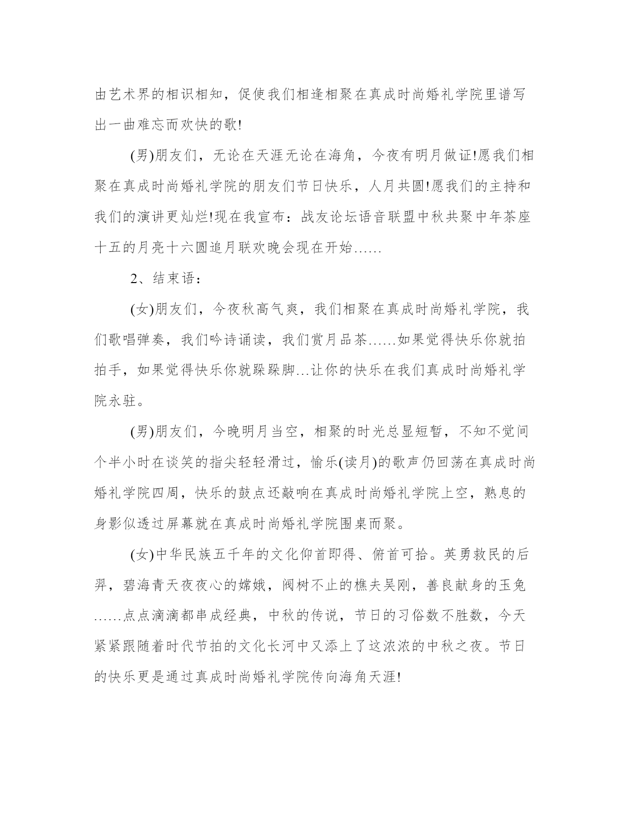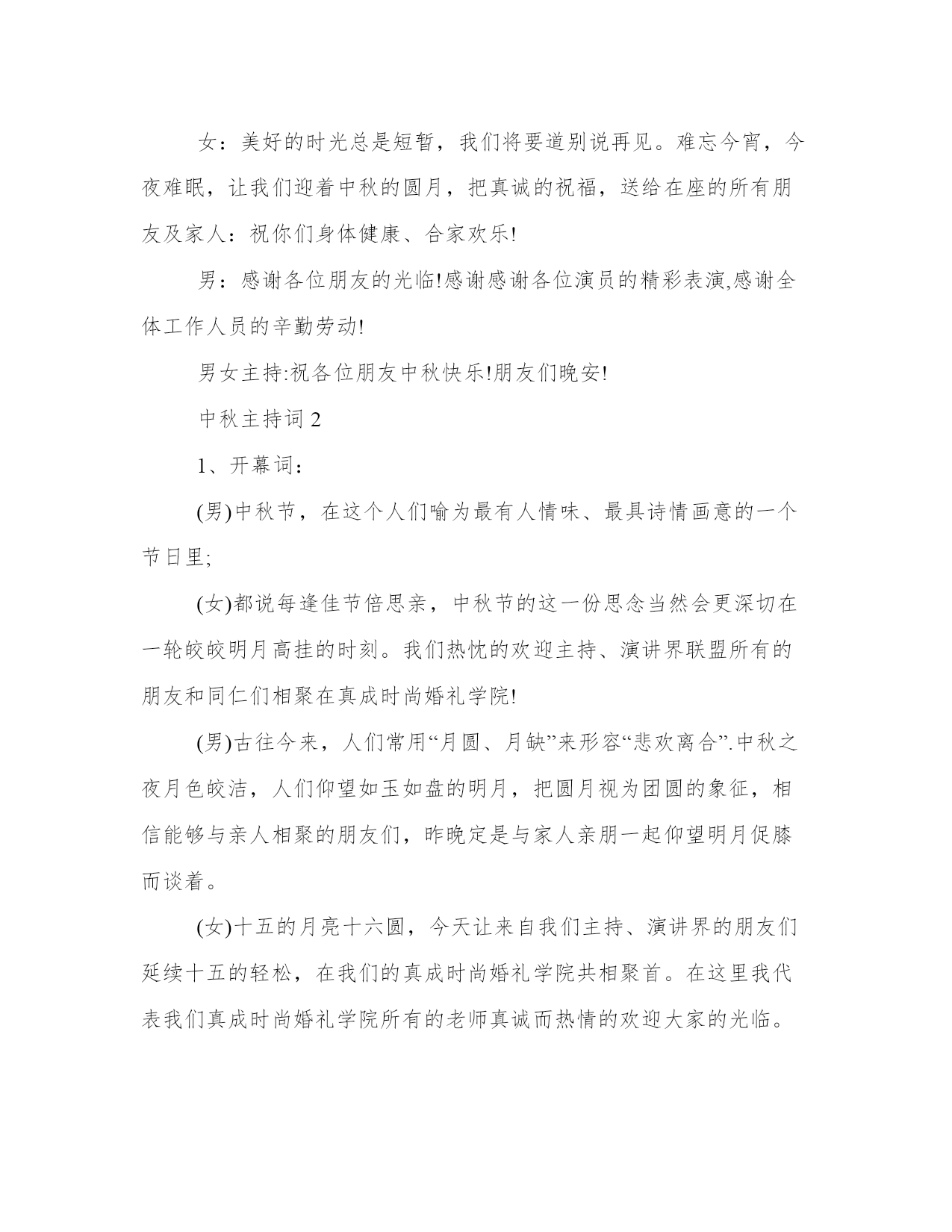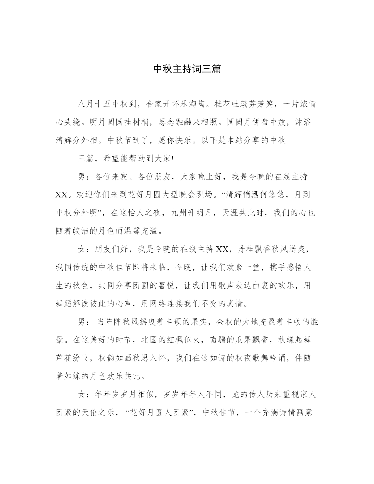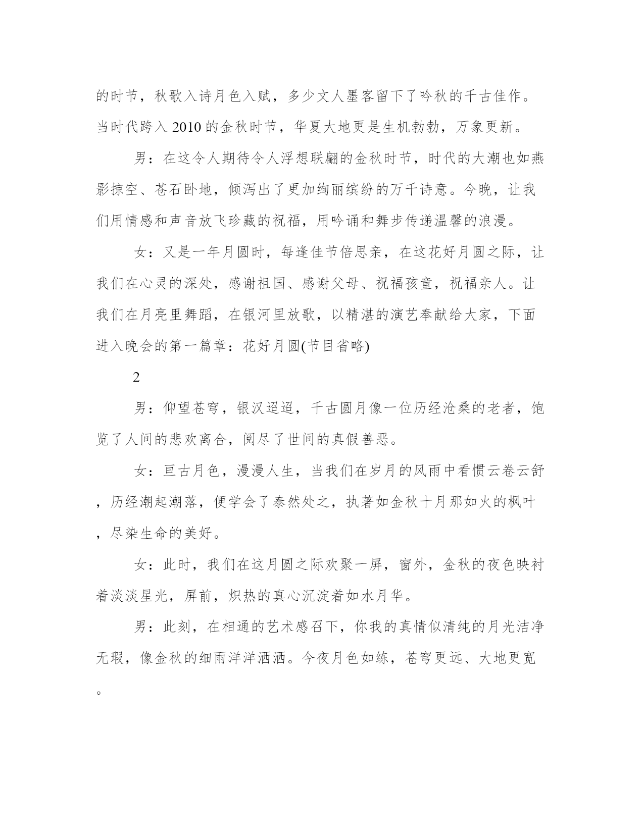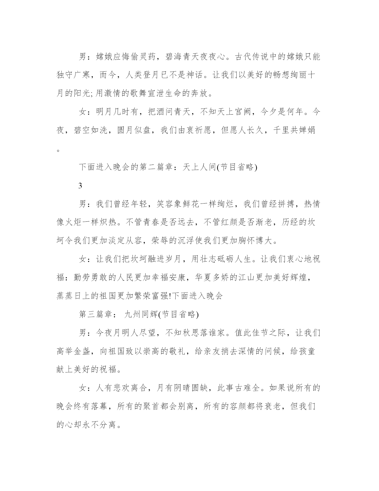 中秋主持词三篇八月十五中秋到,合家开怀乐淘陶。桂花吐蕊芬芳笑,一片浓情心头绕。明月圆圆挂树梢,思念融融来相照。圆圆月饼盘中放,沐浴清辉分外相。中秋节到了,愿你快乐。以下是本站分享的中秋三篇,希望能帮助到大家!男:各位来宾、各位朋友,大家晚上好,我是今晚的在线主持XX。欢迎你们来到花好月圆大型晚会现场。“清辉悄洒何悠悠,月到中秋分外明”,在这怡人之夜,九州升明月,天涯共此时,我们的心也随着皎洁的月色而温馨充溢。女:朋友们好,我是今晚的在线主持XX,丹桂飘香秋风送爽,我国传统的中秋佳节即将来临,今晚,让我们欢聚一堂,携手感悟人生的秋色,共同分享团圆的喜悦,让我们用歌声表达由衷的欢乐,用舞蹈解读彼此的心声,用网络连接我们不变的真情。男:当阵阵秋风摇曳着丰硕的果实,金秋的大地充盈着丰收的胜景。在这美好的时节,北国的红枫似火,南疆的瓜果飘香,秋蝶起舞芦花纷飞,秋韵如画秋思入怀,我们在这如诗的秋夜歌舞吟诵,伴随着如练的月色欢乐共此。女:年年岁岁月相似,岁岁年年人不同,龙的传人历来重视家人团聚的天伦之乐,“花好月圆人团聚”,中秋佳节,一个充满诗情画意的时节,秋歌入诗月色入赋,多少文人墨客留下了吟秋的千古佳作。当时代跨入2010的金秋时节,华夏大地更是生机勃勃,万象更新。男:在这令人期待令人浮想联翩的金秋时节,时代的大潮也如燕影掠空、苍石卧地,倾泻出了更加绚丽缤纷的万千诗意。今晚,让我们用情感和声音放飞珍藏的祝福,用吟诵和舞步传递温馨的浪漫。女:又是一年月圆时,每逢佳节倍思亲,在这花好月圆之际,让我们在心灵的深处,感谢祖国、感谢父母、祝福孩童,祝福亲人。让我们在月亮里舞蹈,在银河里放歌,以精湛的演艺奉献给大家,下面进入晚会的第一篇章:花好月圆(节目省略)2男:仰望苍穹,银汉迢迢,千古圆月像一位历经沧桑的老者,饱览了人间的悲欢离合,阅尽了世间的真假善恶。女:亘古月色,漫漫人生,当我们在岁月的风雨中看惯云卷云舒,历经潮起潮落,便学会了泰然处之,执著如金秋十月那如火的枫叶,尽染生命的美好。女:此时,我们在这月圆之际欢聚一屏,窗外,金秋的夜色映衬着淡淡星光,屏前,炽热的真心沉淀着如水月华。男:此刻,在相通的艺术感召下,你我的真情似清纯的月光洁净无瑕,像金秋的细雨洋洋洒洒。今夜月色如练,苍穹更远、大地更宽。男:嫦娥应悔偷灵药,碧海青天夜夜心。古代传说中的嫦娥只能独守广寒,而今,人类登月已不是神话。让我们以美好的畅想绚丽十月的阳光;用激情的歌舞宣泄生命的奔放。女:明月几时有,把酒问青天,不知天上宫阙,今夕是何年。今夜,碧空如洗,圆月似盘,我们由衷祈愿,但愿人长久,千里共婵娟。下面进入晚会的第二篇章:天上人间(节目省略)3男:我们曾经年轻,笑容象鲜花一样绚烂,我们曾经拼搏,热情像火炬一样炽热。不管青春是否远去,不管红颜是否渐老,历经的坎坷令我们更加淡定从容,荣辱的沉浮使我们更加胸怀博大。女:让我们把坎坷融进岁月,用壮志砥砺人生。让我们衷心地祝福:勤劳勇敢的人民更加幸福安康,华夏多娇的江山更加美好辉煌,蒸蒸日上的祖国更加繁荣富强!下面进入晚会第三篇章:九州同辉(节目省略)男:今夜月明人尽望,不知秋思落谁家。值此佳节之际,让我们高举金盏,向祖国致以崇高的敬礼,给亲友捎去深情的问候,给孩童献上美好的祝福。女:人有悲欢离合,月有阴晴圆缺,此事古难全。如果说所有的晚会终有落幕,所有的聚首都会别离,所有的容颜都将衰老,但我们的心却永不分离。女:美好的时光总是短暂,我们将要道别说再见。难忘今宵,今夜难眠,让我们迎着中秋的圆月,把真诚的祝福,送给在座的所有朋友及家人:祝你们身体健康、合家欢乐!男:感谢各位朋友的光临!感谢感谢各位演员的精彩表演,感谢全体工作人员的辛勤劳动!男女主持:祝各位朋友中秋快乐!朋友们晚安!中秋主持词21、开幕词:(男)中秋节,在这个人们喻为最有人情味、最具诗情画意的一个节日里;(女)都说每逢佳节倍思亲,中秋节的这一份思念当然会更深切在一轮皎皎明月高挂的时刻。我们热忱的欢迎主持、演讲界联盟所有的朋友和同仁们相聚在真成时尚婚礼学院!(男)古往今来,人们常用“月圆、月缺”来形容“悲欢离合”.中秋之夜月色皎洁,人们仰望如玉如盘的明月,把圆月视为团圆的象征,相信能够与亲人相聚的朋友们,昨晚定是与家人亲朋一起仰望明月促膝而谈着。(女)十五的月亮十六圆,今天让来自我们主持、演讲界的朋友们延续十五的轻松,在我们的真成时尚婚礼学院共相聚首。在这里我代表我们真成时尚婚礼学院所有的老师真诚而热情的欢迎大家的光临。由艺术界的相识相知,促使我们相逢相聚在真成时尚婚礼学院里谱写出一曲难忘而欢快的歌!(男)朋友们,无论在天涯无论在海角,今夜有明月做证!愿我们相聚在真成时尚婚礼学院的朋友们节日快乐,人月共圆!愿我们的主持和我们的演讲更灿烂!现在我宣布:战友论坛语音联盟中秋共聚中年