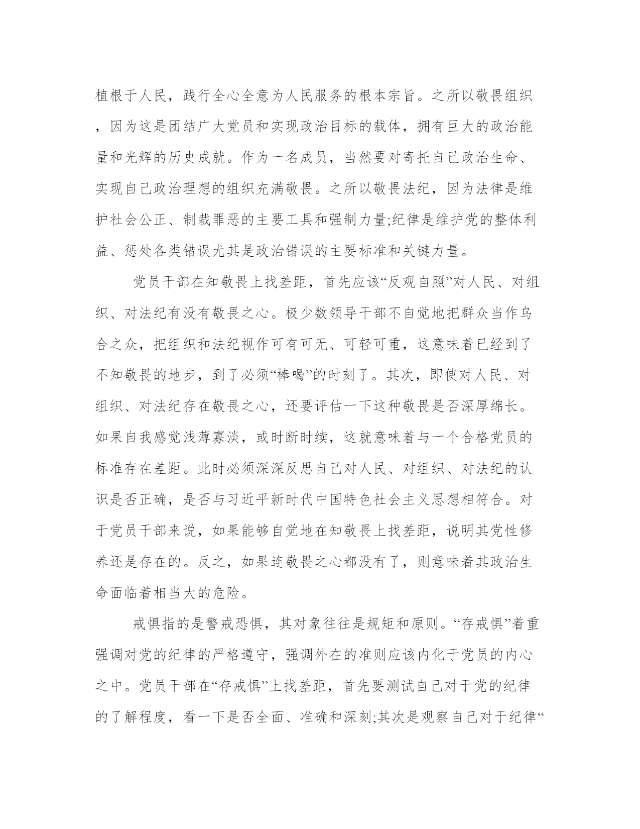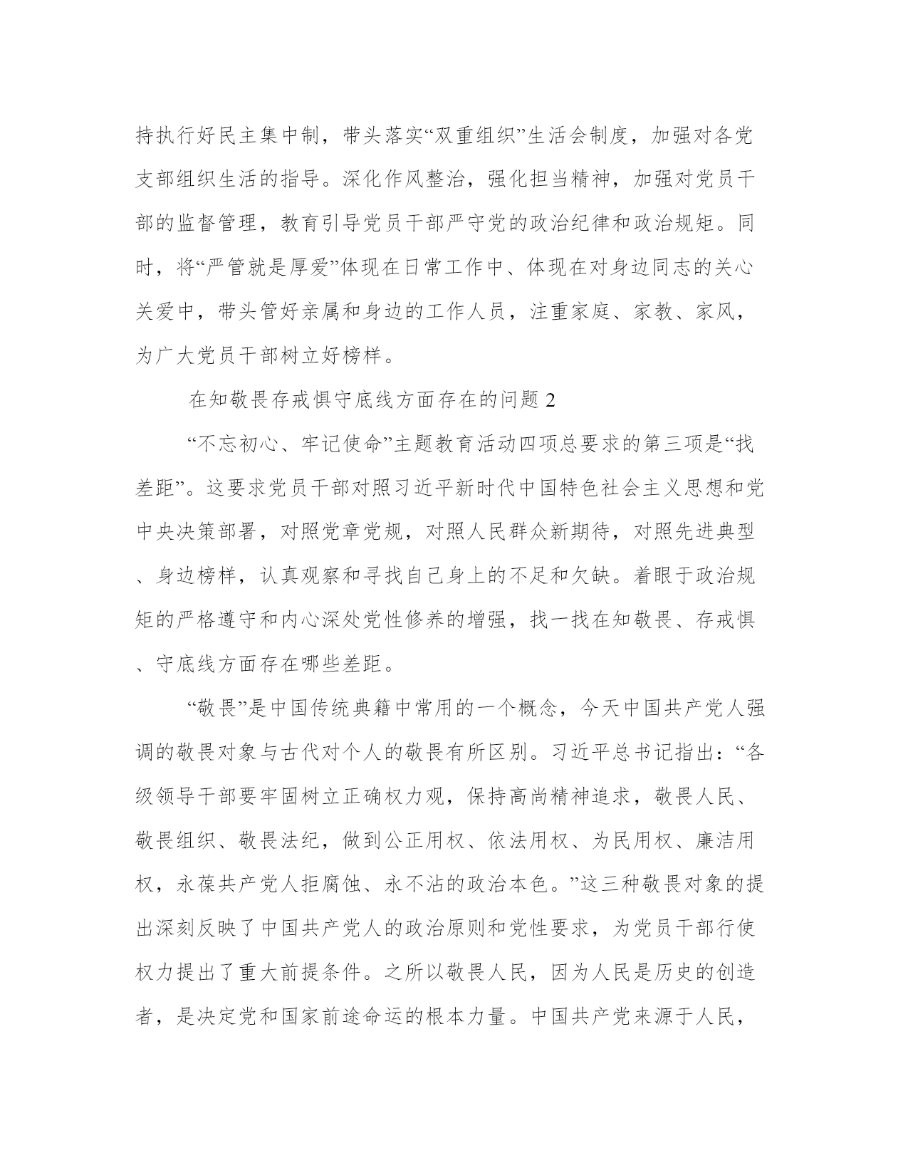 在知敬畏存戒惧守底线方面存在的问题3篇对照党章党规党纪找差距,就是通过照镜子对自己的言行,行动举止等方面进行不断反省,认清不足,自我革新、自我提升。本站精心为大家整理了在知敬畏存戒惧守底线方面存在的问题3篇,希望对你有帮助。在知敬畏存戒惧守底线方面存在的问题1一、查找的突出问题(一)在增强“四个意识”、坚定“四个自信”、做到“两个维护”方面。一是对政治理论学习的认识上有偏差。认为理论是比较虚的东西,理论水平再高,也不如实实在在干点事,因此没有对政治理论学习的重视程度不够,在运用先进理论来认识问题、分析问题和解决问题方面存在差距。二是在学用结合紧密联系不够。尽管用新理念新思想武装了头脑,但在理论指导实践上还不到位,仍然存在用惯性思维、依赖心理。用新思想指导纪检监察工作实际,把握运用不深刻不及时,直到上级纪检监察工作座谈会召开后,才找到明确方向。(二)在知敬畏、存戒惧、守底线方面。长期以来,以在纪律方面不出问题、不犯错误为底线,没有严格对照党章党纪的具体规定去梳理思考,没有为自己树立一个更高的标杆,工作繁忙时有时放松了对理论的再学习、对理想的再坚定、对革命意志的再锤炼。(三)在群众观点、群众立场、群众感情、服务群众方面。一是调查分析不够深入。调研重形式,听汇报、看材料的多,深入调查、仔细分析的少;听领导干部说的多、和职工交流少。二是联系群众不够密切。走马观花、流于形式,联系群众不细,问的多、听的少,单向沟通有余、双向互动不足。(四)在思想觉悟、能力素质、担当作为、道德修养、作风形象方面。一是攻坚克难还需提升。开会强调多,提要求多,经常性谈心谈话少,干部思想动态掌握的不准,严管干部方面还缺乏“刀刃向内”的勇气。一些自身建设的难点工作还未找到有效的破解方式,如解决基层纪检力量薄弱、专业素养偏低,充分调动派驻机构工作积极性等方面还没有切实有效的办法。二是缺乏亲历亲为。工作中谋划指导多,亲历亲为少,对纪委班子成员多是交待任务压担子,和他们坐下来分析问题分析对策较少,而自己具体深入工作一线更少,因此对一些工作掌握得不够深入细致,一定程度上影响了工作成效。二、产生问题的原因分析自己本着实事求是、认真负责的逐条分析查摆自身问题,主要体现在:一是坚定理想信念淡化。对博大精深习近平新时代中国特色社会主义思想的认识还缺乏宏大的理论视野和高度的政治自觉。面对新形势新变化,缺少更加坚定的理论自信,导致理想信念出现松懈。二是纪律规矩严守不够。反思自己在纪律规矩上存在的问题,主要原因是政治敏锐性和政治鉴别力不够。在刚性执行政治纪律、组织纪律上不够坚定、不够到位,执行各项规章制度不够严格。三是勇于担当作为不够。随着参加工作时间的增加,面对新形势、新挑战,执着不够,缺乏攻坚克难的敬业精神,工作抓实、抓细、抓具体,“一竿子插到底”的实干精神还不够强,工作主动性和创造性不足。三、今后努力方向和改进措施下一步自己将针对自身问题和不足,紧扣主题教育“守初心、担使命,找差距、抓落实”总要求,坚持把改字贯穿始终,紧密结合自身实际和纪检监察工作,找准着力点,狠抓关键点,以持之以恒的努力逐项抓好整改落实。重点抓好以下四个方面:二是积极开拓创新,提高履职本领。充分发挥主观能动性,进一步转变观念、更新观念,突破原有的思维定式以及经验主义束缚,立足实际,大胆探索,创造性的开展纪检工作。面对新形势,深入分析新情况、新问题,把握规律掌握情况,不断创造新工作模式,提高工作效能,以求真务实的作风,把上级的决策部署到实处。破除“守成”思想,主动分析新情况新问题,大胆探索新思路,创造性地推进新时期公司纪检工作。三是强化责任落实,恪守纪律规矩。严守党的政治纪律和政治规矩,认真落实中央八项规定和实施细则精神,率先垂范严格自律。坚持执行好民主集中制,带头落实“双重组织”生活会制度,加强对各党支部组织生活的指导。深化作风整治,强化担当精神,加强对党员干部的监督管理,教育引导党员干部严守党的政治纪律和政治规矩。同时,将“严管就是厚爱”体现在日常工作中、体现在对身边同志的关心关爱中,带头管好亲属和身边的工作人员,注重家庭、家教、家风,为广大党员干部树立好榜样。在知敬畏存戒惧守底线方面存在的问题2“不忘初心、牢记使命”主题教育活动四项总要求的第三项是“找差距”。这要求党员干部对照习近平新时代中国特色社会主义思想和党中央决策部署,对照党章党规,对照人民群众新期待,对照先进典型、身边榜样,认真观察和寻找自己身上的不足和欠缺。着眼于政治规矩的严格遵守和内心深处党性修养的增强,找一找在知敬畏、存戒惧、守底线方面存在哪些差距。“敬畏”是中国传统典籍中常用的一个概念,今天中国共产党人强调的敬畏对象与古代对个人的敬畏有所区别。习近平总书记指出:“各级领导干部要牢固树立正确权力观,保持高尚精神追求,敬畏人民、敬畏组织、敬畏法