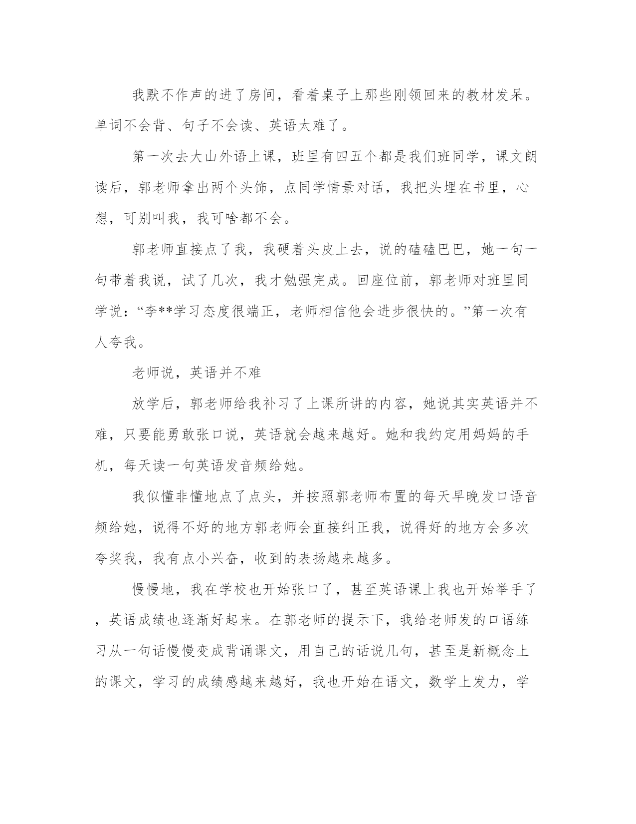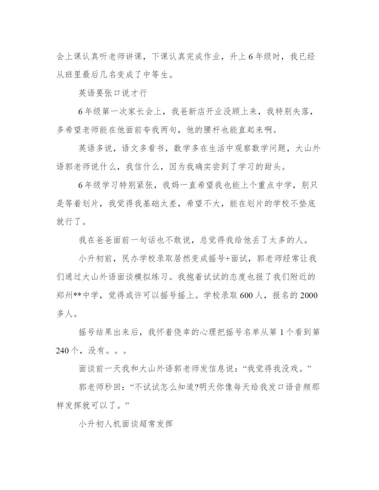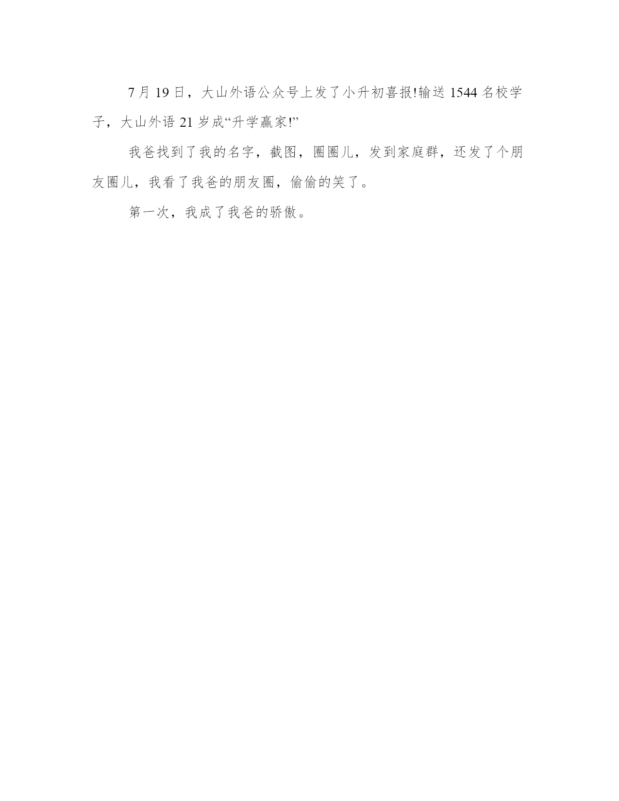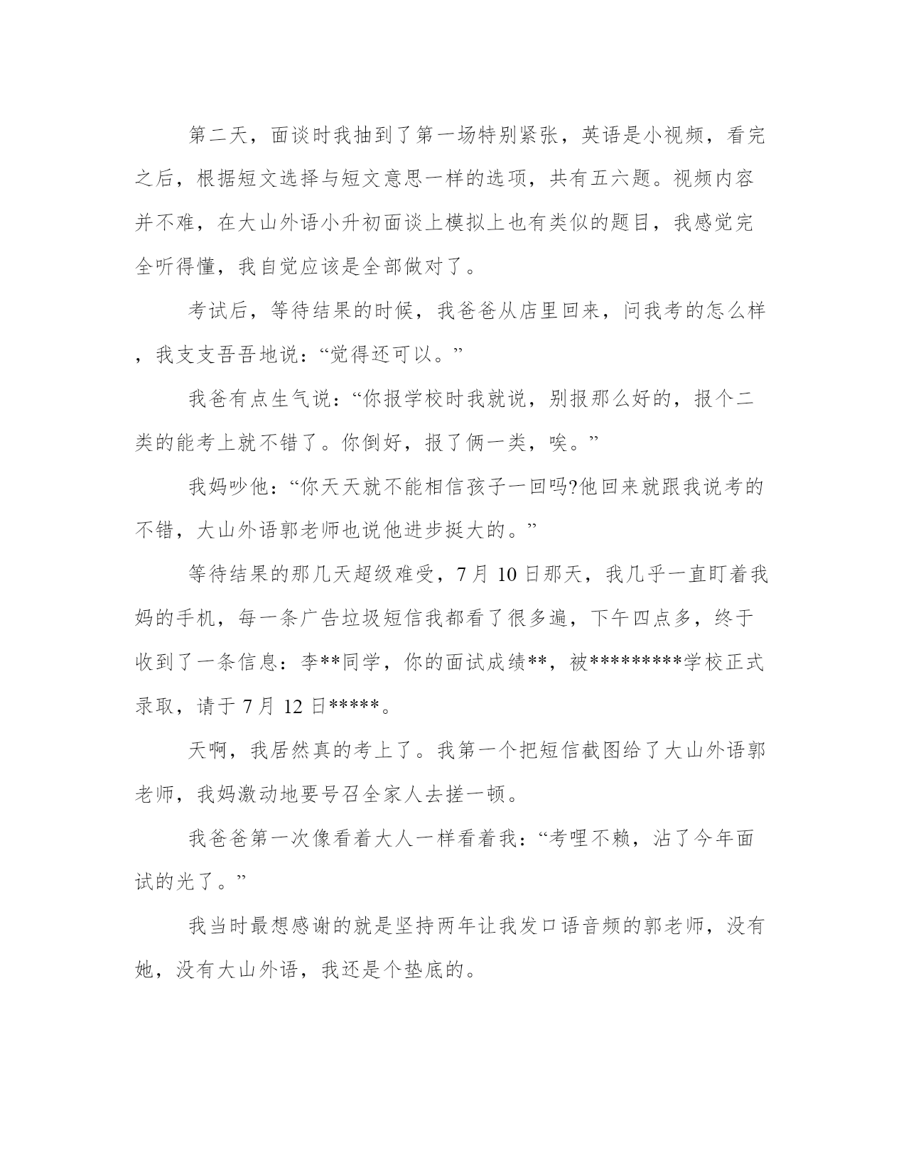 【我的心情就像】我爸就像《银河补习班》里的阎主任,直到他在大山外语喜报上看见了我的名字我爸就像银河补习班里的阎主任,直到他在大山外语喜报上看见了我的名字我爸不喜欢我,从上学开始。我每天去上学,可很多东西我听不懂。尤其是英语,课文我从来不敢读出声,怕被同学笑话。一到考试,我英语从来不及格。我爸开蛋糕店,每天很忙,却很配合老师的工作,每次家长会他都会到场,和老师说话时,我爸180的个子微微弯腰,老师说啥他都忙不迭点头,好像考砸了的人是他。每当那时我心里就难受。每次家长会后,爸爸开车带我回家,他能熊我一路:“天天累死累活供你上学,能给我长一次脸行不行,一次都没有!”车里总是带着奶油蛋糕的甜香气,我觉得要窒息。英语还是得报大山四年级升五年级的暑假,我妈给我报了大山外语,回家后我爸还吵了她:“大山外语那么贵,小区北门不是有便宜的吗?”我妈说:“我听乐乐(我小名)同学家长说,英语还是得报大山,老师讲的好。”我爸冷笑了一声:“他要是争气点,不报班也能学好。烂泥扶不上墙,浪费钱。”我默不作声的进了房间,看着桌子上那些刚领回来的教材发呆。单词不会背、句子不会读、英语太难了。第一次去大山外语上课,班里有四五个都是我们班同学,课文朗读后,郭老师拿出两个头饰,点同学情景对话,我把头埋在书里,心想,可别叫我,我可啥都不会。郭老师直接点了我,我硬着头皮上去,说的磕磕巴巴,她一句一句带着我说,试了几次,我才勉强完成。回座位前,郭老师对班里同学说:“李**学习态度很端正,老师相信他会进步很快的。”第一次有人夸我。老师说,英语并不难放学后,郭老师给我补习了上课所讲的内容,她说其实英语并不难,只要能勇敢张口说,英语就会越来越好。她和我约定用妈妈的手机,每天读一句英语发音频给她。我似懂非懂地点了点头,并按照郭老师布置的每天早晚发口语音频给她,说得不好的地方郭老师会直接纠正我,说得好的地方会多次夸奖我,我有点小兴奋,收到的表扬越来越多。慢慢地,我在学校也开始张口了,甚至英语课上我也开始举手了,英语成绩也逐渐好起来。在郭老师的提示下,我给老师发的口语练习从一句话慢慢变成背诵课文,用自己的话说几句,甚至是新概念上的课文,学习的成绩感越来越好,我也开始在语文,数学上发力,学会上课认真听老师讲课,下课认真完成作业,升上6年级时,我已经从班里最后几名变成了中等生。英语要张口说才行6年级第一次家长会上,我爸新店开业没顾上来,我特别失落,多希望老师能在他面前夸我两句,他的腰杆也能直起来啊。英语多说,语文多看书,数学多在生活中观察数学问题,大山外语郭老师说什么,我信什么,因为我确实尝到了学习的甜头。6年级学习特别紧张,我妈一直希望我也能上个重点中学,别只是等着划片,我觉得我基础太差,希望不大,能在划片的学校不垫底就行了。我在爸爸面前一句话也不敢说,总觉得我给他丢了太多的人。小升初前,民办学校录取居然变成摇号+面试,郭老师经常让我们通过大山外语面谈模拟练习。我抱着试试的态度也报了我们附近的郑州**中学,觉得或许可以摇号摇上。学校录取600人,报名的2000多人。摇号结果出来后,我怀着侥幸的心理把摇号名单从第1个看到第240个,没有。。。面谈前一天我和大山外语郭老师发信息说:“我觉得我没戏。”郭老师秒回:“不试试怎么知道?明天你像每天给我发口语音频那样发挥就可以了。”小升初人机面谈超常发挥第二天,面谈时我抽到了第一场特别紧张,英语是小视频,看完之后,根据短文选择与短文意思一样的选项,共有五六题。视频内容并不难,在大山外语小升初面谈上模拟上也有类似的题目,我感觉完全听得懂,我自觉应该是全部做对了。考试后,等待结果的时候,我爸爸从店里回来,问我考的怎么样,我支支吾吾地说:“觉得还可以。”我爸有点生气说:“你报学校时我就说,别报那么好的,报个二类的能考上就不错了。你倒好,报了俩一类,唉。”我妈吵他:“你天天就不能相信孩子一回吗?他回来就跟我说考的不错,大山外语郭老师也说他进步挺大的。”等待结果的那几天超级难受,7月10日那天,我几乎一直盯着我妈的手机,每一条广告垃圾短信我都看了很多遍,下午四点多,终于收到了一条信息:李**同学,你的面试成绩**,被*********学校正式录取,请于7月12日*****。天啊,我居然真的考上了。我第一个把短信截图给了大山外语郭老师,我妈激动地要号召全家人去搓一顿。我爸爸第一次像看着大人一样看着我:“考哩不赖,沾了今年面试的光了。”我当时最想感谢的就是坚持两年让我发口语音频的郭老师,没有她,没有大山外语,我还是个垫底的。7月19日,大山外语公众号上发了小升初喜报!输送1544名校学子,大山外语21岁成“升学赢家!”我爸找到了我的名字,截图,圈圈儿,发到家庭群,还发了个朋友圈儿,我看了我爸的朋友圈,偷偷的笑了。第一次,我成了我爸的骄傲。