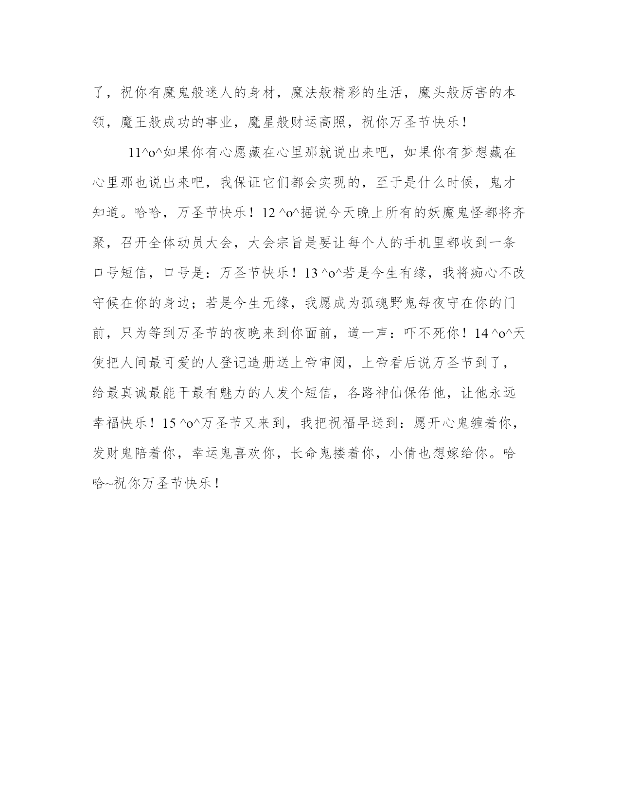 送给朋友的万圣节祝福短信【www.sxqingyun.com--祝福语录】1如果你有心愿藏在心里那就说出来吧,我保证它们都会实现的,至于是什么时候,鬼才知道。哈哈,万圣节快乐!2工资是吝啬鬼,物价是大头鬼,房价是吸血鬼,心情是讨厌鬼,万圣节到了,快扔出你的烦恼,让他们统统去见鬼!节日快乐!3没有鬼头鬼脑的可爱,怎拥的起神鬼莫测的思维,没有鬼使神差的默契,怎能接到神出鬼没的祝福。万圣节快乐!4三个金叫“鑫”,三个木叫“森”,三个口叫“品”,三个人叫“众”,那么,三个鬼叫什么?……叫“救命”啊。万圣节快乐!5今天是万圣节,允许你出鬼点子,任由你耍鬼把戏,放任你说鬼话,只要你高兴就好。小鬼得瑟去吧,祝万圣节快乐!6^o^万圣节广告大派送:今年鬼节不收礼,收礼只收好短信;鬼节恒久远,短信永流传;鬼节相聚,意犹未尽;你好,我好,万圣节好,才是真的好。7^o^万圣节大调查:开心鬼在写短信,幸福鬼在发短信,机灵鬼在转发短信,小气鬼在收藏短信,讨厌鬼在删除短信。万圣节,鬼的地盘鬼做主。8^o^万圣节到了,收到此短信者:酒鬼色鬼财鬼老鬼大鬼小鬼六路妖怪保佑你,天神地神水神山神风神雨神六路神仙祝福你,保你一家平平安安财源滚滚!9^o^万圣节到了,祝你节日快乐。回短信的是好鬼,不回的是坏鬼,保存的是帅鬼,删除的是衰鬼,自个儿偷着乐的是小气鬼,发给大家一起乐的是开心鬼。10^o^西方的鬼节万圣节到了,祝你有魔鬼般迷人的身材,魔法般精彩的生活,魔头般厉害的本领,魔王般成功的事业,魔星般财运高照,祝你万圣节快乐!11^o^如果你有心愿藏在心里那就说出来吧,如果你有梦想藏在心里那也说出来吧,我保证它们都会实现的,至于是什么时候,鬼才知道。哈哈,万圣节快乐!12^o^据说今天晚上所有的妖魔鬼怪都将齐聚,召开全体动员大会,大会宗旨是要让每个人的手机里都收到一条口号短信,口号是:万圣节快乐!13^o^若是今生有缘,我将痴心不改守候在你的身边;若是今生无缘,我愿成为孤魂野鬼每夜守在你的门前,只为等到万圣节的夜晚来到你面前,道一声:吓不死你!14^o^天使把人间最可爱的人登记造册送上帝审阅,上帝看后说万圣节到了,给最真诚最能干最有魅力的人发个短信,各路神仙保佑他,让他永远幸福快乐!15^o^万圣节又来到,我把祝福早送到:愿开心鬼缠着你,发财鬼陪着你,幸运鬼喜欢你,长命鬼搂着你,小倩也想嫁给你。哈哈~祝你万圣节快乐!