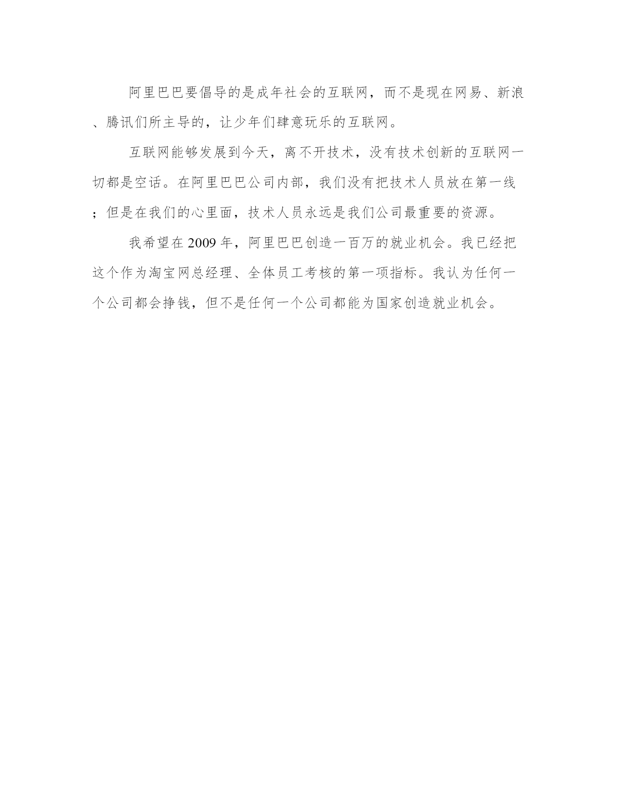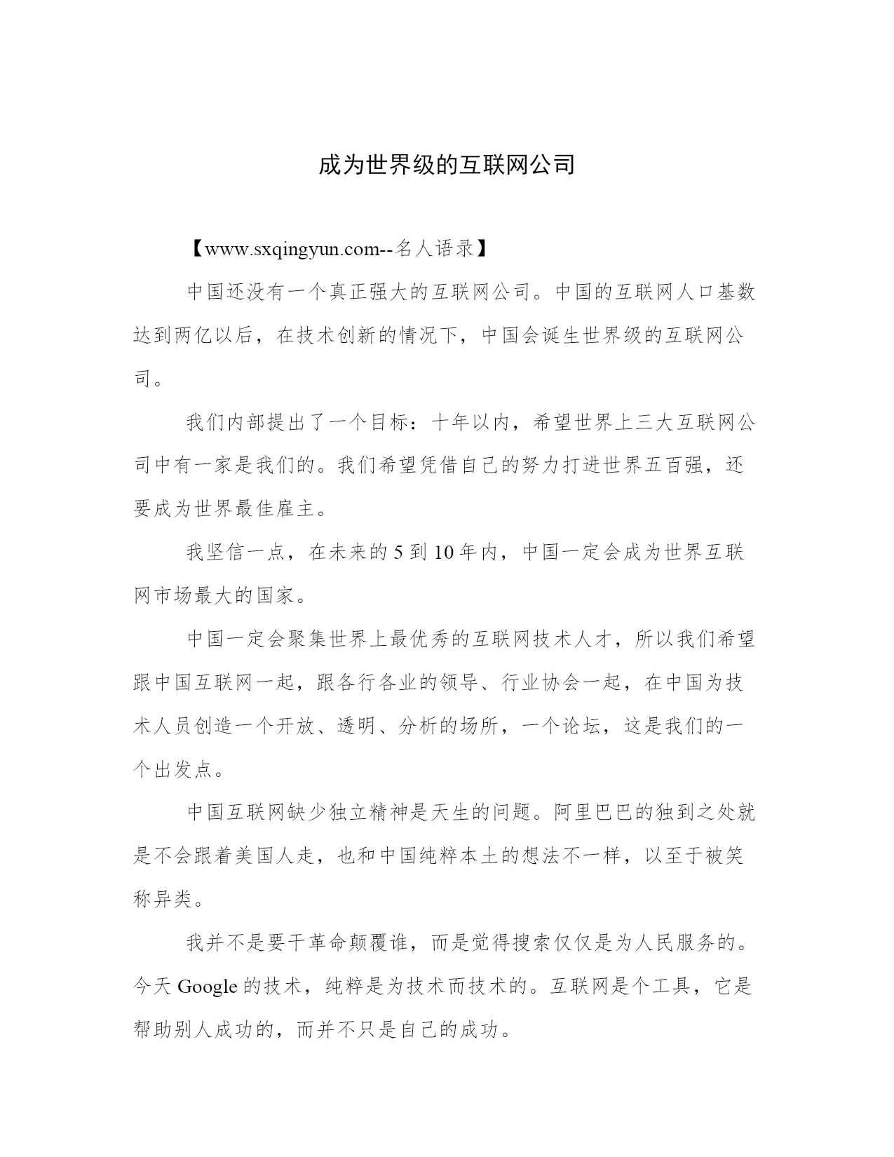 成为世界级的互联网公司【www.sxqingyun.com--名人语录】中国还没有一个真正强大的互联网公司。中国的互联网人口基数达到两亿以后,在技术创新的情况下,中国会诞生世界级的互联网公司。我们内部提出了一个目标:十年以内,希望世界上三大互联网公司中有一家是我们的。我们希望凭借自己的努力打进世界五百强,还要成为世界最佳雇主。我坚信一点,在未来的5到10年内,中国一定会成为世界互联网市场最大的国家。中国一定会聚集世界上最优秀的互联网技术人才,所以我们希望跟中国互联网一起,跟各行各业的领导、行业协会一起,在中国为技术人员创造一个开放、透明、分析的场所,一个论坛,这是我们的一个出发点。中国互联网缺少独立精神是天生的问题。阿里巴巴的独到之处就是不会跟着美国人走,也和中国纯粹本土的想法不一样,以至于被笑称异类。我并不是要干革命颠覆谁,而是觉得搜索仅仅是为人民服务的。今天Google的技术,纯粹是为技术而技术的。互联网是个工具,它是帮助别人成功的,而并不只是自己的成功。阿里巴巴要倡导的是成年社会的互联网,而不是现在网易、新浪、腾讯们所主导的,让少年们肆意玩乐的互联网。互联网能够发展到今天,离不开技术,没有技术创新的互联网一切都是空话。在阿里巴巴公司内部,我们没有把技术人员放在第一线;但是在我们的心里面,技术人员永远是我们公司最重要的资源。我希望在2009年,阿里巴巴创造一百万的就业机会。我已经把这个作为淘宝网总经理、全体员工考核的第一项指标。我认为任何一个公司都会挣钱,但不是任何一个公司都能为国家创造就业机会。
