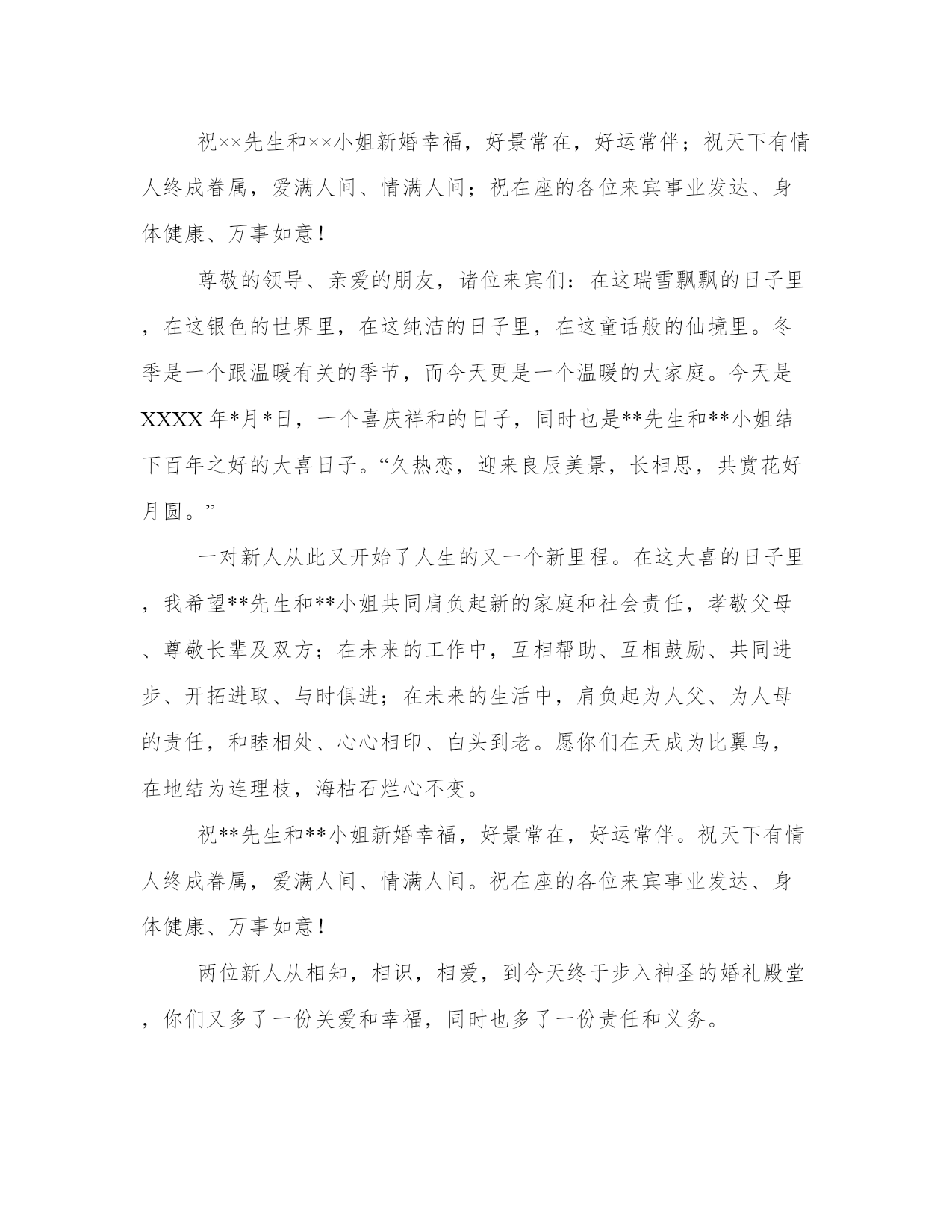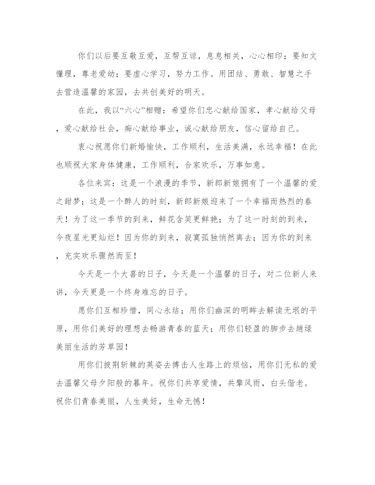 婚礼嘉宾贺词语录【www.sxqingyun.com--爱情语录】婚礼嘉宾贺词:今天,我们的先生以他的忠诚和智慧,赢得了新娘小姐的芳心。然而,更重要的是,我们的XXX小姐以她热情和美貌,彻底征服了新郎xxx先生的心。有道是:“有情人终成眷属”。今天在二位新人步入神圣婚礼殿堂的时候,我代表各位来宾衷心地祝福新郎、新娘幸福美满,天长地久。各位来宾、朋友们,大家好!今天是200X年×月×日,一个喜庆祥和的日子,同时也是××先生和××小姐结下百年之好的大喜日子。“久热恋,迎来良辰美景,长相思,共赏花好月圆。”一对新人从此又开始了人生的又一个新里程。在这大喜的日子里,我希望××先生和××小姐共同肩负起新的家庭和社会责任,孝敬父母、尊敬长辈及双方;在未来的工作中,互相帮助、互相鼓励、共同进步、开拓进取、与时俱进在未来的生活中,肩负起为人父、为人母的责任,和睦相处、心心相印、白头到老;愿你们在天成为比翼鸟,在地结为连理枝,海枯石烂心不变。祝××先生和××小姐新婚幸福,好景常在,好运常伴;祝天下有情人终成眷属,爱满人间、情满人间;祝在座的各位来宾事业发达、身体健康、万事如意!尊敬的领导、亲爱的朋友,诸位来宾们:在这瑞雪飘飘的日子里,在这银色的世界里,在这纯洁的日子里,在这童话般的仙境里。冬季是一个跟温暖有关的季节,而今天更是一个温暖的大家庭。今天是XXXX年*月*日,一个喜庆祥和的日子,同时也是**先生和**小姐结下百年之好的大喜日子。“久热恋,迎来良辰美景,长相思,共赏花好月圆。”一对新人从此又开始了人生的又一个新里程。在这大喜的日子里,我希望**先生和**小姐共同肩负起新的家庭和社会责任,孝敬父母、尊敬长辈及双方;在未来的工作中,互相帮助、互相鼓励、共同进步、开拓进取、与时俱进;在未来的生活中,肩负起为人父、为人母的责任,和睦相处、心心相印、白头到老。愿你们在天成为比翼鸟,在地结为连理枝,海枯石烂心不变。祝**先生和**小姐新婚幸福,好景常在,好运常伴。祝天下有情人终成眷属,爱满人间、情满人间。祝在座的各位来宾事业发达、身体健康、万事如意!两位新人从相知,相识,相爱,到今天终于步入神圣的婚礼殿堂,你们又多了一份关爱和幸福,同时也多了一份责任和义务。你们以后要互敬互爱,互帮互谅,息息相关,心心相印;要知文懂理,尊老爱幼;要虚心学习,努力工作。用团结、勇敢、智慧之手去营造温馨的家园,去共创美好的明天。在此,我以“六心”相赠:希望你们忠心献给国家,孝心献给父母,爱心献给社会,痴心献给事业,诚心献给朋友,信心留给自己。衷心祝愿你们新婚愉快,工作顺利,生活美满,永远幸福!在此也顺祝大家身体健康,工作顺利,合家欢乐,万事如意。各位来宾:这是一个浪漫的季节,新郎新娘拥有了一个温馨的爱之甜梦;这是一个醉人的时刻,新郎新娘迎来了一个幸福而热烈的春天!为了这一季节的到来,鲜花含笑更鲜艳;为了这一时刻的到来,今夜星光更灿烂!因为你的到来,寂寞孤独悄然离去;因为你的到来,充实欢乐骤然而至!今天是一个大喜的日子,今天是一个温馨的日子,对二位新人来讲,今天更是一个终身难忘的日子。愿你们互相珍惜,同心永结;用你们幽深的明眸去解读无垠的平原,用你们美好的理想去畅游青春的蓝天;用你们轻盈的脚步去趟绿美丽生活的芳草园!用你们披荆斩棘的英姿去搏击人生路上的烦恼,用你们无私的爱去温馨父母夕阳般的暮年。祝你们共享爱情,共擎风雨,白头偕老。祝你们青春美丽,人生美好,生命无憾!
