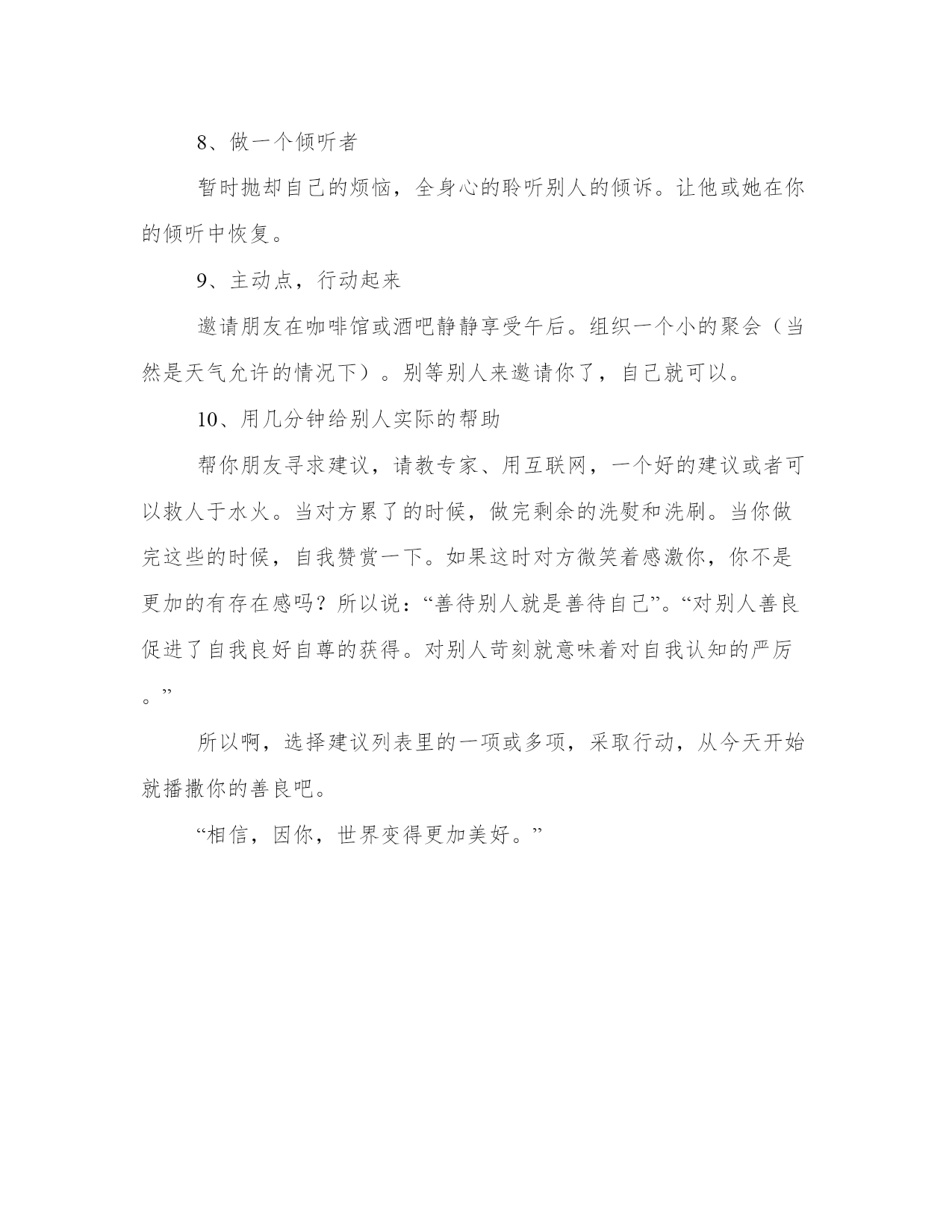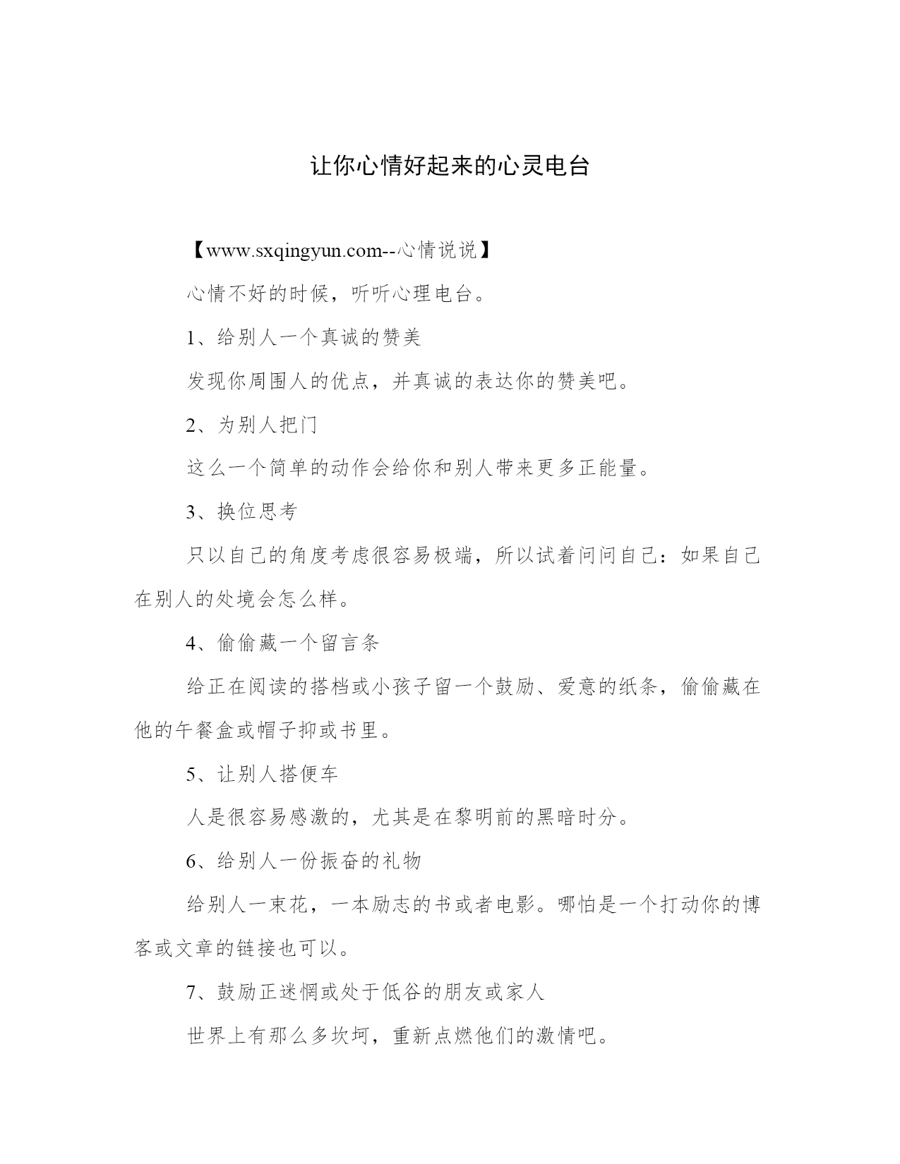 让你心情好起来的心灵电台【www.sxqingyun.com--心情说说】心情不好的时候,听听心理电台。1、给别人一个真诚的赞美发现你周围人的优点,并真诚的表达你的赞美吧。2、为别人把门这么一个简单的动作会给你和别人带来更多正能量。3、换位思考只以自己的角度考虑很容易极端,所以试着问问自己:如果自己在别人的处境会怎么样。4、偷偷藏一个留言条给正在阅读的搭档或小孩子留一个鼓励、爱意的纸条,偷偷藏在他的午餐盒或帽子抑或书里。5、让别人搭便车人是很容易感激的,尤其是在黎明前的黑暗时分。6、给别人一份振奋的礼物给别人一束花,一本励志的书或者电影。哪怕是一个打动你的博客或文章的链接也可以。7、鼓励正迷惘或处于低谷的朋友或家人世界上有那么多坎坷,重新点燃他们的激情吧。8、做一个倾听者暂时抛却自己的烦恼,全身心的聆听别人的倾诉。让他或她在你的倾听中恢复。9、主动点,行动起来邀请朋友在咖啡馆或酒吧静静享受午后。组织一个小的聚会(当然是天气允许的情况下)。别等别人来邀请你了,自己就可以。10、用几分钟给别人实际的帮助帮你朋友寻求建议,请教专家、用互联网,一个好的建议或者可以救人于水火。当对方累了的时候,做完剩余的洗熨和洗刷。当你做完这些的时候,自我赞赏一下。如果这时对方微笑着感激你,你不是更加的有存在感吗?所以说:“善待别人就是善待自己”。“对别人善良促进了自我良好自尊的获得。对别人苛刻就意味着对自我认知的严厉。”所以啊,选择建议列表里的一项或多项,采取行动,从今天开始就播撒你的善良吧。“相信,因你,世界变得更加美好。”
