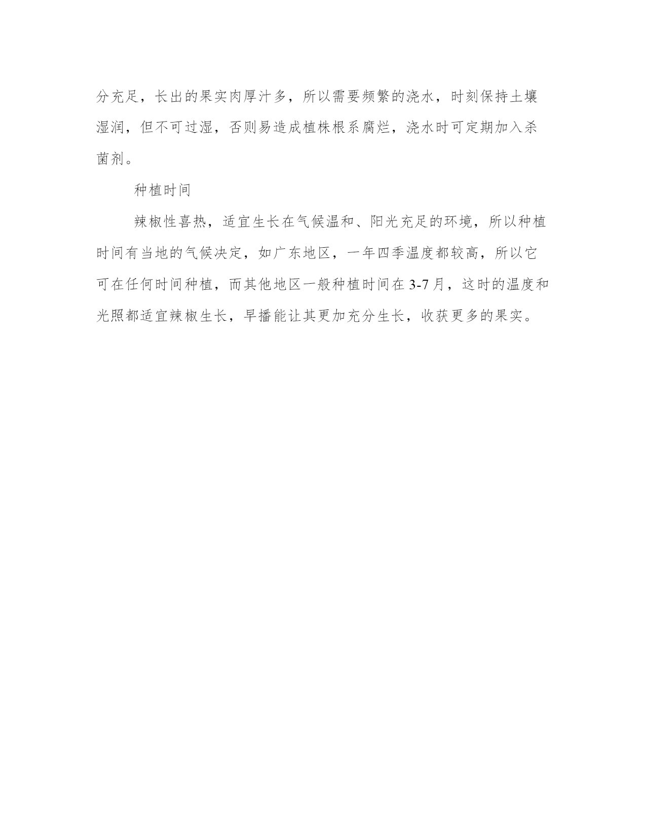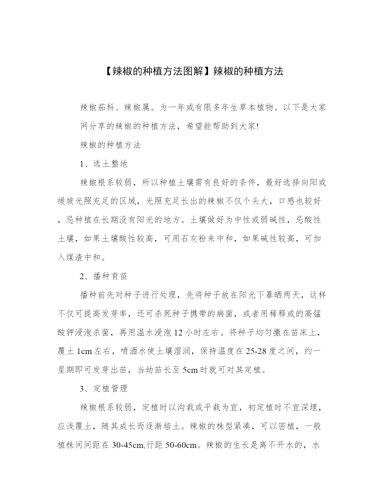 【辣椒的种植方法图解】辣椒的种植方法辣椒茄科、辣椒属。为一年或有限多年生草本植物。以下是大家网分享的辣椒的种植方法,希望能帮助到大家!辣椒的种植方法1、选土整地辣椒根系较弱,所以种植土壤需有良好的条件,最好选择向阳或缓坡光照充足的区域,光照充足长出的辣椒不仅个头大,口感也较好,忌种植在长期没有阳光的地方。土壤做好为中性或弱碱性,忌酸性土壤,如果土壤酸性较高,可用石灰粉来中和,如果碱性较高,可加入煤渣中和。2、播种育苗播种前先对种子进行处理,先将种子放在阳光下暴晒两天,这样不仅可提高发芽率,还可杀死种子携带的病菌,或者用稀释或的高锰酸钾浸泡杀菌,再用温水浸泡12小时左右。将种子均匀撒在苗床上,覆土1cm左右,喷洒水使土壤湿润,保持温度在25-28度之间,约一星期即可发芽出苗,当幼苗长至5cm时就可对其定植。3、定植管理辣椒根系较弱,定植时以沟栽或平栽为宜,初定植时不宜深埋,应浅覆土,随其成长而逐渐培土。辣椒的株型紧凑,可以密植,一般植株间间距在30-45cm,行距50-60cm。辣椒的生长是离不开水的,水分充足,长出的果实肉厚汁多,所以需要频繁的浇水,时刻保持土壤湿润,但不可过湿,否则易造成植株根系腐烂,浇水时可定期加入杀菌剂。种植时间辣椒性喜热,适宜生长在气候温和、阳光充足的环境,所以种植时间有当地的气候决定,如广东地区,一年四季温度都较高,所以它可在任何时间种植,而其他地区一般种植时间在3-7月,这时的温度和光照都适宜辣椒生长,早播能让其更加充分生长,收获更多的果实。