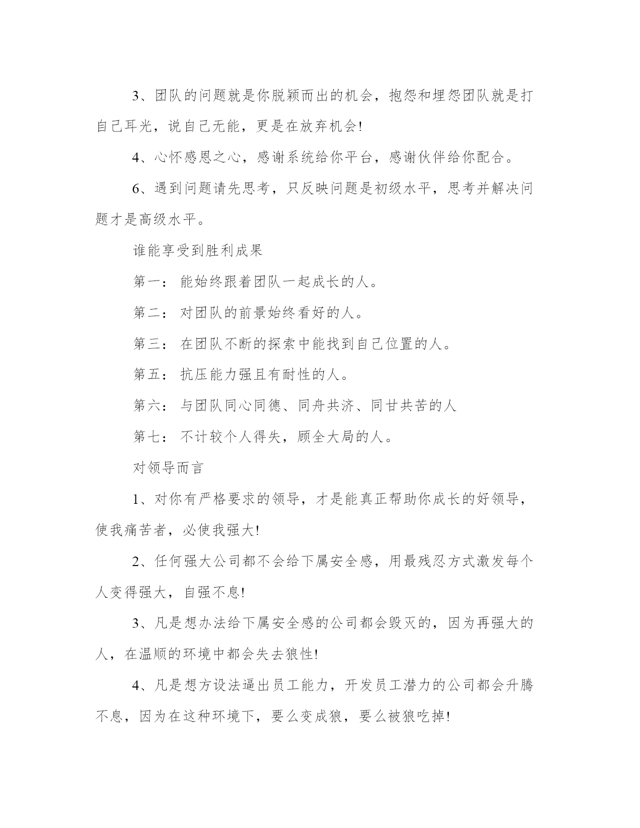 马云:公司请你来干嘛?问题就是你的机会,句句精辟1、请你来是解决问题而不是制造问题2、如果你不能发现问题或解决不了问题,你本人就是一个问题3、你能解决多大的问题,你就坐多高的位子4、你能解决多少问题,你就能拿多少薪水5、让解决问题的人高升,让制造问题的人让位,让抱怨问题的人下课.问题就是你的机会1、公司的问题:就是你改善的机会;2、客户的问题:就是你提供服务的机会;3、自己的问题:就是你成长的机会;4、同事的问题:就是你提供支持建立合作机会;5、领导的问题:就是你积极解决获得信任的机会6、竞争对手的问题:就是你变强的机会。不要轻易离开团队1、不要老想着做不顺就放弃,哪个团队都有问题,哪个团队都有优点。2、跟对领导很重要,愿意教你的,放手让你做的领导,绝对要珍惜。3、团队的问题就是你脱颖而出的机会,抱怨和埋怨团队就是打自己耳光,说自己无能,更是在放弃机会!4、心怀感恩之心,感谢系统给你平台,感谢伙伴给你配合。6、遇到问题请先思考,只反映问题是初级水平,思考并解决问题才是高级水平。谁能享受到胜利成果第一:能始终跟着团队一起成长的人。第二:对团队的前景始终看好的人。第三:在团队不断的探索中能找到自己位置的人。第五:抗压能力强且有耐性的人。第六:与团队同心同德、同舟共济、同甘共苦的人第七:不计较个人得失,顾全大局的人。对领导而言1、对你有严格要求的领导,才是能真正帮助你成长的好领导,使我痛苦者,必使我强大!2、任何强大公司都不会给下属安全感,用最残忍方式激发每个人变得强大,自强不息!3、凡是想办法给下属安全感的公司都会毁灭的,因为再强大的人,在温顺的环境中都会失去狼性!4、凡是想方设法逼出员工能力,开发员工潜力的公司都会升腾不息,因为在这种环境下,要么变成狼,要么被狼吃掉!5、最不给员工安全感的公司,其实给了真正的安全感,因为逼出了他们的强大,逼出了他们的成长,也因此他们有了未来!让你的下属因为你而成长,拥有正确的人生观,价值观,并具备了完善的品行,让员工不断的成长,就是领导对下属最伟大的爱。
