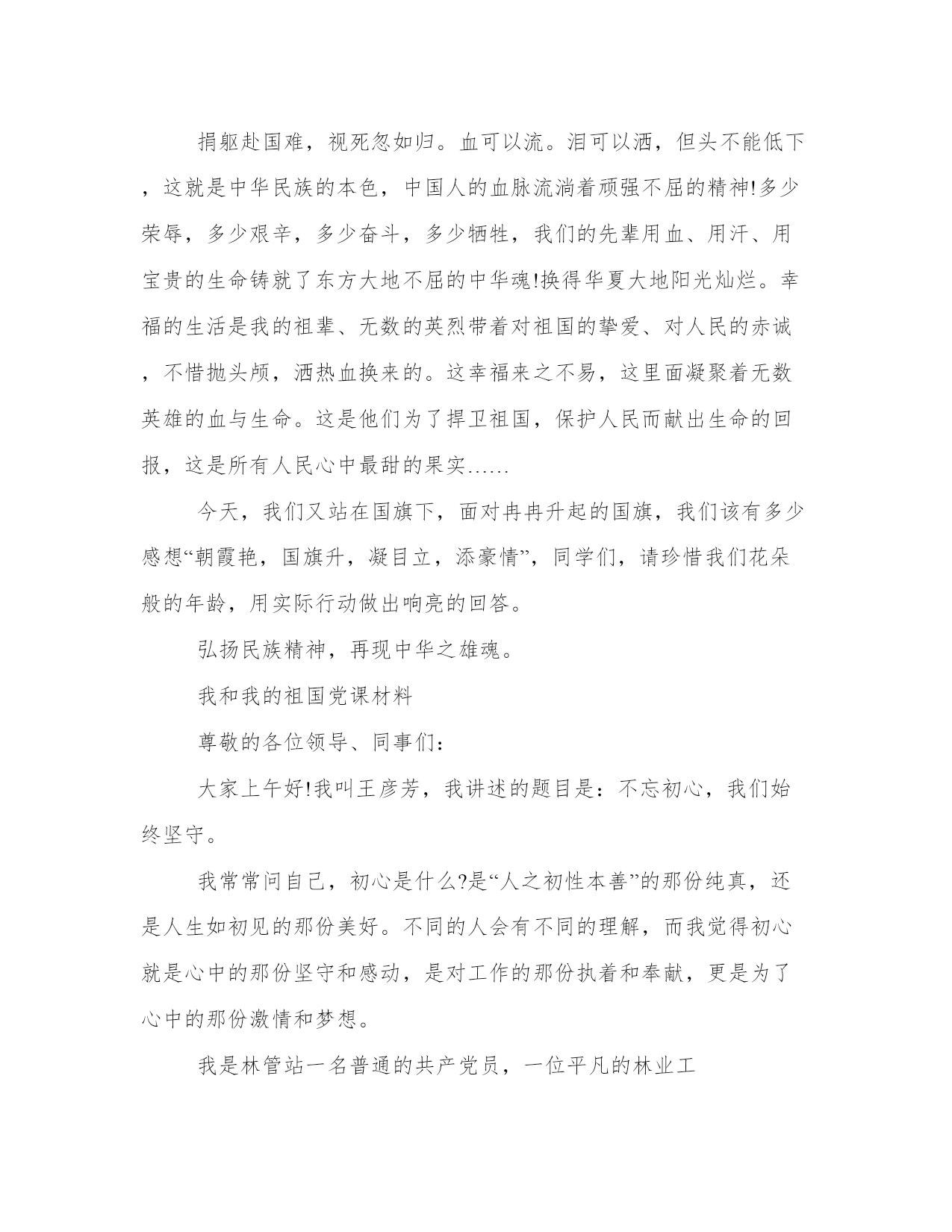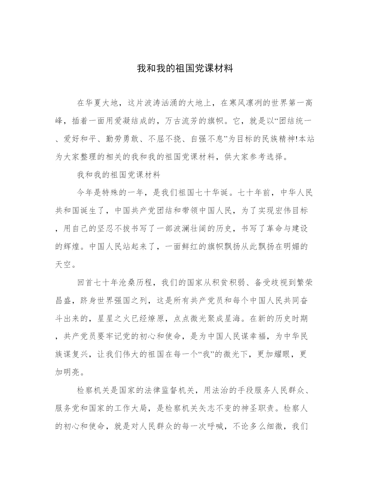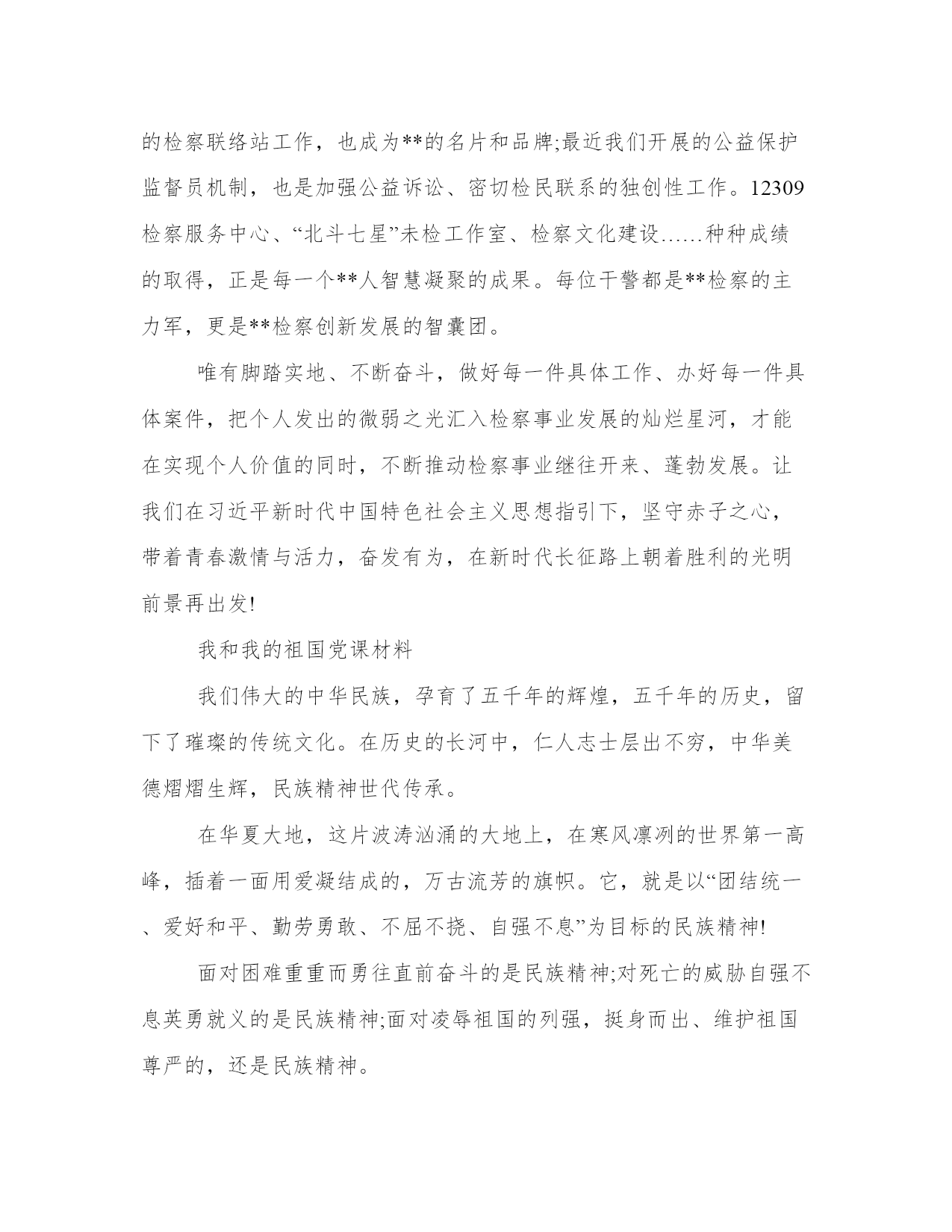 我和我的祖国党课材料在华夏大地,这片波涛汹涌的大地上,在寒风凛冽的世界第一高峰,插着一面用爱凝结成的,万古流芳的旗帜。它,就是以“团结统一、爱好和平、勤劳勇敢、不屈不挠、自强不息”为目标的民族精神!本站为大家整理的相关的我和我的祖国党课材料,供大家参考选择。我和我的祖国党课材料今年是特殊的一年,是我们祖国七十华诞。七十年前,中华人民共和国诞生了,中国共产党团结和带领中国人民,为了实现宏伟目标,用自己的坚忍不拔书写了一部波澜壮阔的历史,书写了革命与建设的辉煌。中国人民站起来了,一面鲜红的旗帜飘扬从此飘扬在明媚的天空。回首七十年沧桑历程,我们的国家从积贫积弱、备受歧视到繁荣昌盛,跻身世界强国之列,这是所有共产党员和每个中国人民共同奋斗出来的,星星之火已经燎原,点点微光聚成星海。在新的历史时期,共产党员要牢记党的初心和使命,是为中国人民谋幸福,为中华民族谋复兴,让我们伟大的祖国在每一个“我”的微光下,更加耀眼,更加明亮。检察机关是国家的法律监督机关,用法治的手段服务人民群众、服务党和国家的工作大局,是检察机关矢志不变的神圣职责。检察人的初心和使命,就是对人民群众的每一次呼喊,不论多么细微,我们也能清晰的听见;就是对诉讼监督的每一个疑点,即使经历千辛万苦,我们也穷追不舍、给出答案。以国家和人民的名义,牢记党的重托,牵挂百姓温暖,守护公平正义。作为**检察的一员,我们就是要做好本职工作,在自己的岗位上对所负责的每一项工作认真细致的完成。可是随着时间流逝,有多少人受到纷繁复杂的外界因素不停的冲刷,渐渐忘掉了初心,早已没有了刚迈入职场时那饱满的信心和干劲。这个时候我们不妨看看身边依然保持赤子之心,脚踏实地默默奉献的那些人,他们纵然身心疲惫,但依然兢兢业业,站好自己的那班岗,发出自己的那道光。我们身边就有这样的模范榜样,办公室干警**主要负责办公室综合事务性工作。在日常工作中,她把每一项工作做到极致,为我们做出了表率。下班之后的晚上,经过办公楼时常常会发现她办公室的窗口是透着亮光的,里面是她伏案准备讲话稿和各种文字材料的身影。因为经常加班,相应的陪伴家庭的时间就会变少,当别人下班后在享受家庭欢乐,陪伴孩子的时候,她依然在为我们的检察事业辛勤耕耘着。在检察院工作不是只有办理案件才有意义,各项工作都是整体不可或缺的重要组成部分,可能我们综合部门的日常工作不是办理案件,但却更琐碎,更繁杂,要求更加精细,也正是每位干警的辛苦付出,才有了我们现在整体实力优异的**检察。我们坚持“精细化管理”理念,绘制岗位工作流程图、坚持挂图作战,已经形成体系和规模;我们的检察联络站工作,也成为**的名片和品牌;最近我们开展的公益保护监督员机制,也是加强公益诉讼、密切检民联系的独创性工作。12309检察服务中心、“北斗七星”未检工作室、检察文化建设……种种成绩的取得,正是每一个**人智慧凝聚的成果。每位干警都是**检察的主力军,更是**检察创新发展的智囊团。唯有脚踏实地、不断奋斗,做好每一件具体工作、办好每一件具体案件,把个人发出的微弱之光汇入检察事业发展的灿烂星河,才能在实现个人价值的同时,不断推动检察事业继往开来、蓬勃发展。让我们在习近平新时代中国特色社会主义思想指引下,坚守赤子之心,带着青春激情与活力,奋发有为,在新时代长征路上朝着胜利的光明前景再出发!我和我的祖国党课材料我们伟大的中华民族,孕育了五千年的辉煌,五千年的历史,留下了璀璨的传统文化。在历史的长河中,仁人志士层出不穷,中华美德熠熠生辉,民族精神世代传承。在华夏大地,这片波涛汹涌的大地上,在寒风凛冽的世界第一高峰,插着一面用爱凝结成的,万古流芳的旗帜。它,就是以“团结统一、爱好和平、勤劳勇敢、不屈不挠、自强不息”为目标的民族精神!面对困难重重而勇往直前奋斗的是民族精神;对死亡的威胁自强不息英勇就义的是民族精神;面对凌辱祖国的列强,挺身而出、维护祖国尊严的,还是民族精神。民族精神,它是世界的最高峰,向下方眺望。它看到了祖国雄壮美丽的大好河山,看到了这片土地上勤劳的中国人……此时,它虽然身在寒冷的峰顶,但它心里却有一颗炽热的太阳为它驱赶寒冷。但是,当它看到人面兽心的侵略者残忍地杀害无辜的百姓,一股憎恨在心底油然而生,就仿佛凶猛的列焰在心头焚烧,久久不息。望长江黄河浩荡东流去,抚敌垒炮台默默耸天立。江山千秋永在,英烈风范长存,从太军倒下的第一排勇士,到百万雄师过大江献出年轻生命的战士;从罗霄山脉战死的大将,到抗日战胜和大决战中英勇献身的官兵,他们有没有留下名字的,还有的没墓场和石碑。然而“青山处处埋忠骨”,他们的英灵与江河同在,与日月同辉!时间如信风拂过耳际,生命的旋律在眼前闪烁。悠悠的岁月如水流逝。你是否还记得抛头颅,洒热血的英雄们?爱国是高于一切的传统美德,正是如此,我们中华民族涌现了许许多多可歌可泣的爱