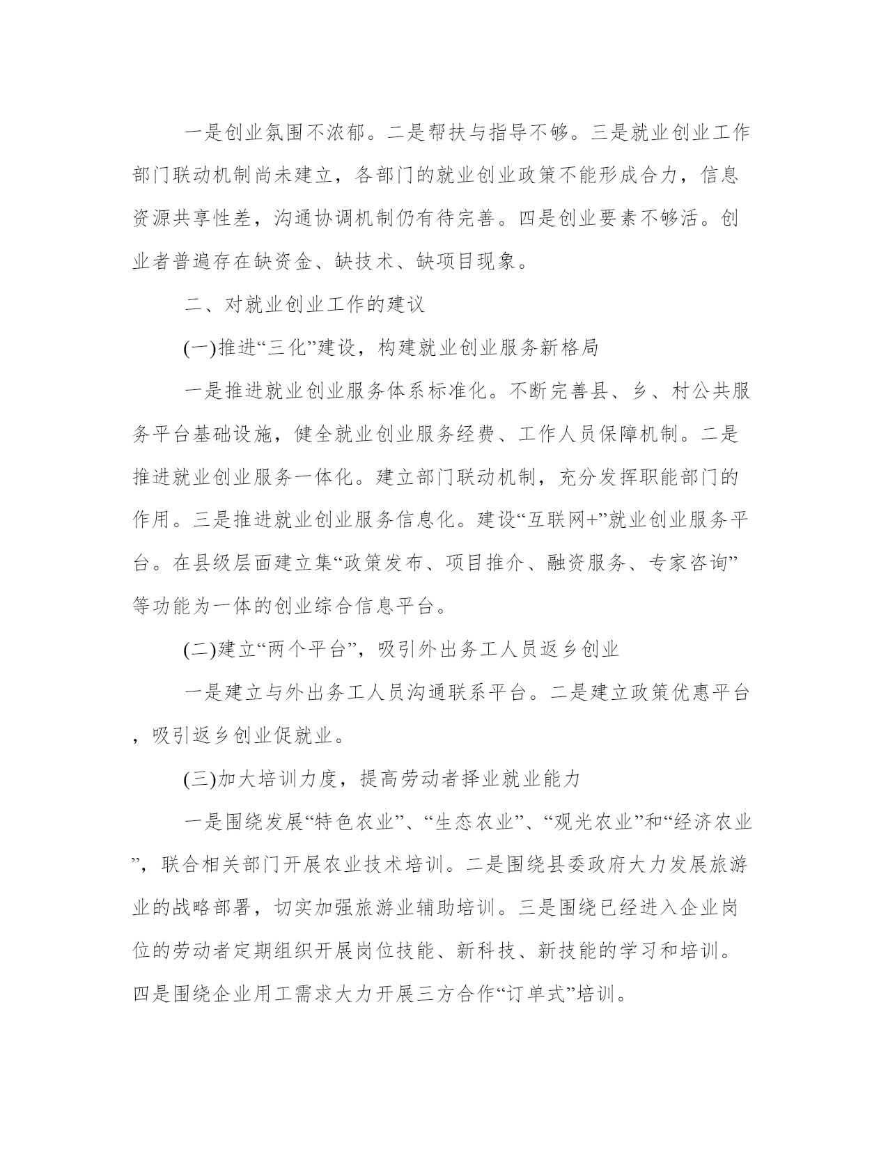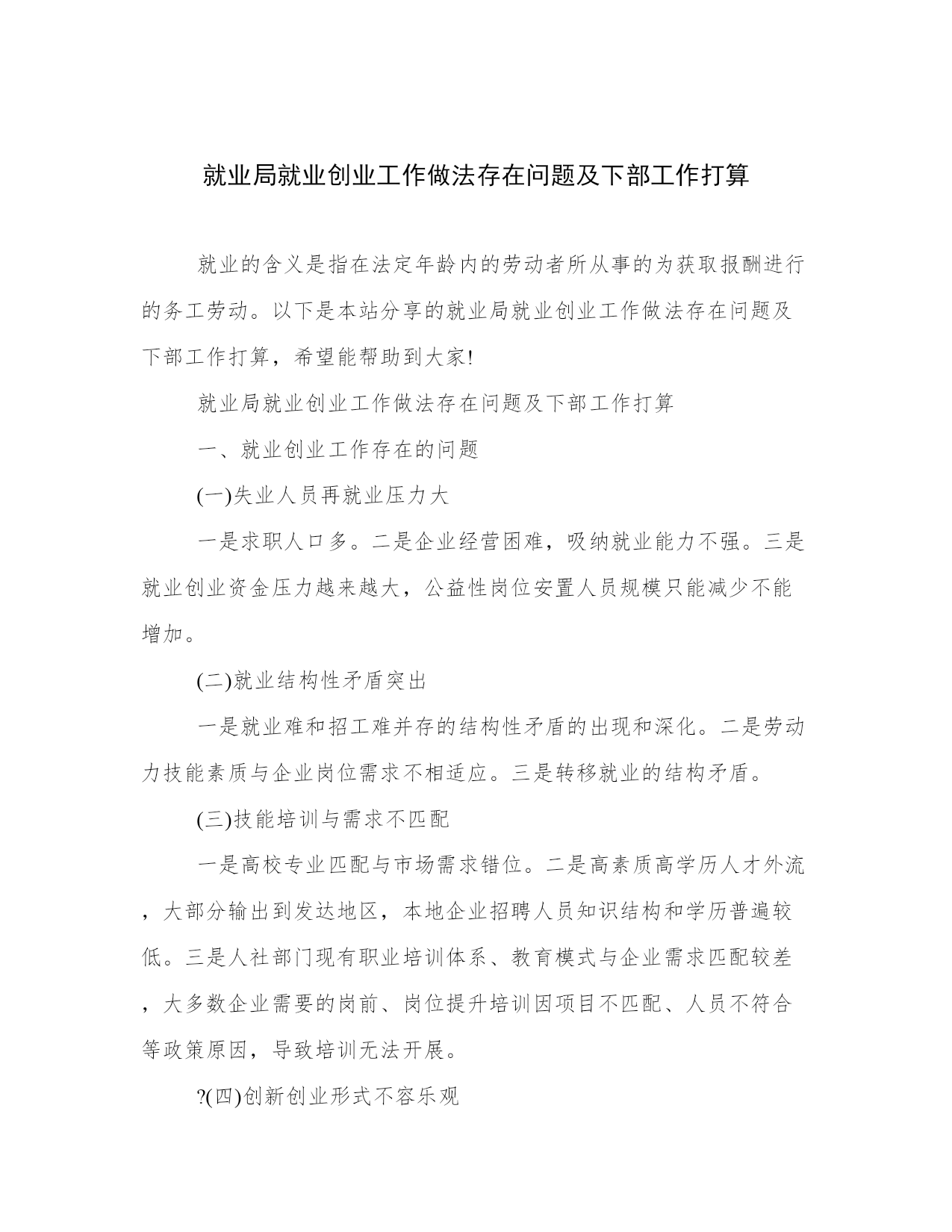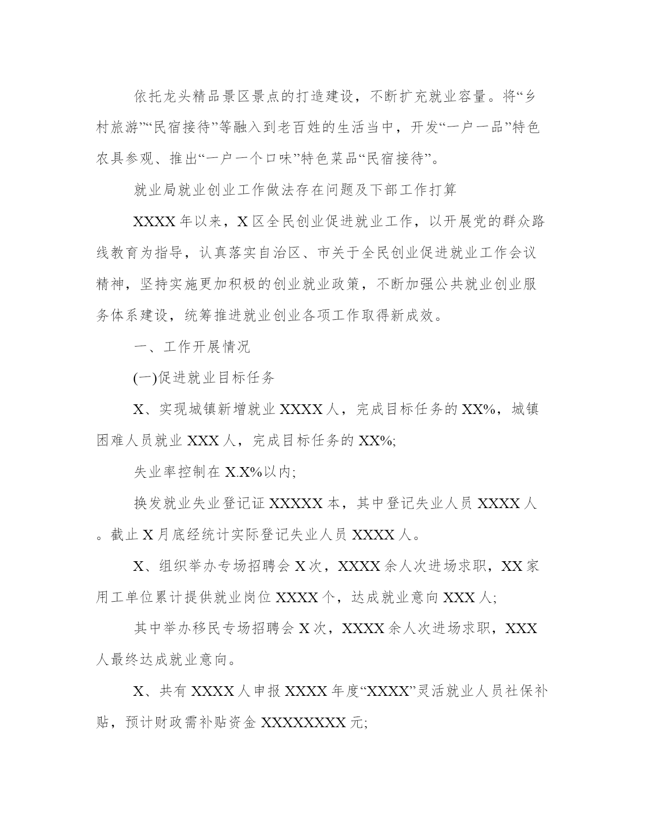 就业局就业创业工作做法存在问题及下部工作打算就业的含义是指在法定年龄内的劳动者所从事的为获取报酬进行的务工劳动。以下是本站分享的就业局就业创业工作做法存在问题及下部工作打算,希望能帮助到大家!就业局就业创业工作做法存在问题及下部工作打算一、就业创业工作存在的问题(一)失业人员再就业压力大一是求职人口多。二是企业经营困难,吸纳就业能力不强。三是就业创业资金压力越来越大,公益性岗位安置人员规模只能减少不能增加。(二)就业结构性矛盾突出一是就业难和招工难并存的结构性矛盾的出现和深化。二是劳动力技能素质与企业岗位需求不相适应。三是转移就业的结构矛盾。(三)技能培训与需求不匹配一是高校专业匹配与市场需求错位。二是高素质高学历人才外流,大部分输出到发达地区,本地企业招聘人员知识结构和学历普遍较低。三是人社部门现有职业培训体系、教育模式与企业需求匹配较差,大多数企业需要的岗前、岗位提升培训因项目不匹配、人员不符合等政策原因,导致培训无法开展。?(四)创新创业形式不容乐观一是创业氛围不浓郁。二是帮扶与指导不够。三是就业创业工作部门联动机制尚未建立,各部门的就业创业政策不能形成合力,信息资源共享性差,沟通协调机制仍有待完善。四是创业要素不够活。创业者普遍存在缺资金、缺技术、缺项目现象。二、对就业创业工作的建议(一)推进“三化”建设,构建就业创业服务新格局一是推进就业创业服务体系标准化。不断完善县、乡、村公共服务平台基础设施,健全就业创业服务经费、工作人员保障机制。二是推进就业创业服务一体化。建立部门联动机制,充分发挥职能部门的作用。三是推进就业创业服务信息化。建设“互联网+”就业创业服务平台。在县级层面建立集“政策发布、项目推介、融资服务、专家咨询”等功能为一体的创业综合信息平台。(二)建立“两个平台”,吸引外出务工人员返乡创业一是建立与外出务工人员沟通联系平台。二是建立政策优惠平台,吸引返乡创业促就业。(三)加大培训力度,提高劳动者择业就业能力一是围绕发展“特色农业”、“生态农业”、“观光农业”和“经济农业”,联合相关部门开展农业技术培训。二是围绕县委政府大力发展旅游业的战略部署,切实加强旅游业辅助培训。三是围绕已经进入企业岗位的劳动者定期组织开展岗位技能、新科技、新技能的学习和培训。四是围绕企业用工需求大力开展三方合作“订单式”培训。(四)抓好两个“关键”,支持高校毕业生创新创业一是抓好强化大学生创业理念的关键。二是抓好引导大学生选好创业路径的关键。充分发挥创业专家志愿服务团作用,进一步提高指导水平。(五)继续招商引资,提供和创造大量就业机会一是吸引符合产业政策和具有发展潜力的工业企业进驻石棉开厂创业。二是吸引龙头型农业产业进驻石棉。三是吸引大型连锁服务型产业进驻石棉。四是积极落实吸纳就业困难人员给与社保补贴以及创业担保贷款等优惠政策。(六)筑牢资金后盾,打造创新创业新高地一是保障资金投入。二是规范就业创业专项资金管理。三是强化资金预算执行和监督,开展资金使用绩效评价。(七)发展“庭院经济”,重点帮扶贫困劳动者就业一是加强舆论宣传,提高农户对发展庭院经济重要性的认识。二是加强指导和培训力度,把庭院经济培训作为农业技术培训和新型职业农民培训的重点。三是选好种养殖项目。鼓励充分利用房屋、庭院,建立小作坊、小加工厂,进行农产品、传统食品、生产生活用品或手工艺品加工;鼓励以农村庭院为阵地,发展观光娱乐、度假休闲、电子商务、农家乐等庭院服务。(八)大力发展旅游、以旅游发展带动就业创业依托龙头精品景区景点的打造建设,不断扩充就业容量。将“乡村旅游”“民宿接待”等融入到老百姓的生活当中,开发“一户一品”特色农具参观、推出“一户一个口味”特色菜品“民宿接待”。就业局就业创业工作做法存在问题及下部工作打算XXXX年以来,X区全民创业促进就业工作,以开展党的群众路线教育为指导,认真落实自治区、市关于全民创业促进就业工作会议精神,坚持实施更加积极的创业就业政策,不断加强公共就业创业服务体系建设,统筹推进就业创业各项工作取得新成效。一、工作开展情况(一)促进就业目标任务X、实现城镇新增就业XXXX人,完成目标任务的XX%,城镇困难人员就业XXX人,完成目标任务的XX%;失业率控制在X.X%以内;换发就业失业登记证XXXXX本,其中登记失业人员XXXX人。截止X月底经统计实际登记失业人员XXXX人。X、组织举办专场招聘会X次,XXXX余人次进场求职,XX家用工单位累计提供就业岗位XXXX个,达成就业意向XXX人;其中举办移民专场招聘会X次,XXXX余人次进场求职,XXX人最终达成就业意向。X、共有XXXX人申报XXXX年度“XXXX”灵活就业人员社保补贴,预计财政需补贴资金XXXXXXXX元;X、我区公益性岗位现安置就业XXX人,其中安置移民XX人,失地农民XX人,