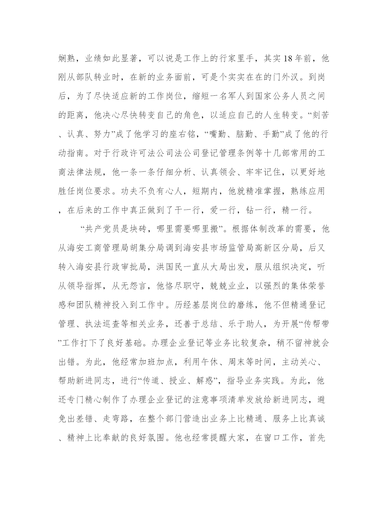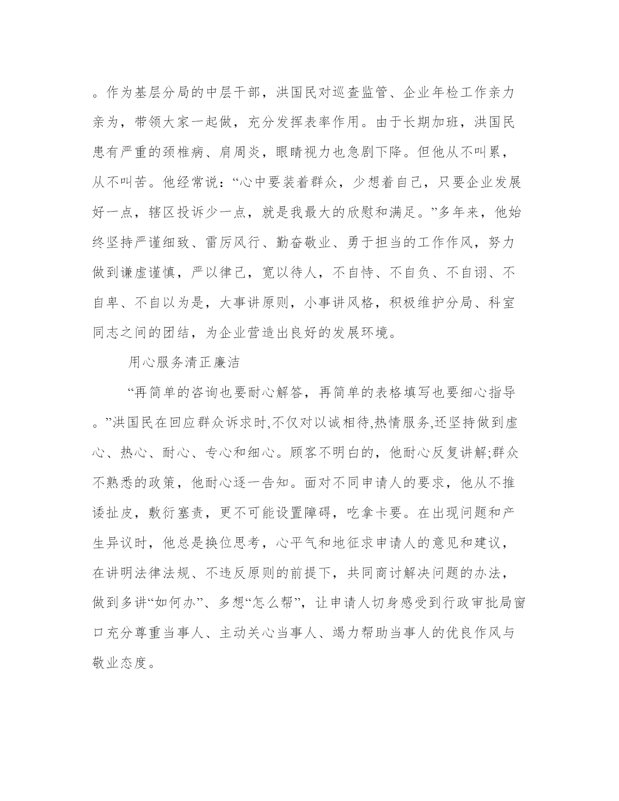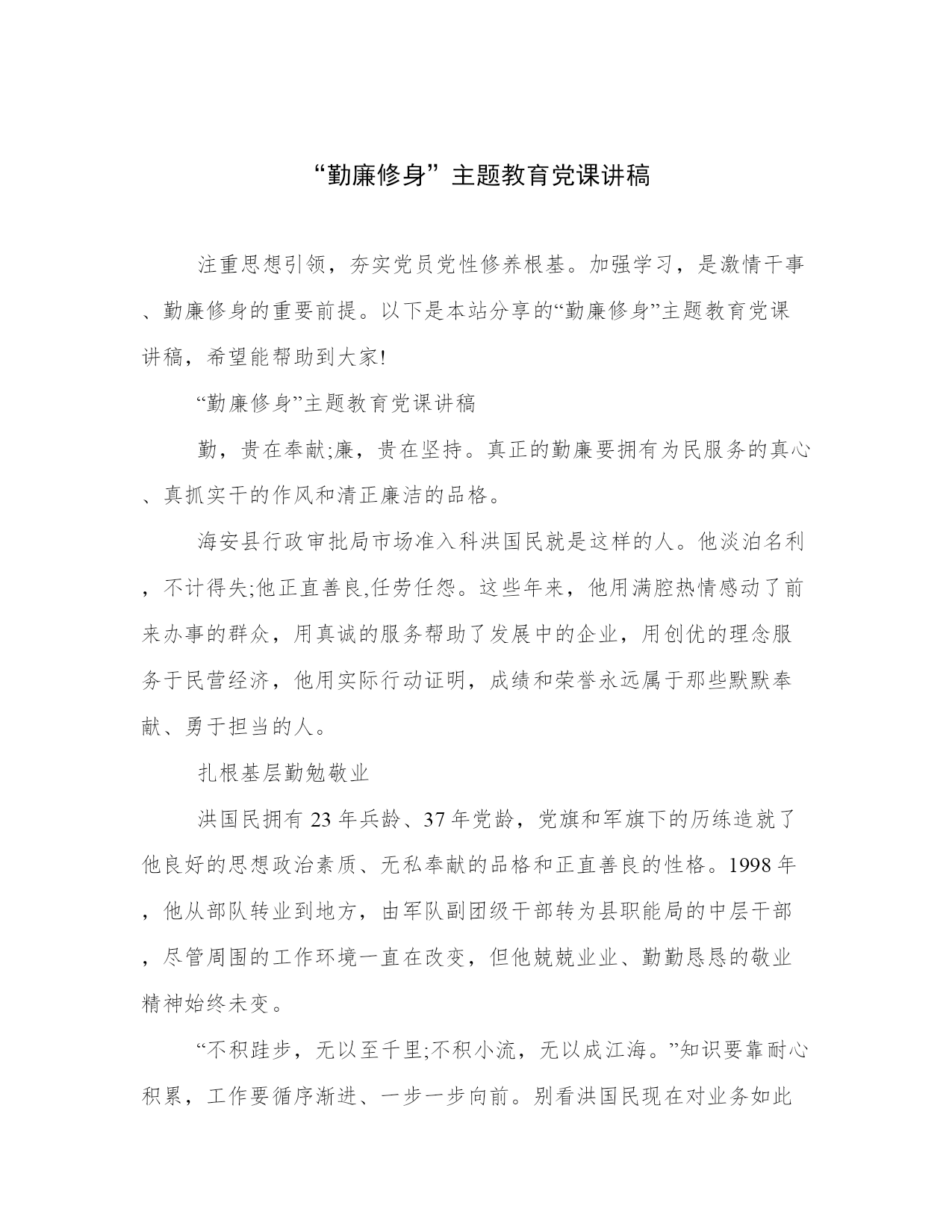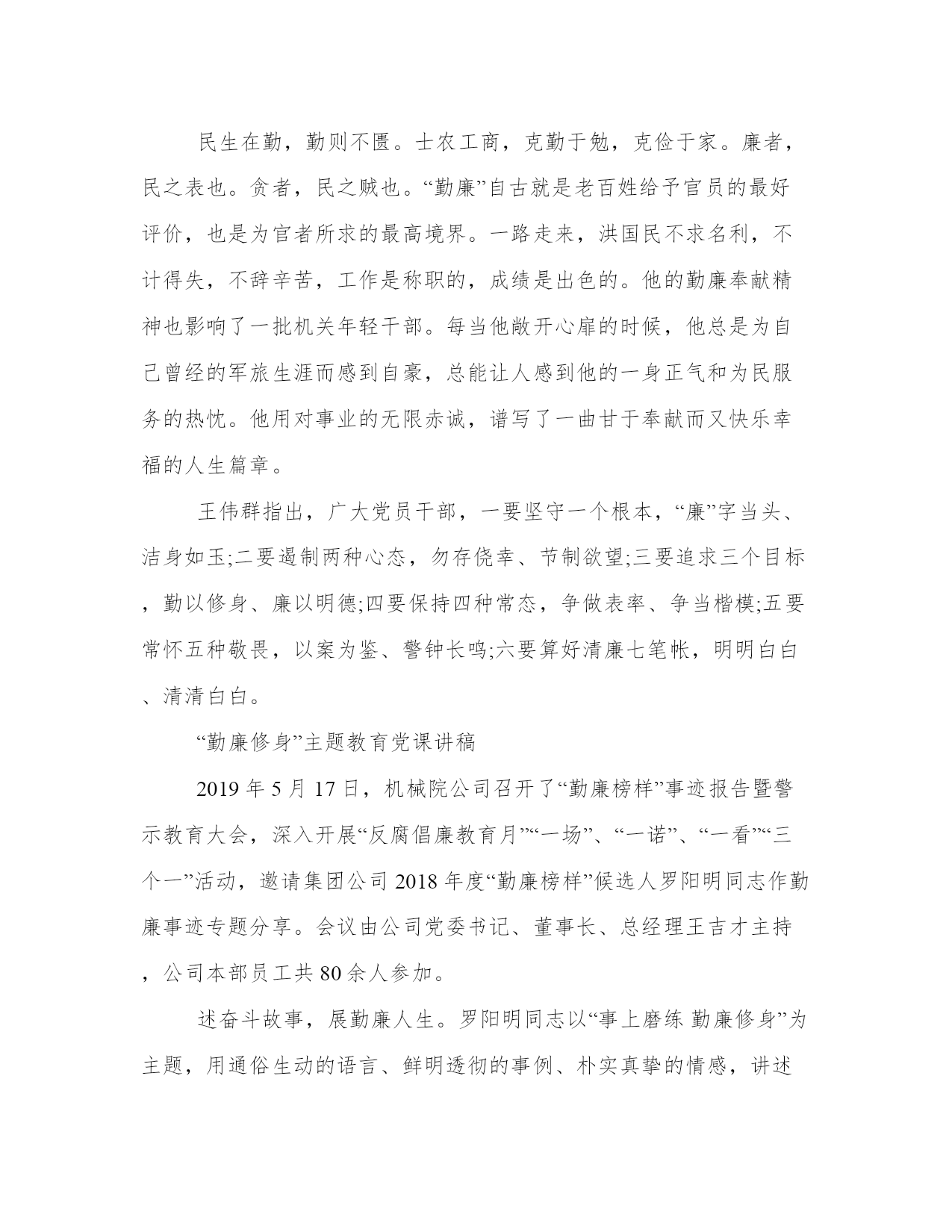 “勤廉修身”主题教育党课讲稿注重思想引领,夯实党员党性修养根基。加强学习,是激情干事、勤廉修身的重要前提。以下是本站分享的“勤廉修身”主题教育党课讲稿,希望能帮助到大家!“勤廉修身”主题教育党课讲稿勤,贵在奉献;廉,贵在坚持。真正的勤廉要拥有为民服务的真心、真抓实干的作风和清正廉洁的品格。海安县行政审批局市场准入科洪国民就是这样的人。他淡泊名利,不计得失;他正直善良,任劳任怨。这些年来,他用满腔热情感动了前来办事的群众,用真诚的服务帮助了发展中的企业,用创优的理念服务于民营经济,他用实际行动证明,成绩和荣誉永远属于那些默默奉献、勇于担当的人。扎根基层勤勉敬业洪国民拥有23年兵龄、37年党龄,党旗和军旗下的历练造就了他良好的思想政治素质、无私奉献的品格和正直善良的性格。1998年,他从部队转业到地方,由军队副团级干部转为县职能局的中层干部,尽管周围的工作环境一直在改变,但他兢兢业业、勤勤恳恳的敬业精神始终未变。“不积跬步,无以至千里;不积小流,无以成江海。”知识要靠耐心积累,工作要循序渐进、一步一步向前。别看洪国民现在对业务如此娴熟,业绩如此显著,可以说是工作上的行家里手,其实18年前,他刚从部队转业时,在新的业务面前,可是个实实在在的门外汉。到岗后,为了尽快适应新的工作岗位,缩短一名军人到国家公务人员之间的距离,他决心尽快转变自己的角色,以适应自己的人生转变。“刻苦、认真、努力”成了他学习的座右铭,“嘴勤、脑勤、手勤”成了他的行动指南。对于行政许可法公司法公司登记管理条例等十几部常用的工商法律法规,他一条一条仔细分析、认真领会、牢牢记住,以更好地胜任岗位要求。功夫不负有心人,短期内,他就精准掌握,熟练应用,在后来的工作中真正做到了干一行,爱一行,钻一行,精一行。“共产党员是块砖,哪里需要哪里搬”。根据体制改革的需要,他从海安工商管理局胡集分局调到海安县市场监管局高新区分局,后又转入海安县行政审批局,洪国民一直从大局出发,服从组织决定,听从领导指挥,从无怨言,他恪尽职守,兢兢业业,以强烈的集体荣誉感和团队精神投入到工作中。历经基层岗位的磨练,他不但精通登记管理、执法巡查等相关业务,还善于总结、乐于助人,为开展“传帮带”工作打下了良好基础。办理企业登记等业务比较复杂,稍不留神就会出错。为此,他经常加班加点,利用午休、周末等时间,主动关心、帮助新进同志,进行“传道、授业、解惑”,指导业务实践。为此,他还专门精心制作了办理企业登记的注意事项清单发放给新进同志,避免出差错、走弯路,在整个部门营造出业务上比精通、服务上比真诚、精神上比奉献的良好氛围。他也经常提醒大家,在窗口工作,首先要学会沟通和尊重,特别是与市场主体沟通要讲求技巧,多换位思考,多沟通解释,通过微笑服务,努力赢得服务对象的理解和支持;其次要主动学习,更新知识,在总结中增强业务素质,在积累中提升服务能力,切实做到工作有底气、不被动。在洪国民的带领下,窗口的年轻同志说:“只要洪局在窗口,我就没那么紧张,心里踏实多了。”真抓实干勇于担当老牛自知夕阳晚,不用扬鞭自奋蹄。洪国民今年已经59岁了,作为行政审批局的一名普通科员,从基层分局到机关窗口,他始终坚守在服务群众的第一线。有人劝他,都临近退休了,忙了这么多年,不如做点轻松的工作。但是在岗位调整时,他还是毅然决然地选择了活儿最忙、人最累的窗口。他始终认为,人的一生可以很平凡,可以没有惊天动地的壮举,可以没有叱咤风云的事业,但是要始终抱着一颗全心全意为民服务之心,不计较个人名利,不在乎一时得失,在平凡的岗位上实现社会价值的同时,这样才能获得自我价值的实现。工作从不挑肥拣瘦是他的性格,正是他这种顾全大局、无私奉献的精神以及对事业的执着,赢得大家的尊重和敬爱。奉献意味着付出,担当意味着责任。洪国民在基层分局上班期间,除了日常窗口工作外,遇到春耕备耕以及重大节日等关键时间节点,在执法巡查一线也常常能看到他忙碌的身影。他从没有节假日与工作日之分,他常在双休日奔走于巡查监管、执法办案、注册登记一线。作为基层分局的中层干部,洪国民对巡查监管、企业年检工作亲力亲为,带领大家一起做,充分发挥表率作用。由于长期加班,洪国民患有严重的颈椎病、肩周炎,眼睛视力也急剧下降。但他从不叫累,从不叫苦。他经常说:“心中要装着群众,少想着自己,只要企业发展好一点,辖区投诉少一点,就是我最大的欣慰和满足。”多年来,他始终坚持严谨细致、雷厉风行、勤奋敬业、勇于担当的工作作风,努力做到谦虚谨慎,严以律己,宽以待人,不自恃、不自负、不自诩、不自卑、不自以为是,大事讲原则,小事讲风格,积极维护分局、科室同志之间的团结,为企业营造出良好的发展环境。用心服务清正廉洁“再简单的咨询也要耐心解答,再简单的表格填写也要细心指导。”洪国民在回应群众诉求时,不仅对以诚相待,热情服务,还坚持