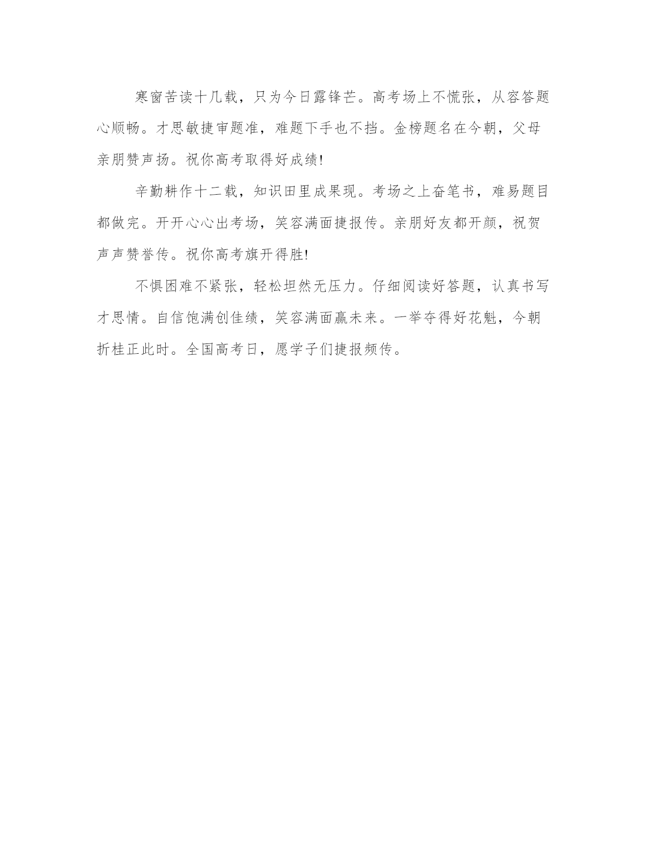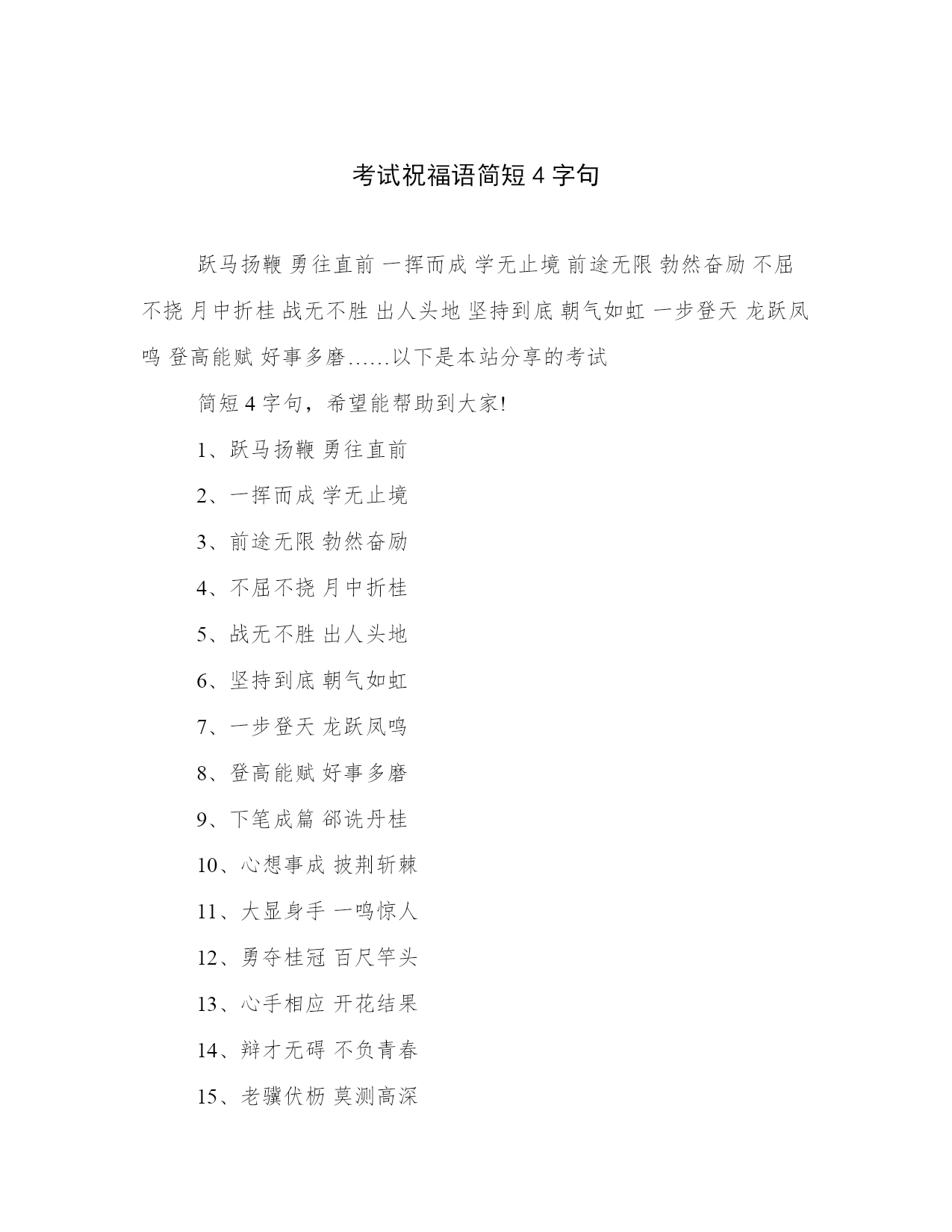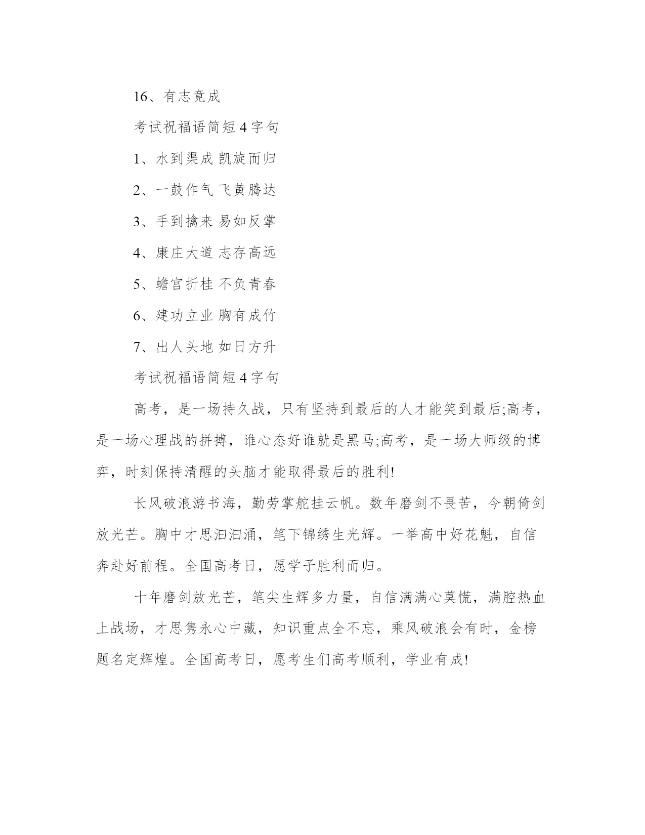 考试祝福语简短4字句跃马扬鞭勇往直前一挥而成学无止境前途无限勃然奋励不屈不挠月中折桂战无不胜出人头地坚持到底朝气如虹一步登天龙跃凤鸣登高能赋好事多磨……以下是本站分享的考试简短4字句,希望能帮助到大家!1、跃马扬鞭勇往直前2、一挥而成学无止境3、前途无限勃然奋励4、不屈不挠月中折桂5、战无不胜出人头地6、坚持到底朝气如虹7、一步登天龙跃凤鸣8、登高能赋好事多磨9、下笔成篇郤诜丹桂10、心想事成披荆斩棘11、大显身手一鸣惊人12、勇夺桂冠百尺竿头13、心手相应开花结果14、辩才无碍不负青春15、老骥伏枥莫测高深16、有志竟成考试祝福语简短4字句1、水到渠成凯旋而归2、一鼓作气飞黄腾达3、手到擒来易如反掌4、康庄大道志存高远5、蟾宫折桂不负青春6、建功立业胸有成竹7、出人头地如日方升考试祝福语简短4字句高考,是一场持久战,只有坚持到最后的人才能笑到最后;高考,是一场心理战的拼搏,谁心态好谁就是黑马;高考,是一场大师级的博弈,时刻保持清醒的头脑才能取得最后的胜利!长风破浪游书海,勤劳掌舵挂云帆。数年磨剑不畏苦,今朝倚剑放光芒。胸中才思汩汩涌,笔下锦绣生光辉。一举高中好花魁,自信奔赴好前程。全国高考日,愿学子胜利而归。十年磨剑放光芒,笔尖生辉多力量,自信满满心莫慌,满腔热血上战场,才思隽永心中藏,知识重点全不忘,乘风破浪会有时,金榜题名定辉煌。全国高考日,愿考生们高考顺利,学业有成!寒窗苦读十几载,只为今日露锋芒。高考场上不慌张,从容答题心顺畅。才思敏捷审题准,难题下手也不挡。金榜题名在今朝,父母亲朋赞声扬。祝你高考取得好成绩!辛勤耕作十二载,知识田里成果现。考场之上奋笔书,难易题目都做完。开开心心出考场,笑容满面捷报传。亲朋好友都开颜,祝贺声声赞誉传。祝你高考旗开得胜!不惧困难不紧张,轻松坦然无压力。仔细阅读好答题,认真书写才思情。自信饱满创佳绩,笑容满面赢未来。一举夺得好花魁,今朝折桂正此时。全国高考日,愿学子们捷报频传。
