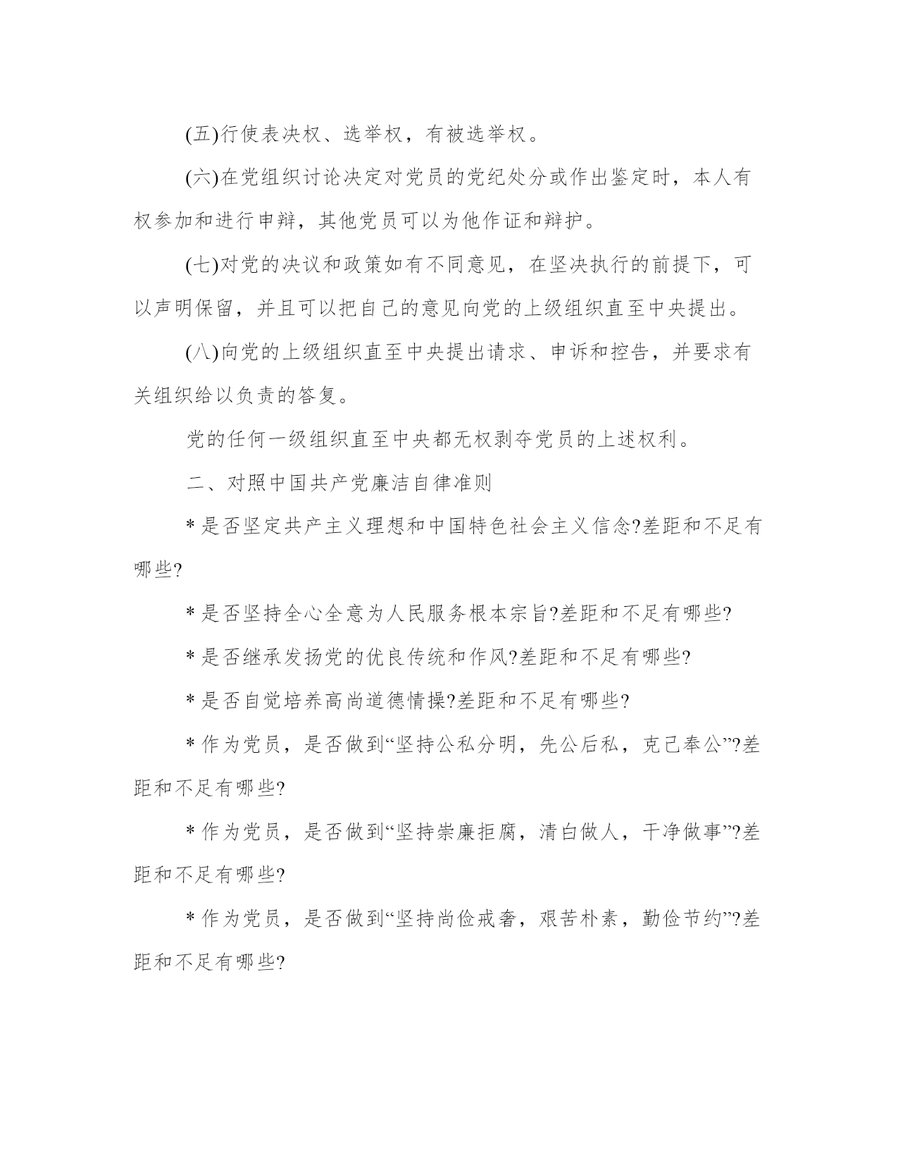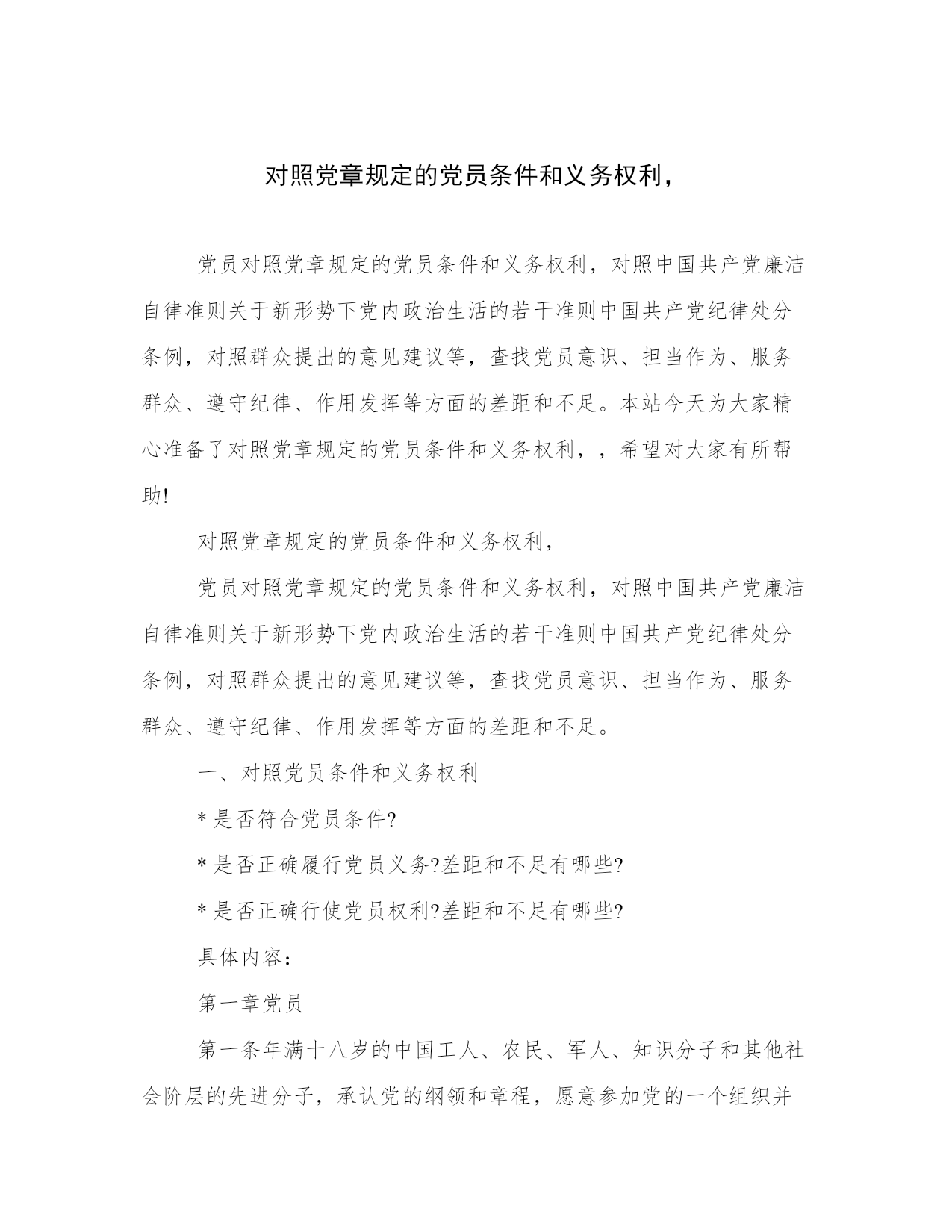 对照党章规定的党员条件和义务权利,党员对照党章规定的党员条件和义务权利,对照中国共产党廉洁自律准则关于新形势下党内政治生活的若干准则中国共产党纪律处分条例,对照群众提出的意见建议等,查找党员意识、担当作为、服务群众、遵守纪律、作用发挥等方面的差距和不足。本站今天为大家精心准备了对照党章规定的党员条件和义务权利,,希望对大家有所帮助!对照党章规定的党员条件和义务权利,党员对照党章规定的党员条件和义务权利,对照中国共产党廉洁自律准则关于新形势下党内政治生活的若干准则中国共产党纪律处分条例,对照群众提出的意见建议等,查找党员意识、担当作为、服务群众、遵守纪律、作用发挥等方面的差距和不足。一、对照党员条件和义务权利*是否符合党员条件?*是否正确履行党员义务?差距和不足有哪些?*是否正确行使党员权利?差距和不足有哪些?具体内容:第一章党员第一条年满十八岁的中国工人、农民、军人、知识分子和其他社会阶层的先进分子,承认党的纲领和章程,愿意参加党的一个组织并在其中积极工作、执行党的决议和按期交纳党费的,可以申请加入中国共产党。第二条中国共产党党员是中国工人阶级的有共产主义觉悟的先锋战士。中国共产党党员必须全心全意为人民服务,不惜牺牲个人的一切,为实现共产主义奋斗终身。中国共产党党员永远是劳动人民的普通一员。除了法律和政策规定范围内的个人利益和工作职权以外,所有共产党员都不得谋求任何私利和特权。第三条党员必须履行下列义务:(一)认真学习马克思列宁主义、毛泽东思想、邓小平理论、“三个代表”重要思想、科学发展观、习近平新时代中国特色社会主义思想,学习党的路线、方针、政策和决议,学习党的基本知识,学习科学、文化、法律和业务知识,努力提高为人民服务的本领。(二)贯彻执行党的基本路线和各项方针、政策,带头参加改革开放和社会主义现代化建设,带动群众为经济发展和社会进步艰苦奋斗,在生产、工作、学习和社会生活中起先锋模范作用。(三)坚持党和人民的利益高于一切,个人利益服从党和人民的利益,吃苦在前,享受在后,克己奉公,多做贡献。(四)自觉遵守党的纪律,首先是党的政治纪律和政治规矩,模范遵守国家的法律法规,严格保守党和国家的秘密,执行党的决定,服从组织分配,积极完成党的任务。(五)维护党的团结和统一,对党忠诚老实,言行一致,坚决反对一切派别组织和小集团活动,反对阳奉阴违的两面派行为和一切阴谋诡计。(六)切实开展批评和自我批评,勇于揭露和纠正违反党的原则的言行和工作中的缺点、错误,坚决同消极腐败现象作斗争。(七)密切联系群众,向群众宣传党的主张,遇事同群众商量,及时向党反映群众的意见和要求,维护群众的正当利益。(八)发扬社会主义新风尚,带头实践社会主义核心价值观和社会主义荣辱观,提倡共产主义道德,弘扬中华民族传统美德,为了保护国家和人民的利益,在一切困难和危险的时刻挺身而出,英勇斗争,不怕牺牲。第四条党员享有下列权利:(二)在党的会议上和党报党刊上,参加关于党的政策问题的讨论。(三)对党的工作提出建议和倡议。(四)在党的会议上有根据地批评党的任何组织和任何党员,向党负责地揭发、检举党的任何组织和任何党员违法乱纪的事实,要求处分违法乱纪的党员,要求罢免或撤换不称职的干部。(五)行使表决权、选举权,有被选举权。(六)在党组织讨论决定对党员的党纪处分或作出鉴定时,本人有权参加和进行申辩,其他党员可以为他作证和辩护。(七)对党的决议和政策如有不同意见,在坚决执行的前提下,可以声明保留,并且可以把自己的意见向党的上级组织直至中央提出。(八)向党的上级组织直至中央提出请求、申诉和控告,并要求有关组织给以负责的答复。党的任何一级组织直至中央都无权剥夺党员的上述权利。二、对照中国共产党廉洁自律准则*是否坚定共产主义理想和中国特色社会主义信念?差距和不足有哪些?*是否坚持全心全意为人民服务根本宗旨?差距和不足有哪些?*是否继承发扬党的优良传统和作风?差距和不足有哪些?*是否自觉培养高尚道德情操?差距和不足有哪些?*作为党员,是否做到“坚持公私分明,先公后私,克己奉公”?差距和不足有哪些?*作为党员,是否做到“坚持崇廉拒腐,清白做人,干净做事”?差距和不足有哪些?*作为党员,是否做到“坚持尚俭戒奢,艰苦朴素,勤俭节约”?差距和不足有哪些?*作为党员,是否做到“坚持吃苦在前,享受在后,甘于奉献”?差距和不足有哪些?*作为党员领导干部,是否做到“廉洁从政,自觉保持人民公仆本色”?差距和不足有哪些?*作为党员领导干部,是否做到“廉洁用权,自觉维护人民根本利益”?差距和不足有哪些?*作为党员领导干部,是否做到“廉洁修身,自觉提升思想道德境界”?差距和不足有哪些?*作为党员领导干部,是否做到“廉洁齐家,自觉带头树立良好家风”?差距和不足有哪些?具体内容:中国共产党全体党员和各级党员领导干部必须坚