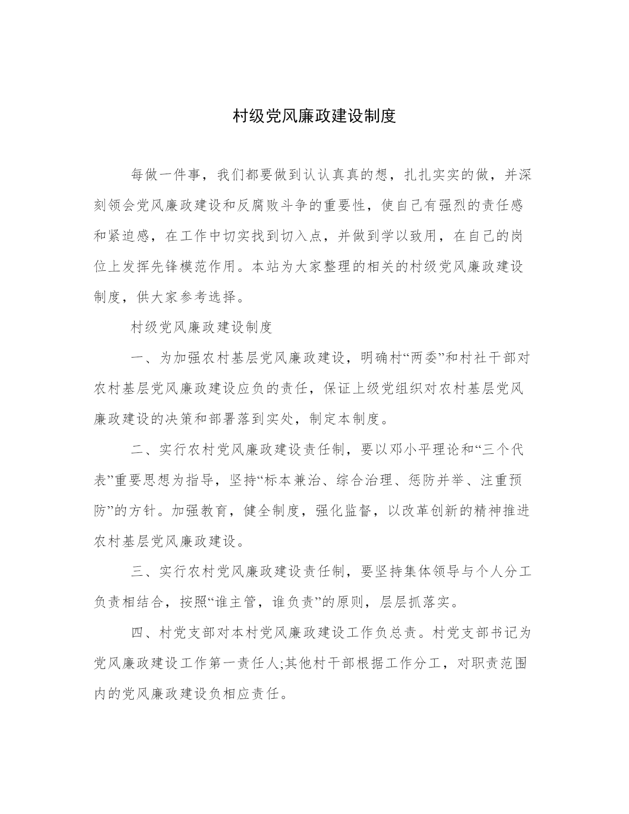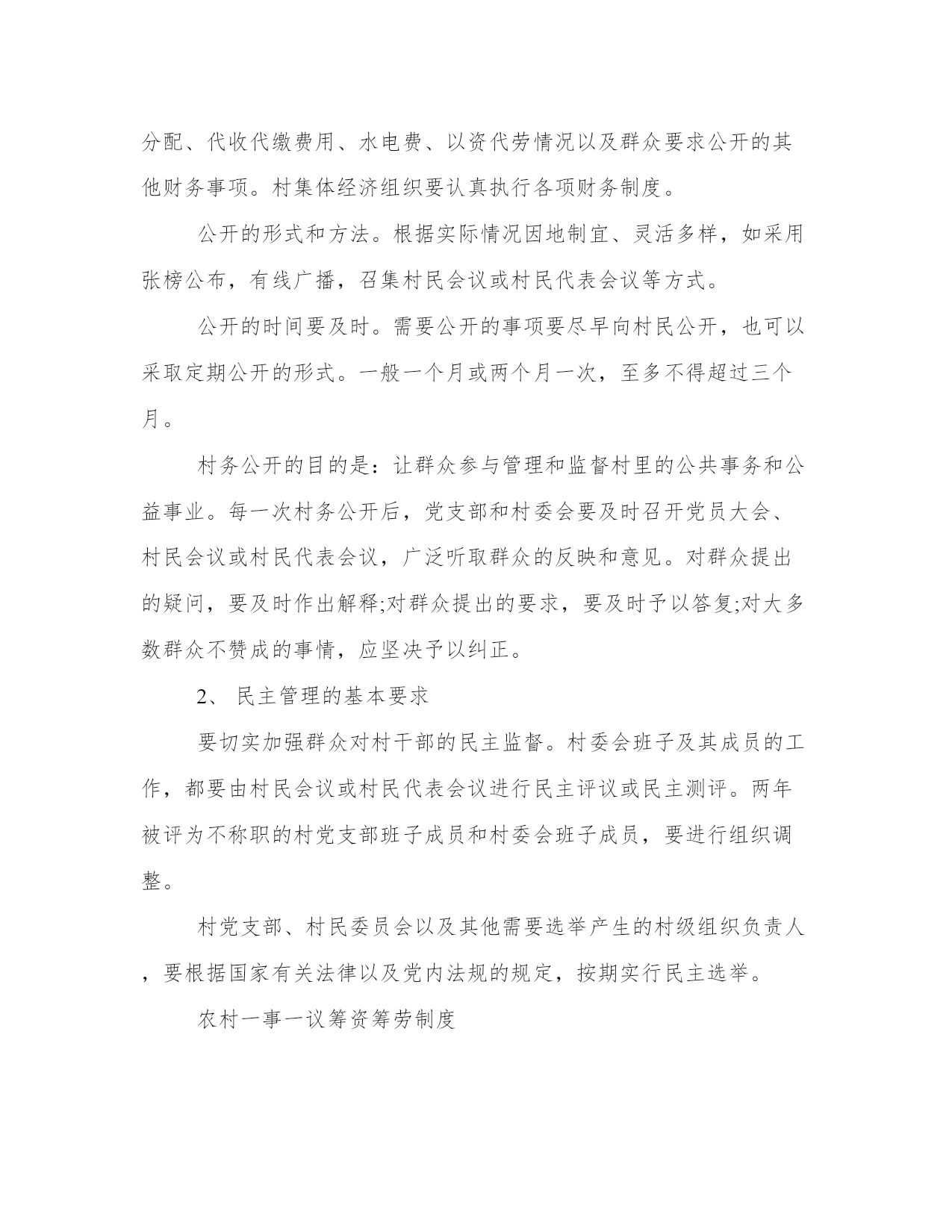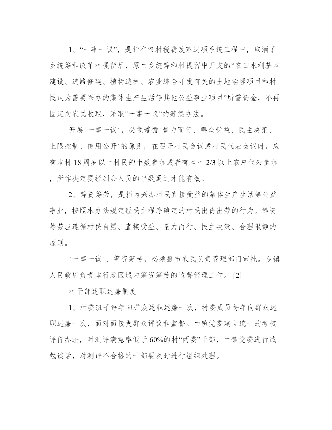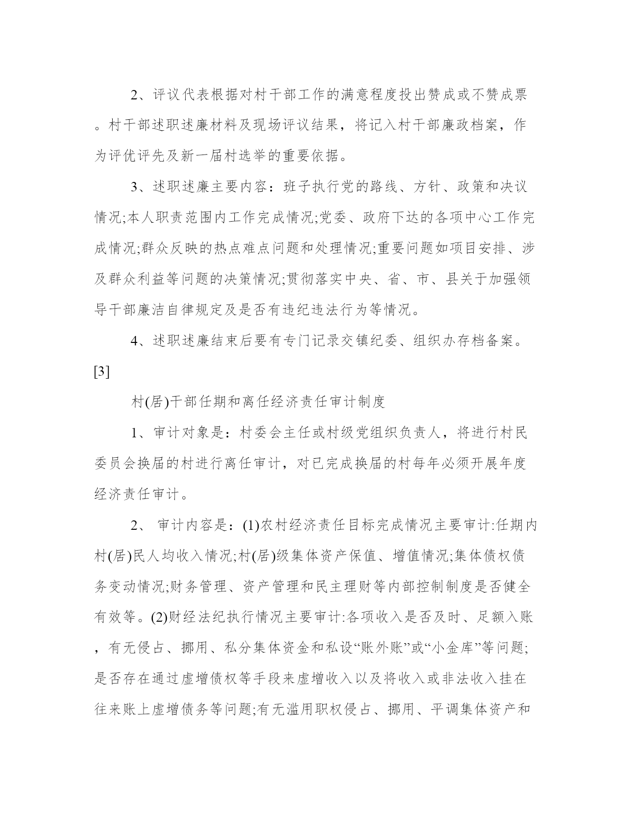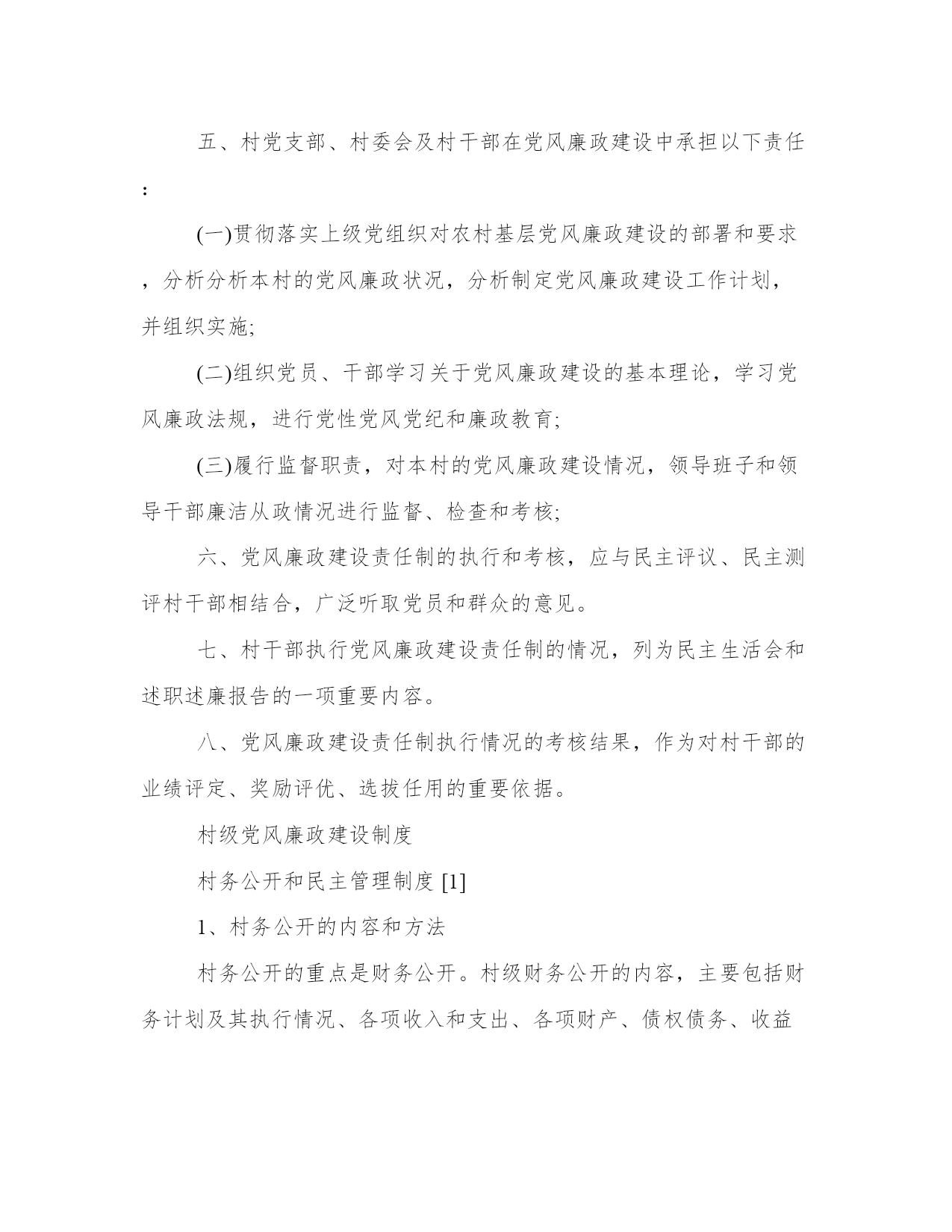 村级党风廉政建设制度每做一件事,我们都要做到认认真真的想,扎扎实实的做,并深刻领会党风廉政建设和反腐败斗争的重要性,使自己有强烈的责任感和紧迫感,在工作中切实找到切入点,并做到学以致用,在自己的岗位上发挥先锋模范作用。本站为大家整理的相关的村级党风廉政建设制度,供大家参考选择。村级党风廉政建设制度一、为加强农村基层党风廉政建设,明确村“两委”和村社干部对农村基层党风廉政建设应负的责任,保证上级党组织对农村基层党风廉政建设的决策和部署落到实处,制定本制度。二、实行农村党风廉政建设责任制,要以邓小平理论和“三个代表”重要思想为指导,坚持“标本兼治、综合治理、惩防并举、注重预防”的方针。加强教育,健全制度,强化监督,以改革创新的精神推进农村基层党风廉政建设。三、实行农村党风廉政建设责任制,要坚持集体领导与个人分工负责相结合,按照“谁主管,谁负责”的原则,层层抓落实。四、村党支部对本村党风廉政建设工作负总责。村党支部书记为党风廉政建设工作第一责任人;其他村干部根据工作分工,对职责范围内的党风廉政建设负相应责任。五、村党支部、村委会及村干部在党风廉政建设中承担以下责任:(一)贯彻落实上级党组织对农村基层党风廉政建设的部署和要求,分析分析本村的党风廉政状况,分析制定党风廉政建设工作计划,并组织实施;(二)组织党员、干部学习关于党风廉政建设的基本理论,学习党风廉政法规,进行党性党风党纪和廉政教育;(三)履行监督职责,对本村的党风廉政建设情况,领导班子和领导干部廉洁从政情况进行监督、检查和考核;六、党风廉政建设责任制的执行和考核,应与民主评议、民主测评村干部相结合,广泛听取党员和群众的意见。七、村干部执行党风廉政建设责任制的情况,列为民主生活会和述职述廉报告的一项重要内容。八、党风廉政建设责任制执行情况的考核结果,作为对村干部的业绩评定、奖励评优、选拔任用的重要依据。村级党风廉政建设制度村务公开和民主管理制度[1]1、村务公开的内容和方法村务公开的重点是财务公开。村级财务公开的内容,主要包括财务计划及其执行情况、各项收入和支出、各项财产、债权债务、收益分配、代收代缴费用、水电费、以资代劳情况以及群众要求公开的其他财务事项。村集体经济组织要认真执行各项财务制度。公开的形式和方法。根据实际情况因地制宜、灵活多样,如采用张榜公布,有线广播,召集村民会议或村民代表会议等方式。公开的时间要及时。需要公开的事项要尽早向村民公开,也可以采取定期公开的形式。一般一个月或两个月一次,至多不得超过三个月。村务公开的目的是:让群众参与管理和监督村里的公共事务和公益事业。每一次村务公开后,党支部和村委会要及时召开党员大会、村民会议或村民代表会议,广泛听取群众的反映和意见。对群众提出的疑问,要及时作出解释;对群众提出的要求,要及时予以答复;对大多数群众不赞成的事情,应坚决予以纠正。2、民主管理的基本要求要切实加强群众对村干部的民主监督。村委会班子及其成员的工作,都要由村民会议或村民代表会议进行民主评议或民主测评。两年被评为不称职的村党支部班子成员和村委会班子成员,要进行组织调整。村党支部、村民委员会以及其他需要选举产生的村级组织负责人,要根据国家有关法律以及党内法规的规定,按期实行民主选举。农村一事一议筹资筹劳制度1、“一事一议”,是指在农村税费改革这项系统工程中,取消了乡统筹和改革村提留后,原由乡统筹和村提留中开支的“农田水利基本建设、道路修建、植树造林、农业综合开发有关的土地治理项目和村民认为需要兴办的集体生产生活等其他公益事业项目”所需资金,不再固定向农民收取,采取“一事一议”的筹集办法。开展“一事一议”,必须遵循“量力而行、群众受益、民主决策、上限控制、使用公开”的原则,在召开村民会议或村民代表会议时,应有本村18周岁以上村民的半数参加或者有本村2/3以上农户代表参加,所作决定要经到会人员的半数通过才能有效。2、筹资筹劳,是指为兴办村民直接受益的集体生产生活等公益事业,按照本办法规定经民主程序确定的村民出资出劳的行为。筹资筹劳应遵循村民自愿、直接受益、量力而行、民主决策、合理限额的原则。“一事一议”、筹资筹劳,必须报市农民负责管理部门审批。乡镇人民政府负责本行政区域内筹资筹劳的监督管理工作。[2]村干部述职述廉制度1、村委班子每年向群众述职述廉一次,村委成员每年向群众述职述廉一次,面对面接受群众评议和监督。由镇党委建立统一的考核评价办法,对测评满意率低于60%的村“两委”干部,由镇党委进行诫勉谈话,对测评不合格的干部要及时进行组织处理。2、评议代表根据对村干部工作的满意程度投出赞成或不赞成票。村干部述职述廉材料及现场评议结果,将记入村干部廉政档案,作为评优评先及新一届村选举的重要依据。3、述职述廉主要内容:班子执行党的路线、方针、政策和决议情况;本人职责范围内