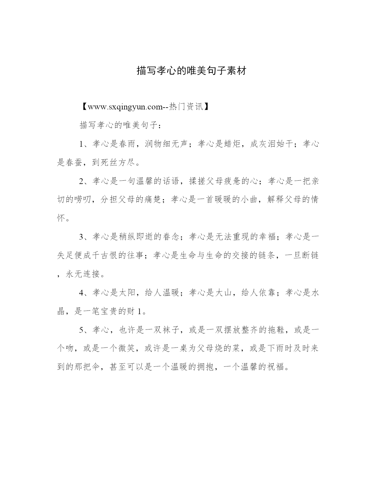 描写孝心的唯美句子素材【www.sxqingyun.com--热门资讯】描写孝心的唯美句子:1、孝心是春雨,润物细无声;孝心是蜡炬,成灰泪始干;孝心是春蚕,到死丝方尽。2、孝心是一句温馨的话语,揉搓父母疲惫的心;孝心是一把亲切的唠叨,分担父母的痛楚;孝心是一首暖暖的小曲,解释父母的情怀。3、孝心是稍纵即逝的眷念;孝心是无法重现的幸福;孝心是一失足便成千古恨的往事;孝心是生命与生命的交接的链条,一旦断链,永无连接。4、孝心是太阳,给人温暖;孝心是大山,给人依靠;孝心是水晶,是一笔宝贵的财1。5、孝心,也许是一双袜子,或是一双摆放整齐的拖鞋,或是一个吻,或是一个微笑,或许是一桌为父母烧的菜,或是下雨时及时来到的那把伞,甚至可以是一个温暖的拥抱,一个温馨的祝福。