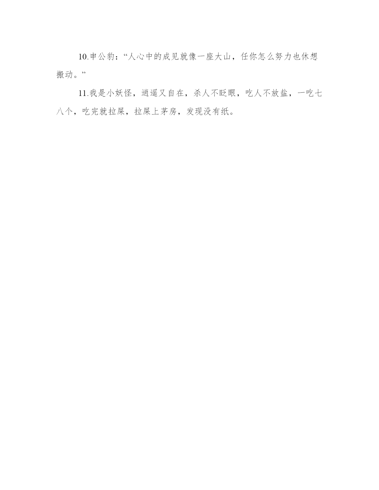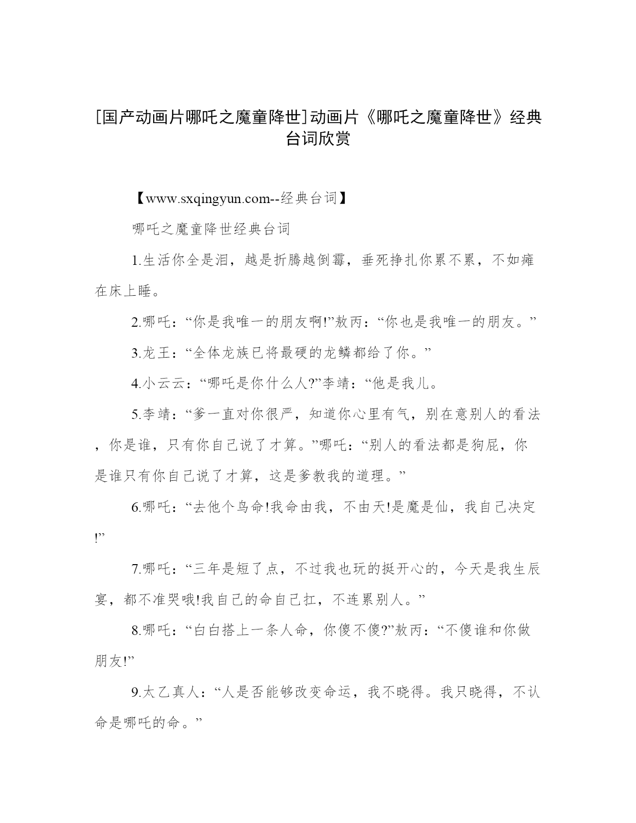 [国产动画片哪吒之魔童降世]动画片《哪吒之魔童降世》经典台词欣赏【www.sxqingyun.com--经典台词】哪吒之魔童降世经典台词1.生活你全是泪,越是折腾越倒霉,垂死挣扎你累不累,不如瘫在床上睡。2.哪吒:“你是我唯一的朋友啊!”敖丙:“你也是我唯一的朋友。”3.龙王:“全体龙族已将最硬的龙鳞都给了你。”4.小云云:“哪吒是你什么人?”李靖:“他是我儿。5.李靖:“爹一直对你很严,知道你心里有气,别在意别人的看法,你是谁,只有你自己说了才算。”哪吒:“别人的看法都是狗屁,你是谁只有你自己说了才算,这是爹教我的道理。”6.哪吒:“去他个鸟命!我命由我,不由天!是魔是仙,我自己决定!”7.哪吒:“三年是短了点,不过我也玩的挺开心的,今天是我生辰宴,都不准哭哦!我自己的命自己扛,不连累别人。”8.哪吒:“白白搭上一条人命,你傻不傻?”敖丙:“不傻谁和你做朋友!”9.太乙真人:“人是否能够改变命运,我不晓得。我只晓得,不认命是哪吒的命。”10.申公豹:“人心中的成见就像一座大山,任你怎么努力也休想搬动。”11.我是小妖怪,逍遥又自在,杀人不眨眼,吃人不放盐,一吃七八个,吃完就拉屎,拉屎上茅房,发现没有纸。