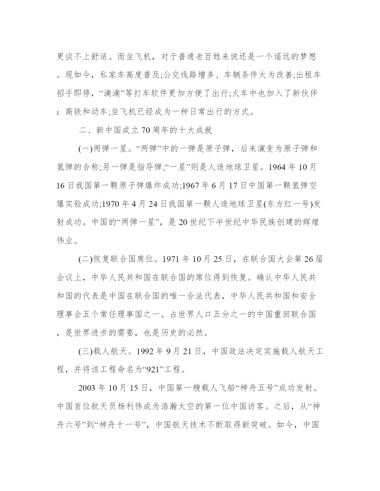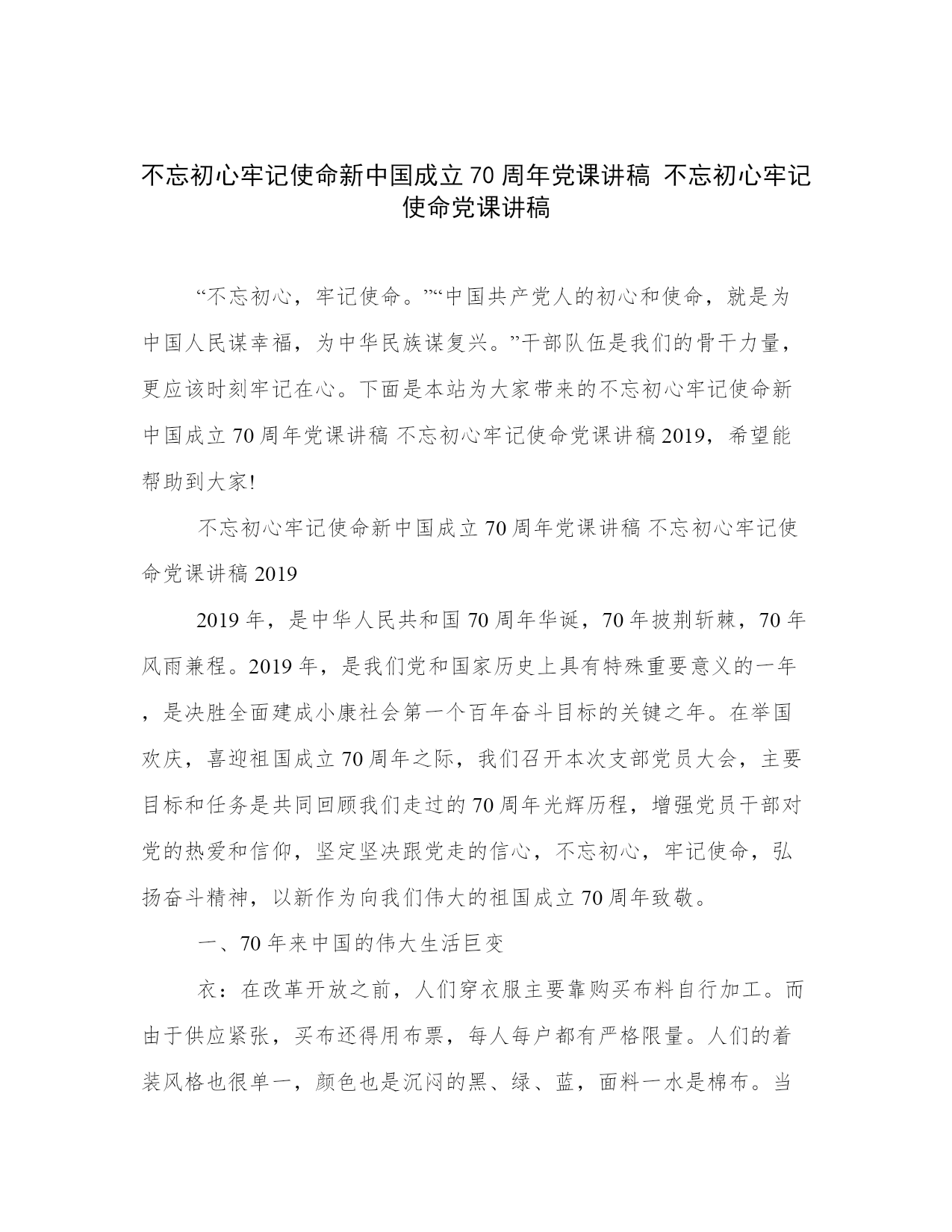 不忘初心牢记使命新中国成立70周年党课讲稿不忘初心牢记使命党课讲稿“不忘初心,牢记使命。”“中国共产党人的初心和使命,就是为中国人民谋幸福,为中华民族谋复兴。”干部队伍是我们的骨干力量,更应该时刻牢记在心。下面是本站为大家带来的不忘初心牢记使命新中国成立70周年党课讲稿不忘初心牢记使命党课讲稿2019,希望能帮助到大家!不忘初心牢记使命新中国成立70周年党课讲稿不忘初心牢记使命党课讲稿20192019年,是中华人民共和国70周年华诞,70年披荆斩棘,70年风雨兼程。2019年,是我们党和国家历史上具有特殊重要意义的一年,是决胜全面建成小康社会第一个百年奋斗目标的关键之年。在举国欢庆,喜迎祖国成立70周年之际,我们召开本次支部党员大会,主要目标和任务是共同回顾我们走过的70周年光辉历程,增强党员干部对党的热爱和信仰,坚定坚决跟党走的信心,不忘初心,牢记使命,弘扬奋斗精神,以新作为向我们伟大的祖国成立70周年致敬。一、70年来中国的伟大生活巨变衣:在改革开放之前,人们穿衣服主要靠购买布料自行加工。而由于供应紧张,买布还得用布票,每人每户都有严格限量。人们的着装风格也很单一,颜色也是沉闷的黑、绿、蓝,面料一水是棉布。当时流行着“新三年,旧三年,缝缝补补又三年”的说法。而在改革开放后,随着生产力的提升,布票逐渐被取消,添新衣也从自己加工变为购买成衣。到如今,各种品牌和风格的衣服琳琅满目,线上线下大小服装卖场随处可见。衣服的作用已经远远超过了御寒保暖,舒适、个性和时尚才是人们的普遍要求。食:改革开放之前,因为生产力水平不高,粮食供应紧张,同样需要用票证限制人们的购买力。直到90年代初,粮食供应走向市场,粮票才逐渐消亡。而今,分门别类的食品应有尽有,人们对吃的要求也越来越高,不仅要“吃好”,还要吃得健康。人们讲究营业均衡,粗细搭配,口味清淡,要多吃蔬菜水果,少吃高脂肪高胆固醇的食物。以前因为粮食不够用来充饥的野菜、粗粮,如今却成为餐桌上的健康食品。住:改革开放初期,样式统一单调的平板房取代了破旧民居,但是住房仍是一个大问题,单位上的人们为了分房有时还会勾心斗角。从90年代开始,国家开始兴建经济适用房,为中低收入家庭提供了“买得起,住得起”的选择。这种房屋有独立厨房、厕所,有上下水道,质量有保障、小区环境优美、购物交通也方便。对经济条件好的人,居住的选择就更多了,有高层住宅区,有复式楼,有花园小区,甚至还有单门独院的特色别墅。行:改革开放之前,最主要的短途交通工具是自行车,因此,中国也被成为自行车王国。火车和长途汽车的条件也很差,拥挤、缓慢更谈不上舒适。而坐飞机,对于普通老百姓来说还是一个遥远的梦想。现如今,私家车高度普及;公交线路增多、车辆条件大为改善;出租车招手即停,“滴滴”等打车软件更加方便了出行;火车中也加入了新伙伴:高铁和动车;坐飞机已经成为一种日常出行的方式。二、新中国成立70周年的十大成就(一)两弹一星。“两弹”中的一弹是原子弹,后来演变为原子弹和氢弹的合称;另一弹是指导弹;“一星”则是人造地球卫星。1964年10月16日我国第一颗原子弹爆炸成功;1967年6月17日中国第一颗氢弹空爆实验成功;1970年4月24日我国第一颗人造地球卫星(东方红一号)发射成功。中国的“两弹一星”,是20世纪下半世纪中华民族创建的辉煌伟业。(二)恢复联合国席位。1971年10月25日,在联合国大会第26届会议上,中华人民共和国在联合国的席位得到恢复。确认中华人民共和国的代表是中国在联合国的唯一合法代表,中华人民共和国和安全理事会五个常任理事国之一。占世界人口五分之一的中国重回联合国,是世界进步的需要,也是历史的必然。(三)载人航天。1992年9月21日,中国政法决定实施载人航天工程,并将该工程命名为“921”工程。2003年10月15日,中国第一艘载人飞船“神舟五号”成功发射。中国首位航天员杨利伟成为浩瀚太空的第一位中国访客。之后,从“神舟六号”到“神舟十一号”,中国航天技术不断取得新突破。如今,中国已经成为世界第三个独立掌握载人航天技术、独立开发空间实验、独立进行出舱活动的国家。(四)港澳回归。1997年7月1日中华人民共和国恢复对香港行使主权,结束了英国在香港一个世纪的殖民统治;1999年12月20日中华人民共和国恢复对澳门行使主权,结束了葡萄牙在澳门442年的殖民统治。香港、澳门回到祖国怀抱,大大推进了祖国和平统一大业。(五)青藏铁路。青藏铁路,是中国新世纪四大工程之一,是通往西藏腹地的第一条铁路,也是世界上海拔最高,线路最长的高原铁路。整个工程分两期建成,2006年7月1日全线通车。青藏线大部分处于高海拔地区和“生命禁区”,青藏铁路建设成功解决了三大世界铁路建设难题:千里多年冻土的地质构造、高寒缺氧的施工环境和对脆弱生态环境的保护。(六)